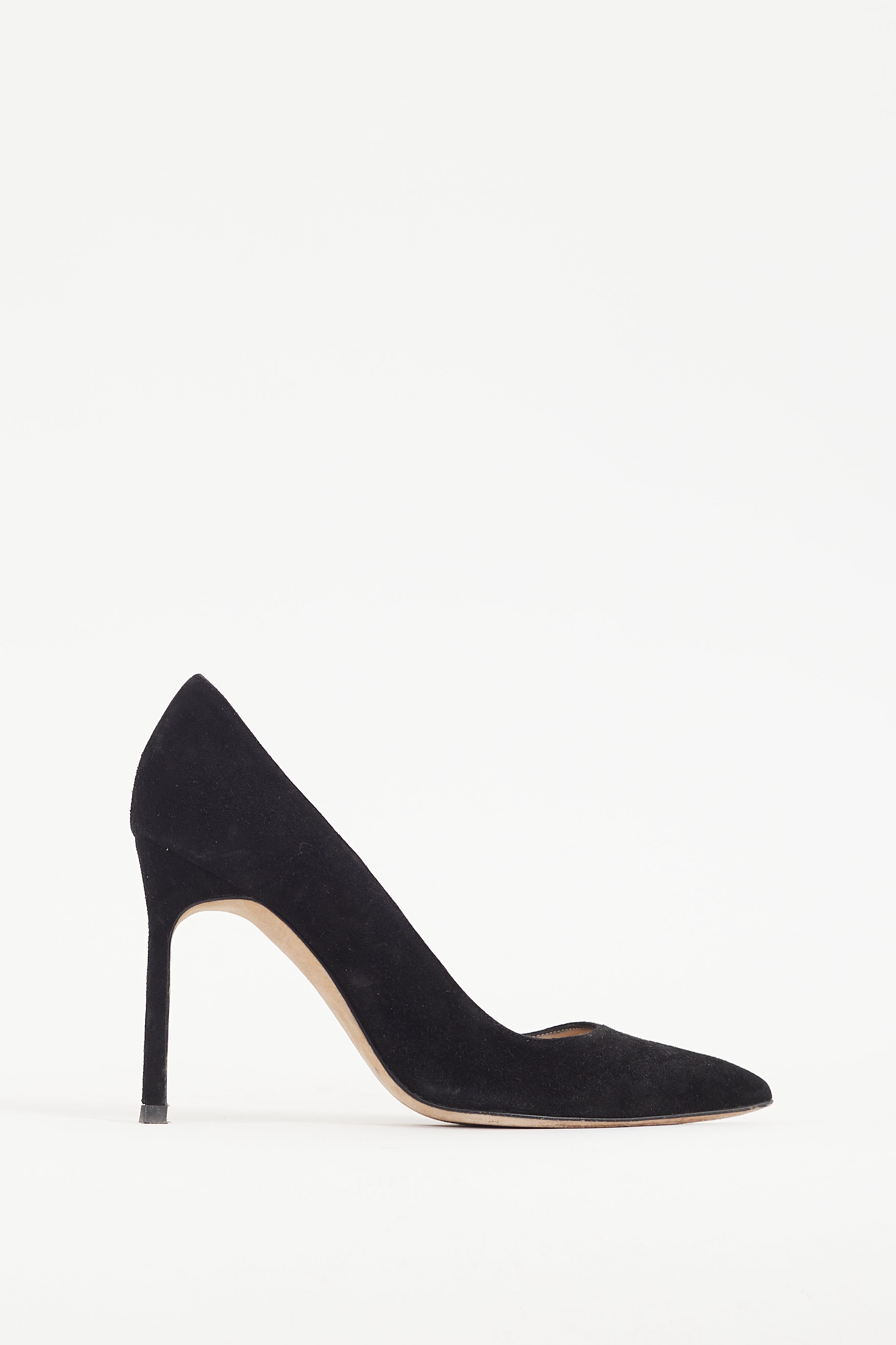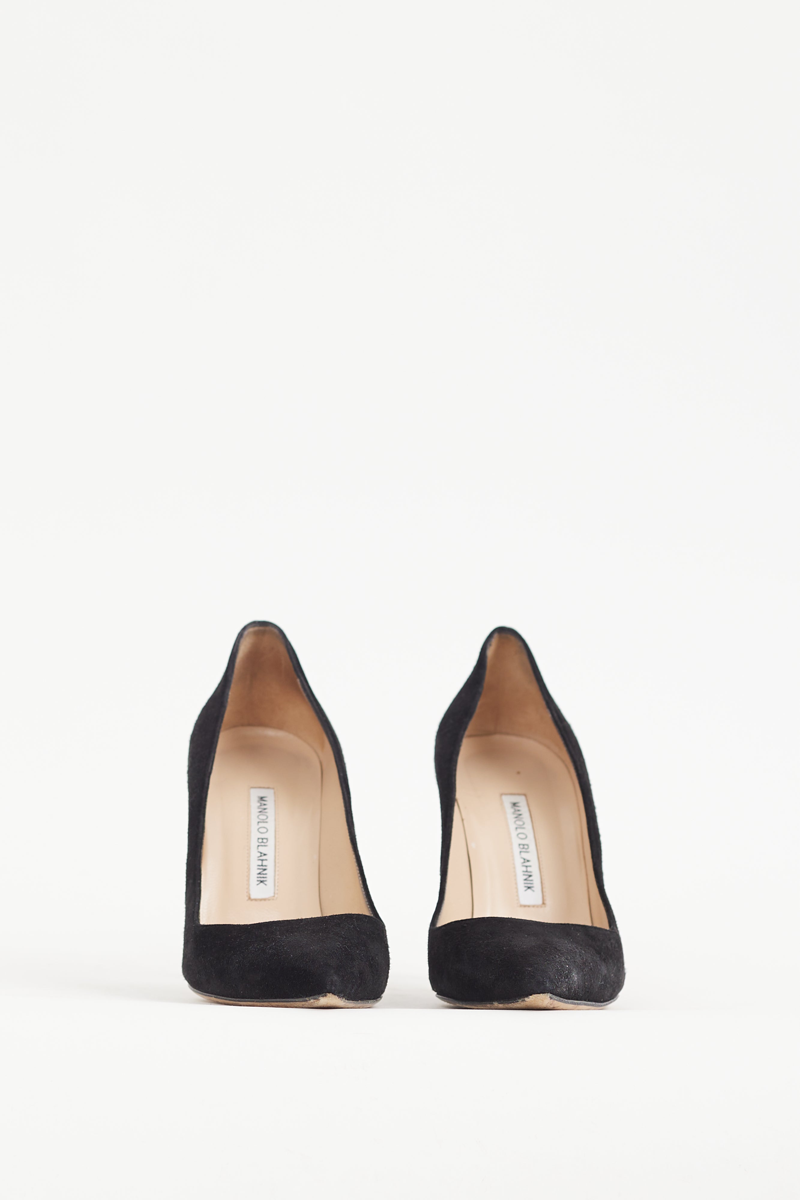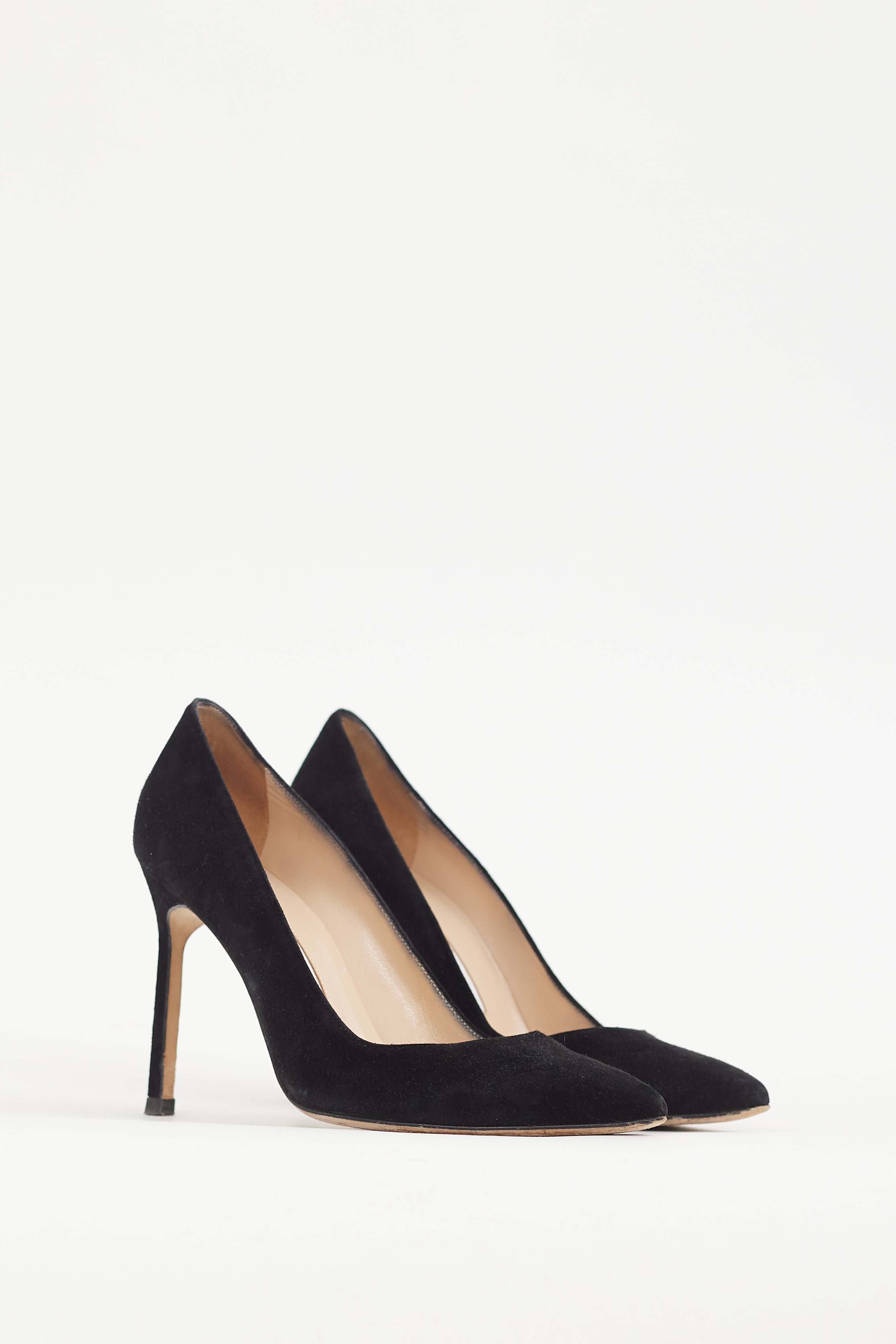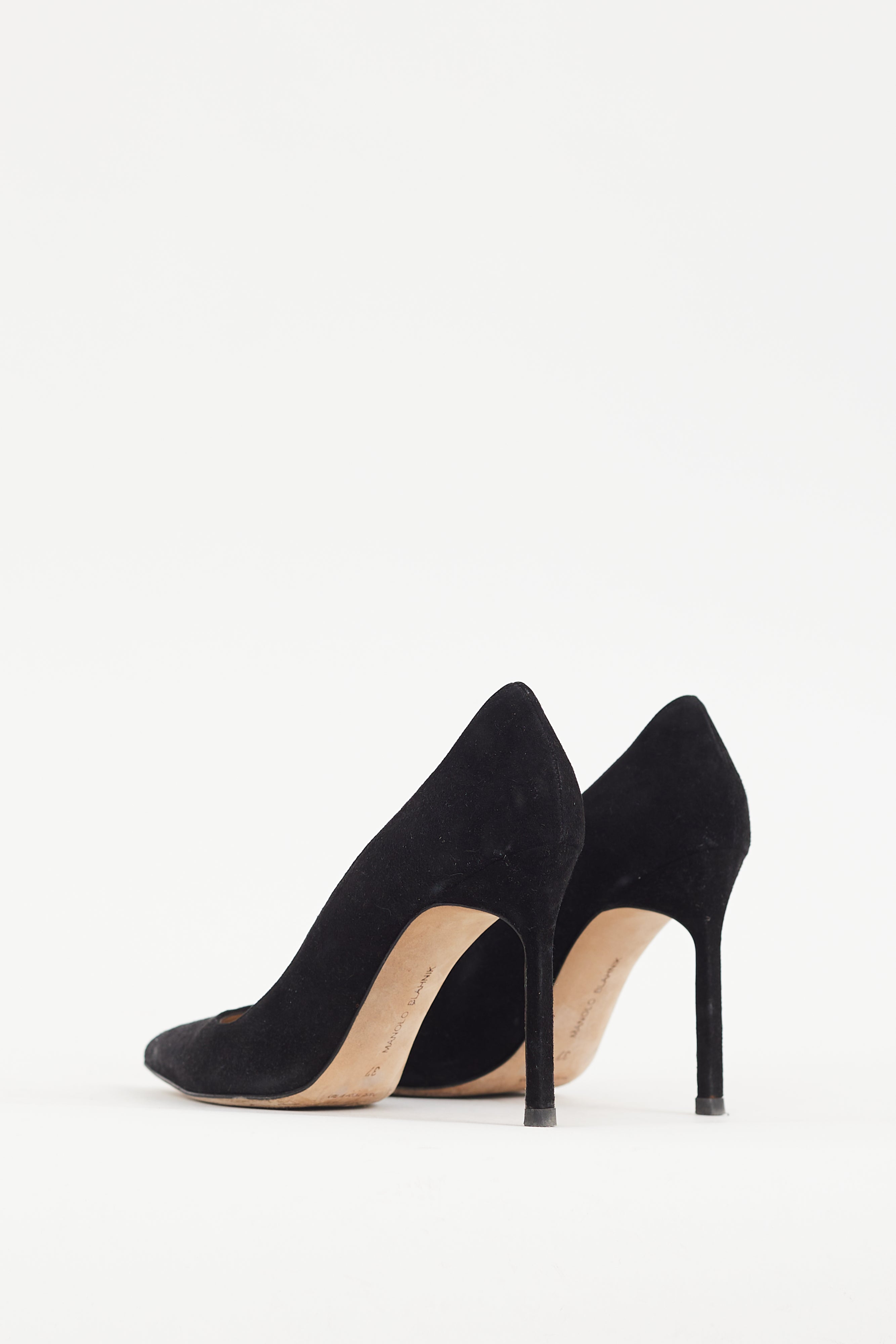 Pre-owned Manolo Blahnik pumps featuring a pointed toe, black suede uppers, and a stiletto heel.