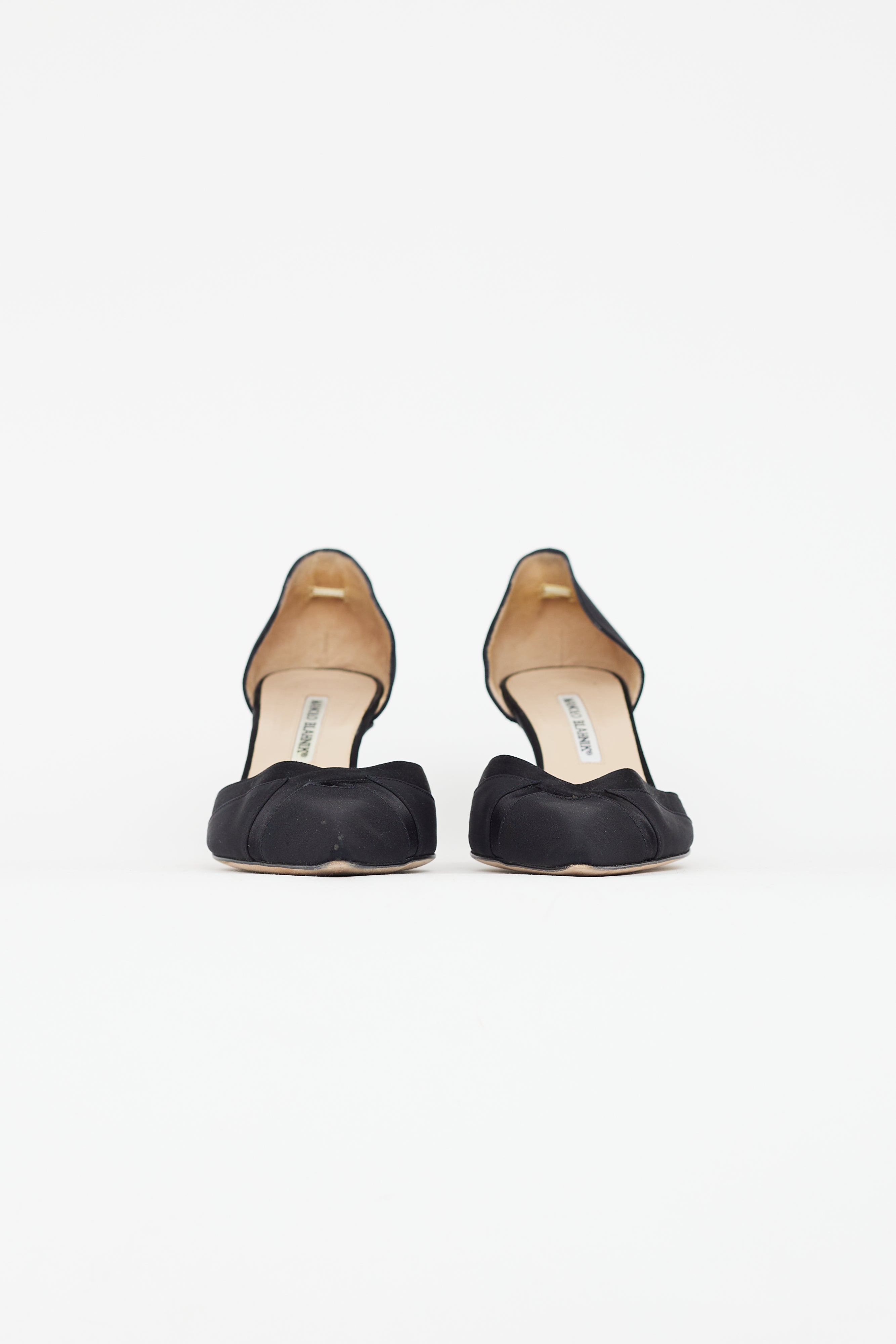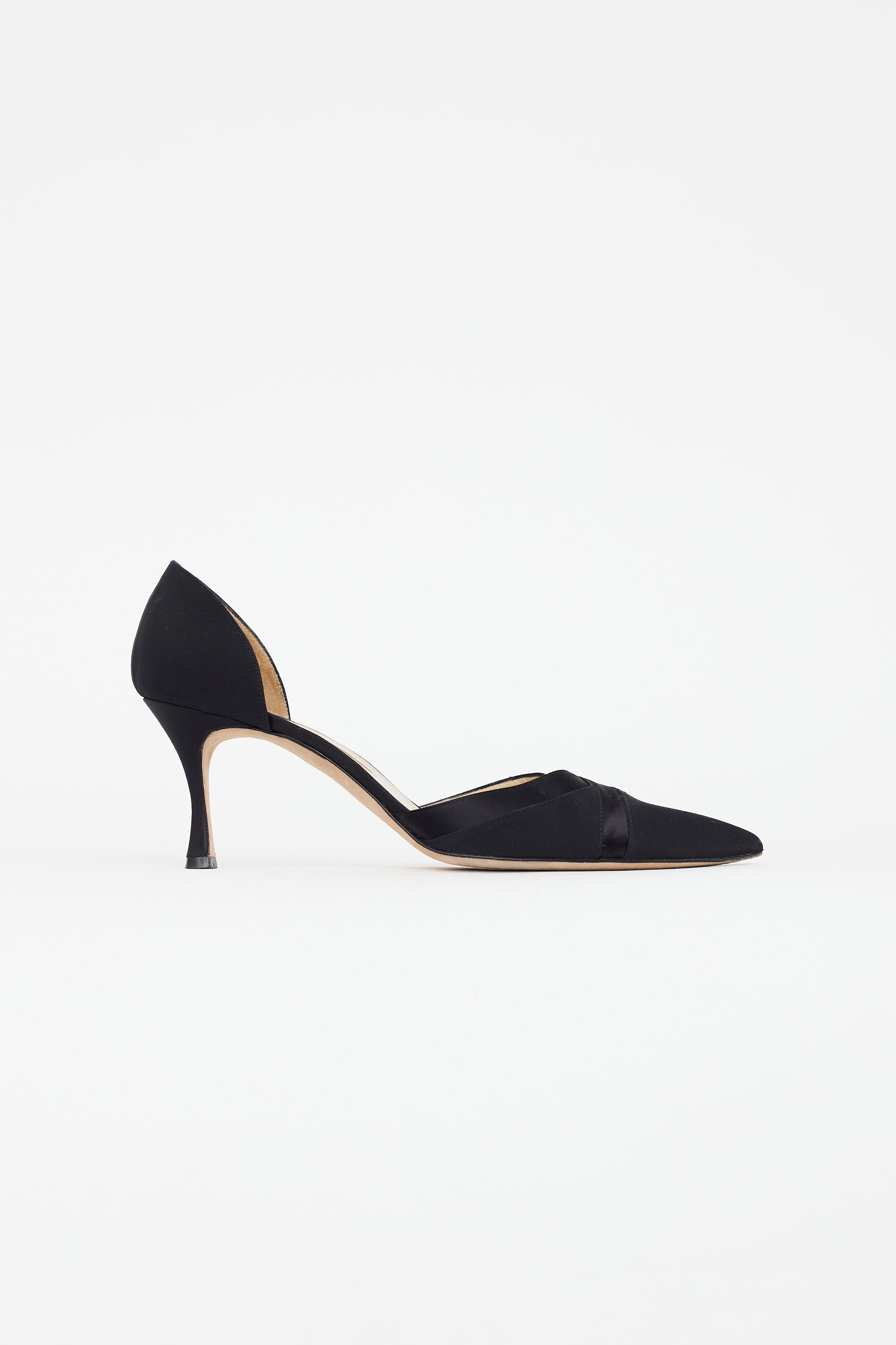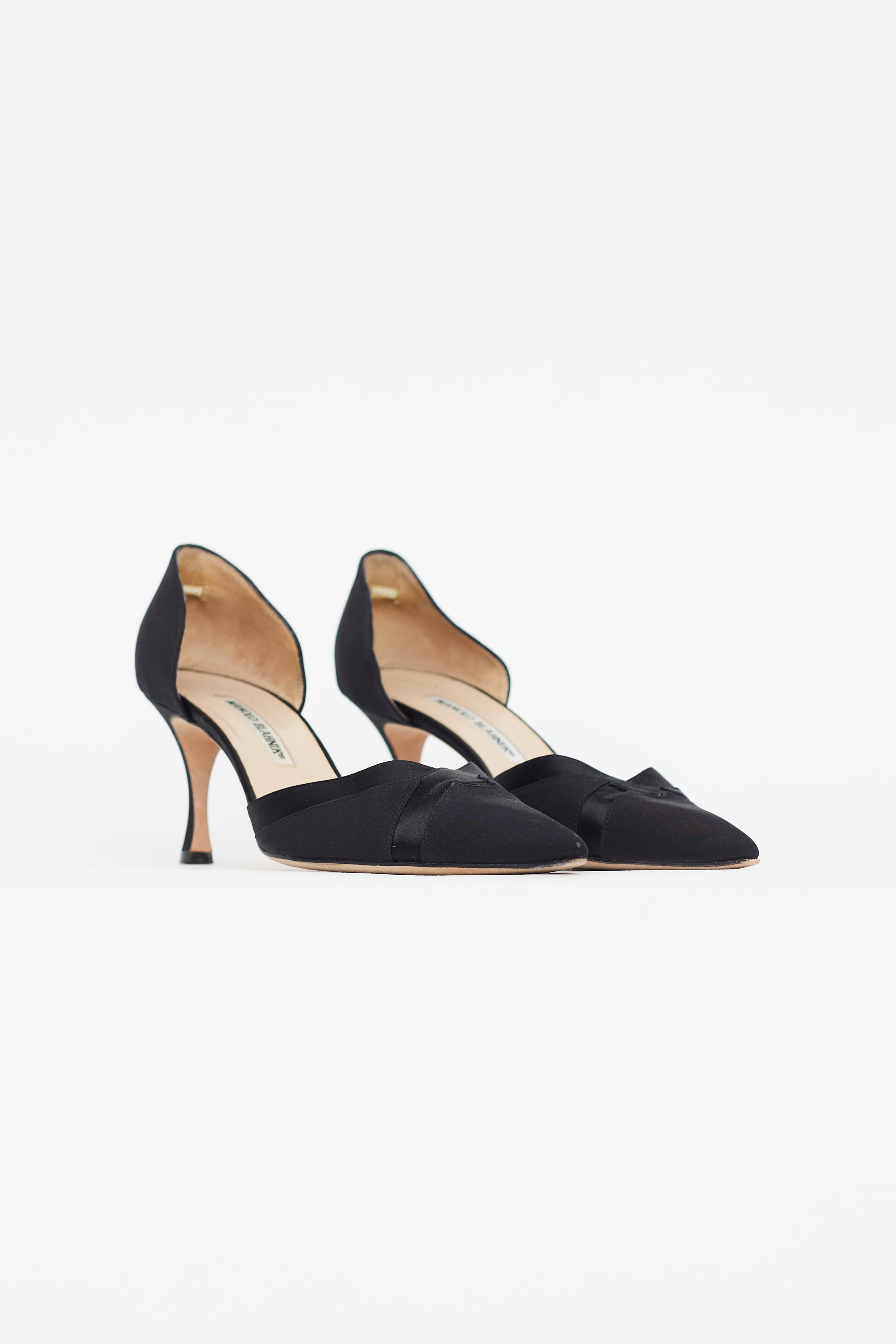 Pre-owned Manolo Blahnik black textile cut out pumps featuring pointed toe, satin trim at toe box featuring cut out design, covered textile heel, and leather insole.