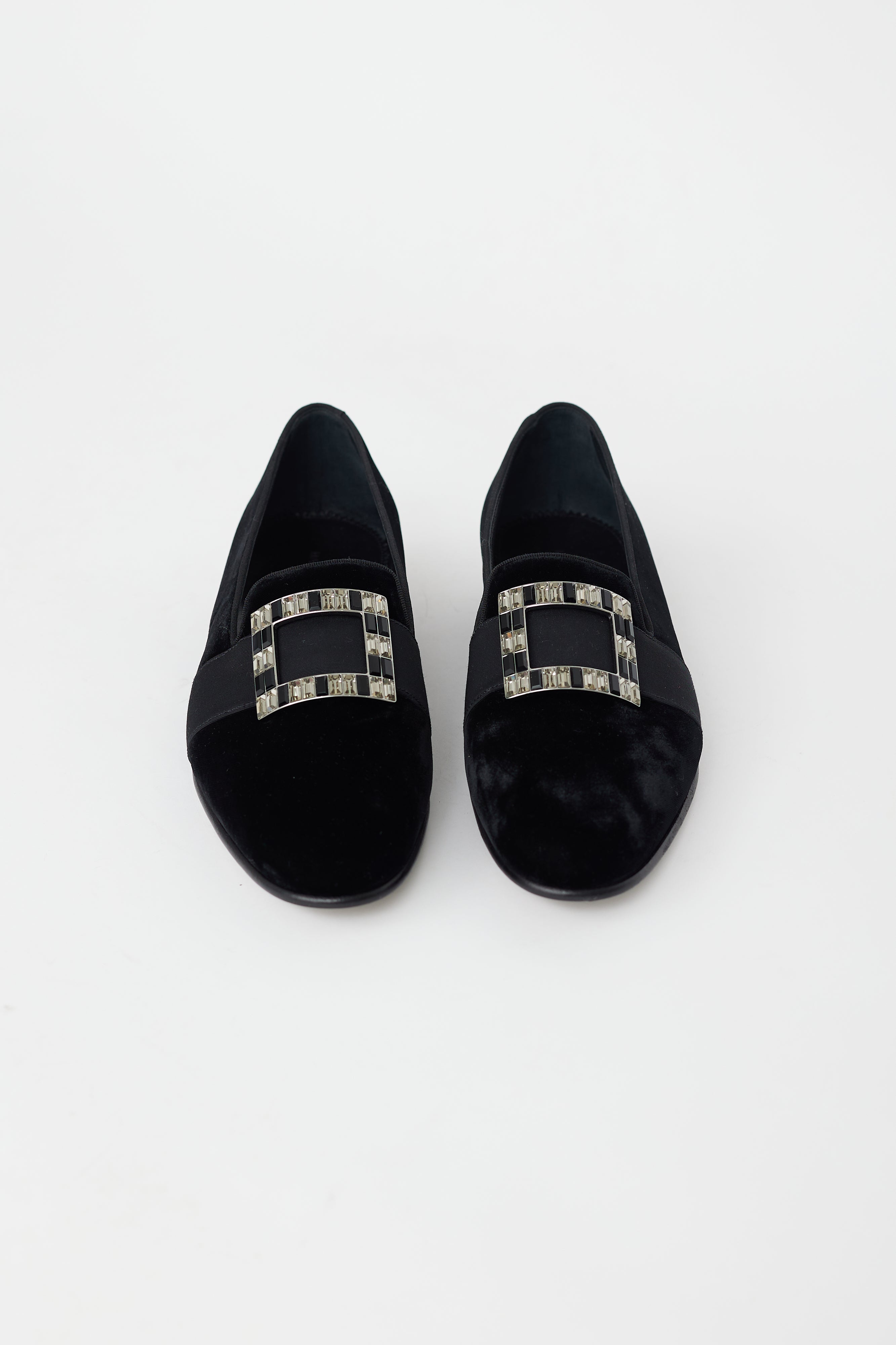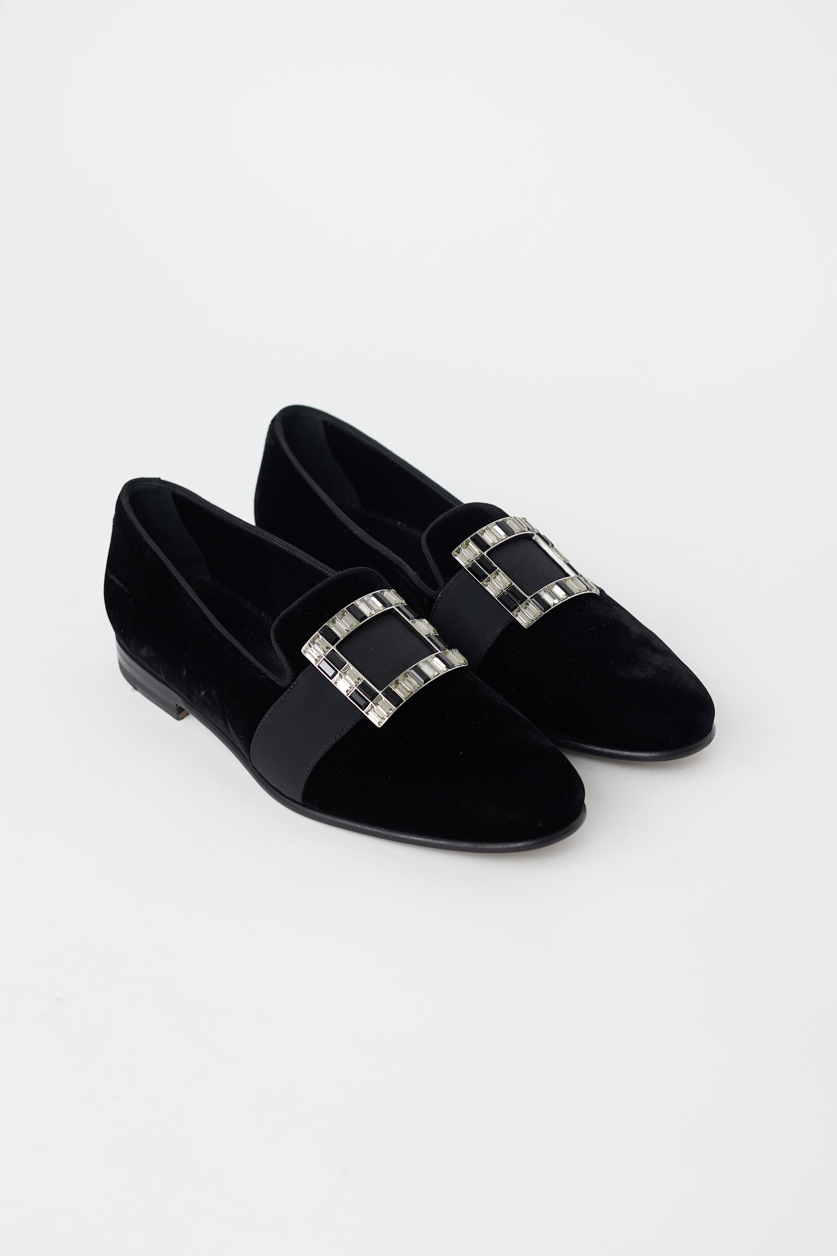 Pre-owned Manolo Blahnik black velvet loafers featuring rounded toe, black and clear gem embellished buckle, slip on entry, tonal grosgrain trim at opening at vamp, and stacked block heel.