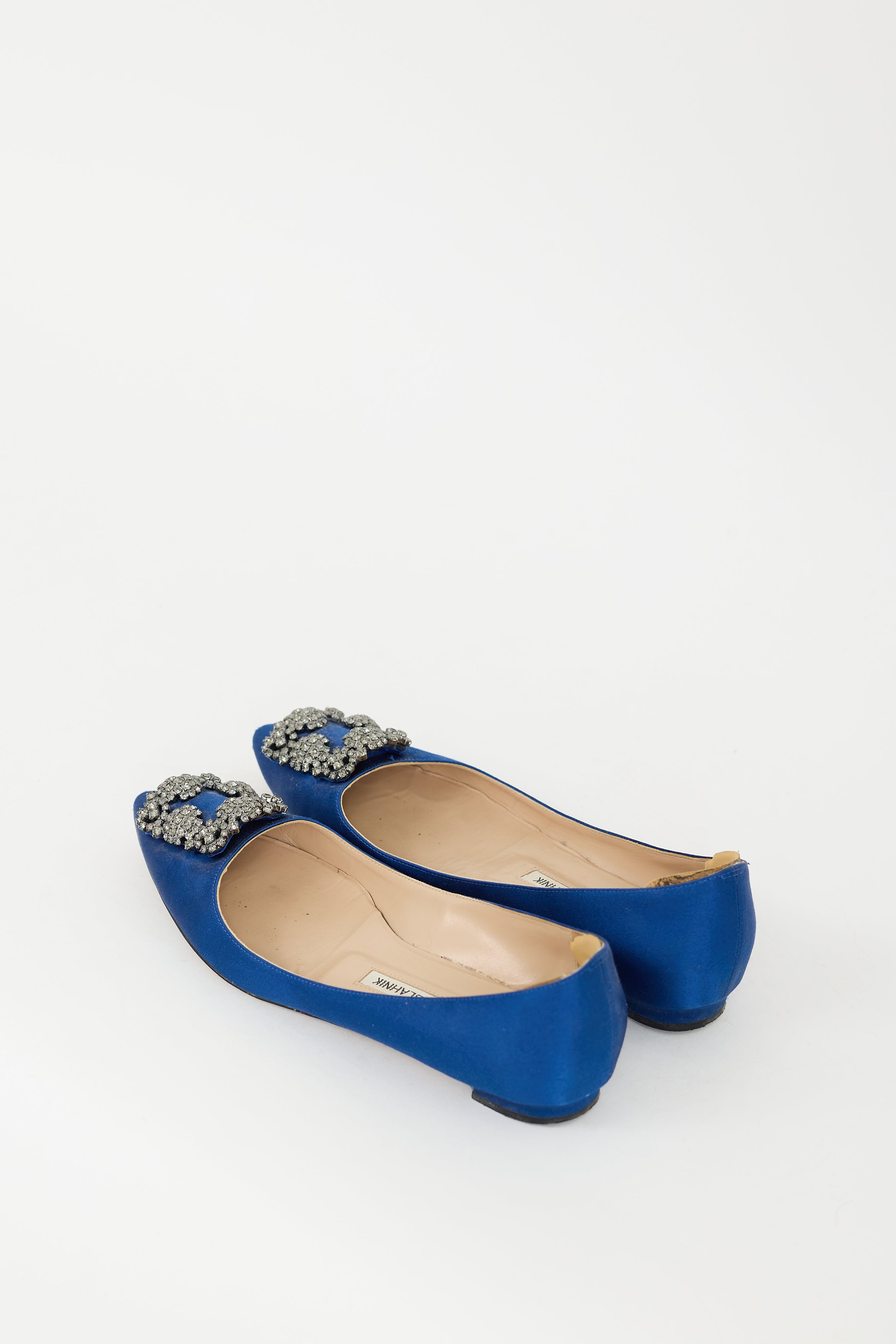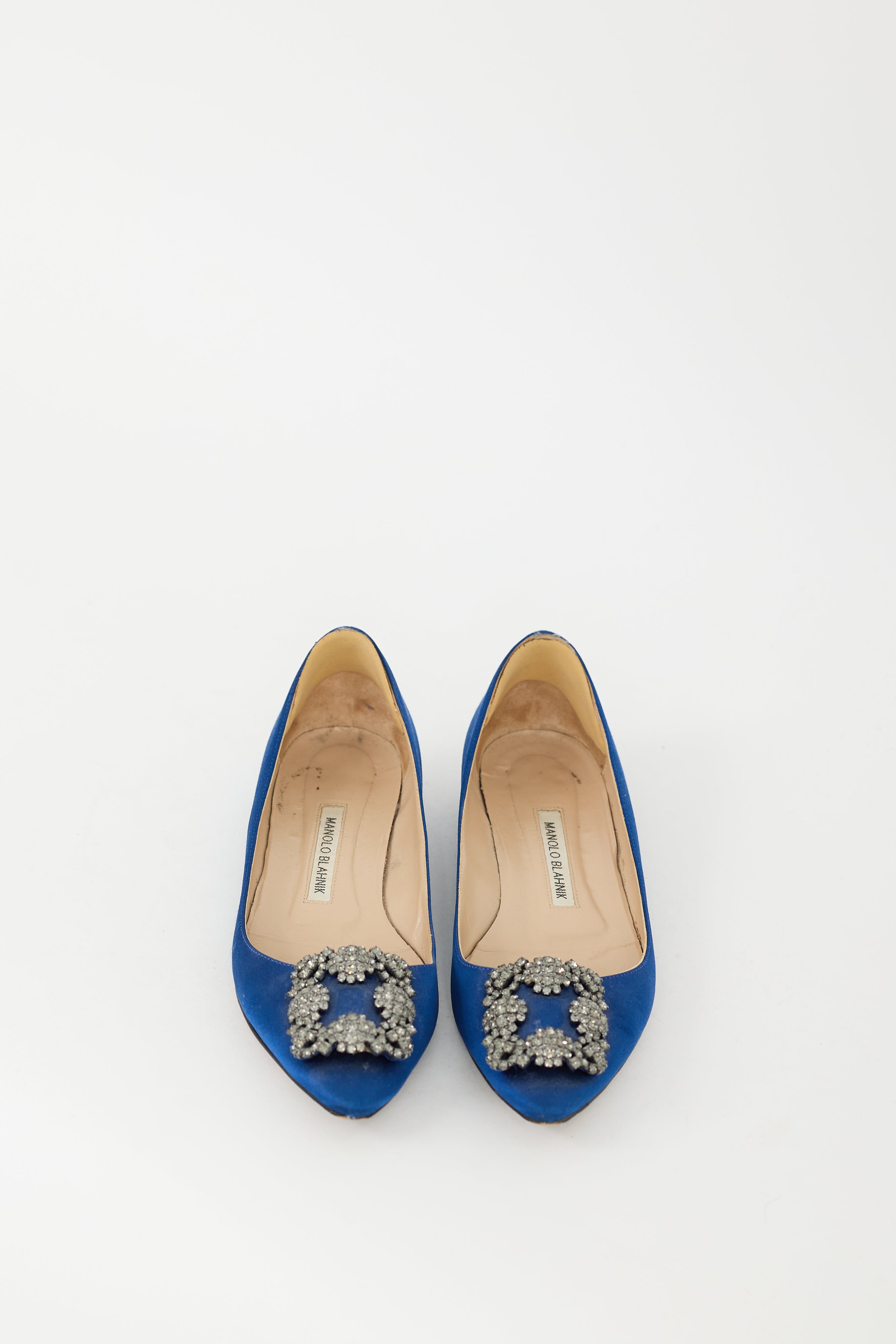 Pre-owned Manolo Blahnik blue Hangisi flats featuring pointed toe, crystal embellished buckle at vamp, slip on entry, and short covered heel. Comes with original box.