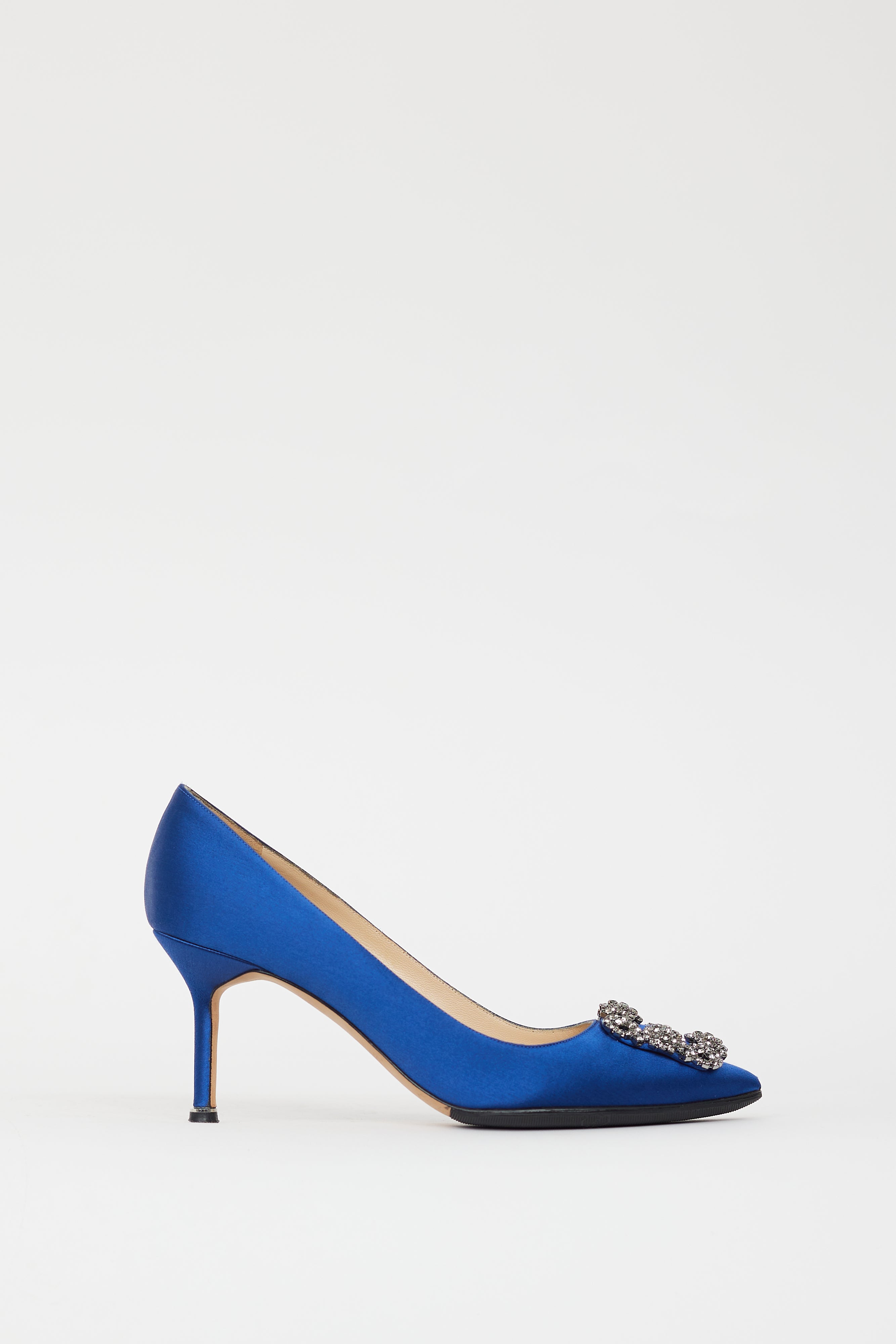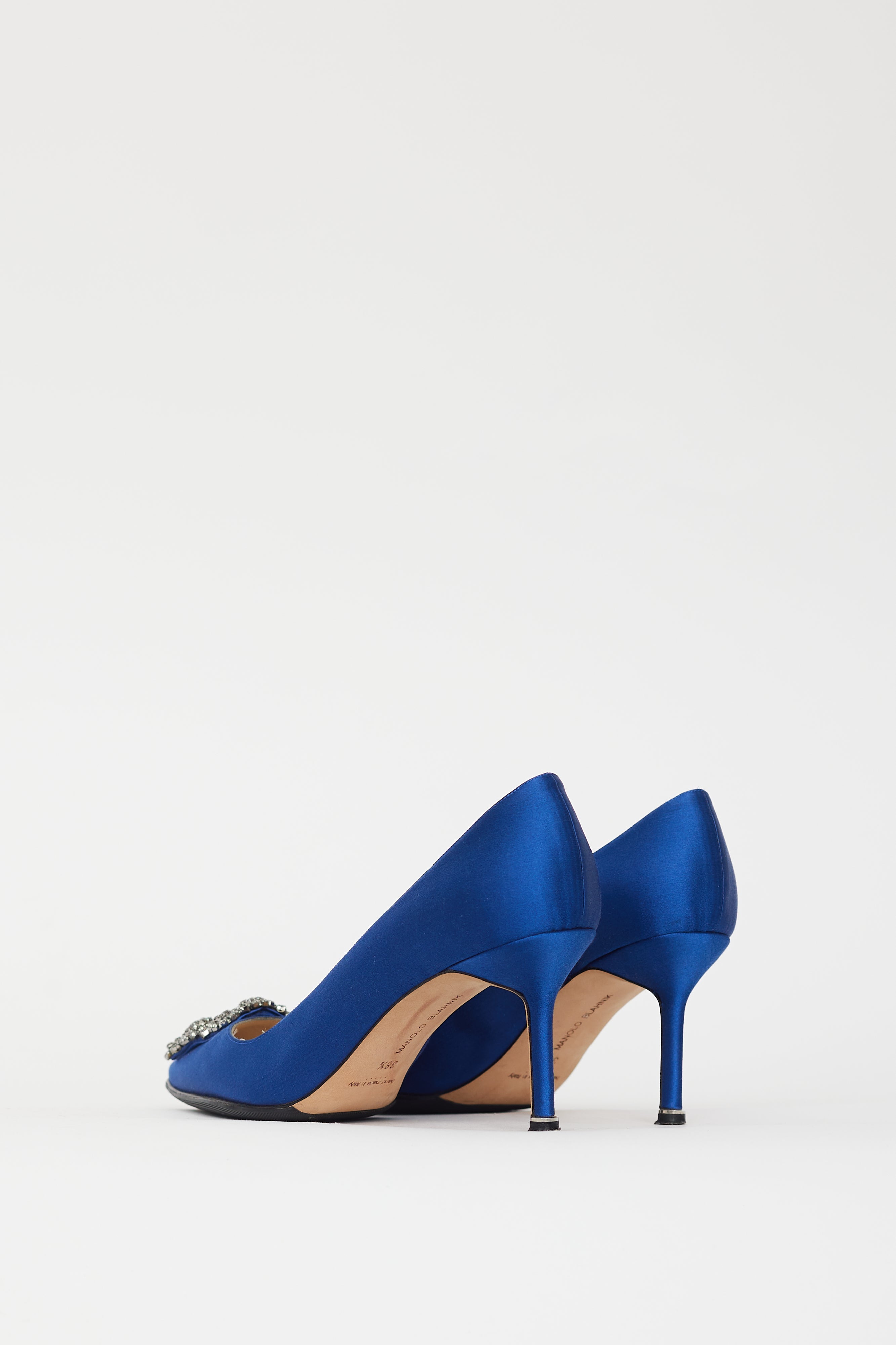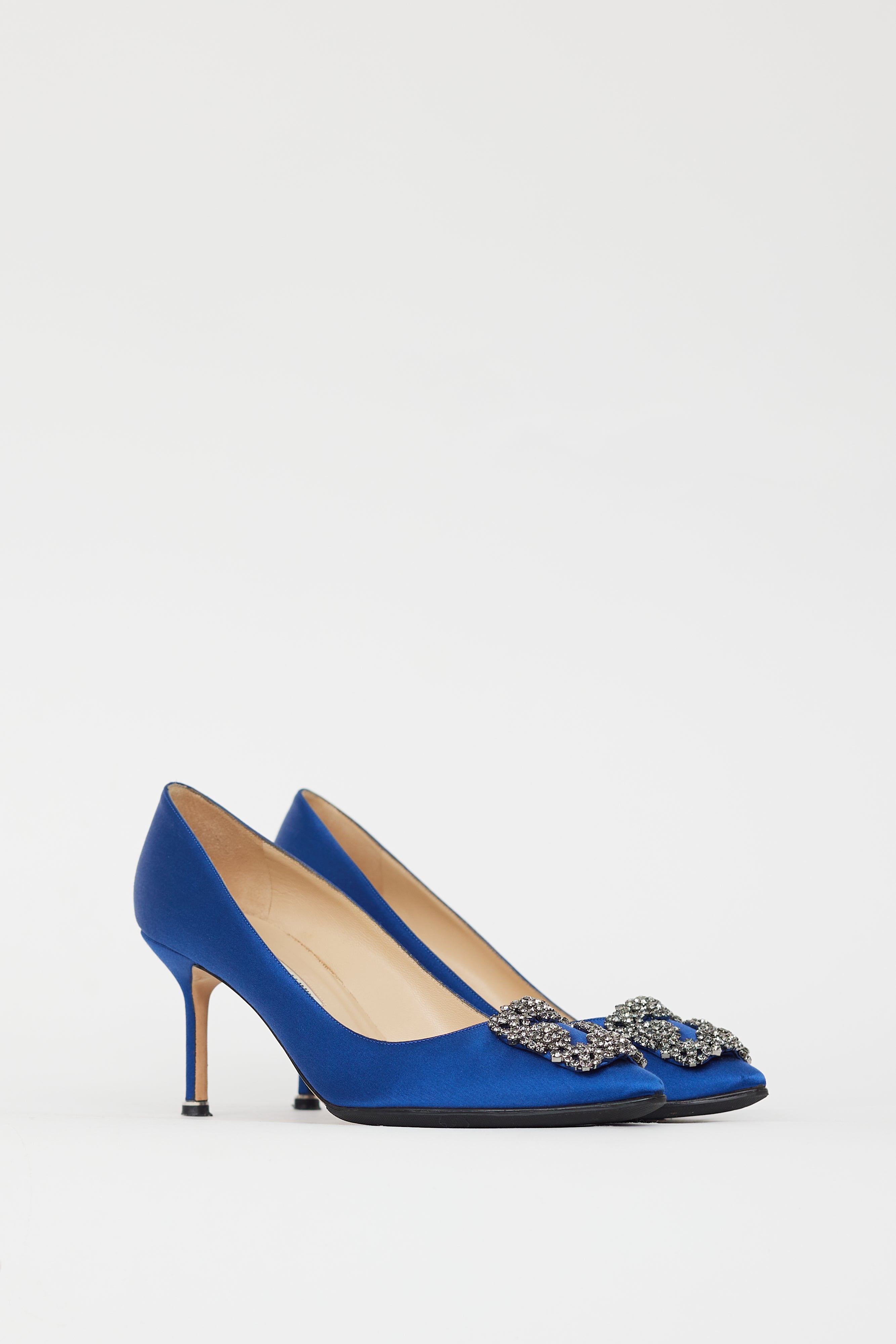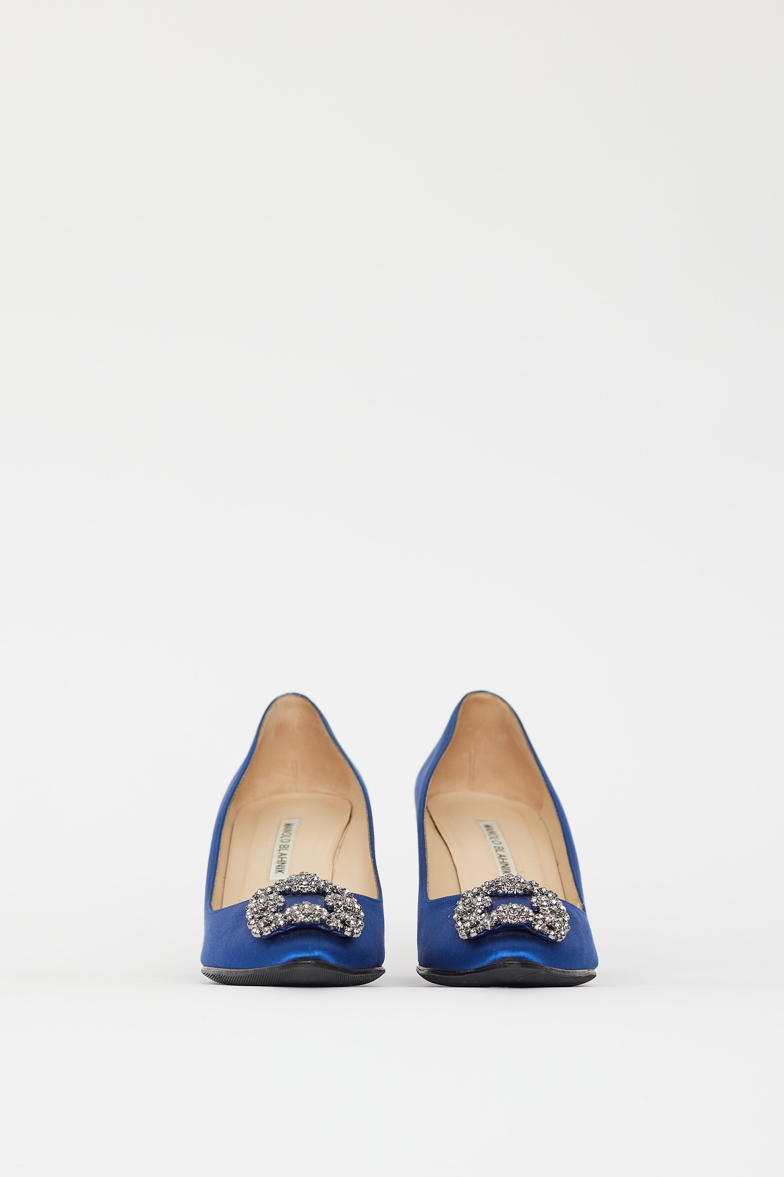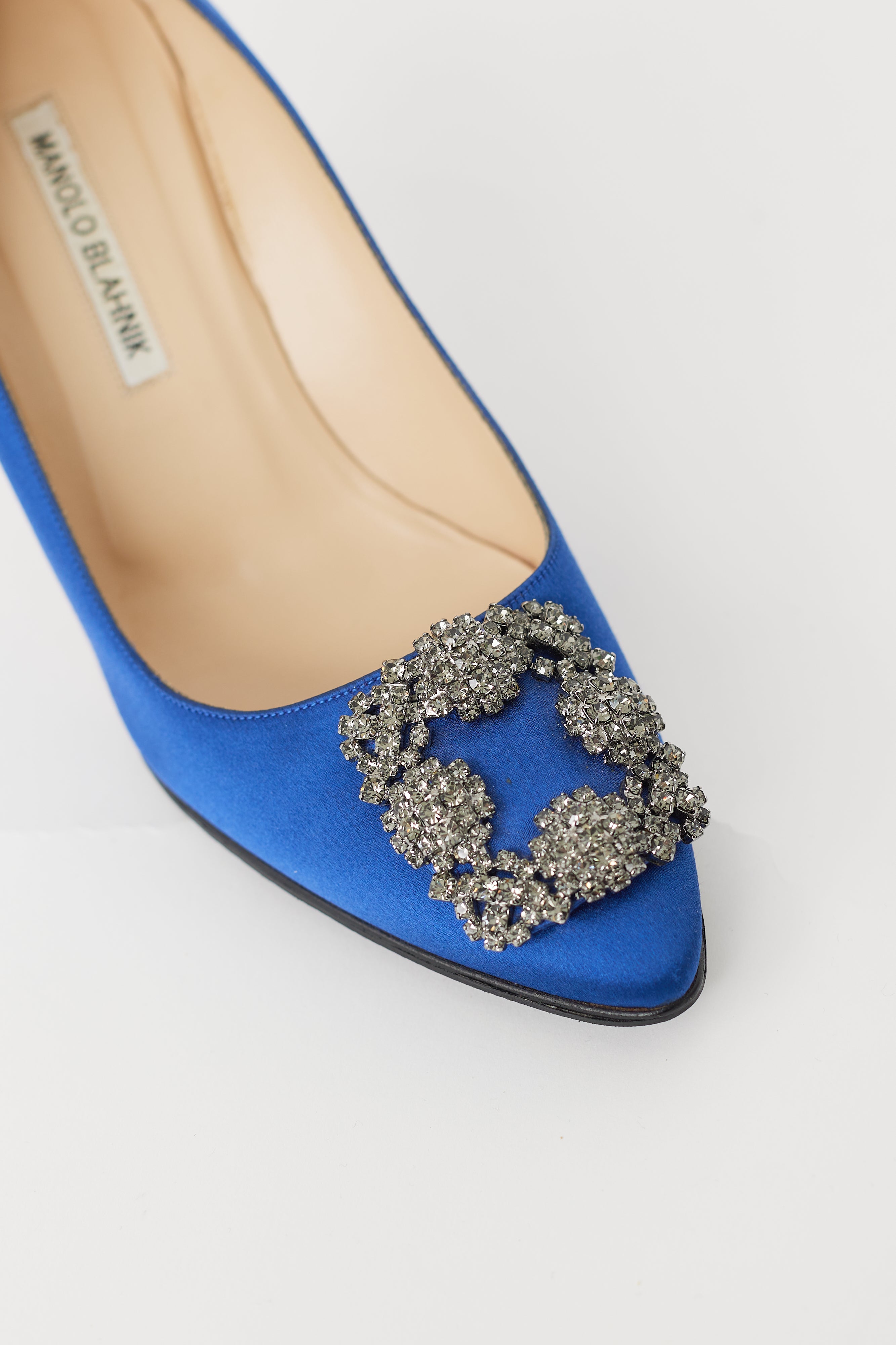 Pre-owned Manolo Blahnik blue satin Hangisi pumps featuring a pointed toe, jewel embellished brooch detail, wrapped stiletto heel, and slip on entry. Comes with original dust bags and box.