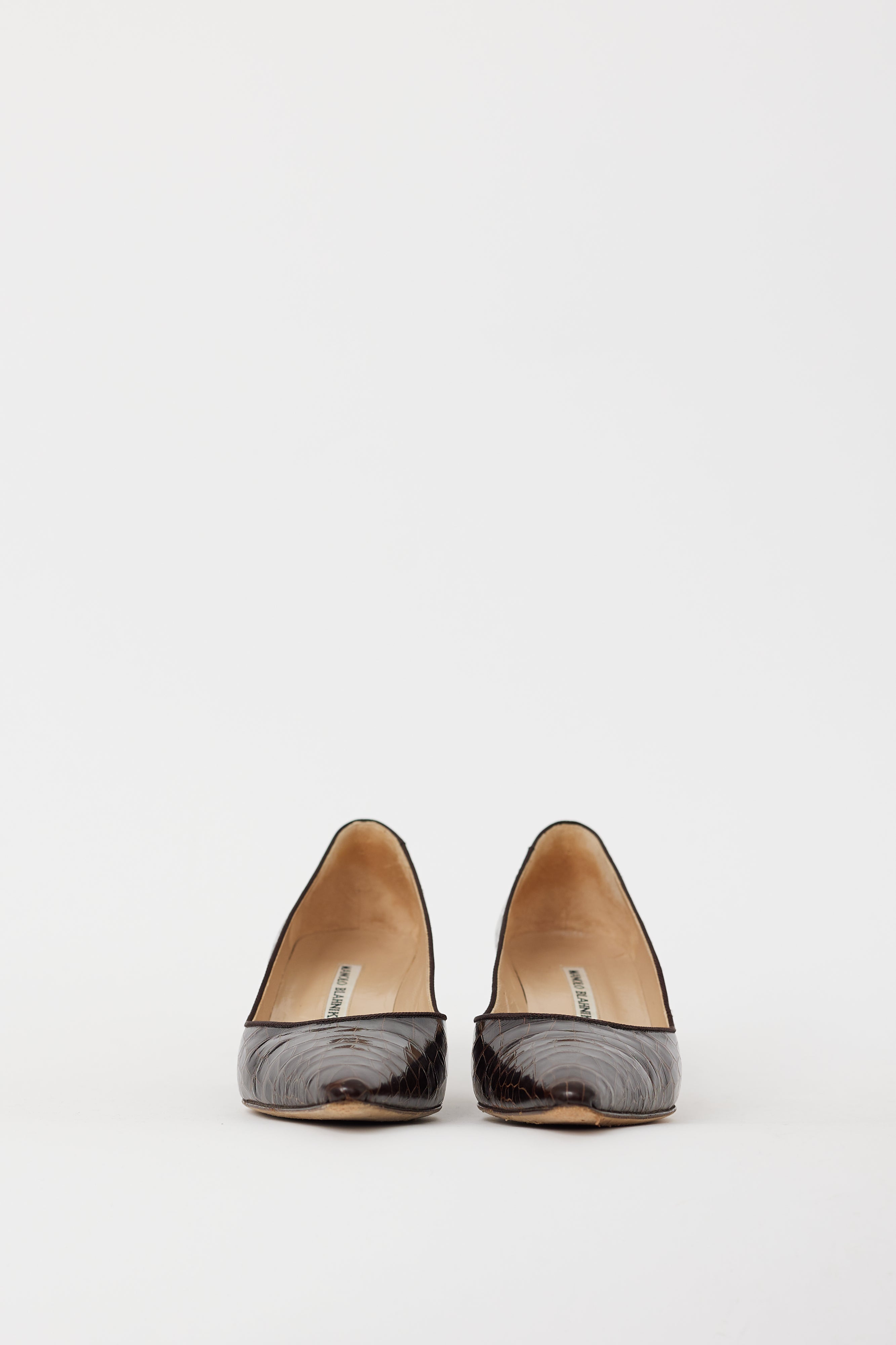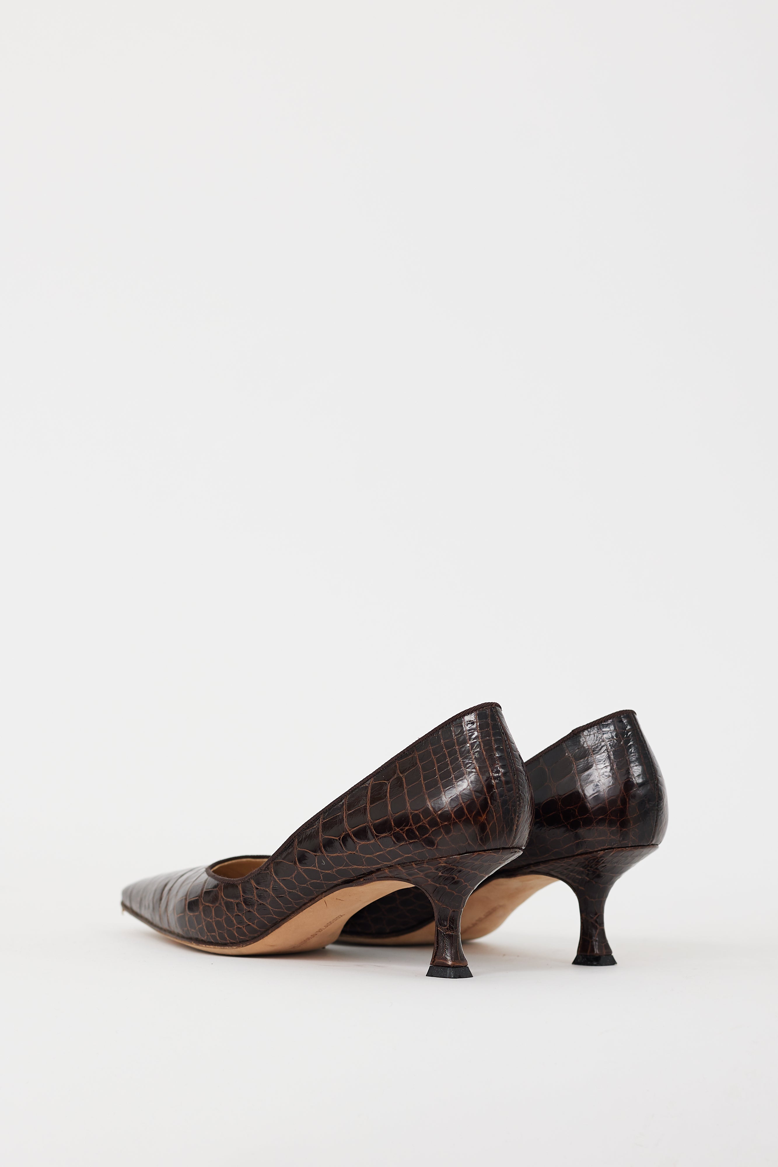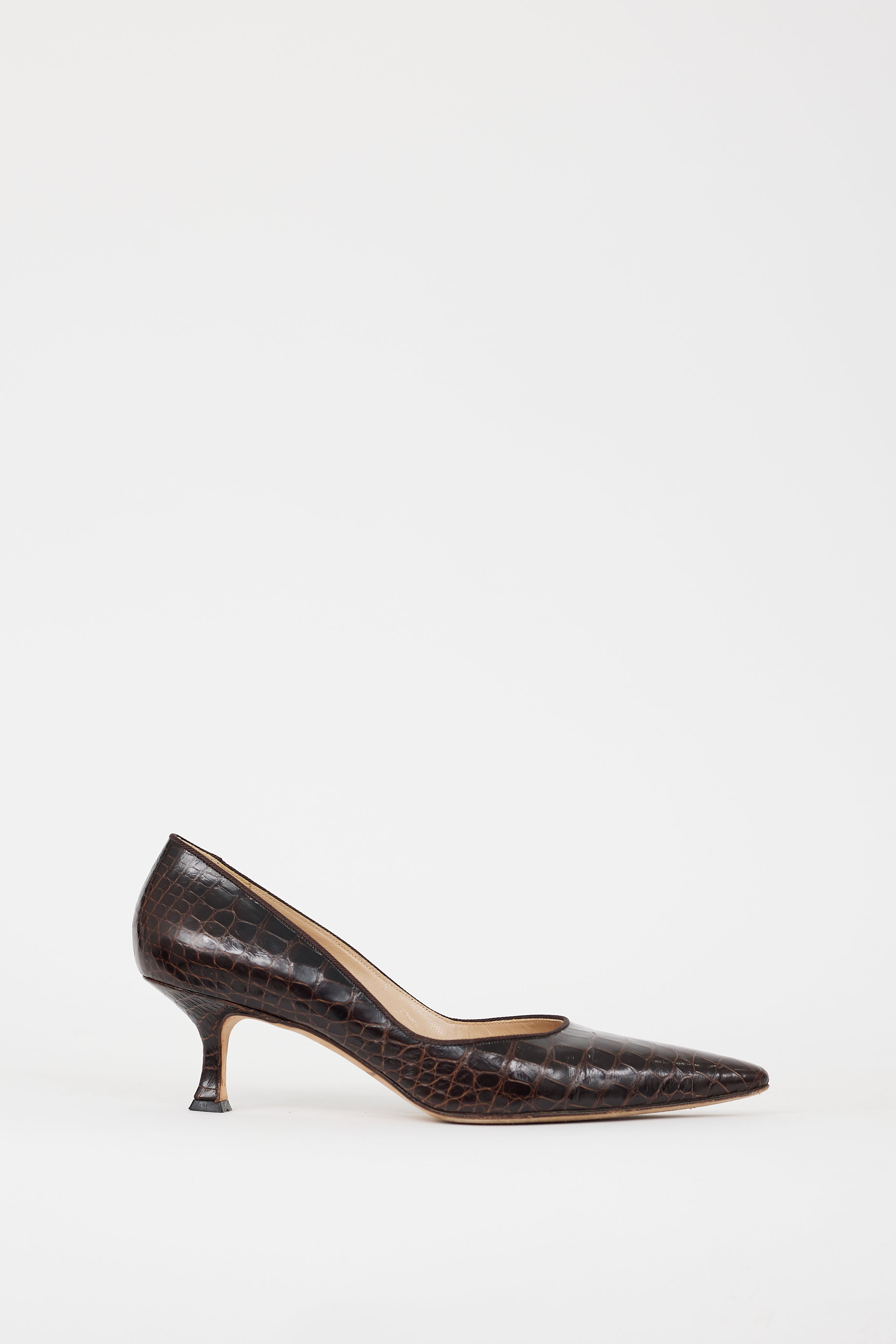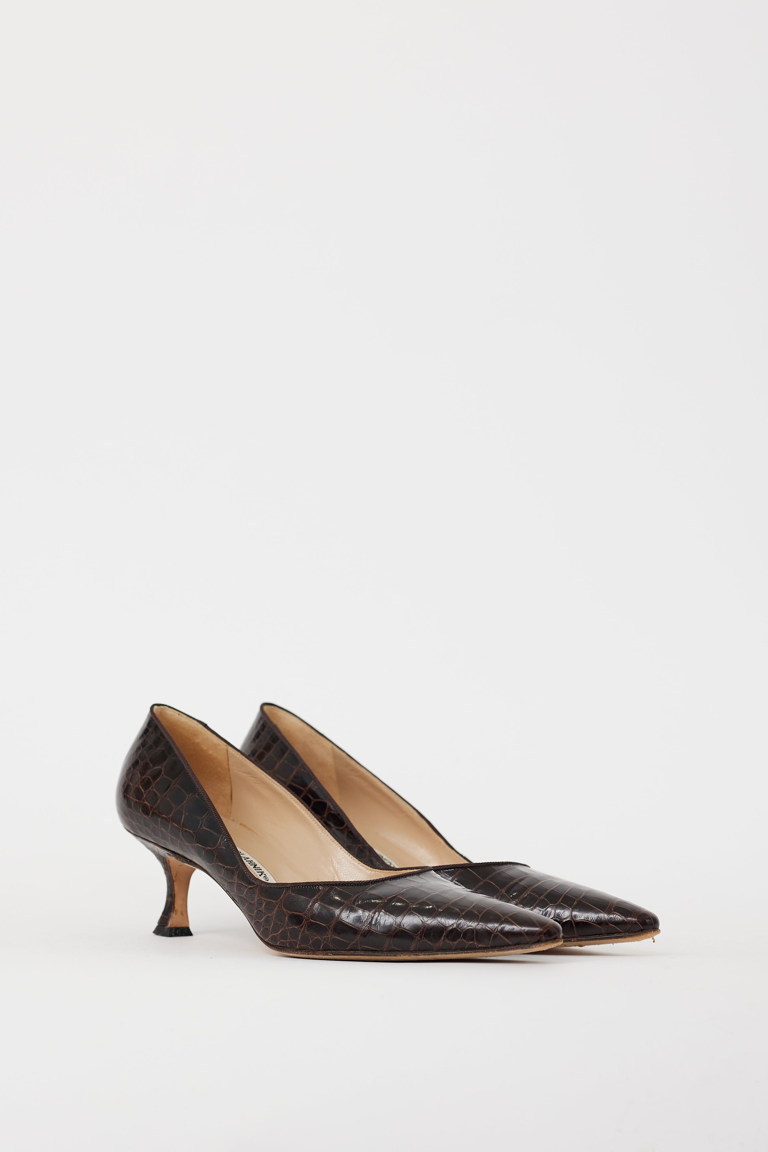 Pre-owned Manolo Blahnik brown Love 80mm pumps featuring pointed toe, croc effect upper, slip on entry, and kitten heel. Comes with original dust bag.