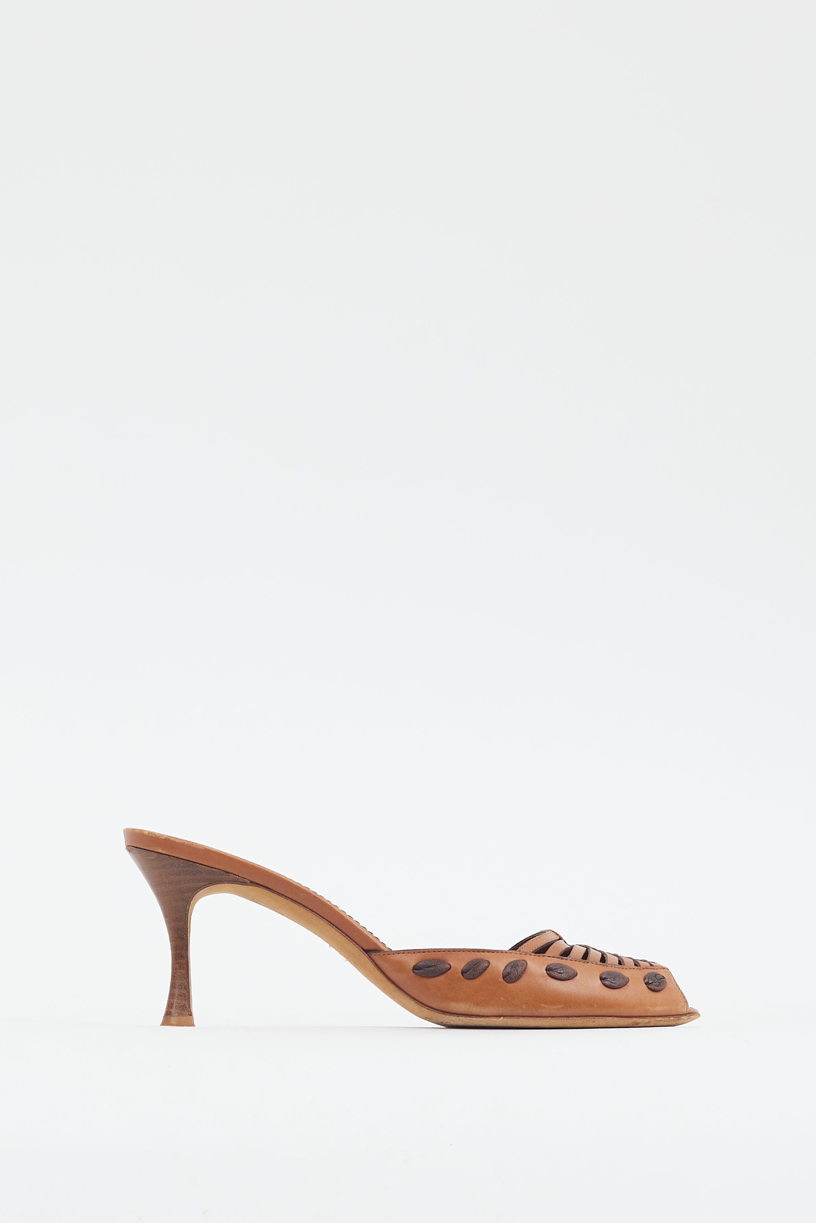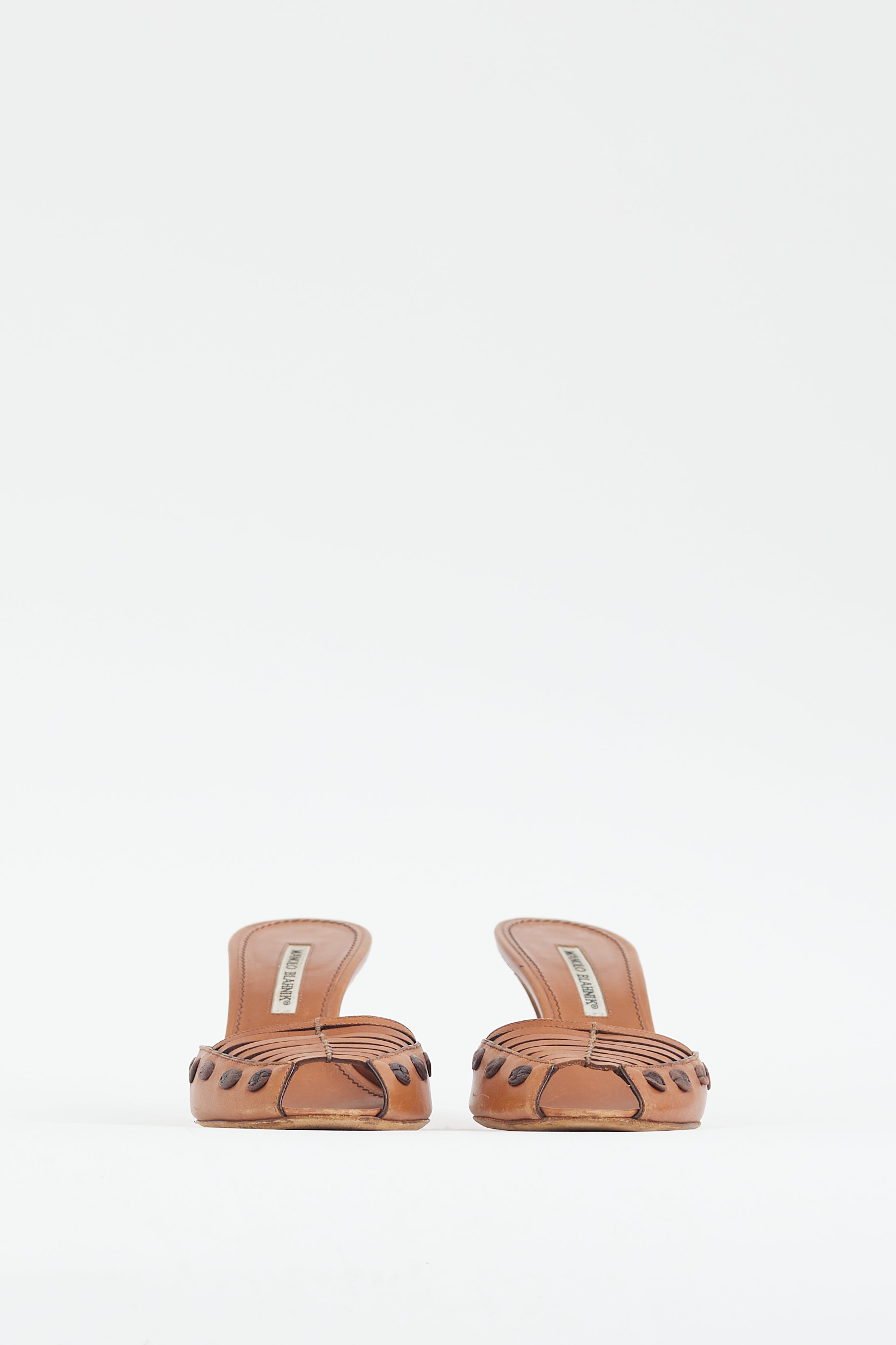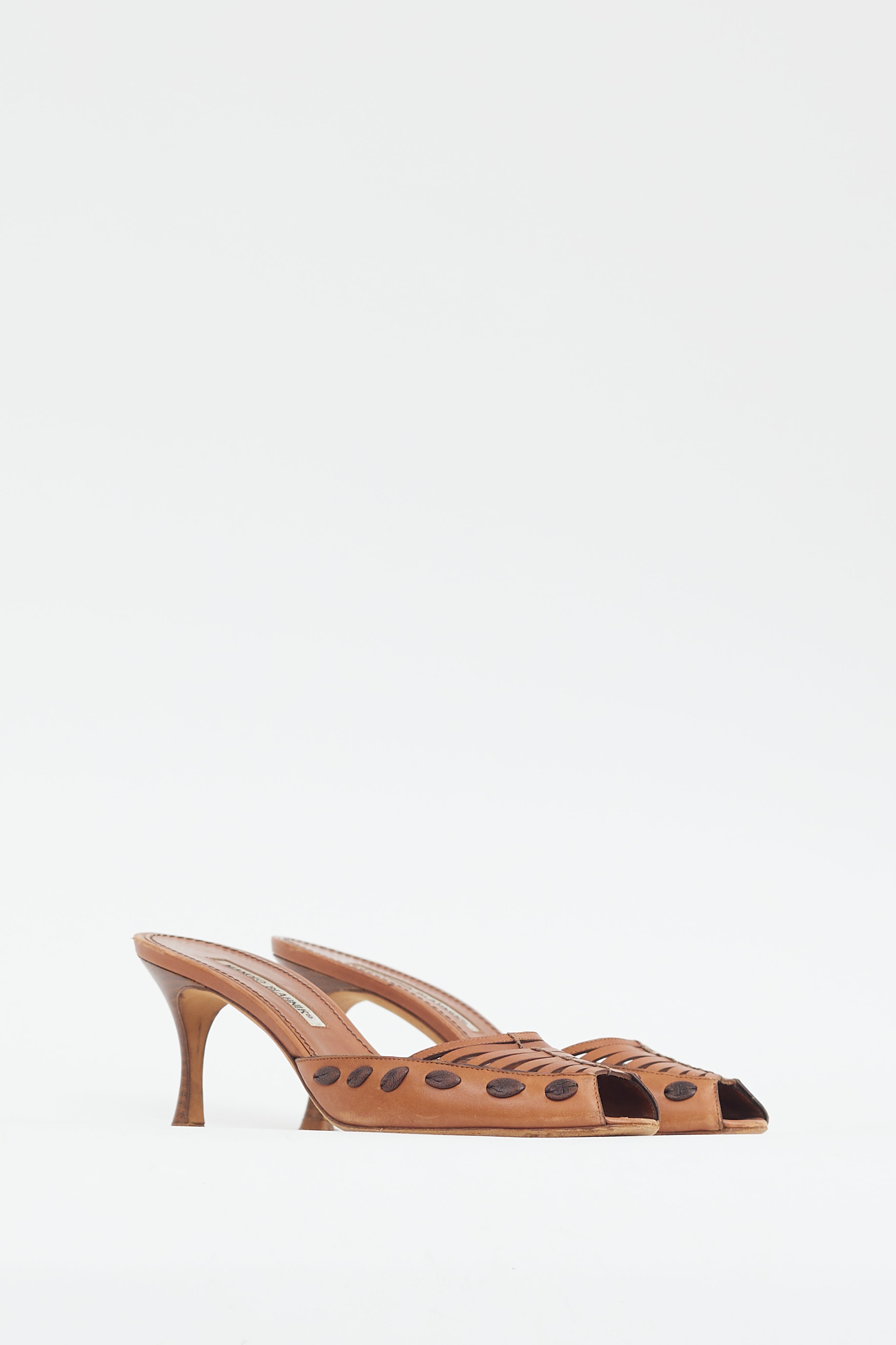 Pre-owned Manolo Blahnik brown leather woven mules featuring strappy cage upper, peep toe, slip on entry, wooden kitten heel, and leather insoles.