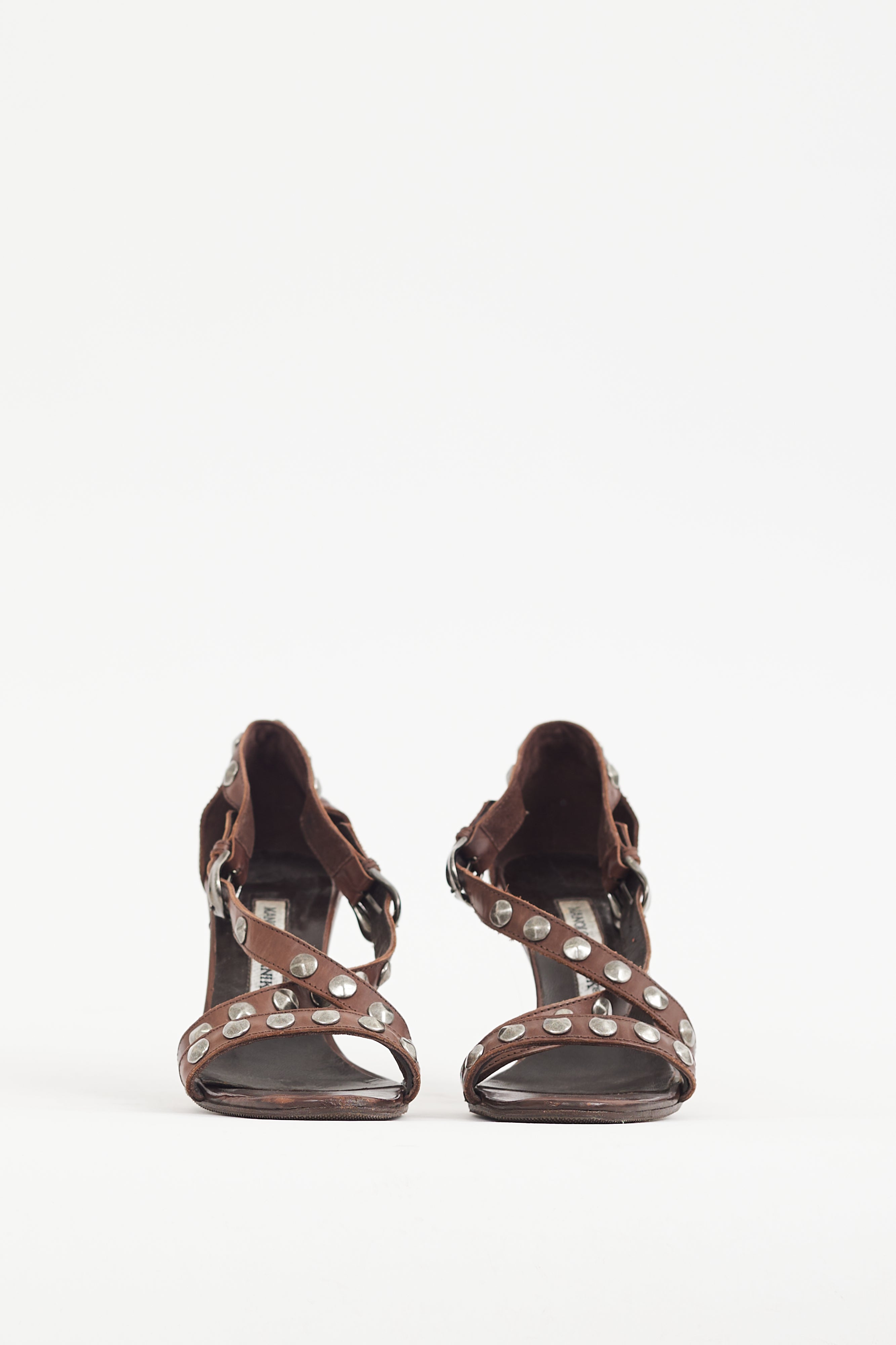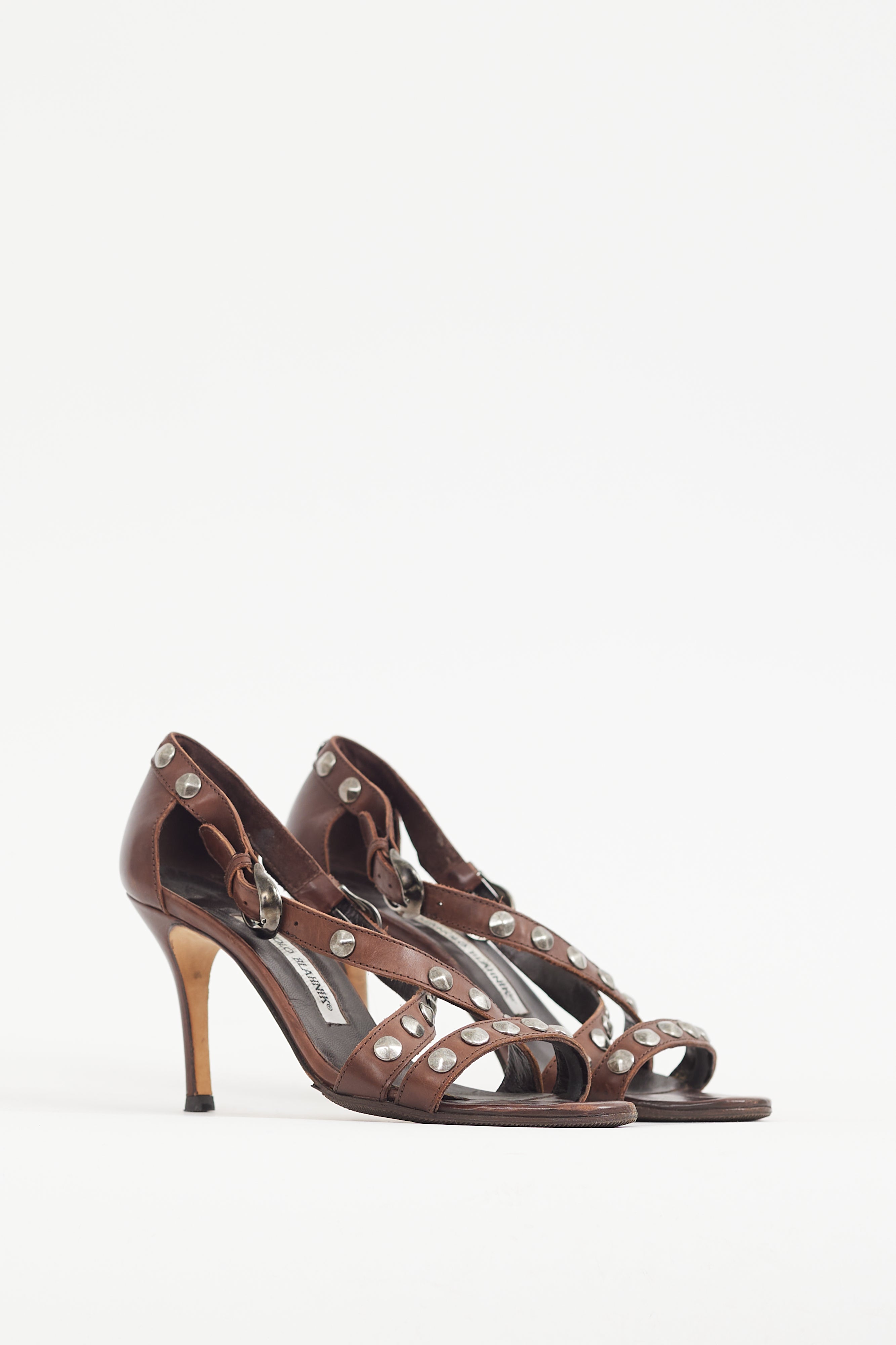 Pre-owned Manolo Blahnik heels featuring a rounded open toe, brown leather uppers with silver tone stud embellishment throughout, one strap at vamp, crossed straps at body with dual buckle closure, and a stiletto heel.
