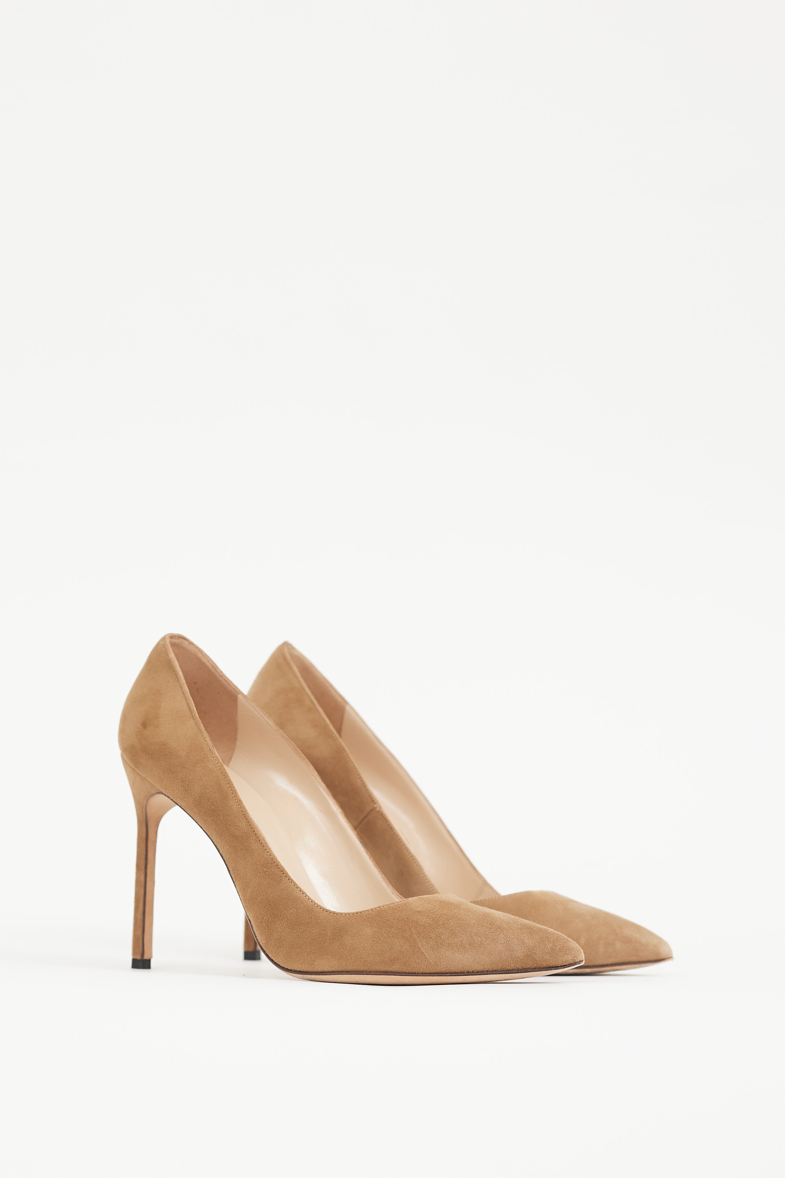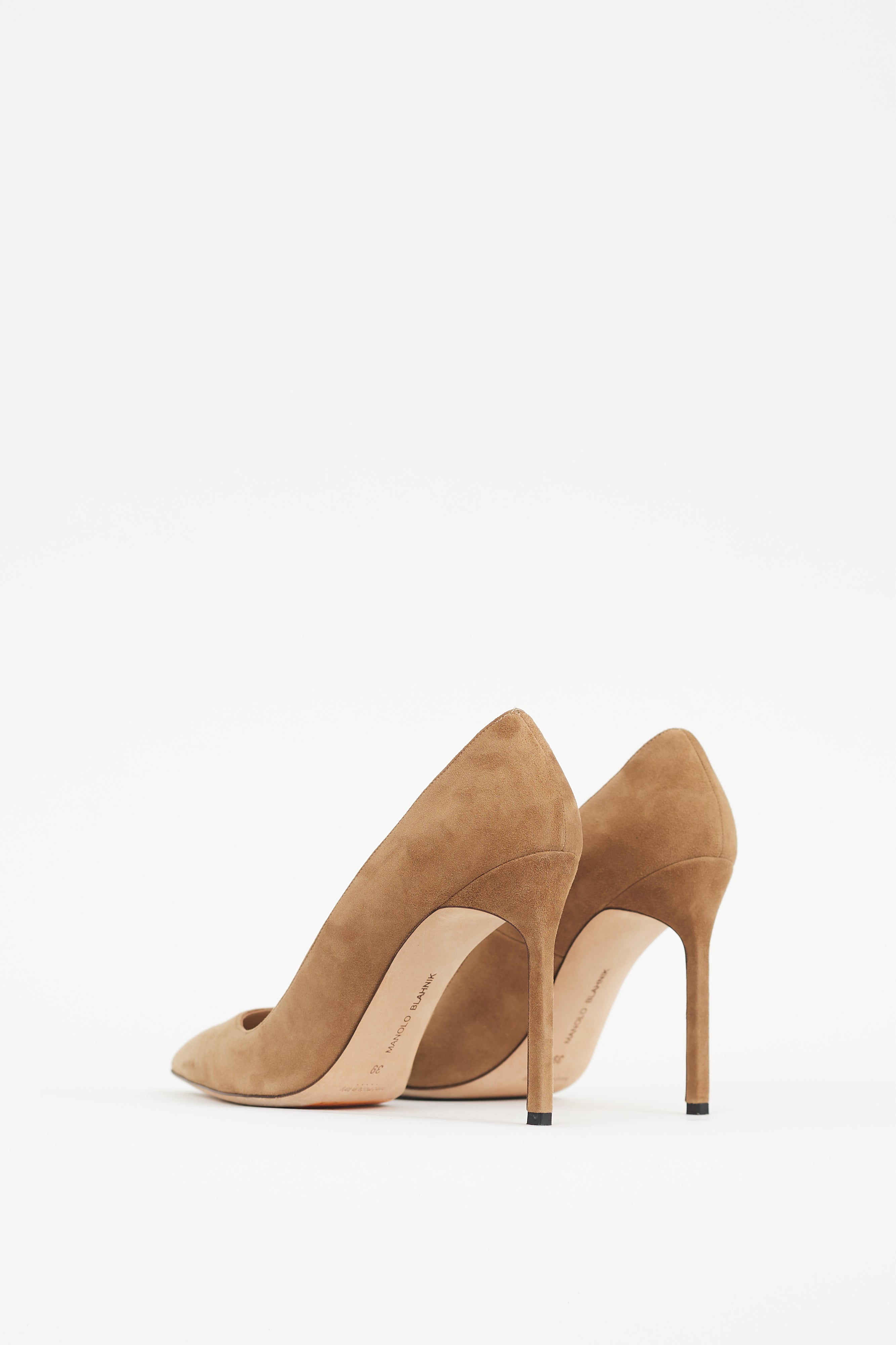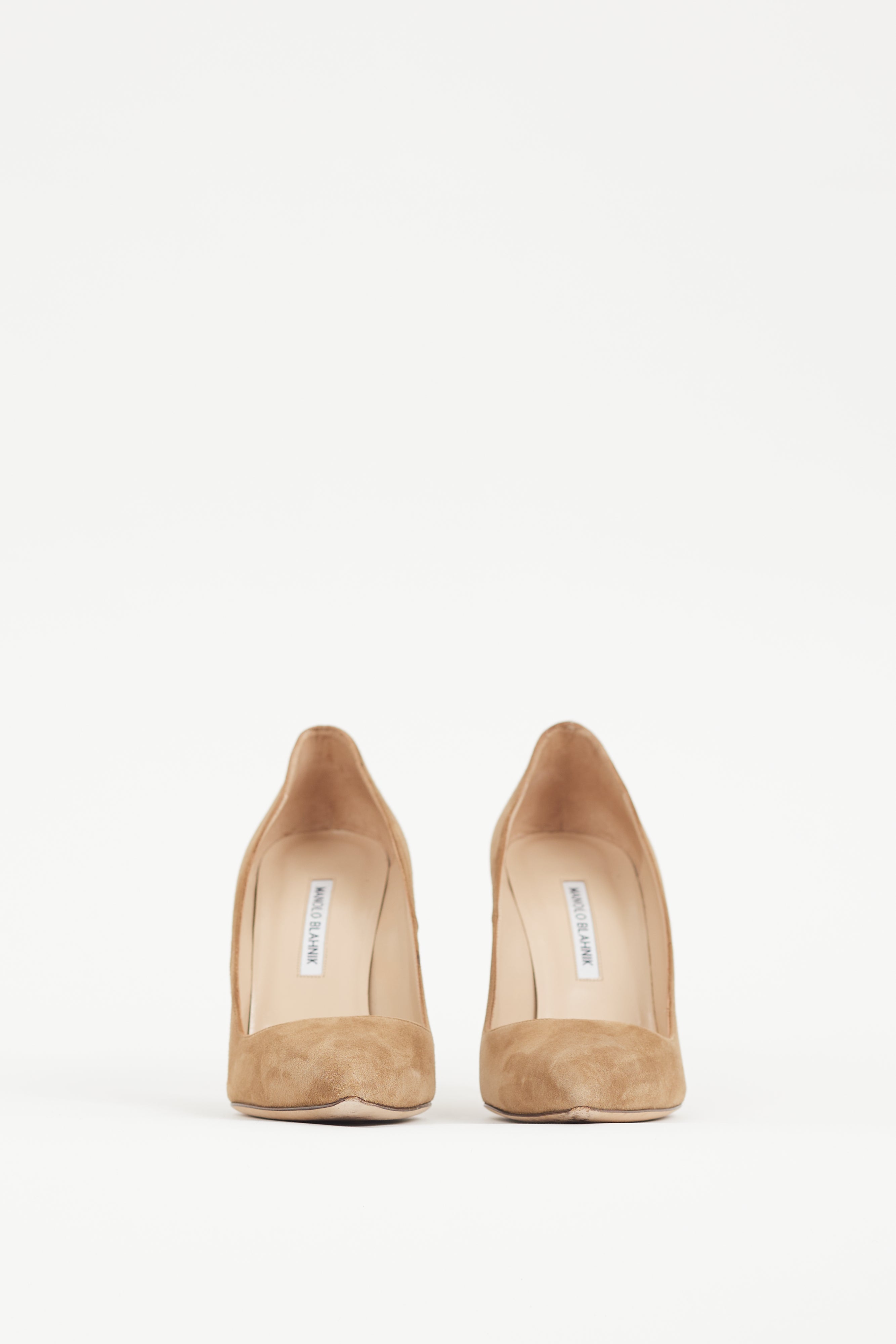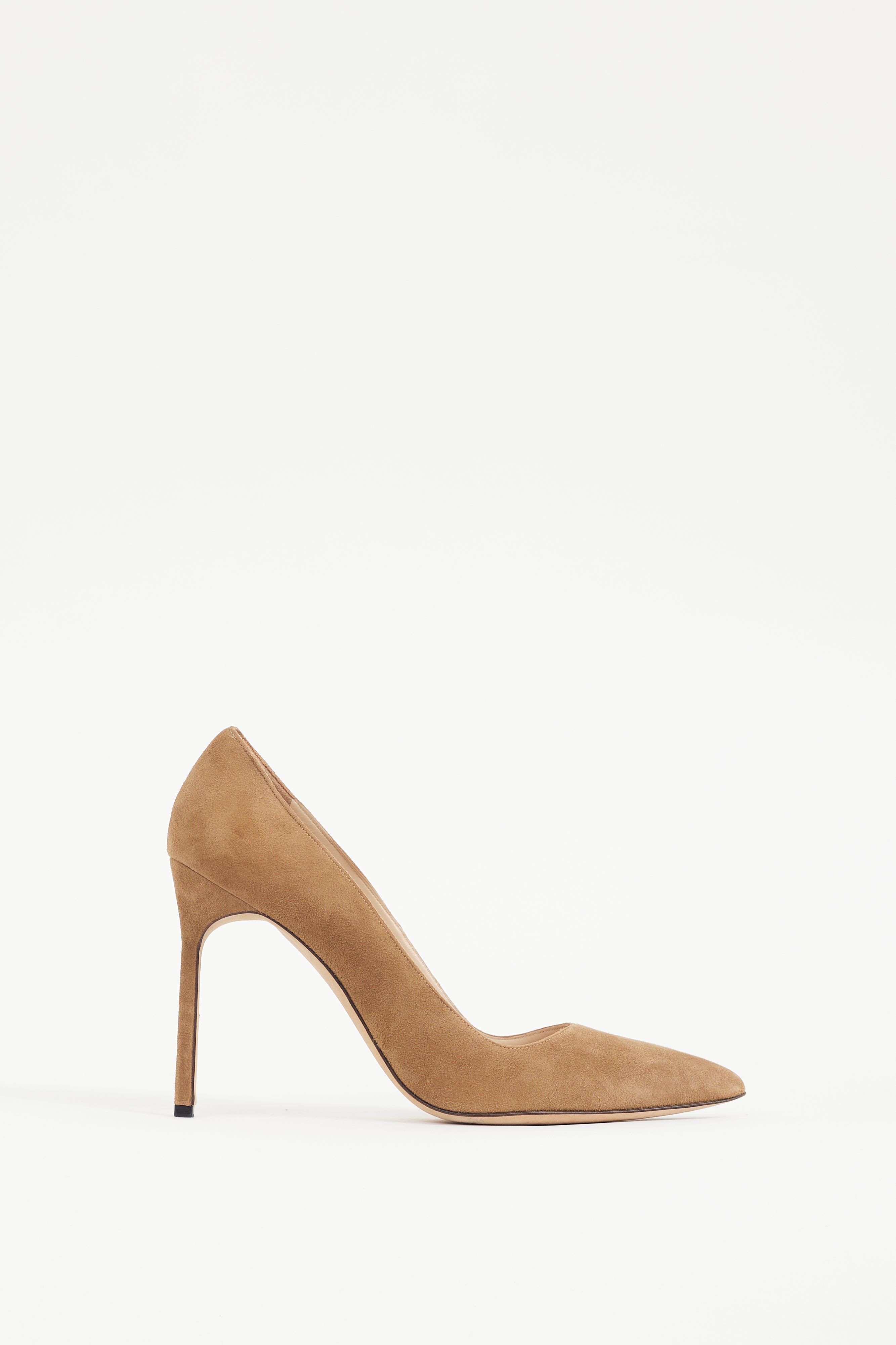 Pre-owned Manolo Blahnik brown BB suede heels featuring a pointed toe, and wrapped stiletto heel. Comes with original dust bag.