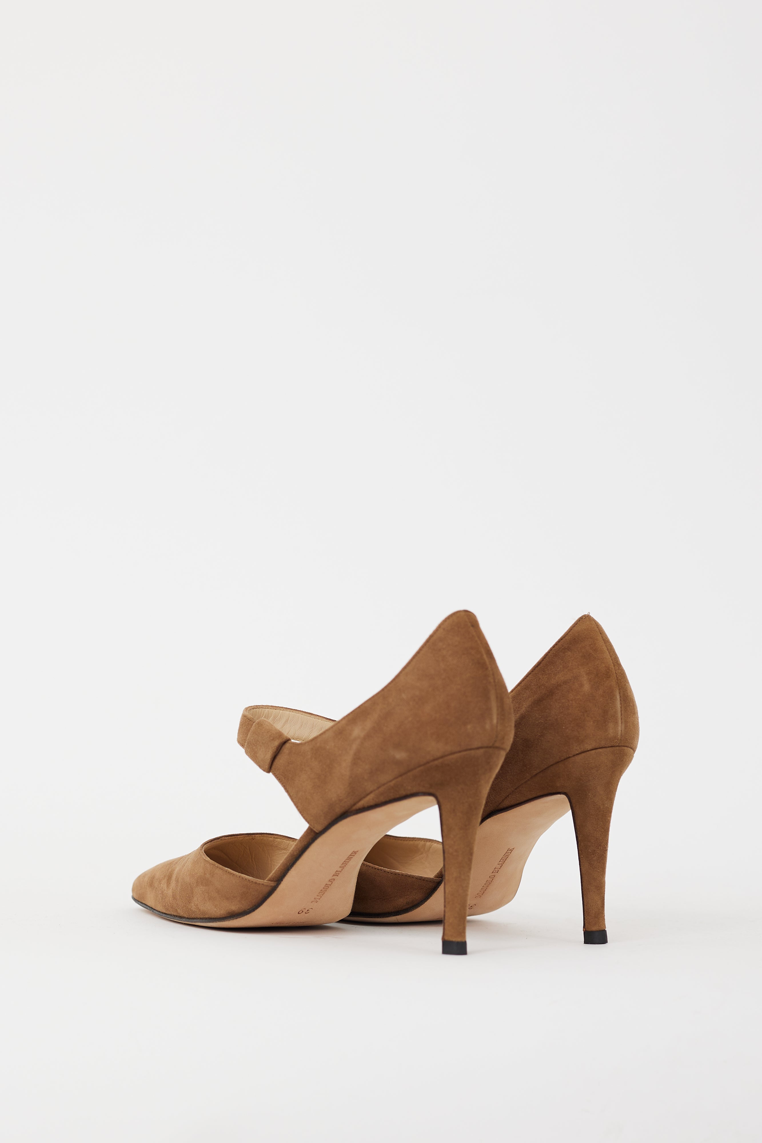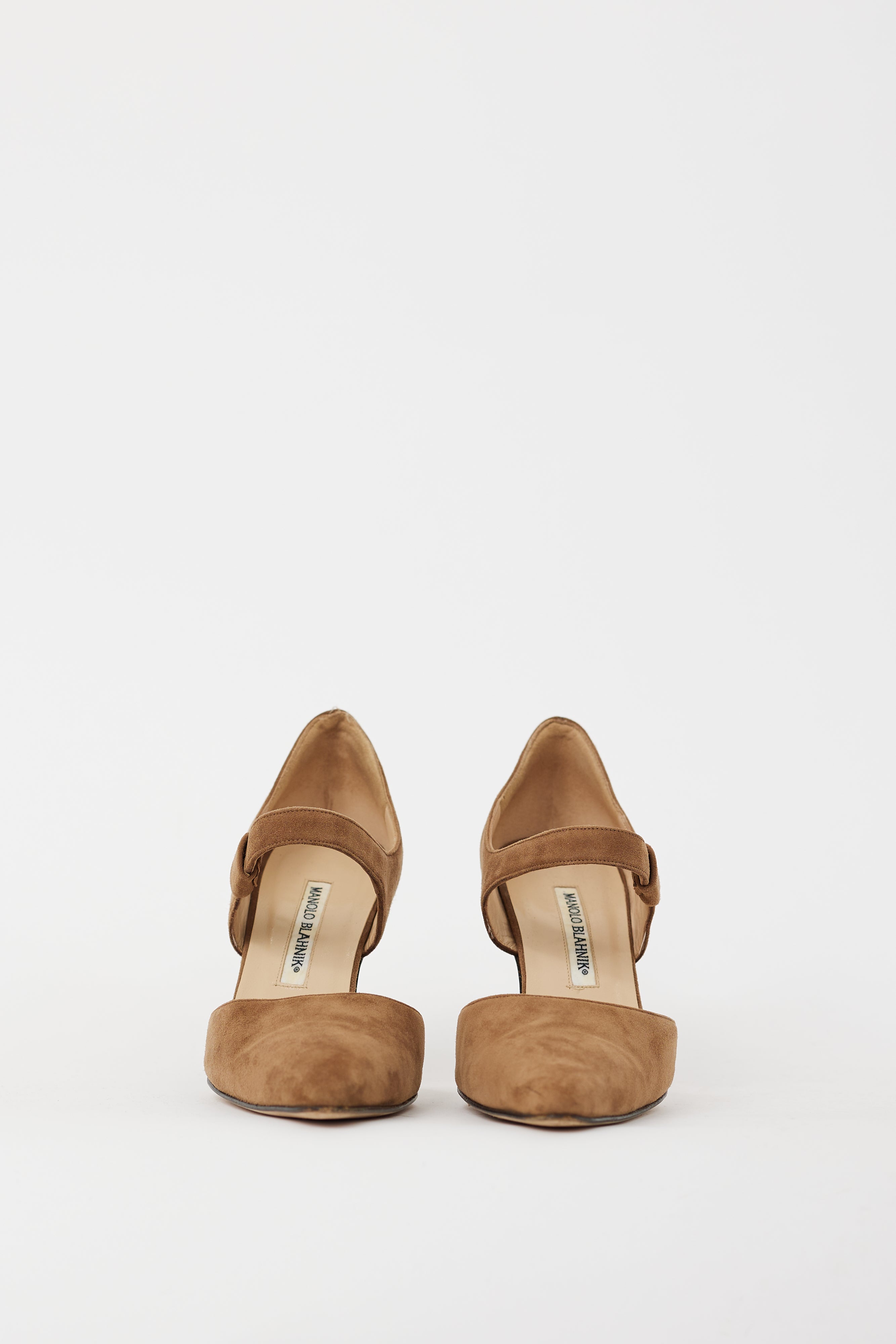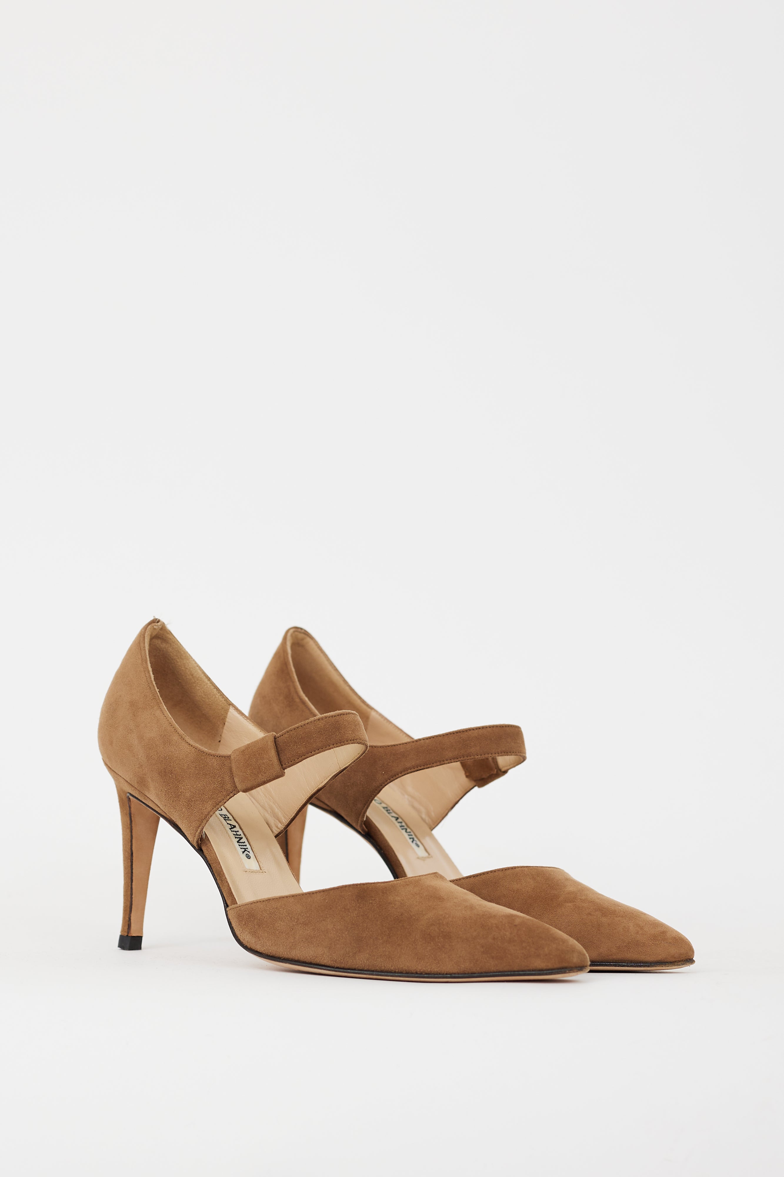 Pre-owned Manolo Blahnik brown suede D'orsay pumps featuring pointed toe, strap at instep, slip on entry, and stiletto heel. Comes with original dust bag.