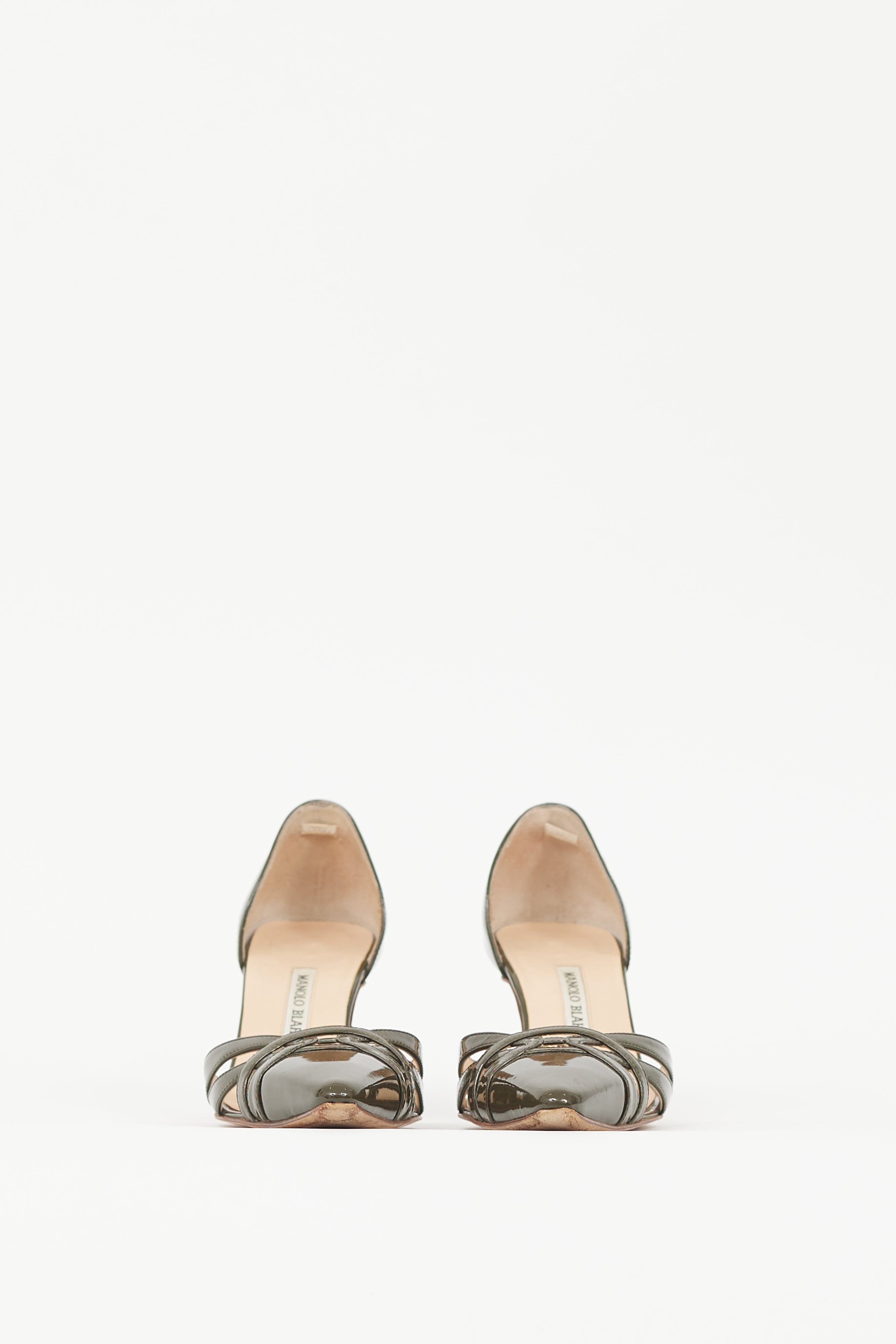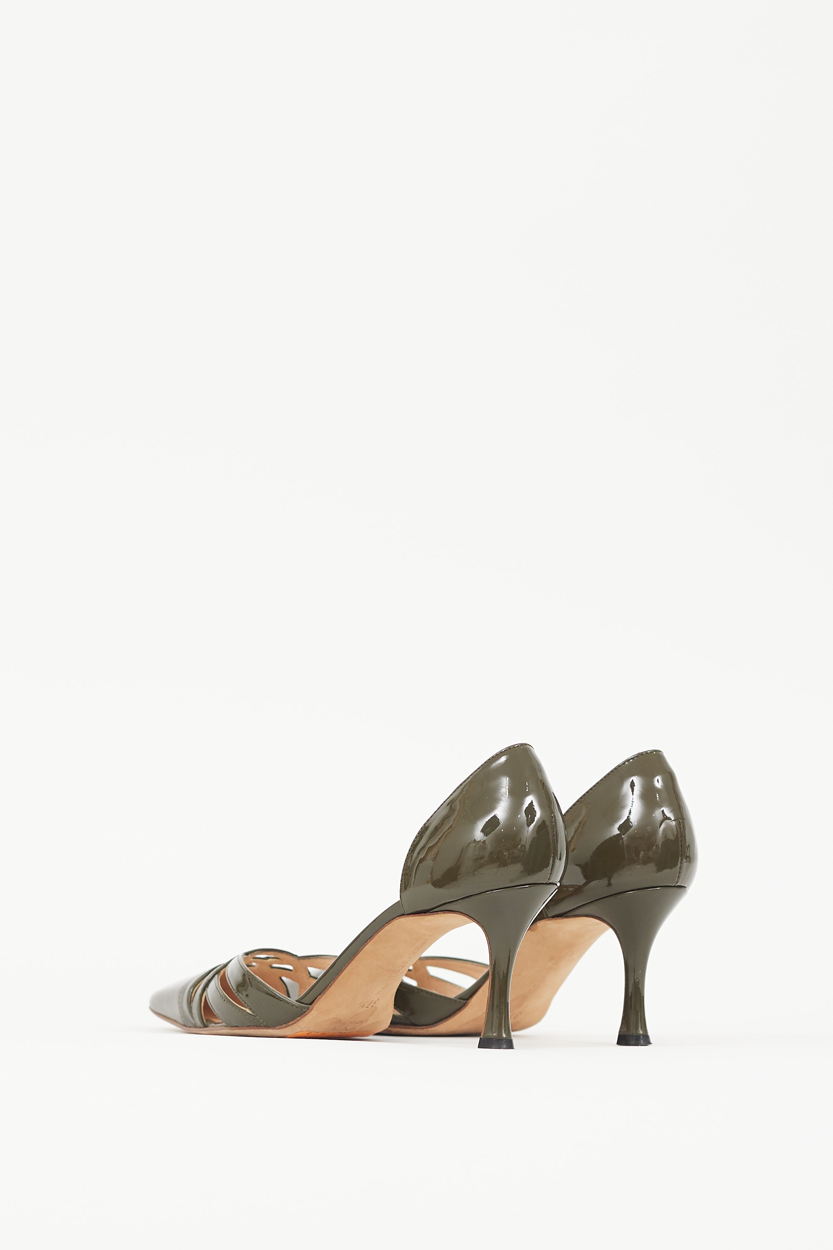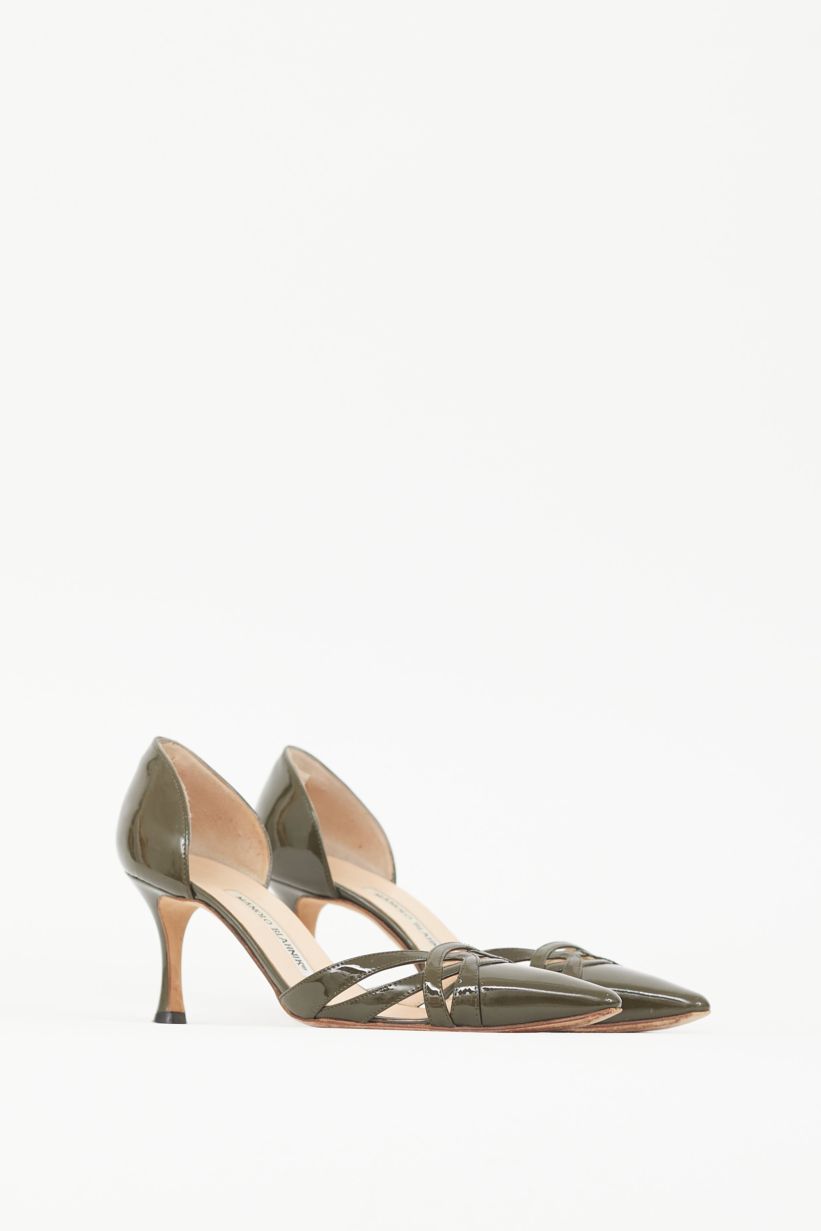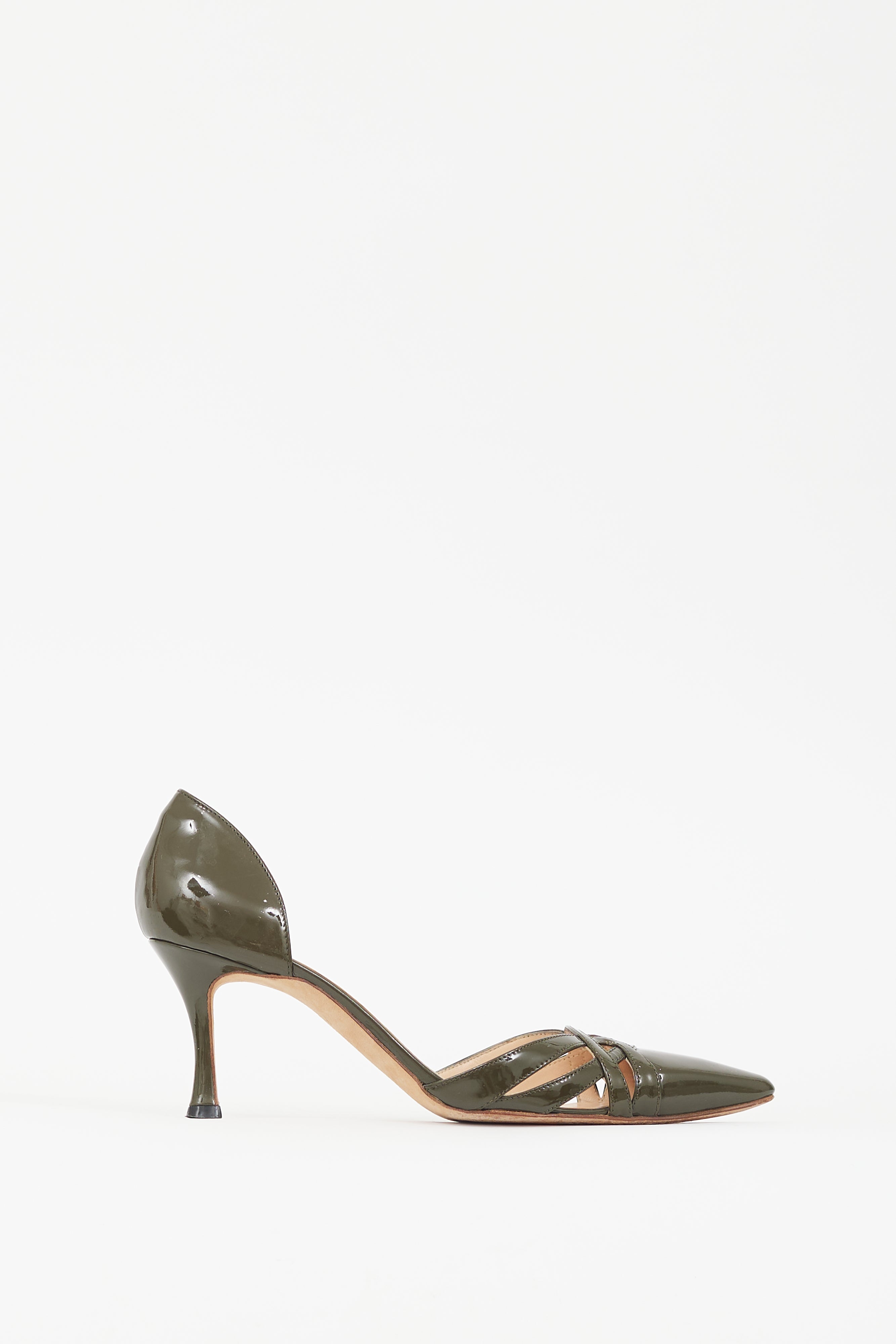 Pre-owned Manolo Blahnik green Butterfly D'orsay patent leather pumps featuring a pointed toe, cut out detailing at vamp, and wrapped kitten heel.