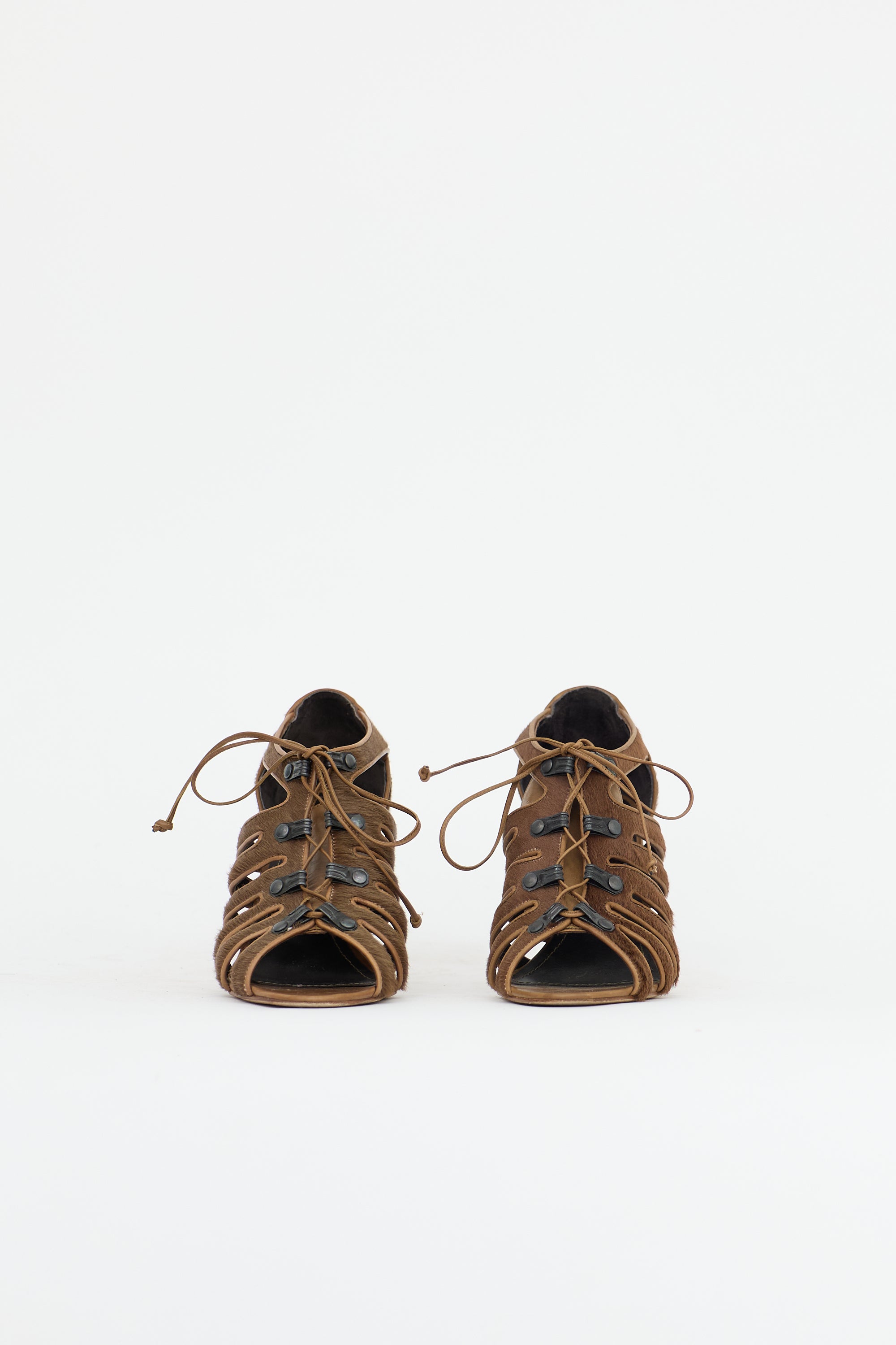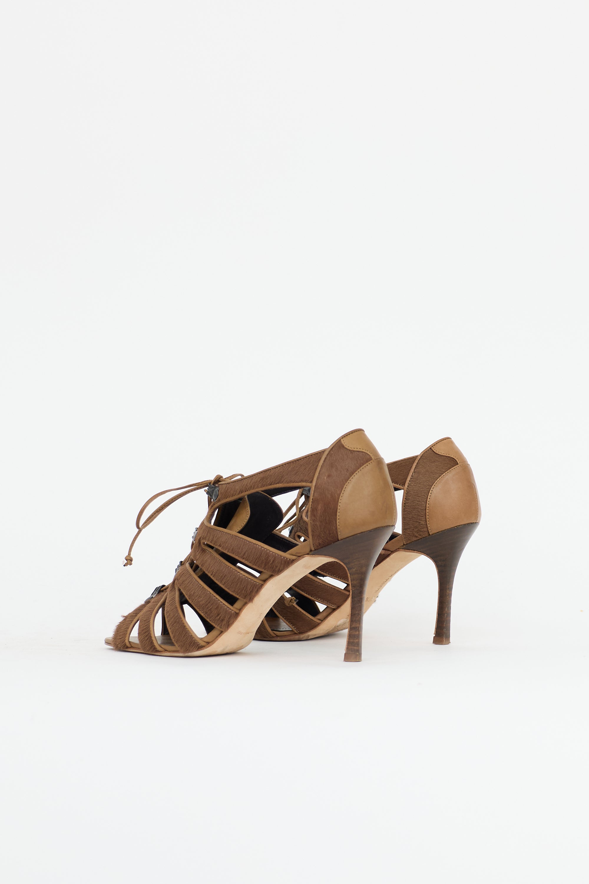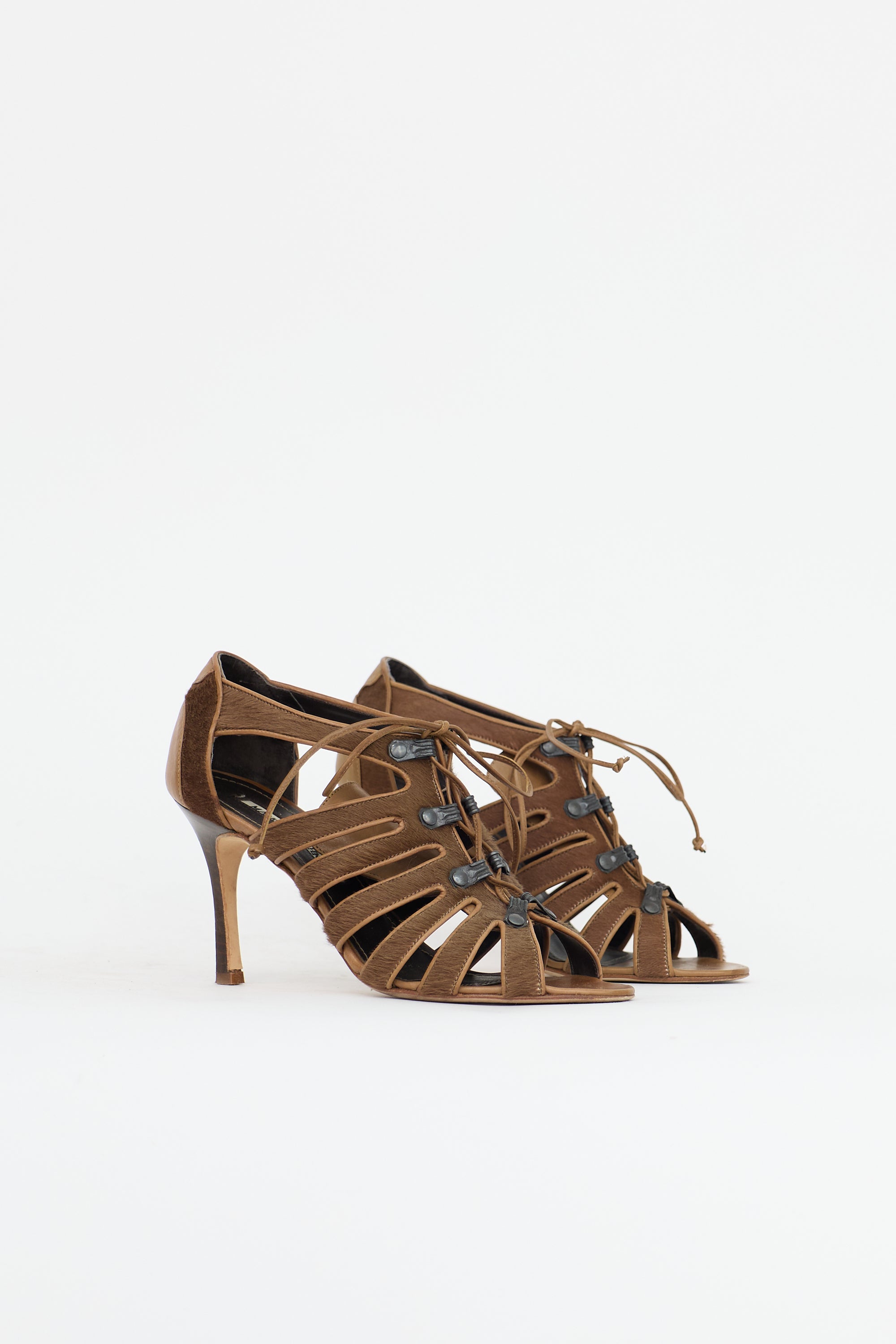 Pre-owned Manolo Blahnik brown leather sandals featuring an open rounded toe, tonal Pony hair cage straps, lace up front, and stacked continental heel.