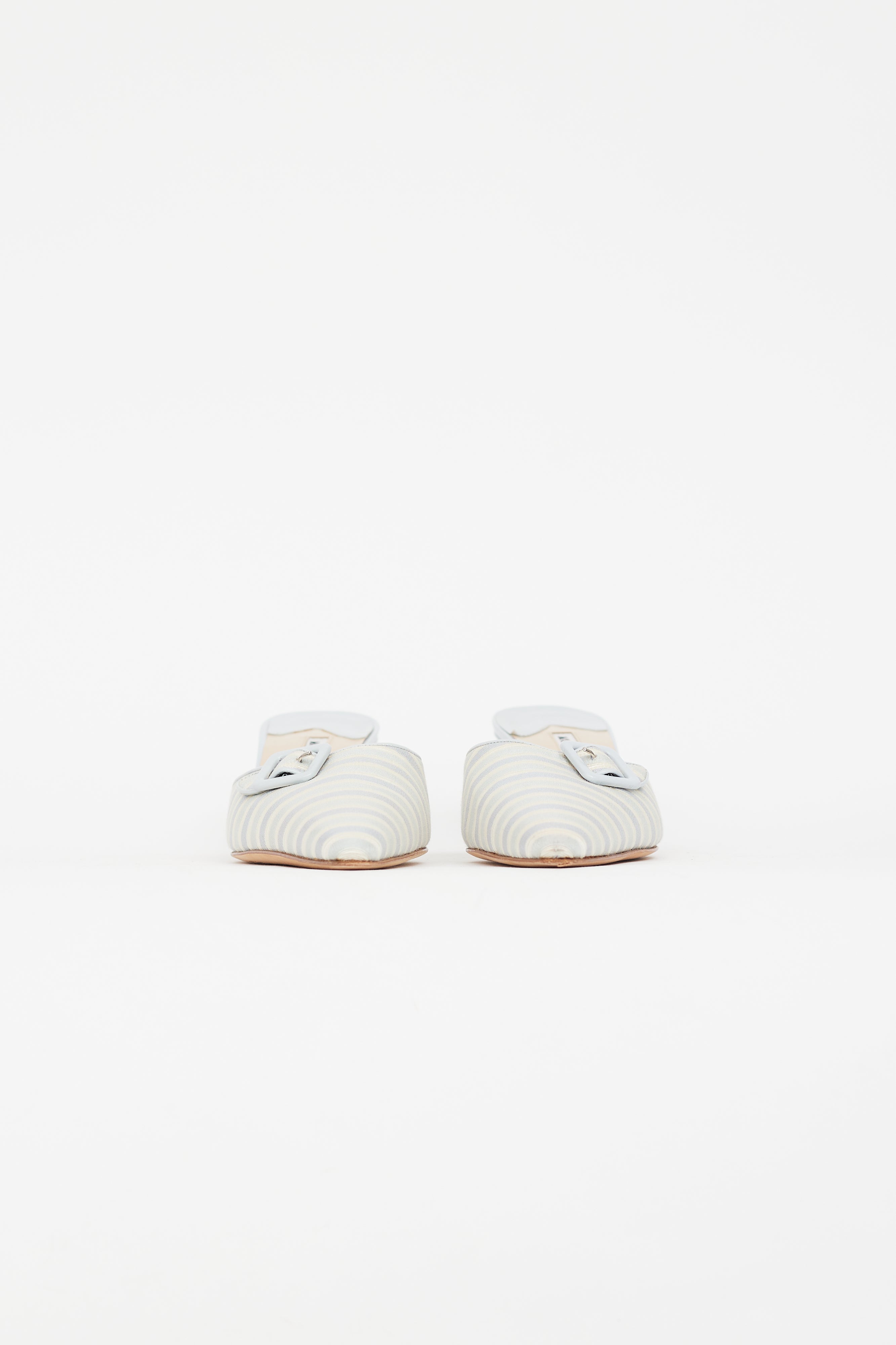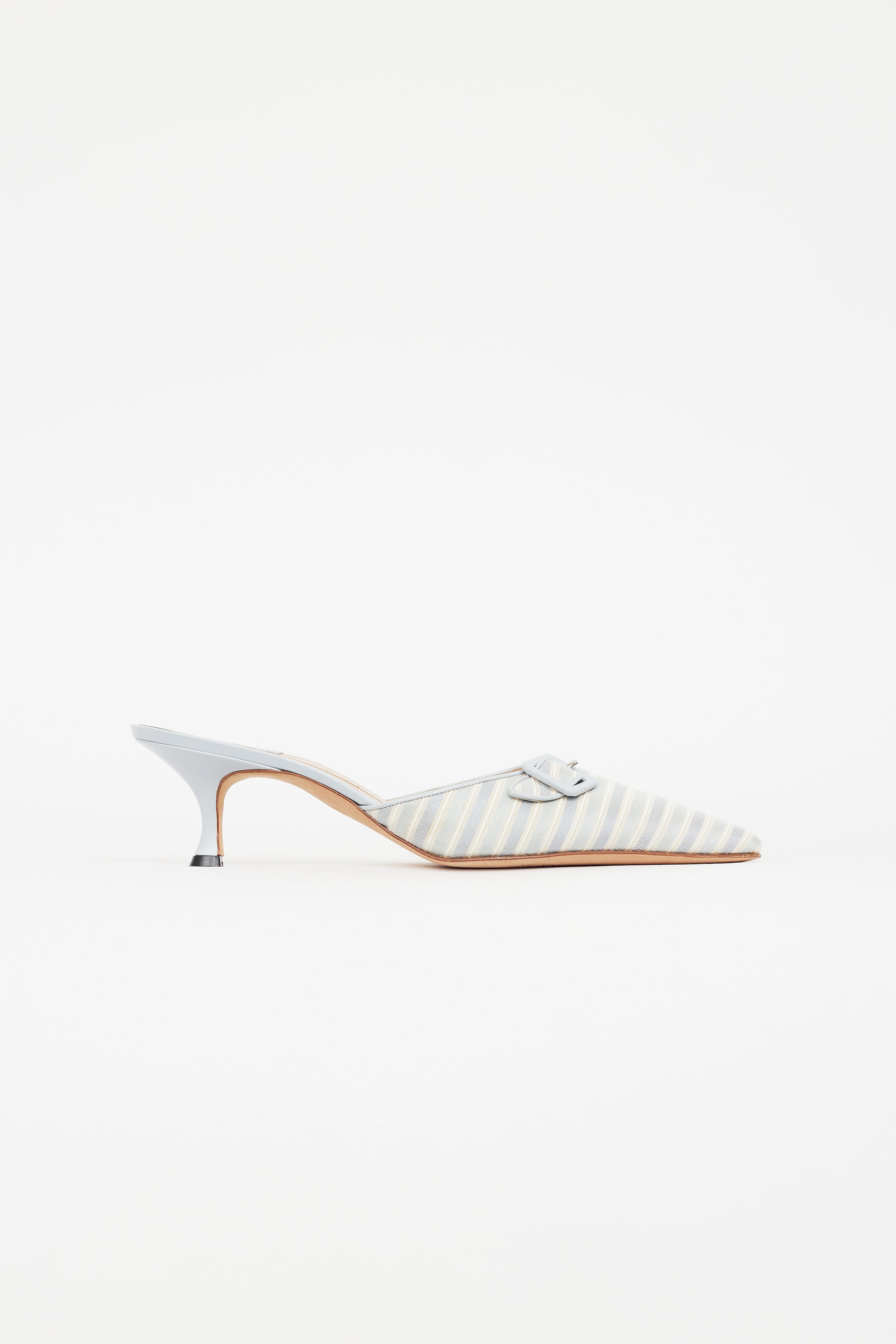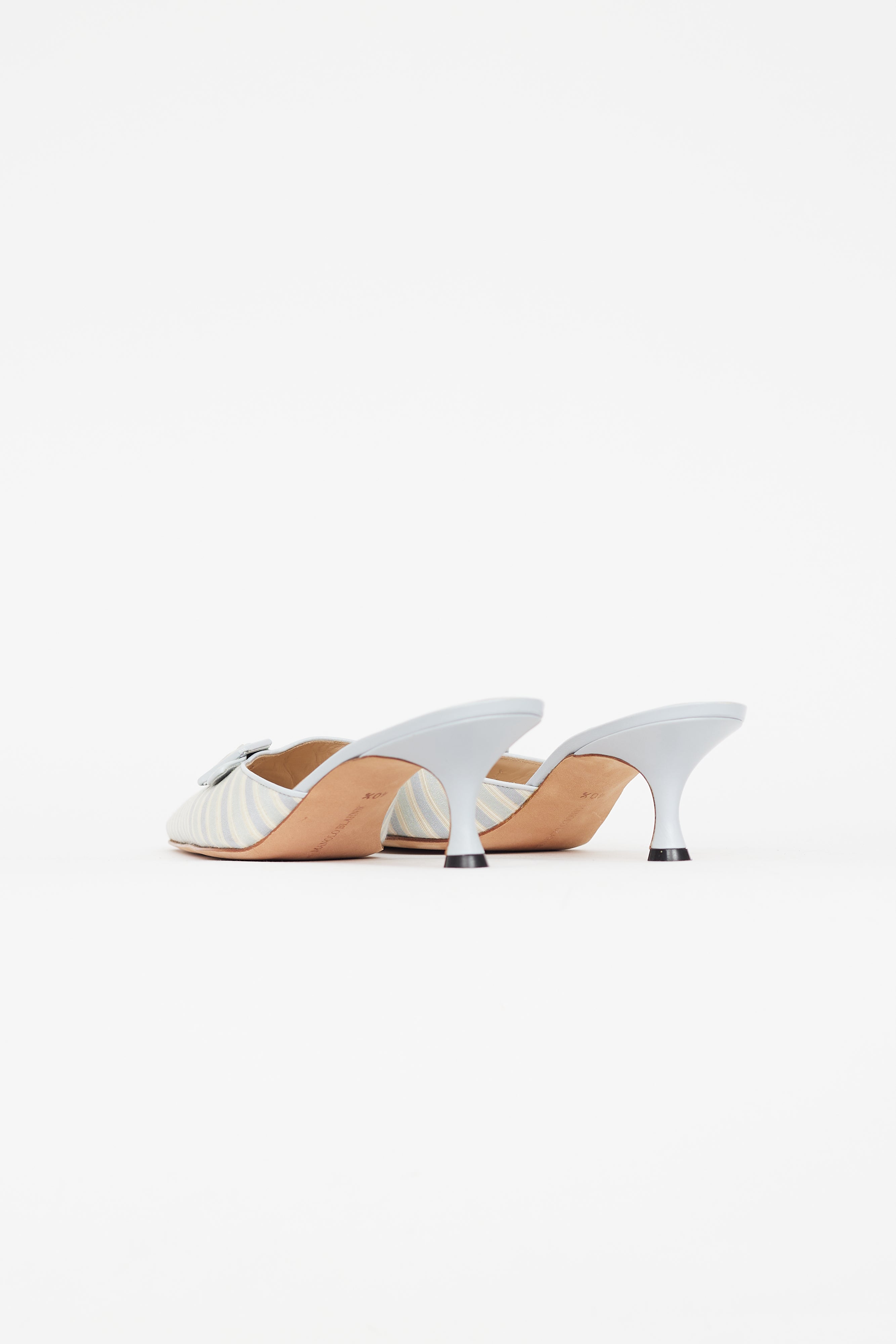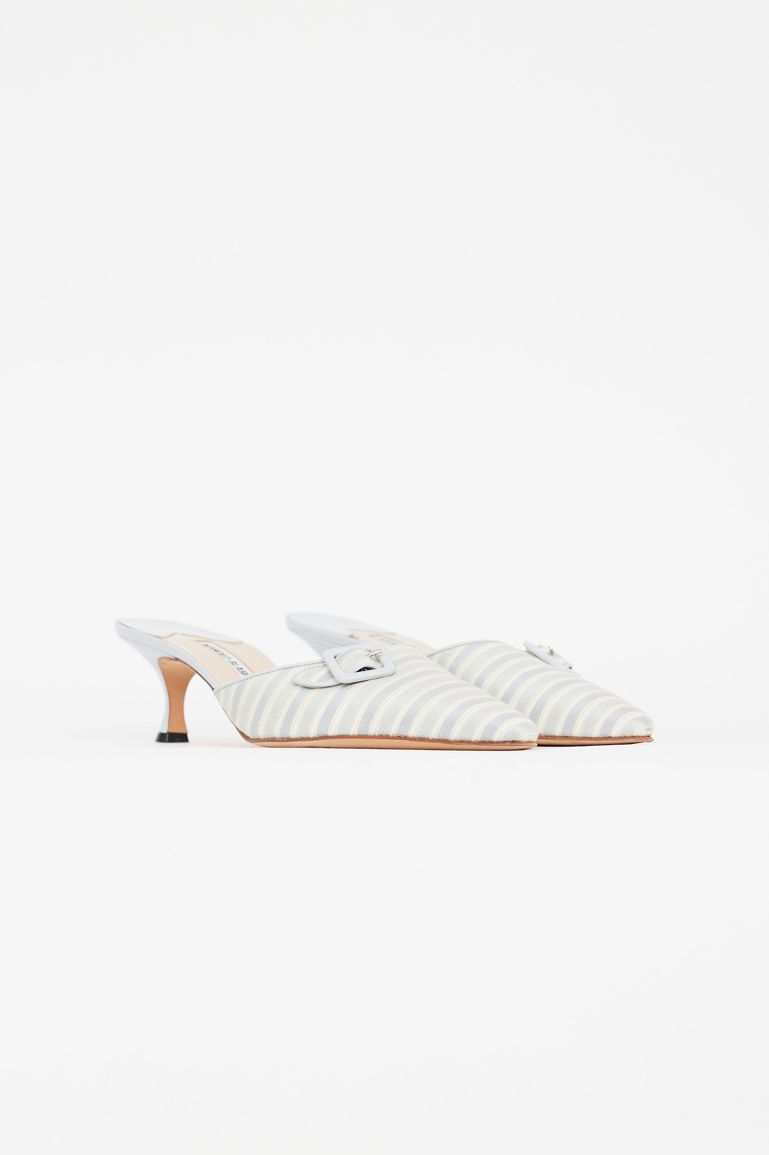 Pre-owned Manolo Blahnik light blue and yellow striped mules featuring pointed toe, buckle detail at vamp, stripes across toe box, covered blue leather heel, and leather insole. Comes with original dust bag.