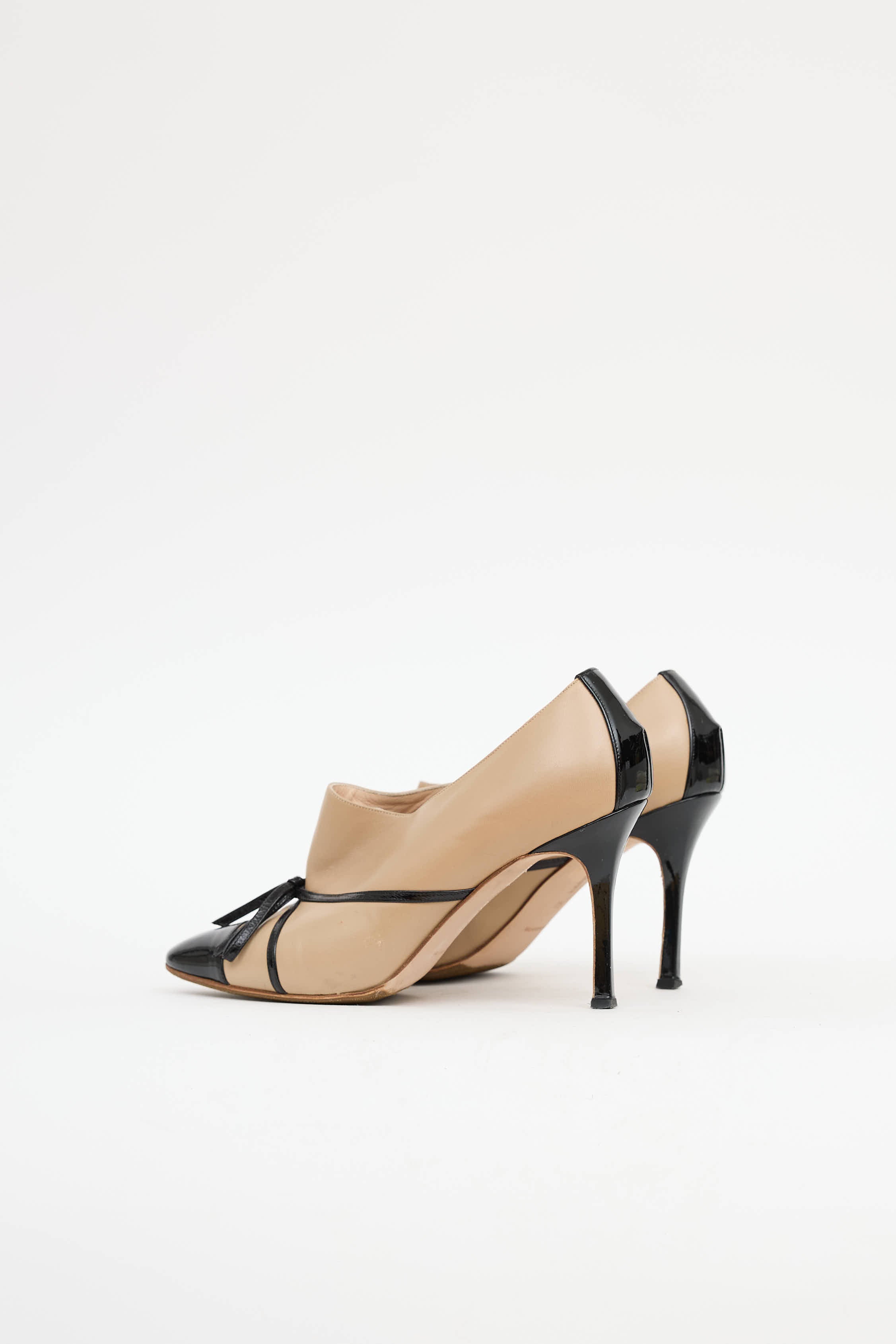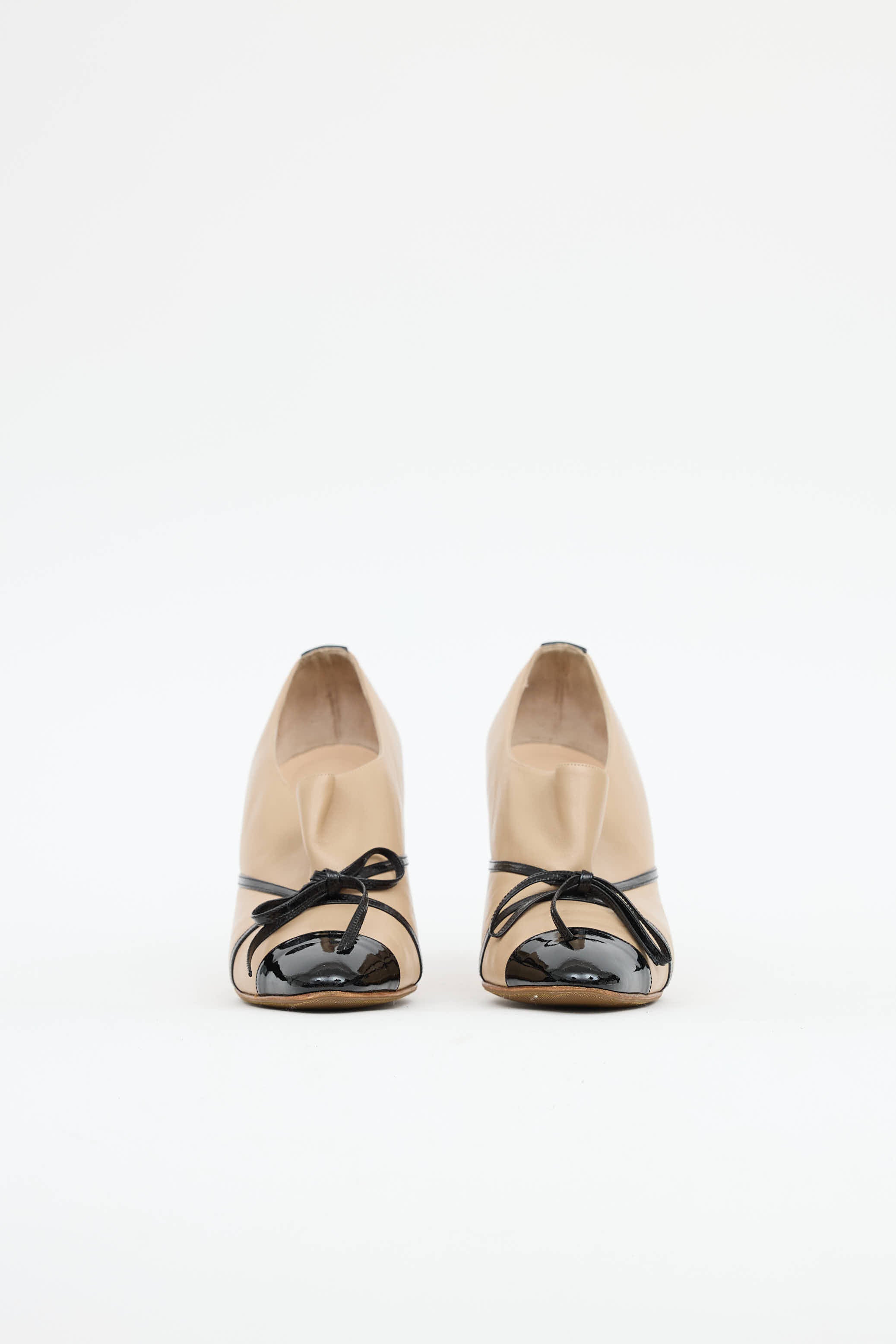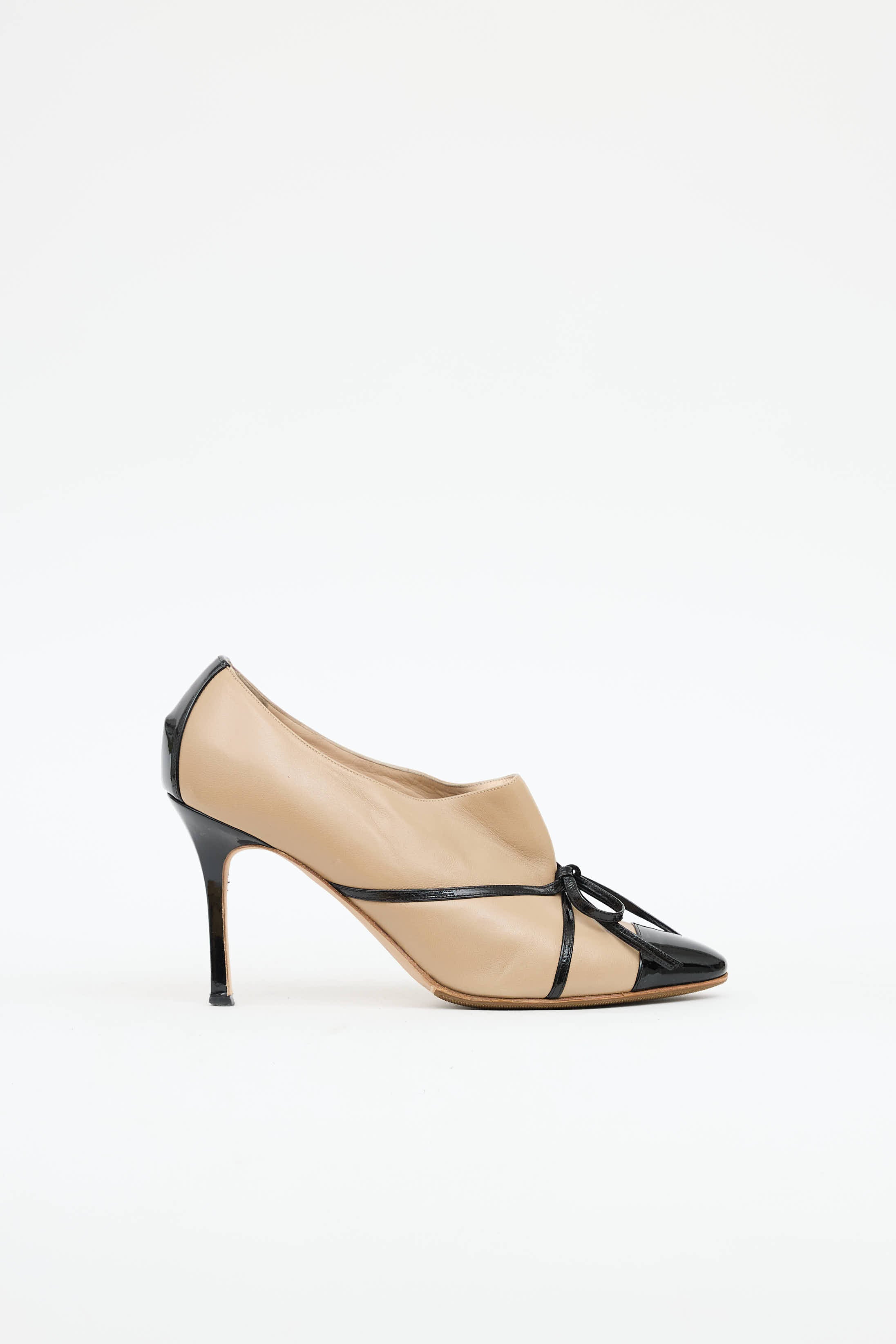 Pre-owned Manolo Blahnik beige and black booties featuring almond toe, patent trimming, bow at vamp, and covered heel.