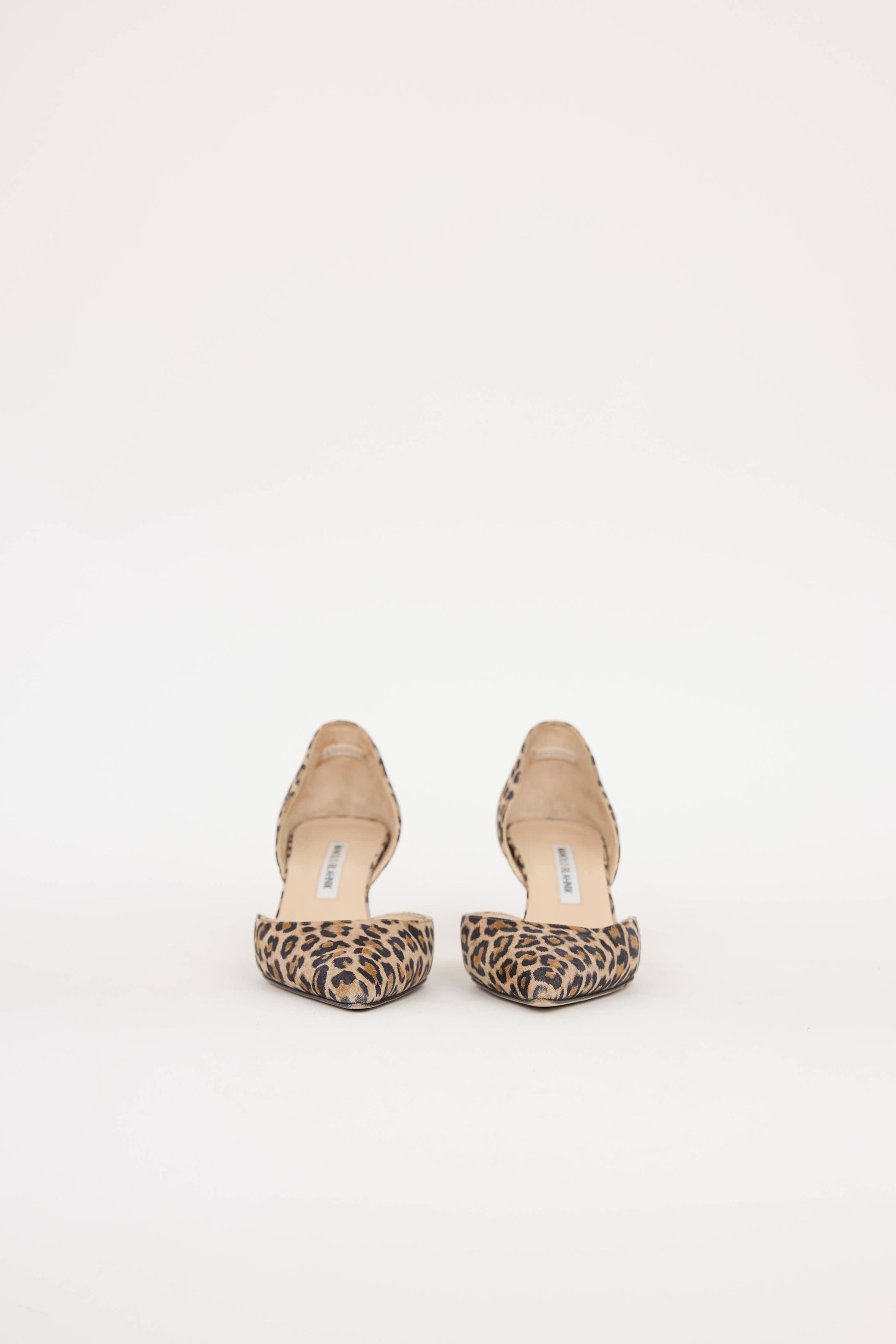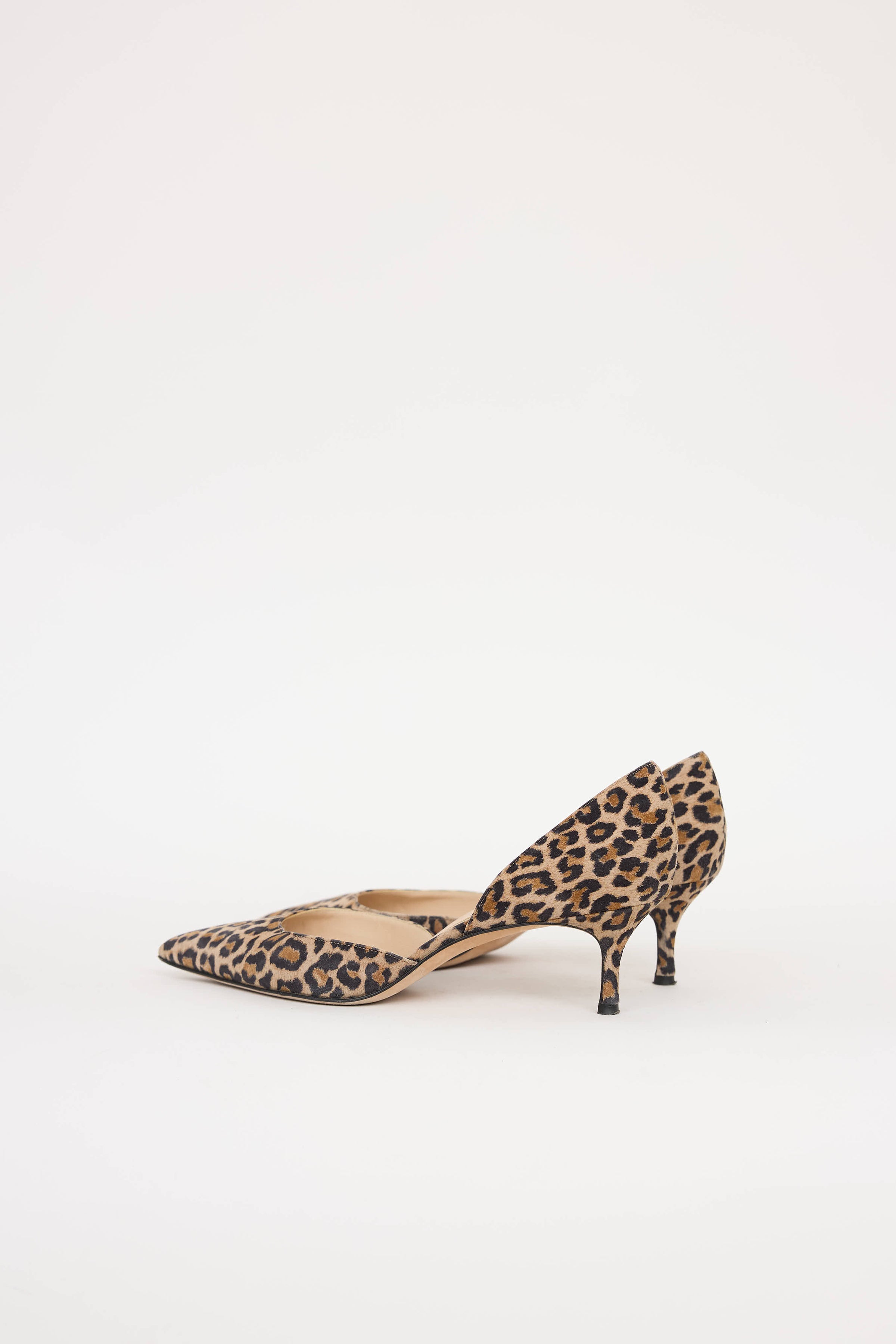 Pre-owned Manolo Blahnik brown suede leopard print D'orsay pump featuring pointed toe, covered kitten heel, and cut out at side.