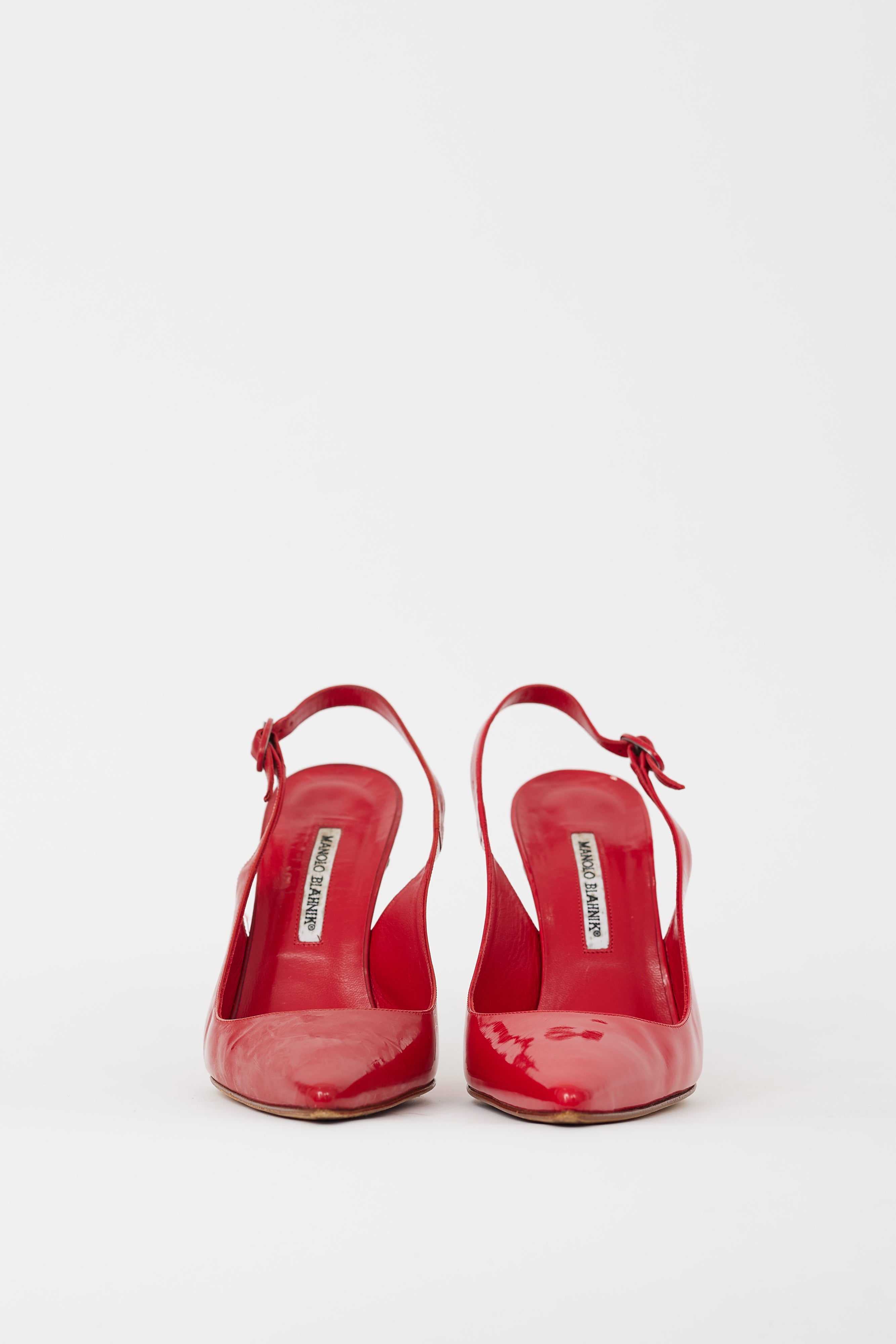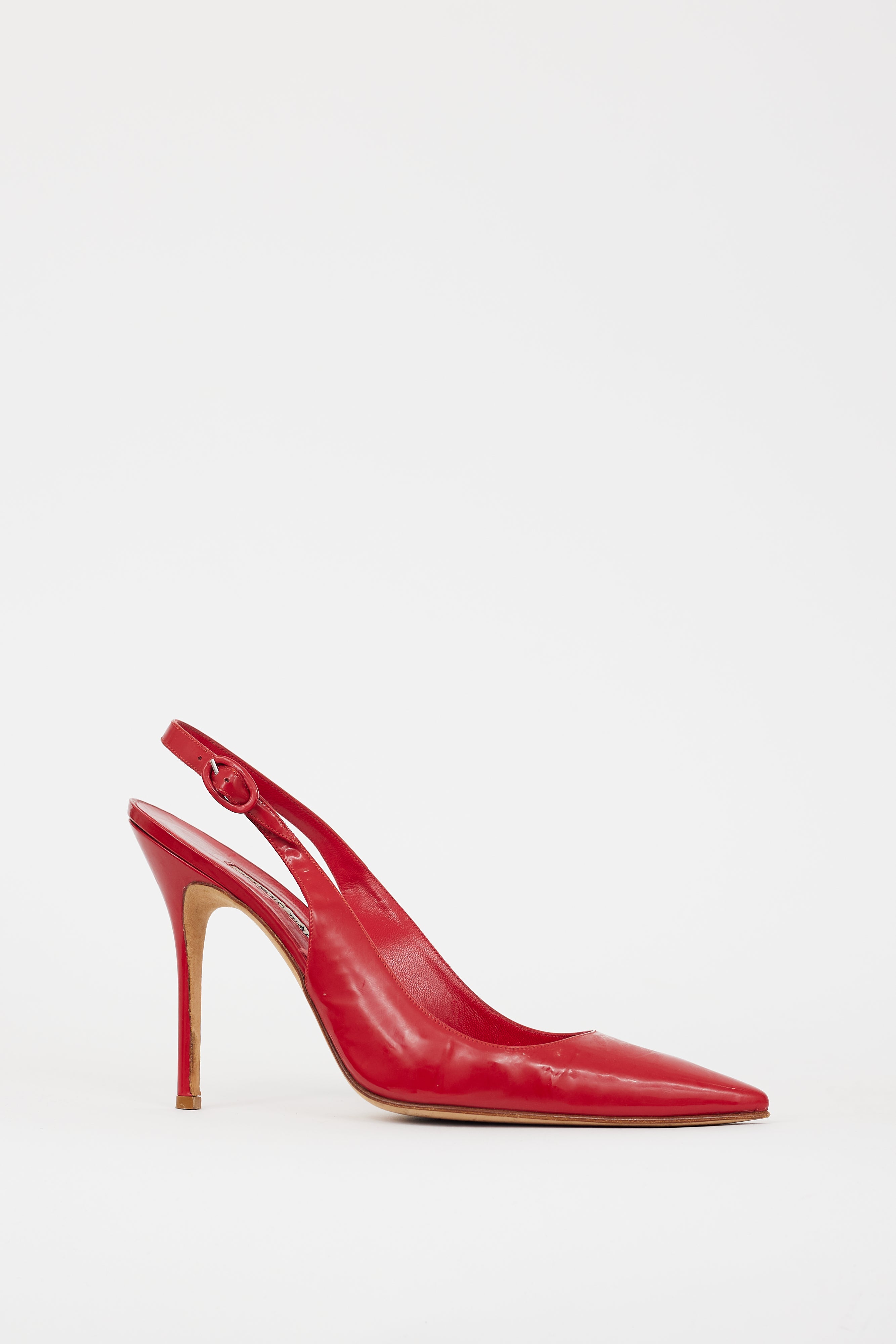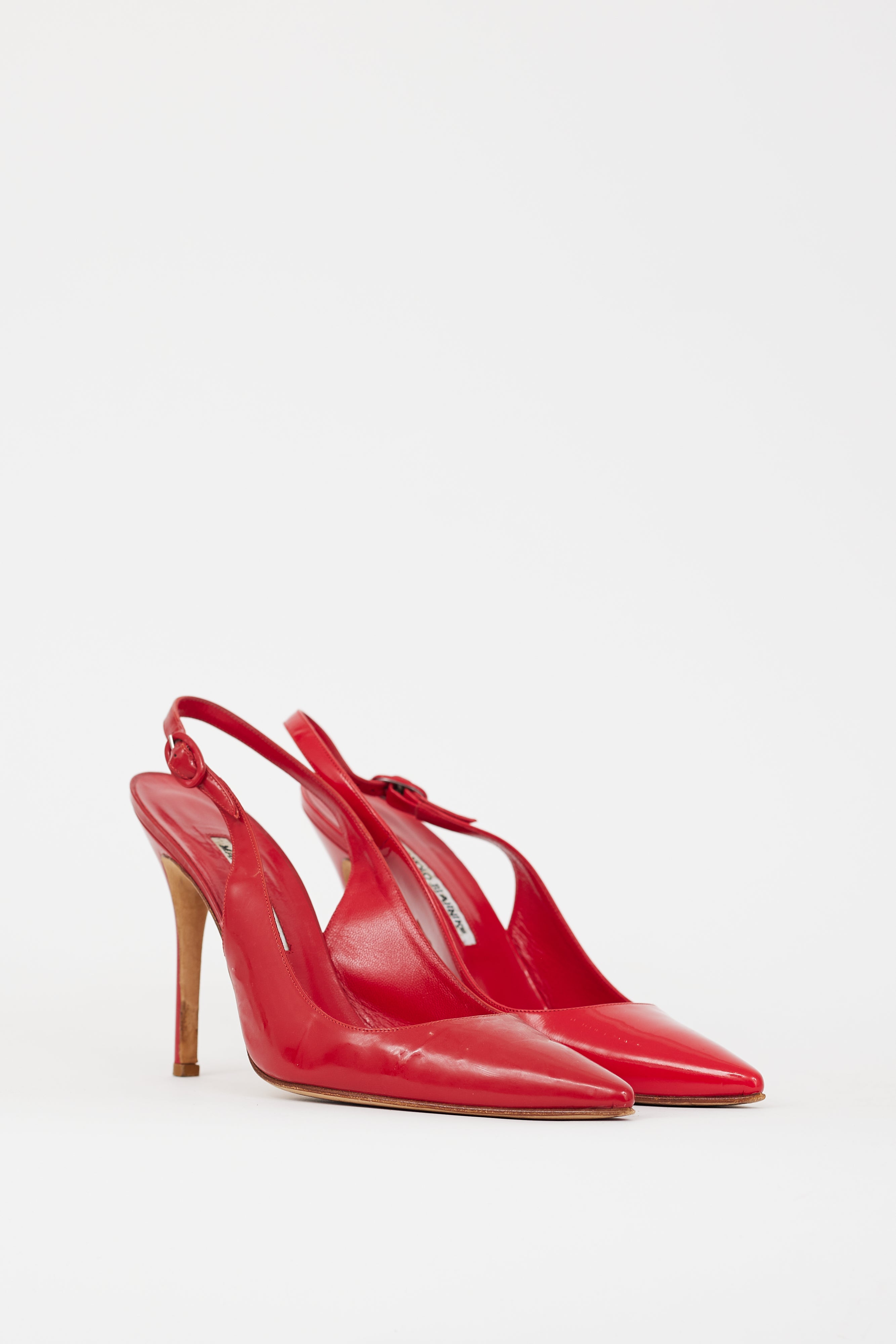 Pre-owned Manolo Blahnik red patent leather pumps featuring pointed toe, ankle strap with buckle fastening, and stiletto heel. Comes with original dust bag.