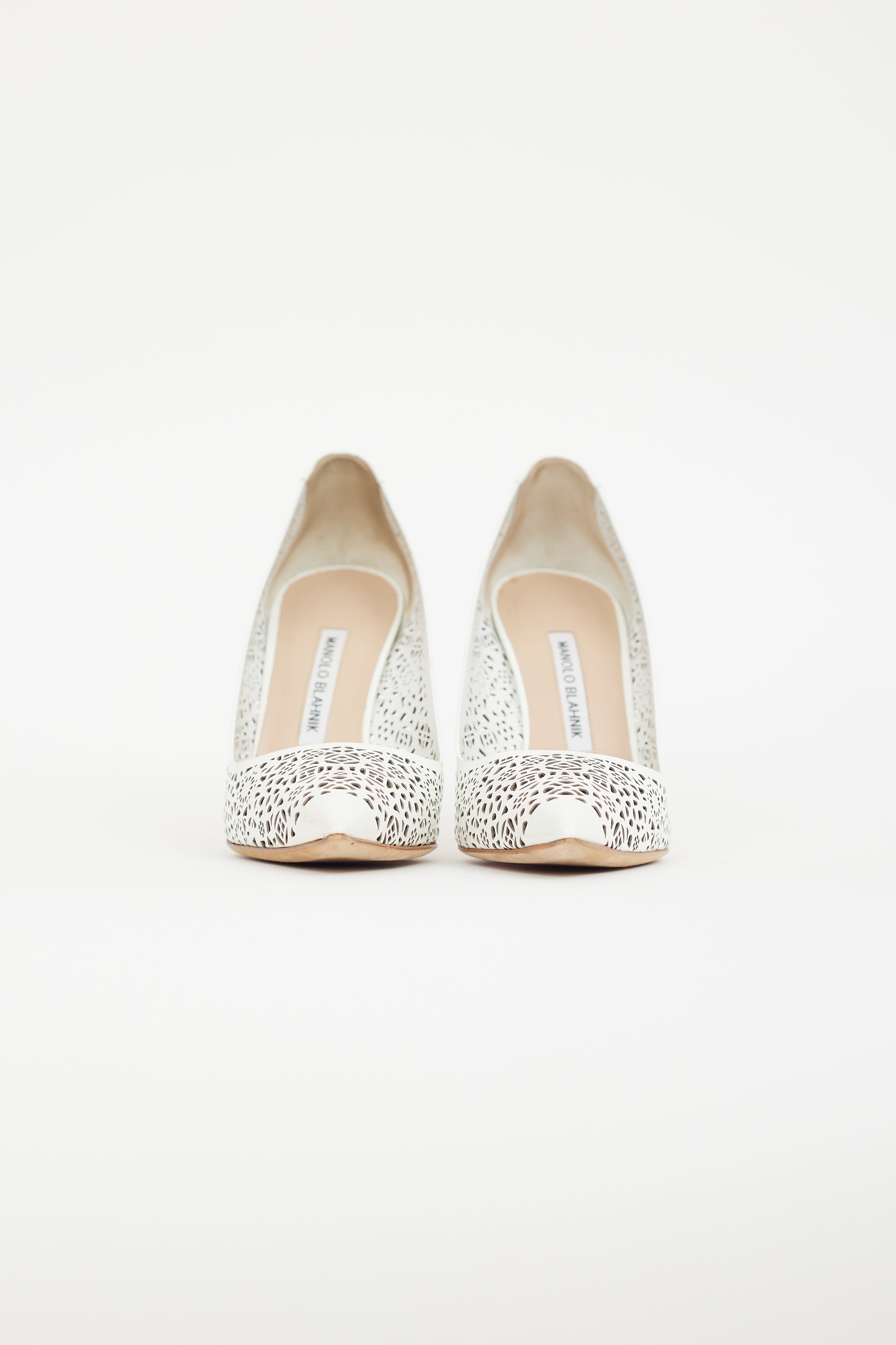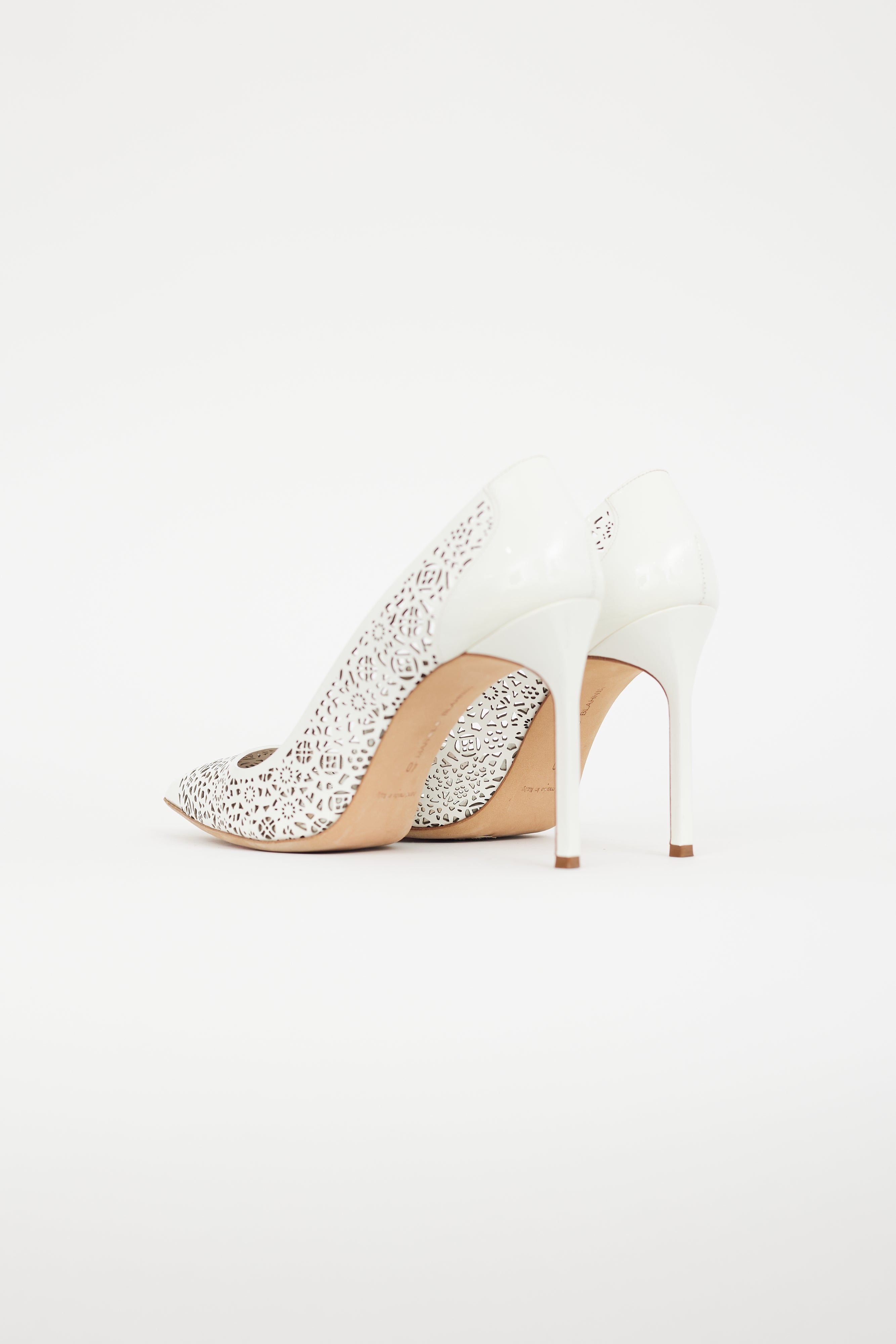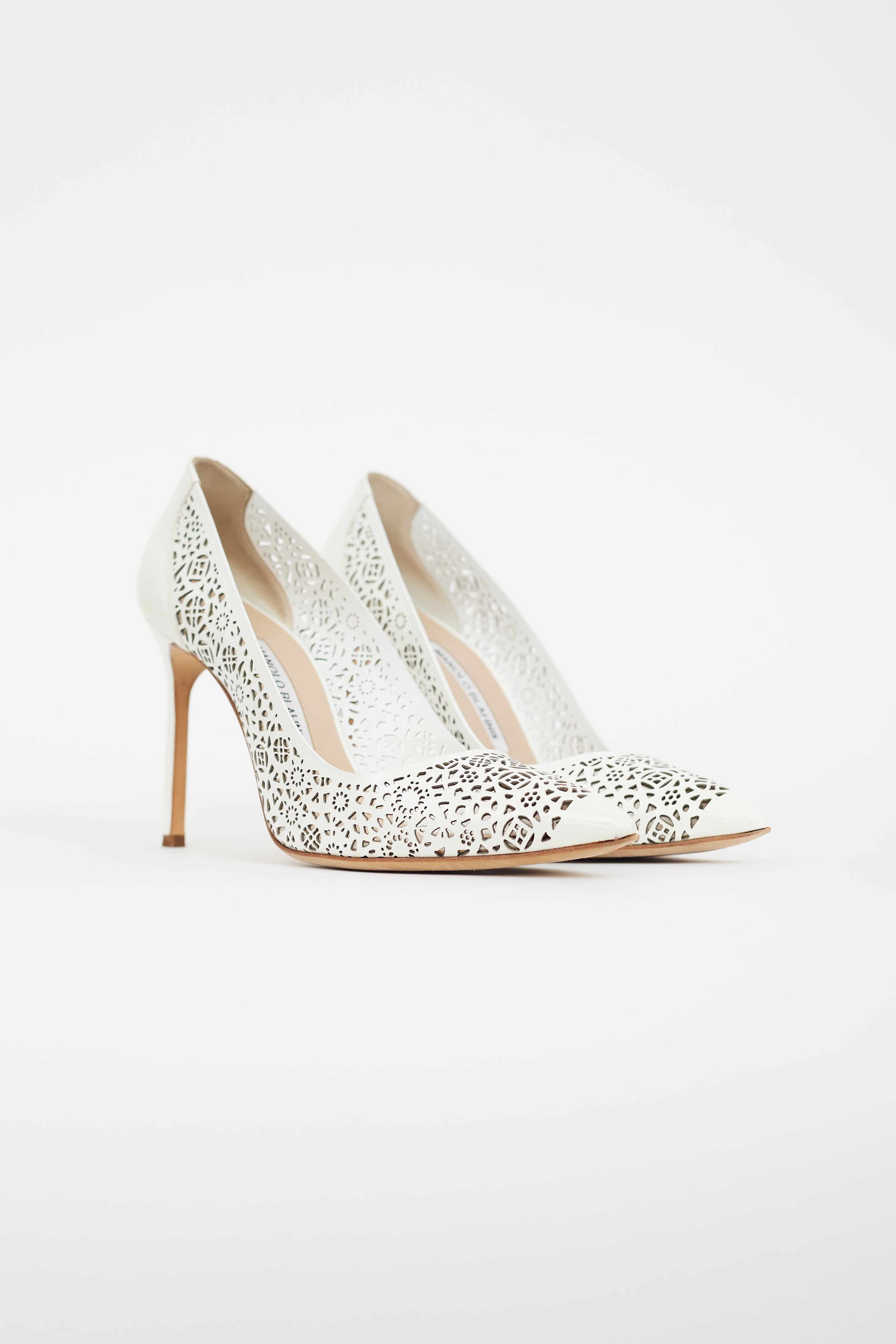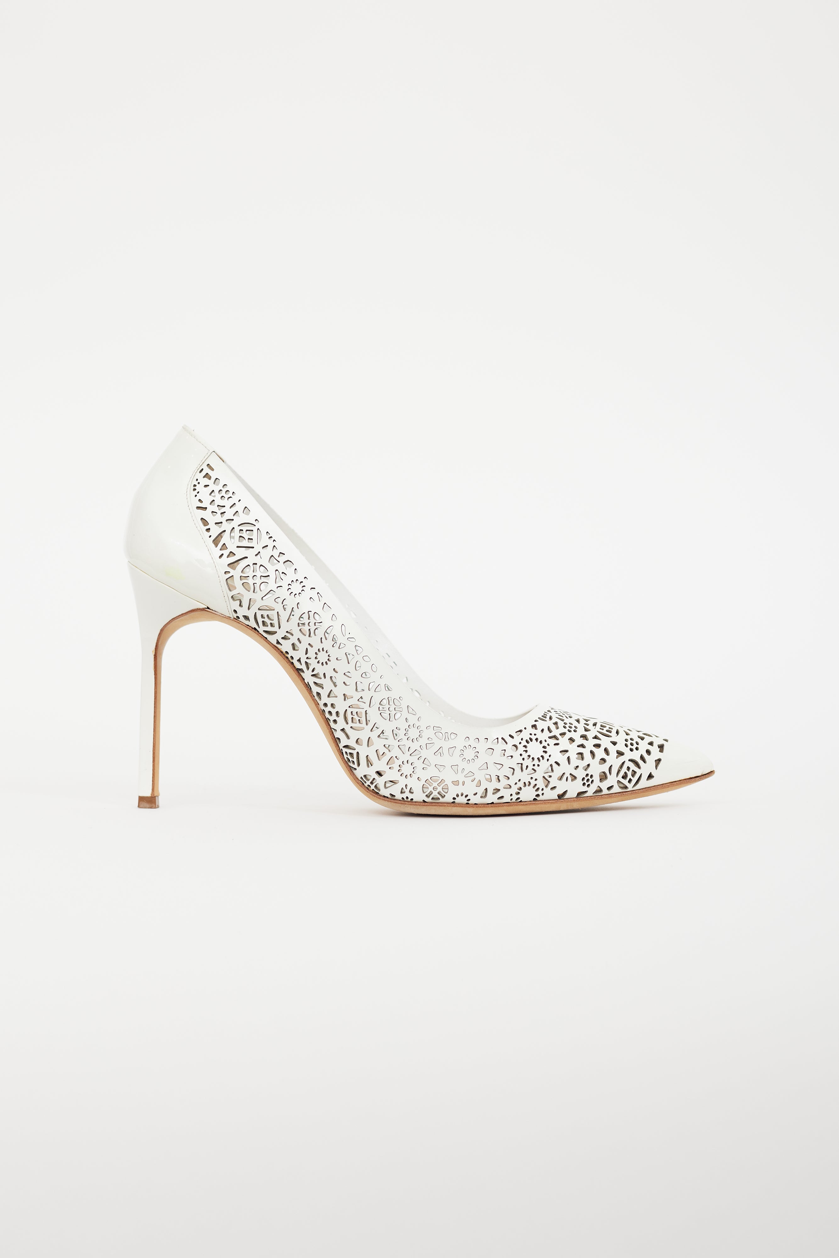 Pre-owned Manolo Blahnik white BBMI 105 patent leather heels featuring laser cut detailing, pointed toe, and wrapped stiletto heel.