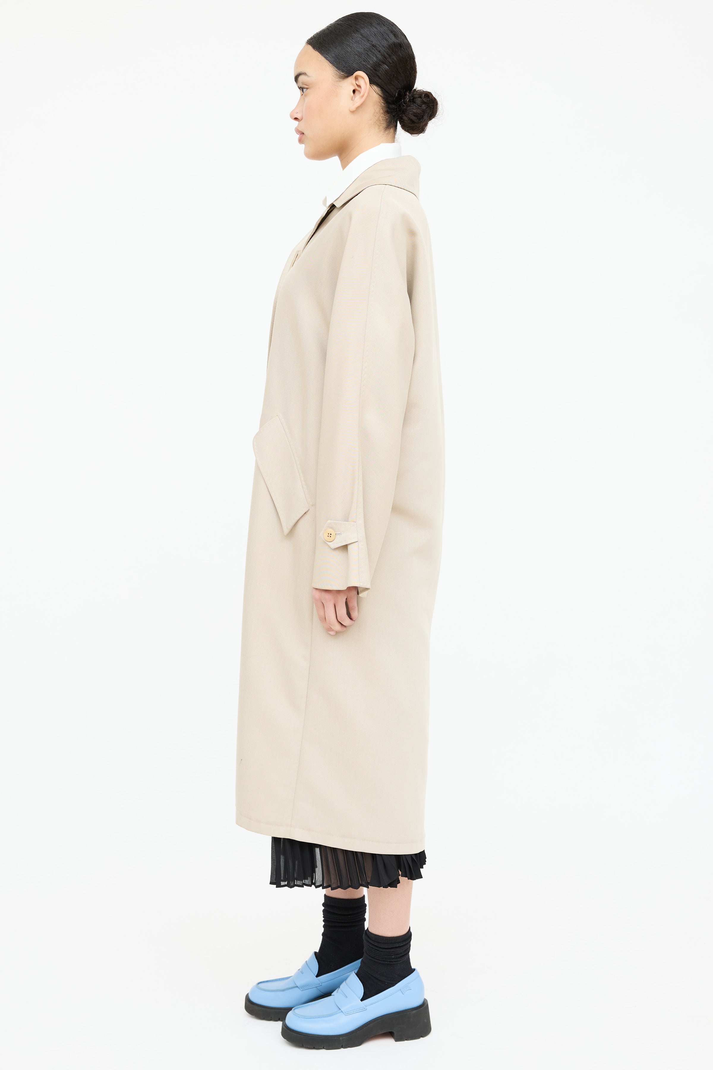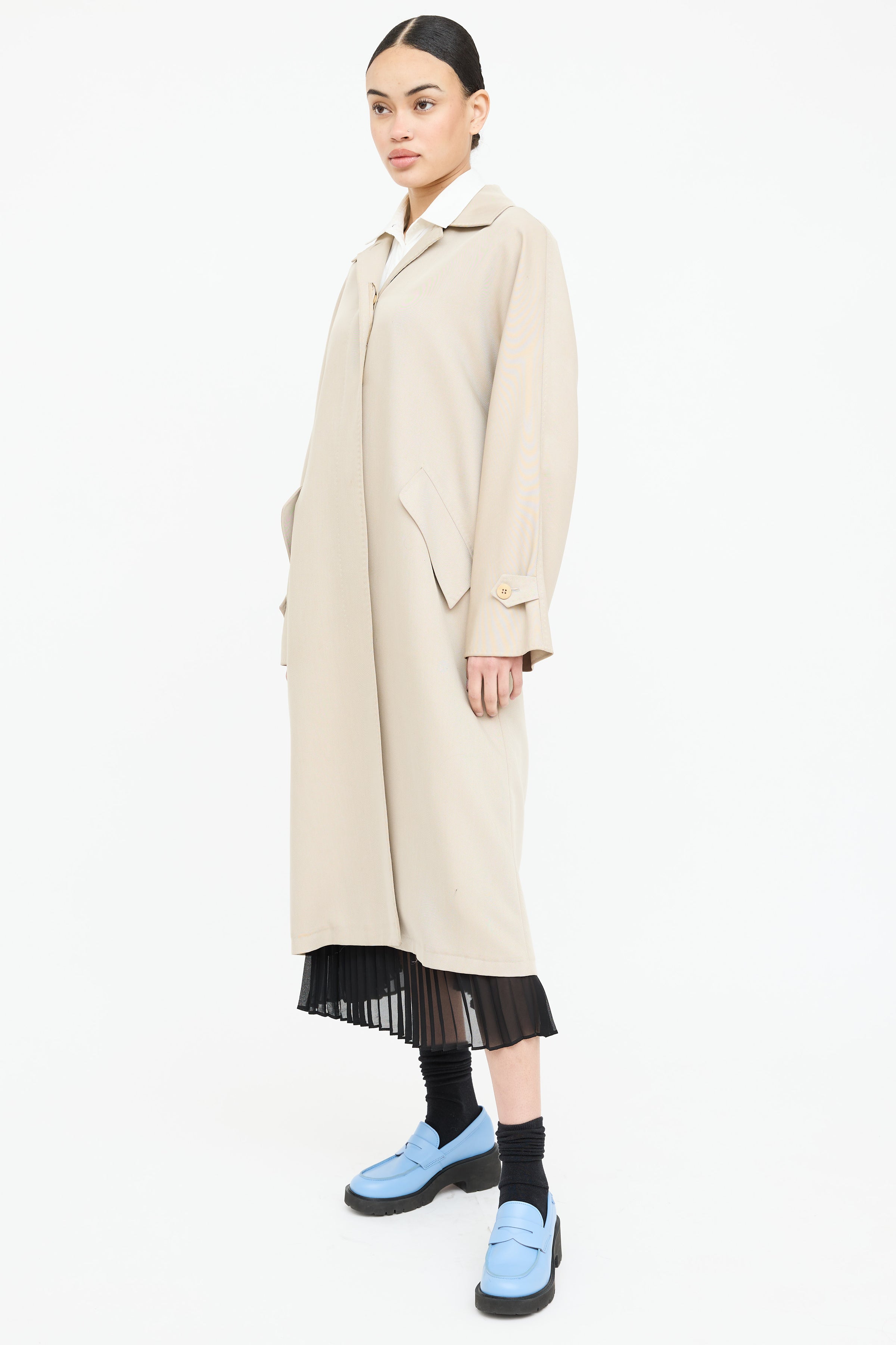 Pre-owned Max Mara beige Balmacaan coat featuring a pointed collar, long sleeves with buttoned cuffs, two flap pockets at hip, and button up closure. Lined.