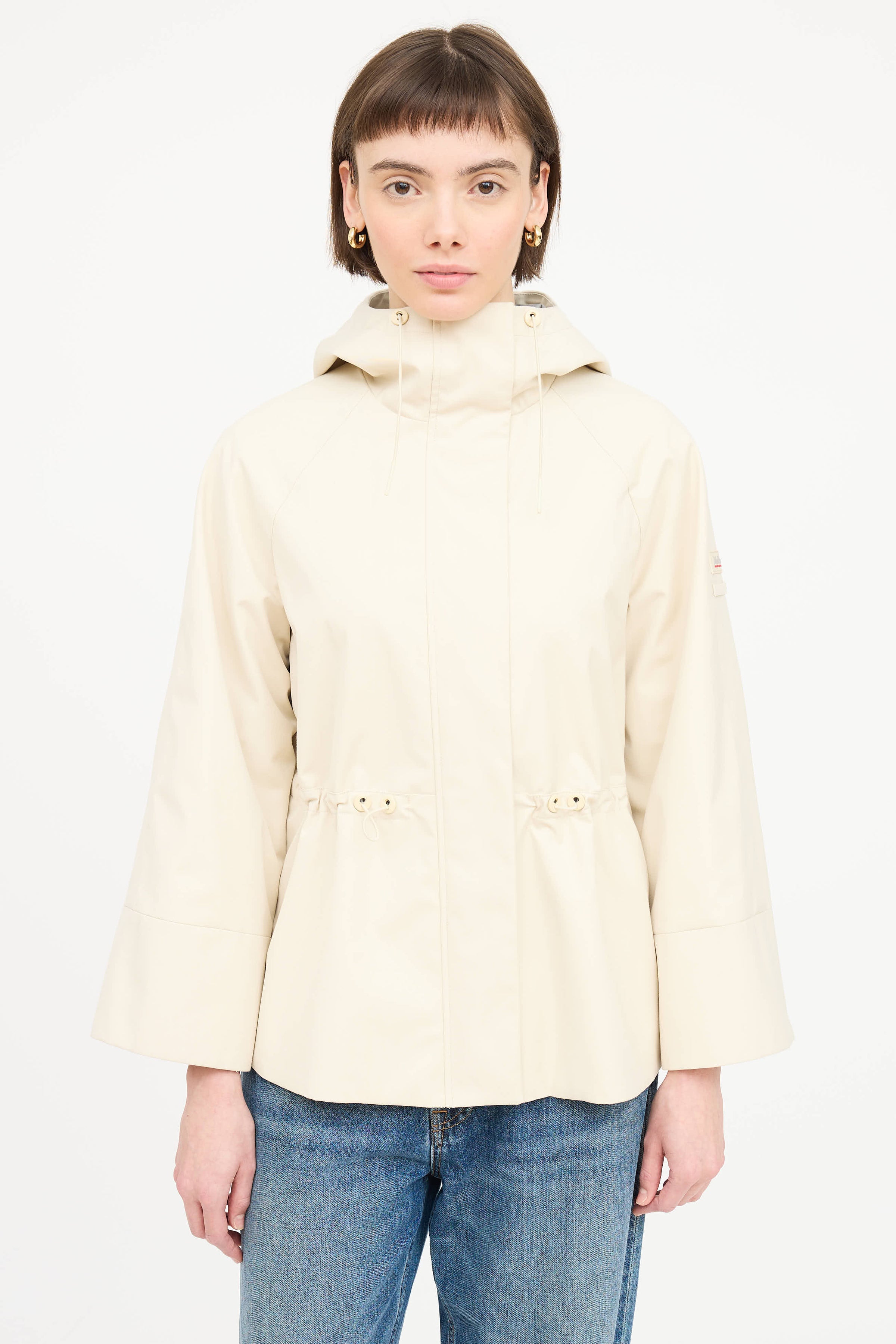 Pre-owned Max Mara cream long sleeve jacket featuring attached hood with drawstring toggle, double zip front with snap closures, rubber logo at left sleeve, drawstring waist, zip pockets at side, and elasticized interior cuffs. Lined.