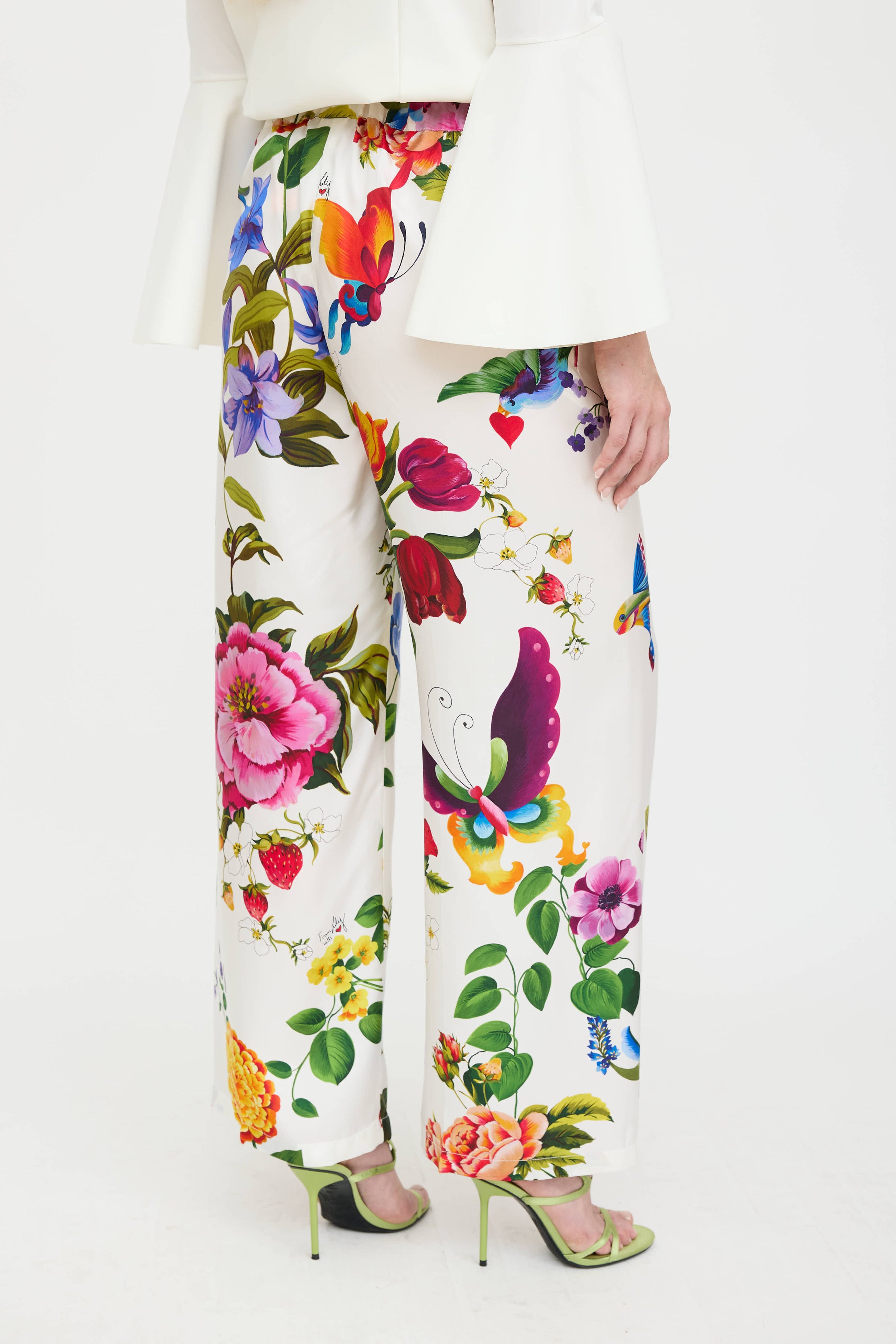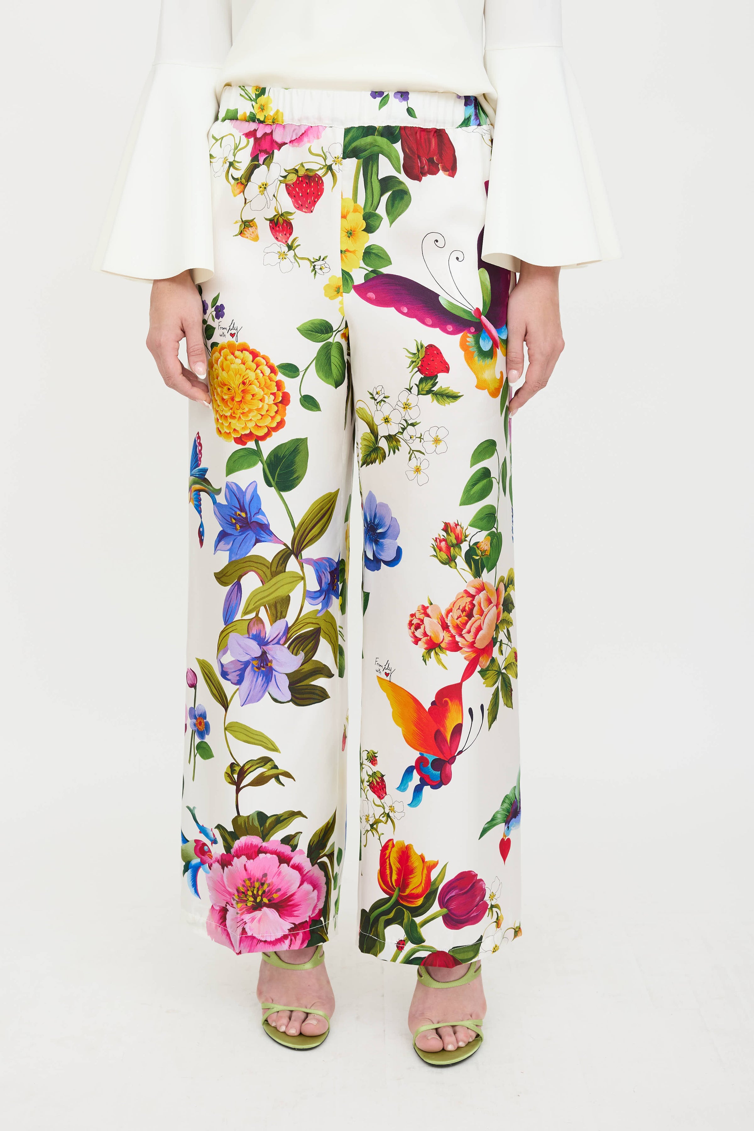 Pre-owned Max Mara white and multicolor pant featuring elastic waistband, slit pockets at side, and wide leg.