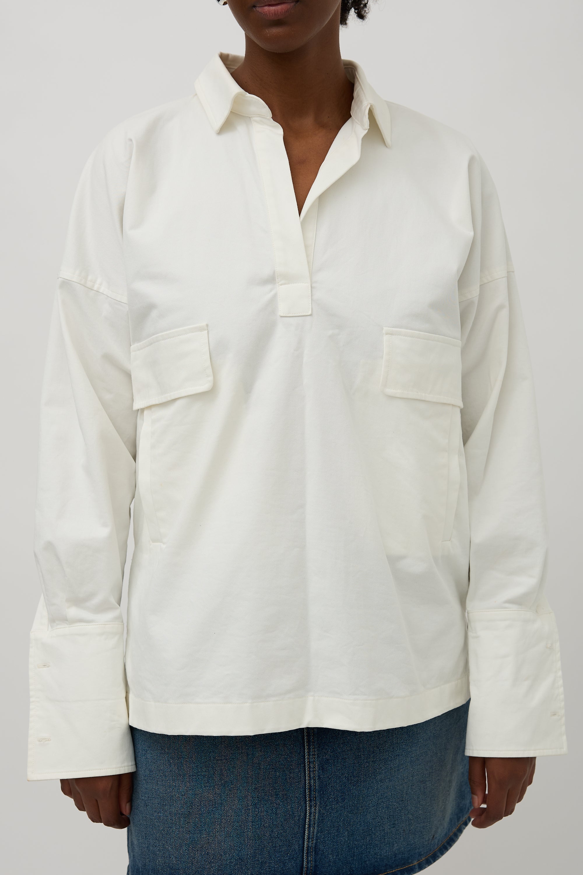Pre-owned Max Mara white tunic featuring spread collar, split neckline, two front flap and welt pockets, and French cuffs.