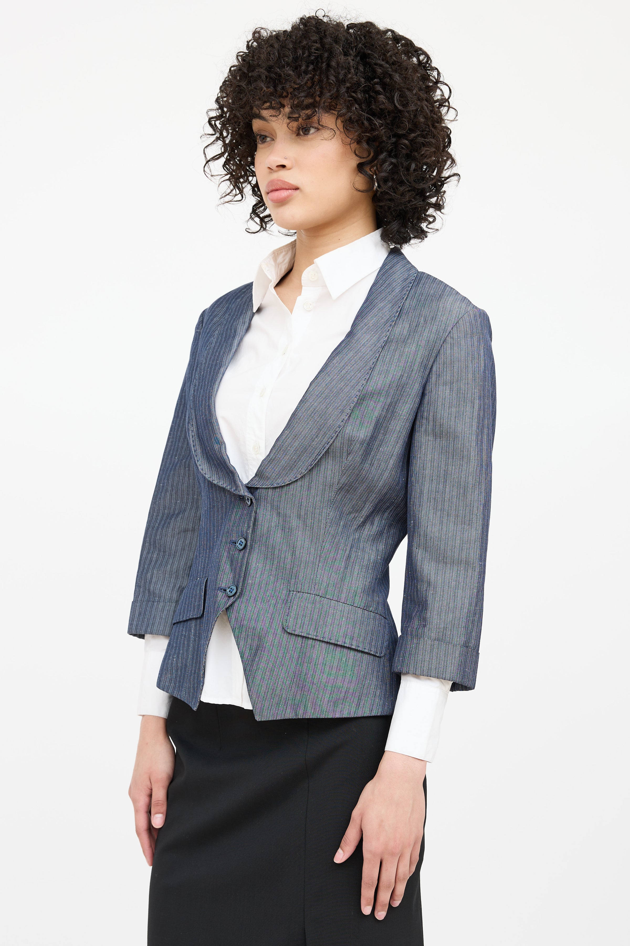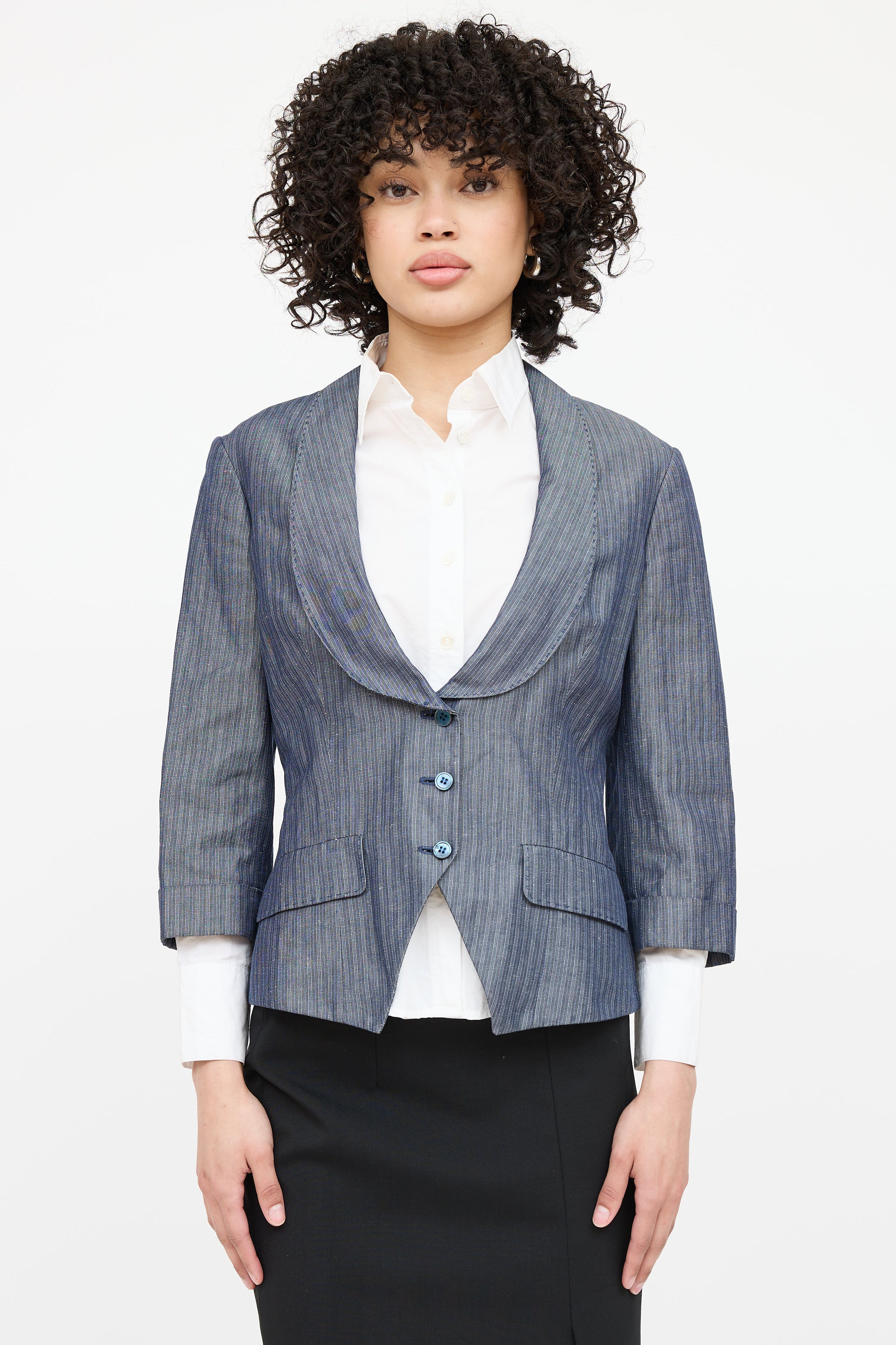 Pre-owned Alexander McQueen grey speckled pinstripe blazer featuring shawl collar, button closure, welt pockets at side and 3/4 cuffed sleeves. Lined sleeves.