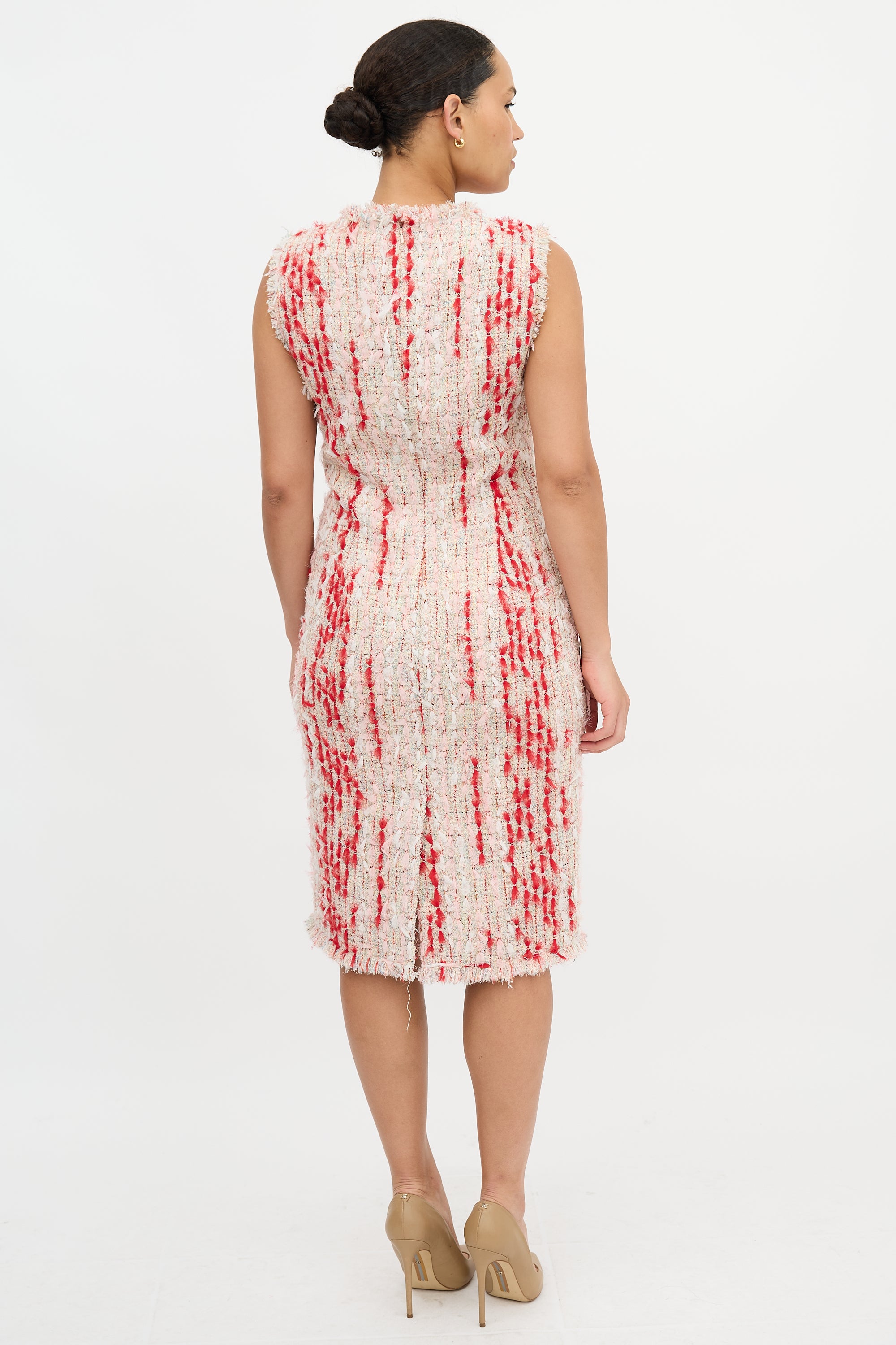 Pre-owned Alexander McQueen pink, red, and multicolour tweed sheath dress featuring a round neckline, back zip closure, frayed raw edges throughout, kick pleat at back, and raw edge hem. Lined. Sarah Burton era design.