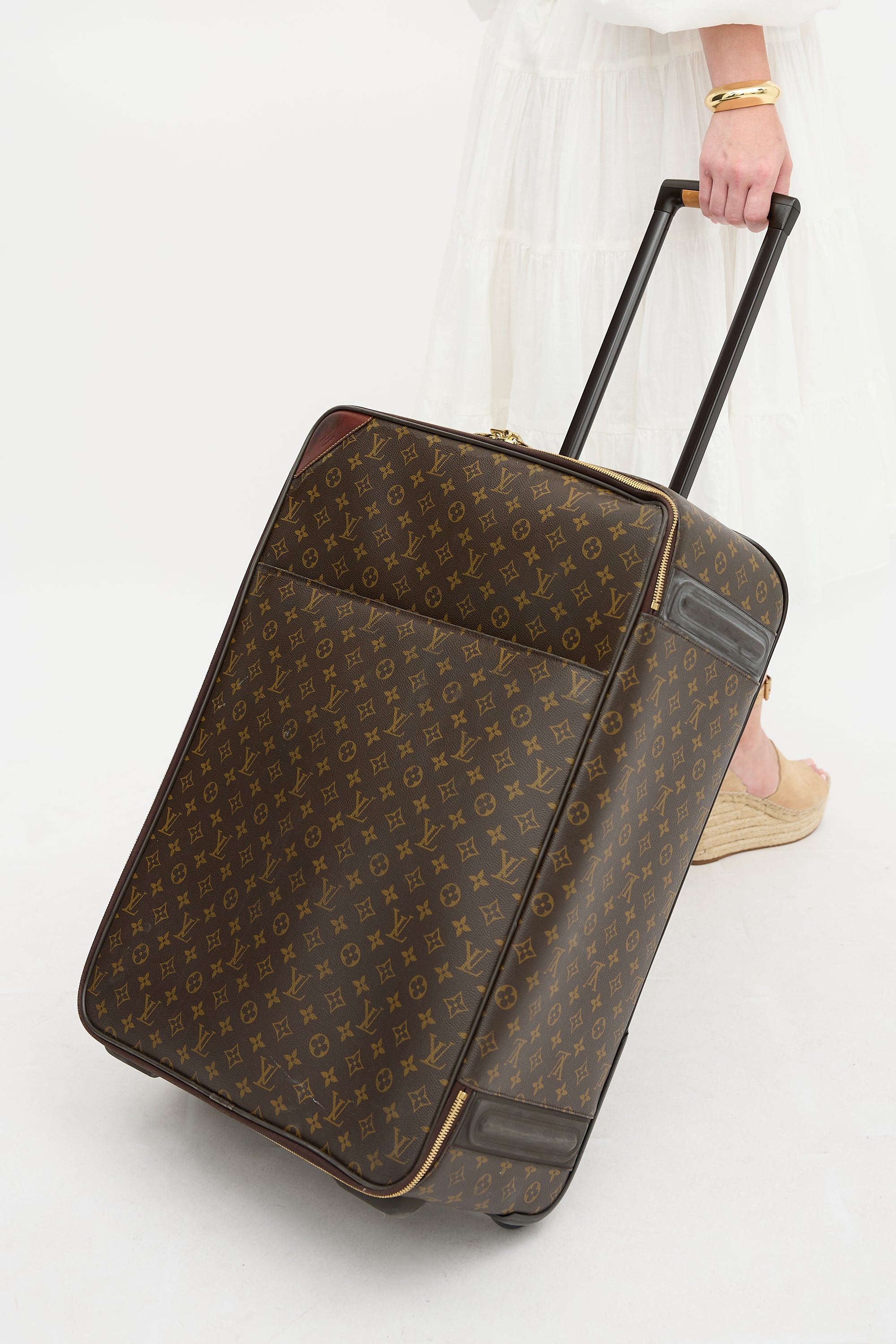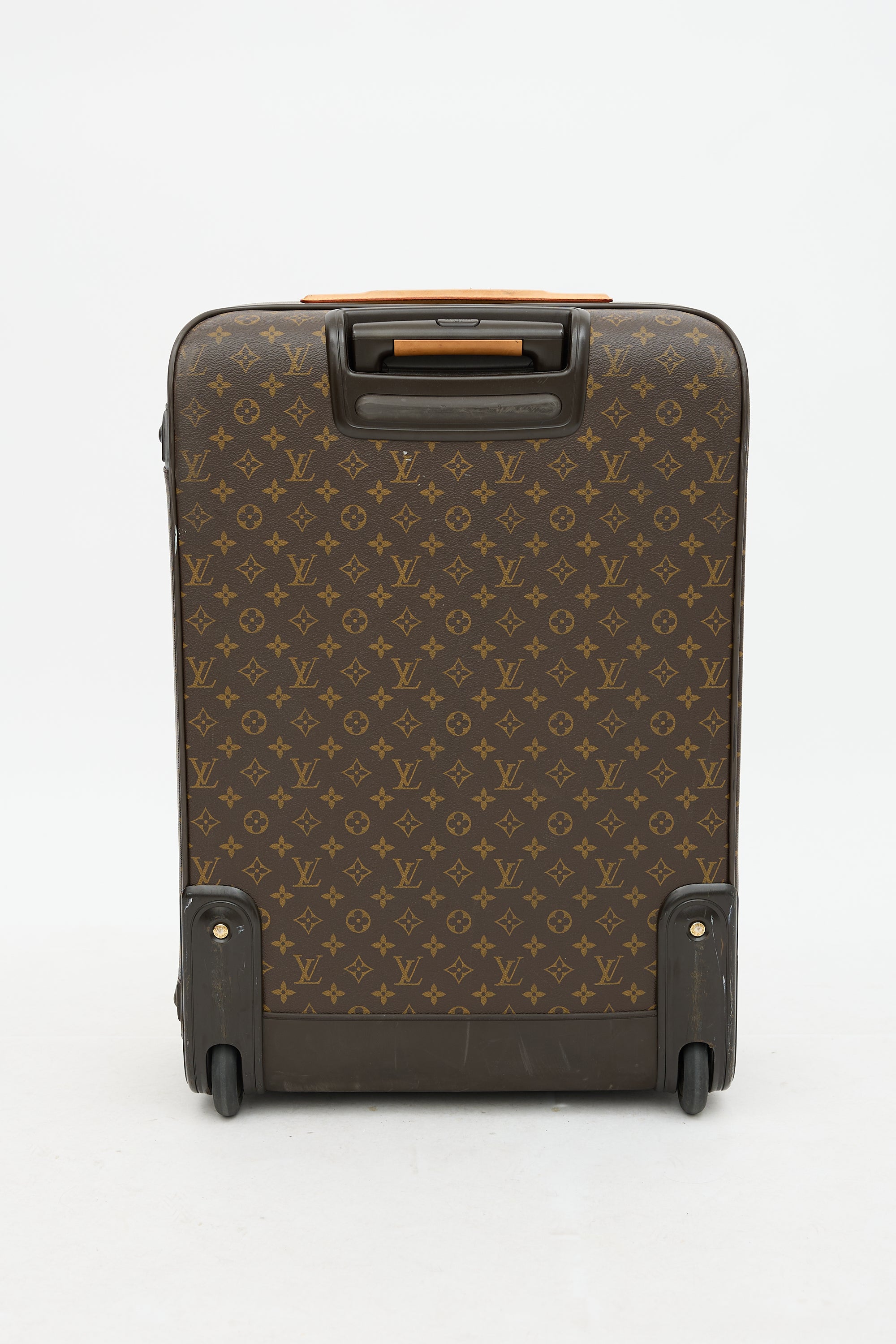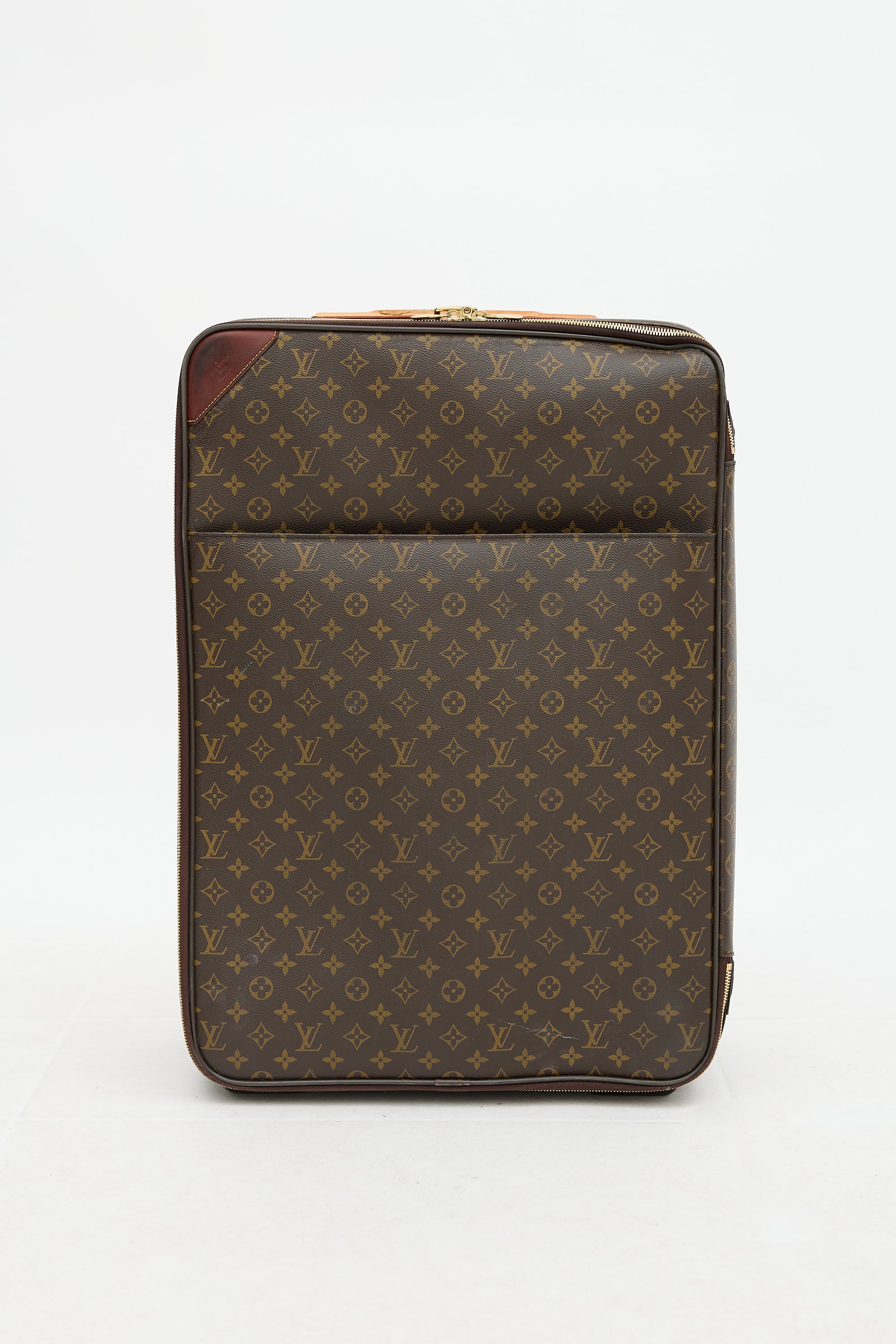 Pre-owned Louis Vuitton 2012 brown Pégase 65 suitcase featuring signature monogram coated canvas, brown Vachetta leather trim, exterior slip pocket with zip compartment, two carry handles, one telescopic handle, two wheels at base, two way zip closure, attached padlock, and one lined main main compartment with Velcro cover and four zip compartments. Comes with cover and set of two keys.
