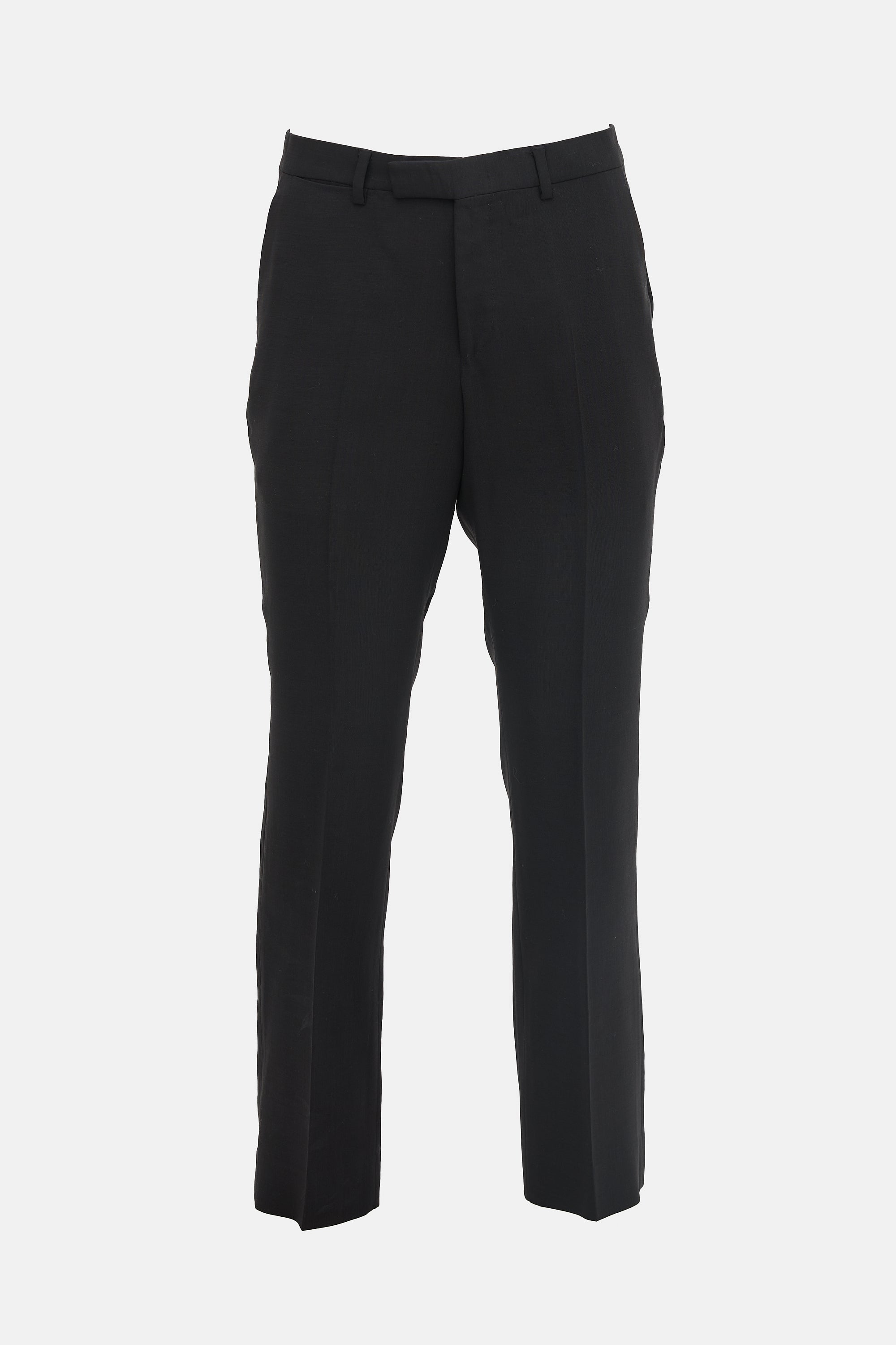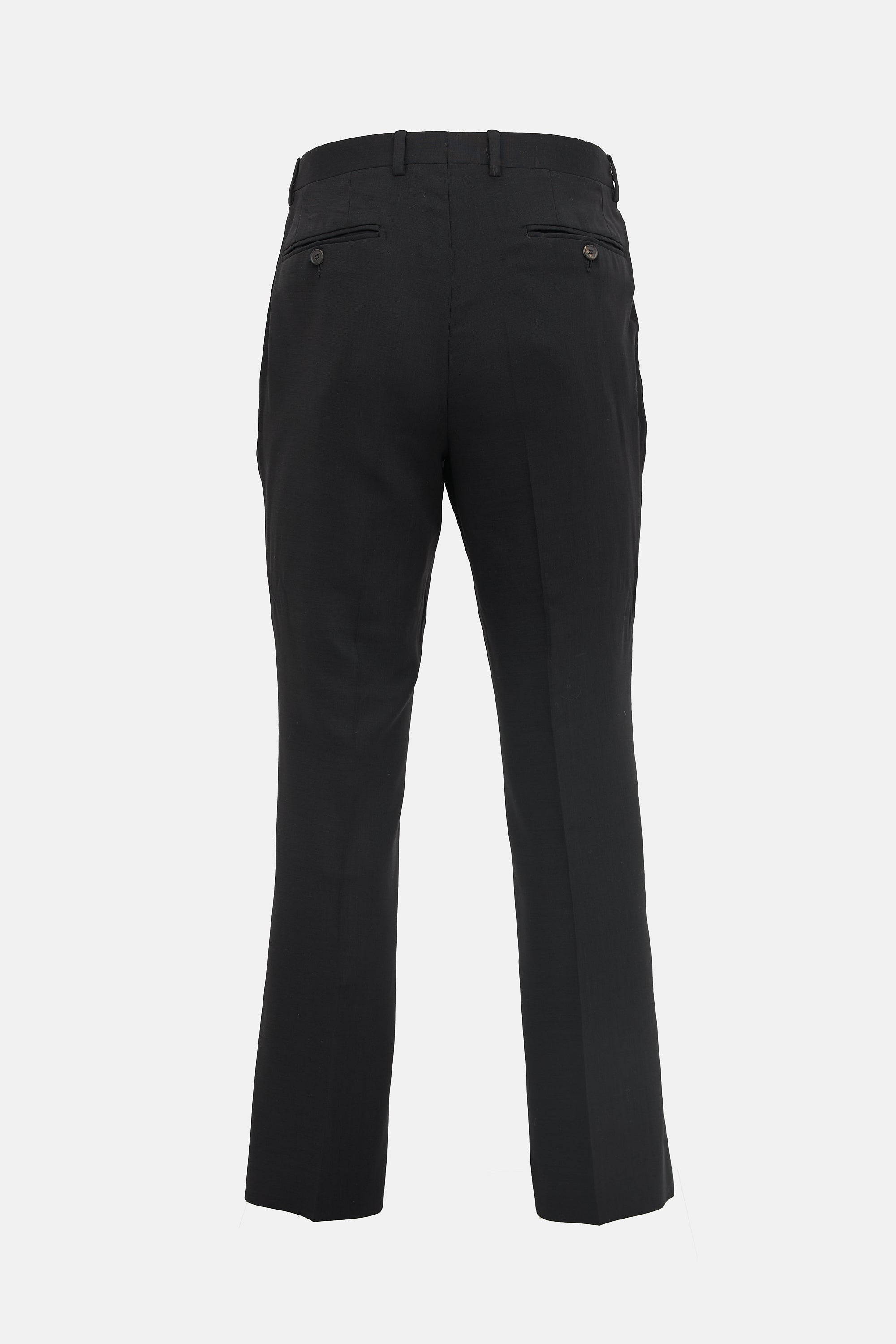 Pre-owned Gucci black wool trousers featuring a zip fly, belt loops, four pocket styling, pressed seams, V-cut back waist, and a straight leg.