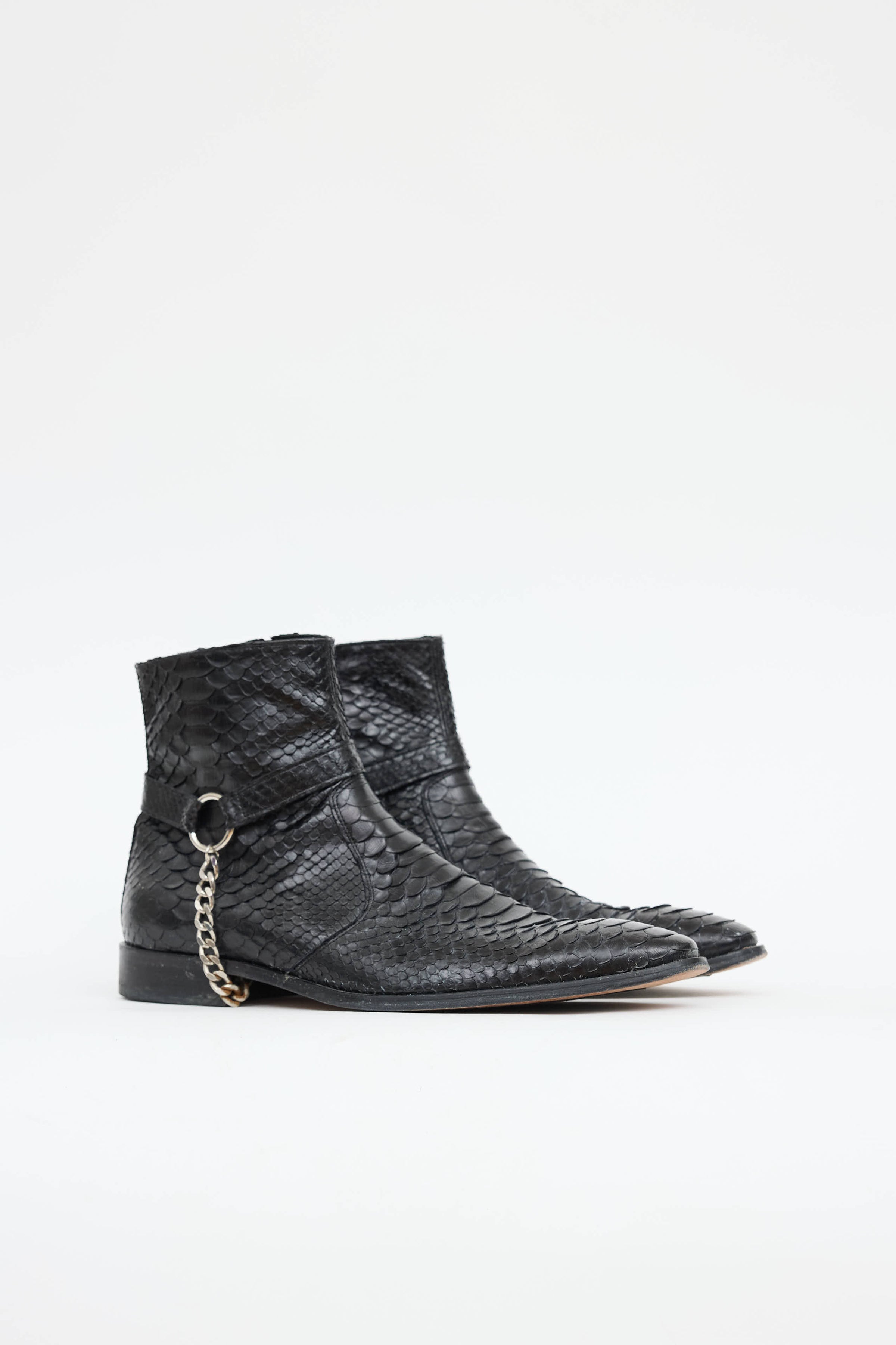 Pre-owned Guardi men's black snakeskin Harness boots featuring almond toe, stacked heel, silver tone harness detail at side with chain-link, and zip at side.