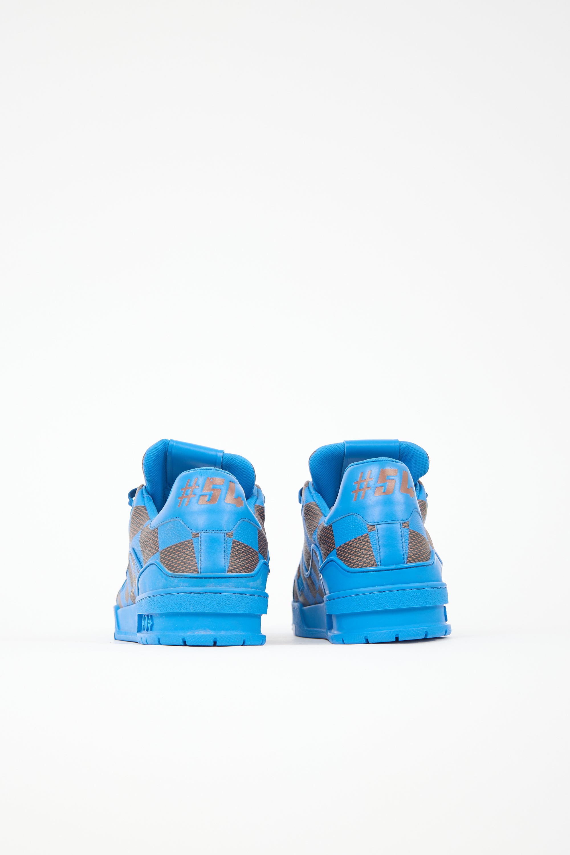 Pre-owned Louis Vuitton blue and brown leather LV Trainer sneakers featuring rounded toe, Damier Pop printed upper, lace up front, logo at front and side, and stamped #54 at heel counter.
