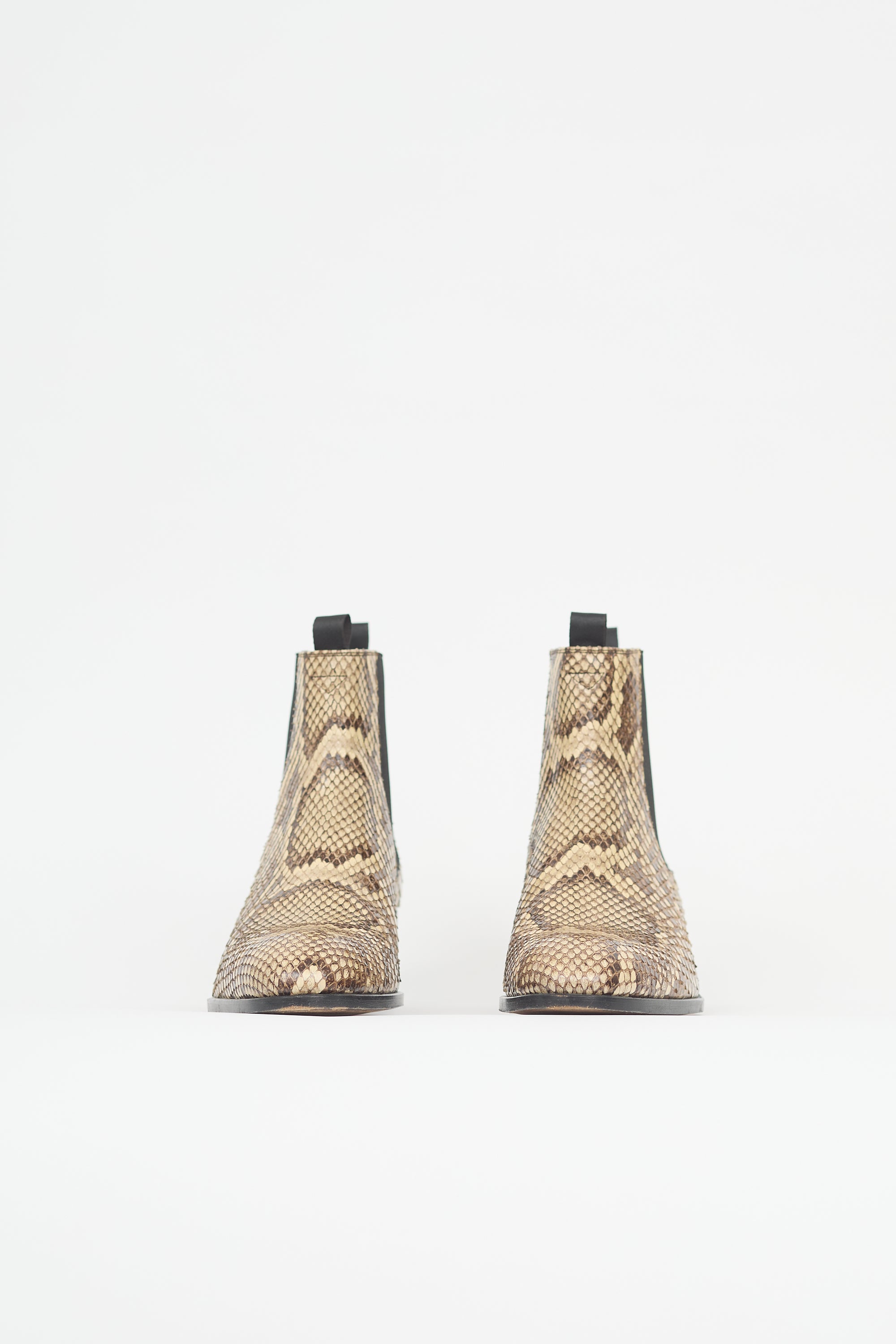 Pre-owned Tom Ford cream python Chelsea boots featuring rounded toe, elastic side panels, pull tabs at front and back topline, and black wooden block heel.
