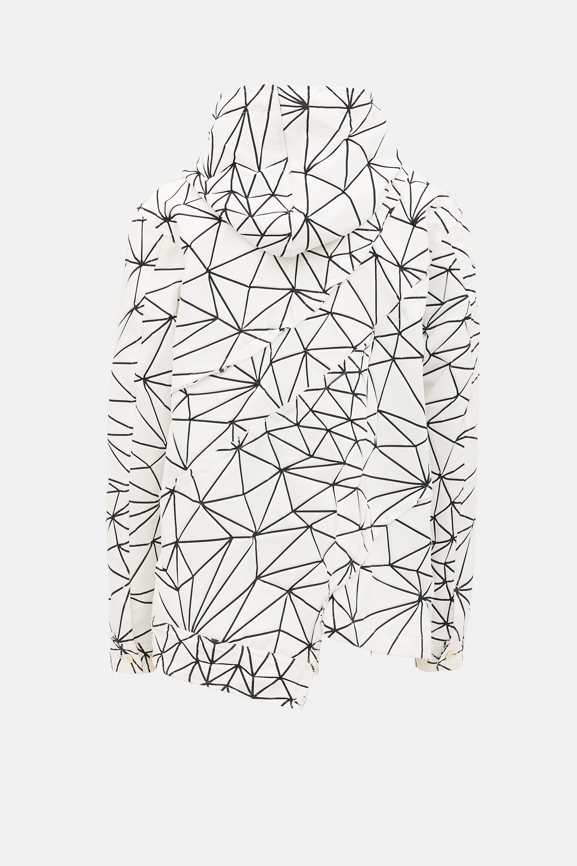Pre-owned Comme des Garçons Homme Plus white and black crepe hoodie featuring a drawstring hood, asymmetric zip front, two welt pockets at front, raw edge trim details at front, buttoned cuffs, and asymmetric hem. Unlined.