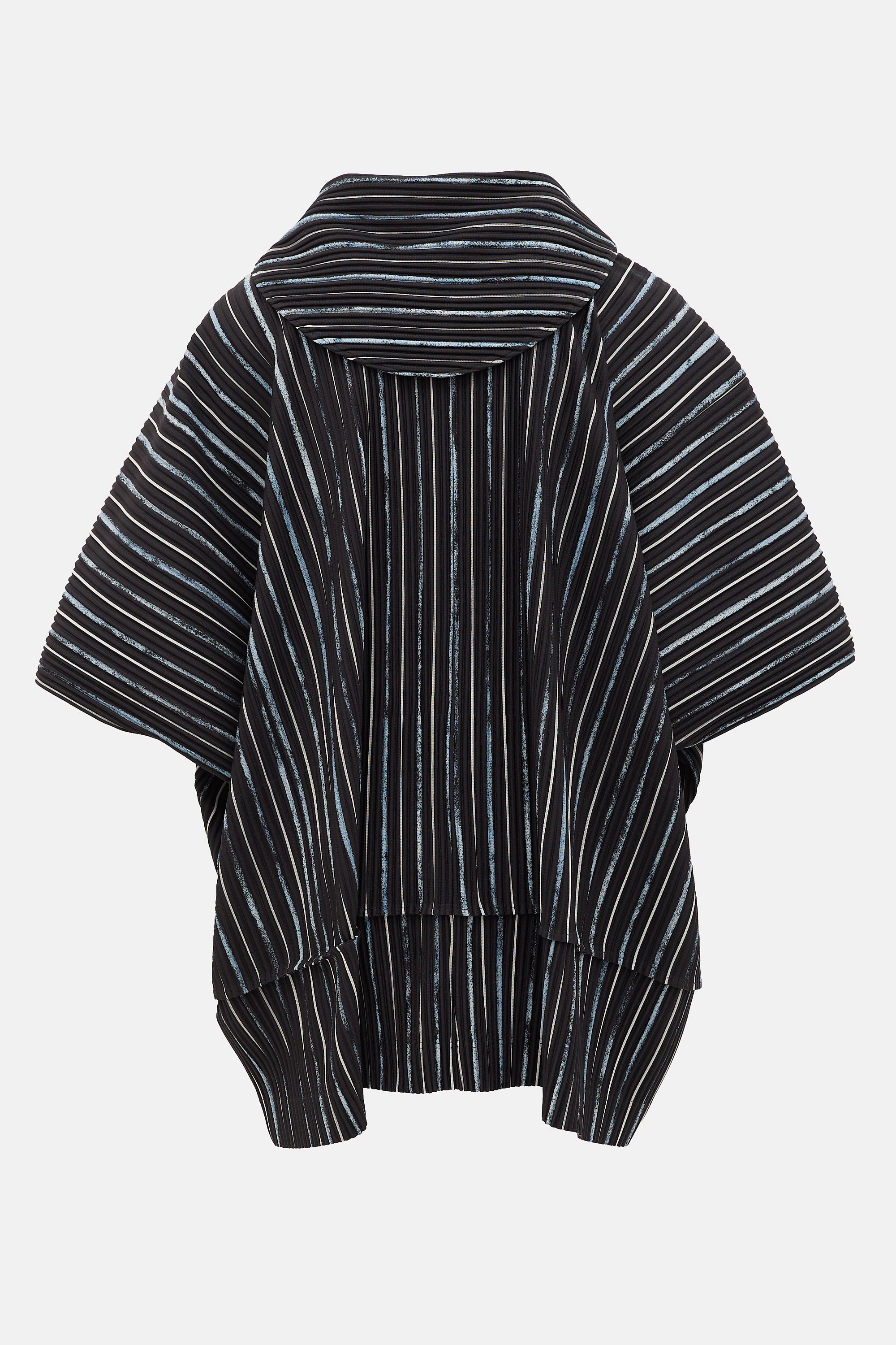 Pre-owned Homme Plissé Issey Miyake black, blue, and white striped hoodie featuring an attached hood, pleating throughout, two way zip front, short dolman sleeves, two slip pockets at chest, and layered hem.