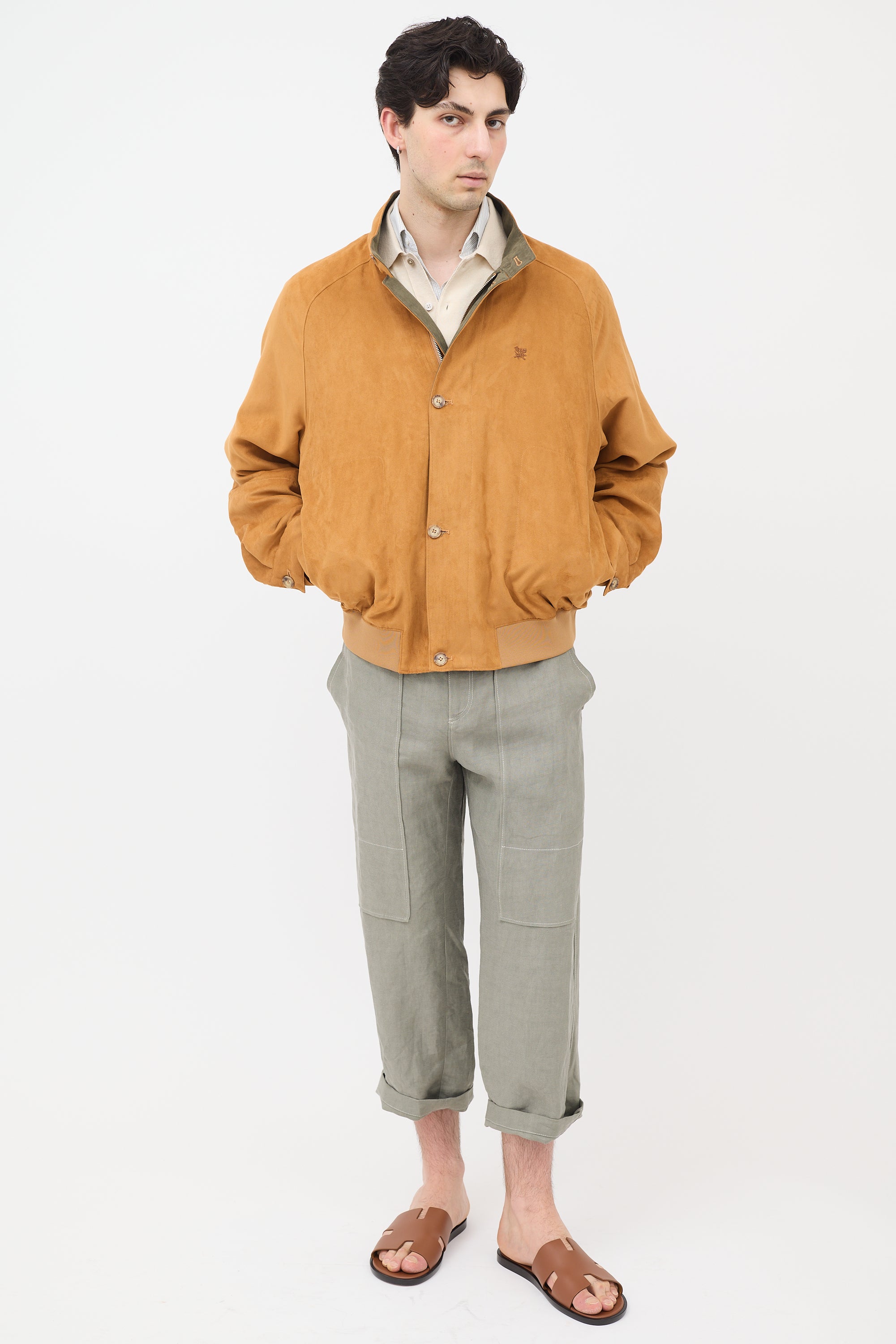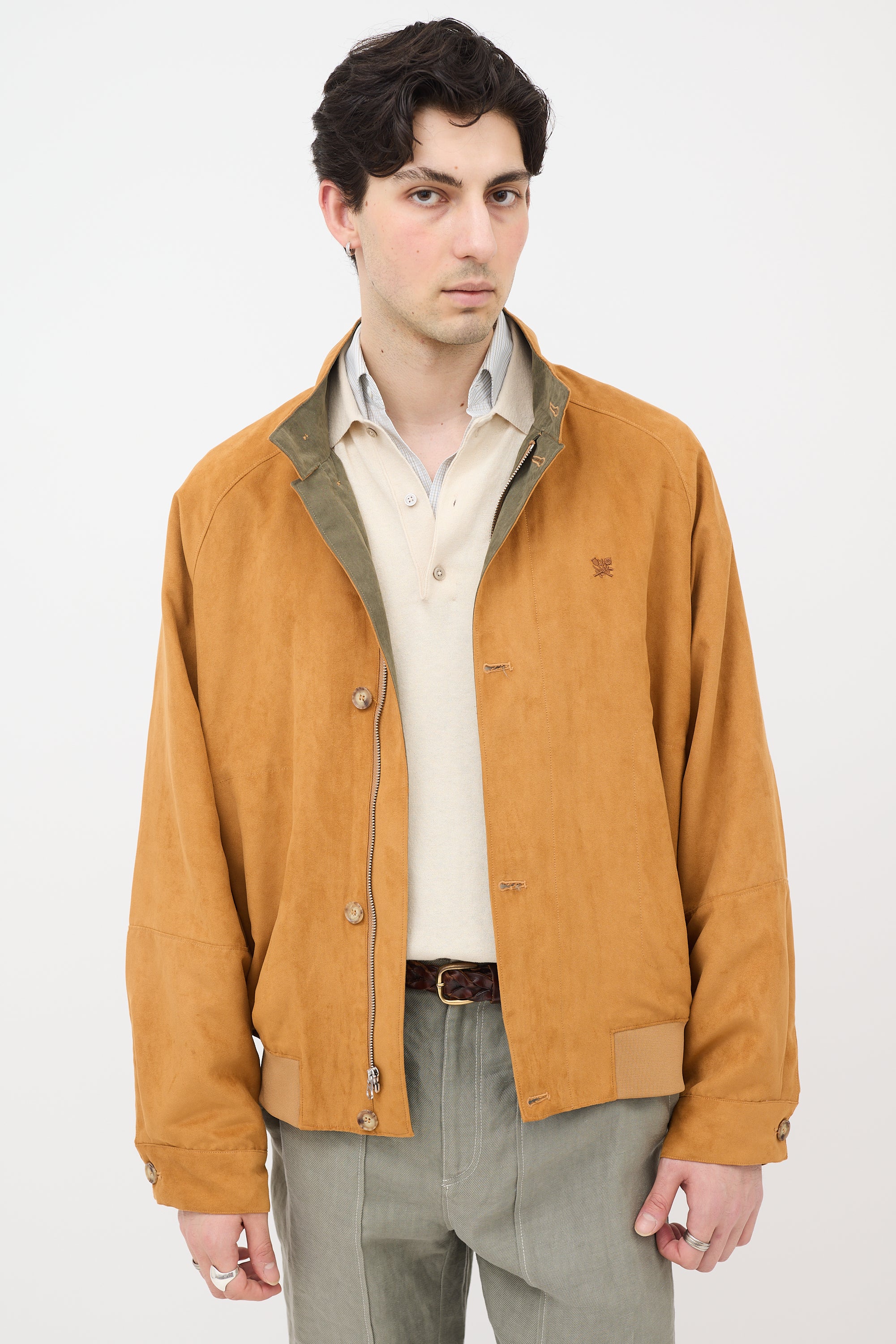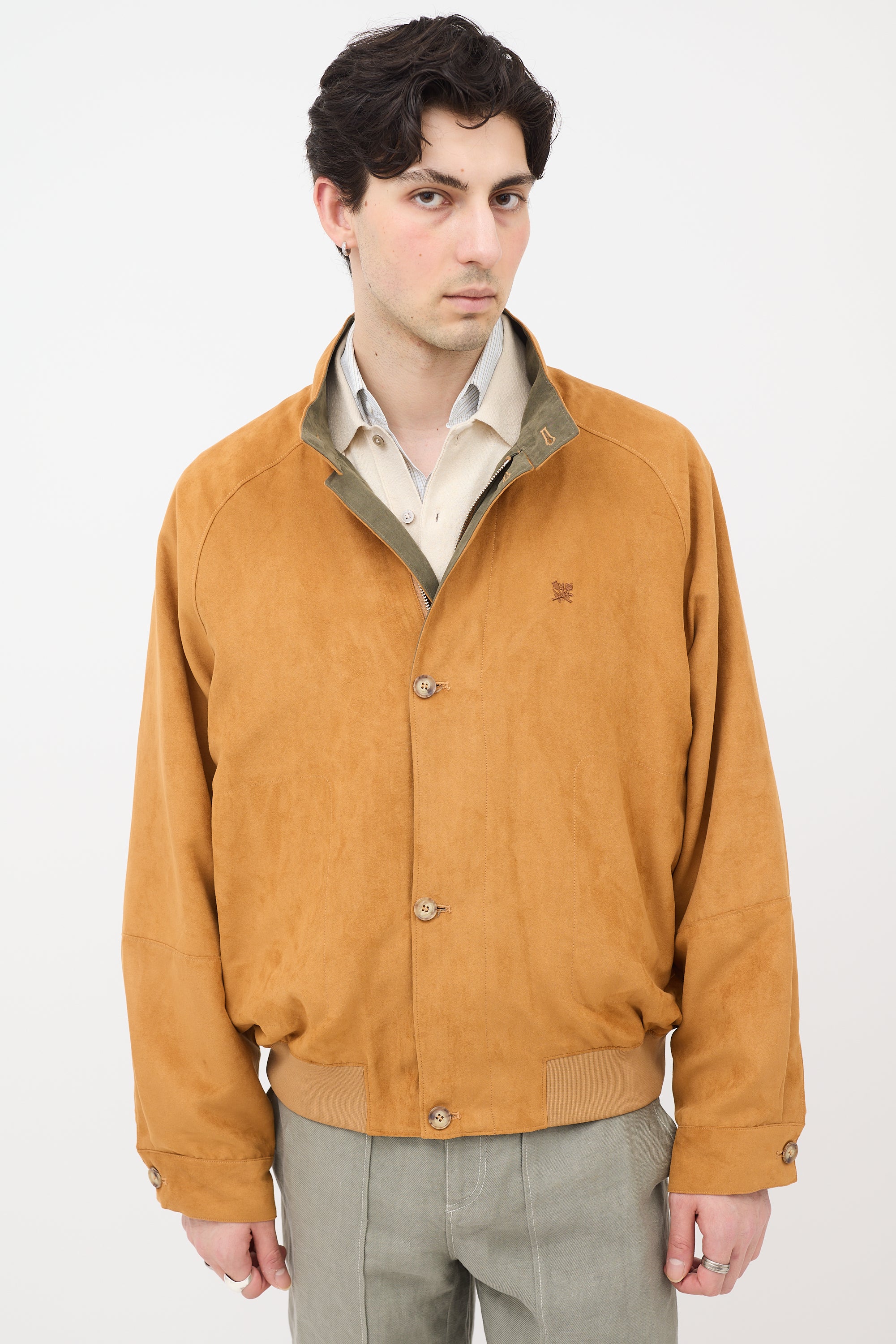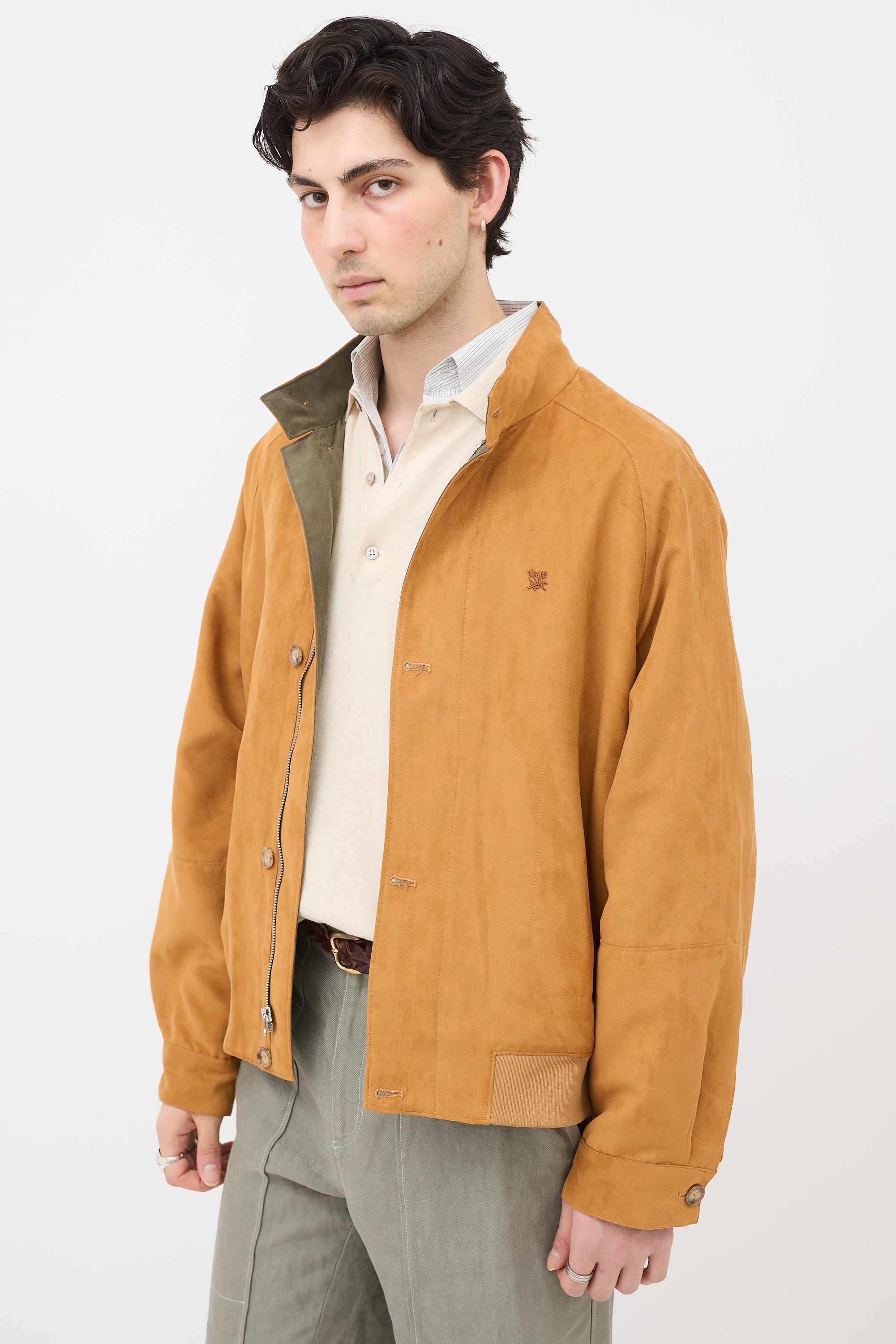 Pre-owned Aimé Leon Dore SS 2023 brown jacket featuring stand collar, zip and button front, two hip pockets, tonal embroidered logo at chest, and buttoned cuffs. Stripe lining.