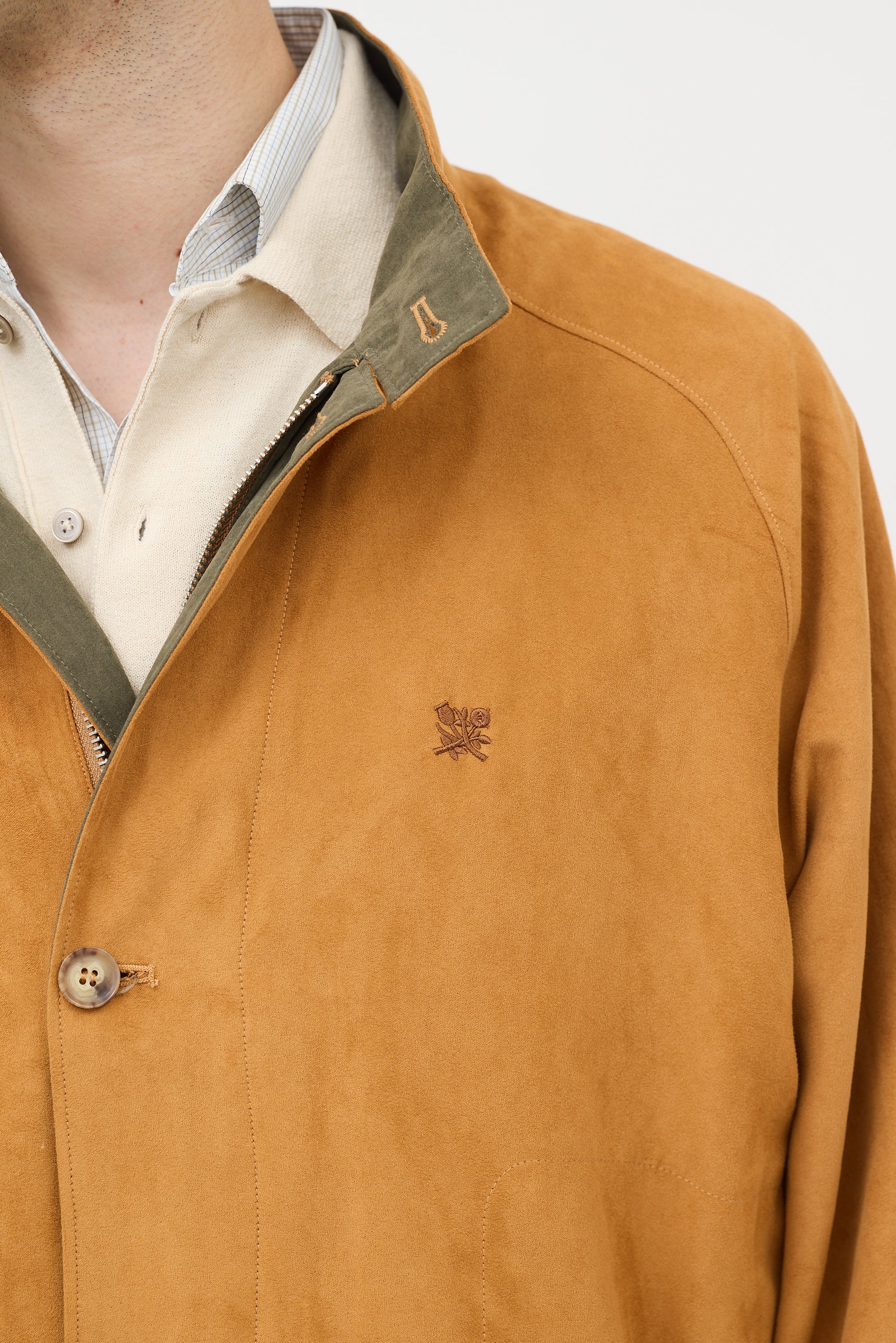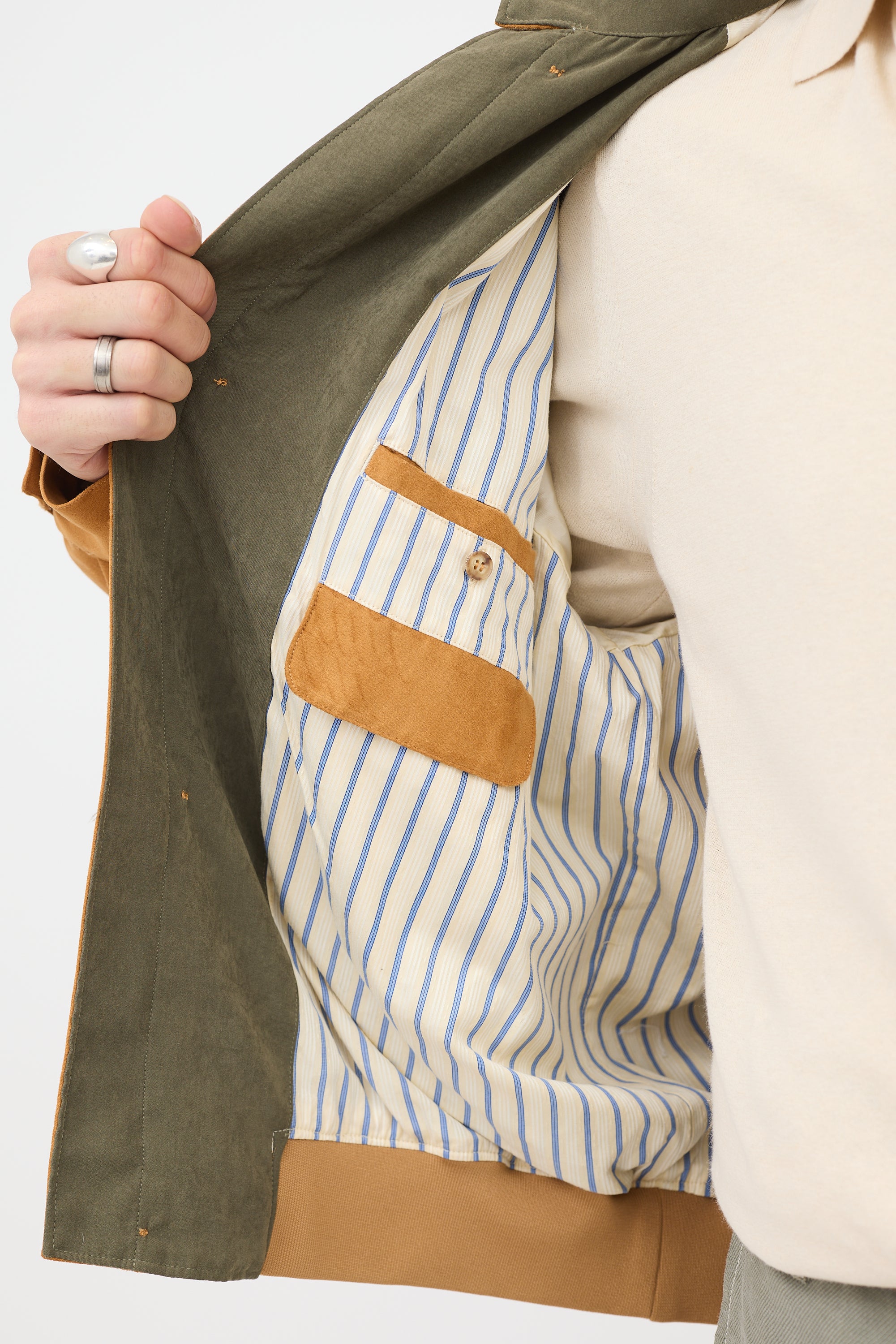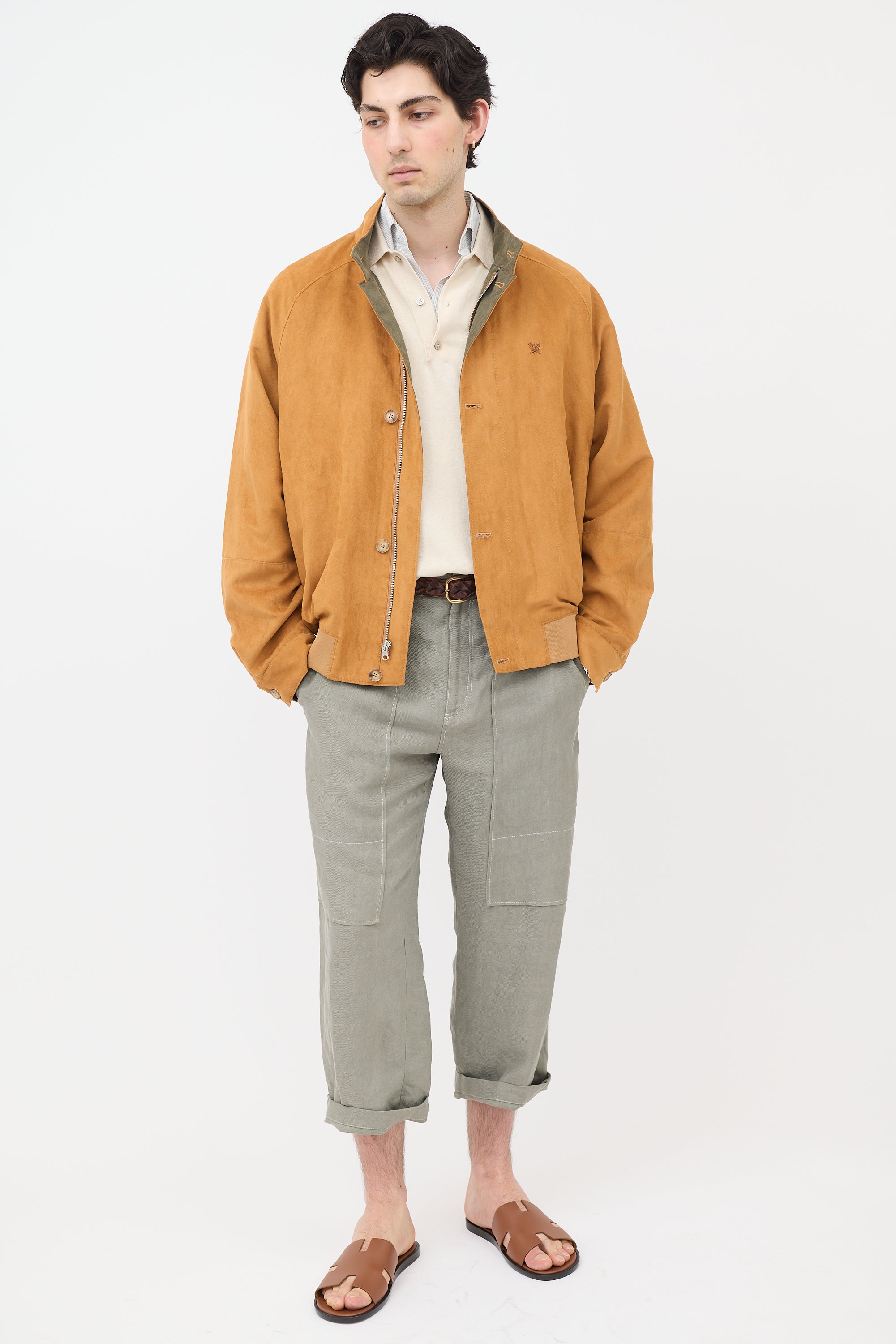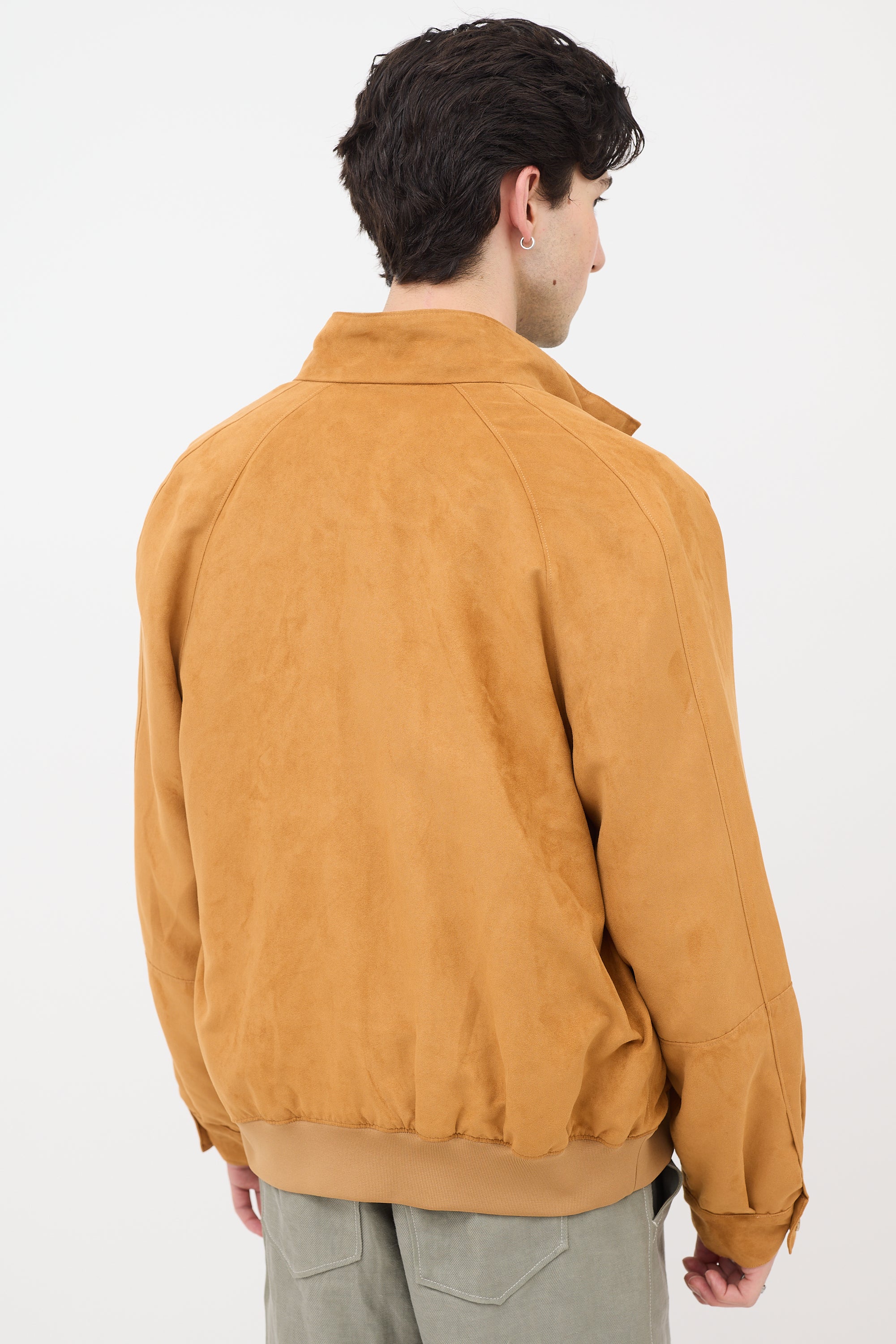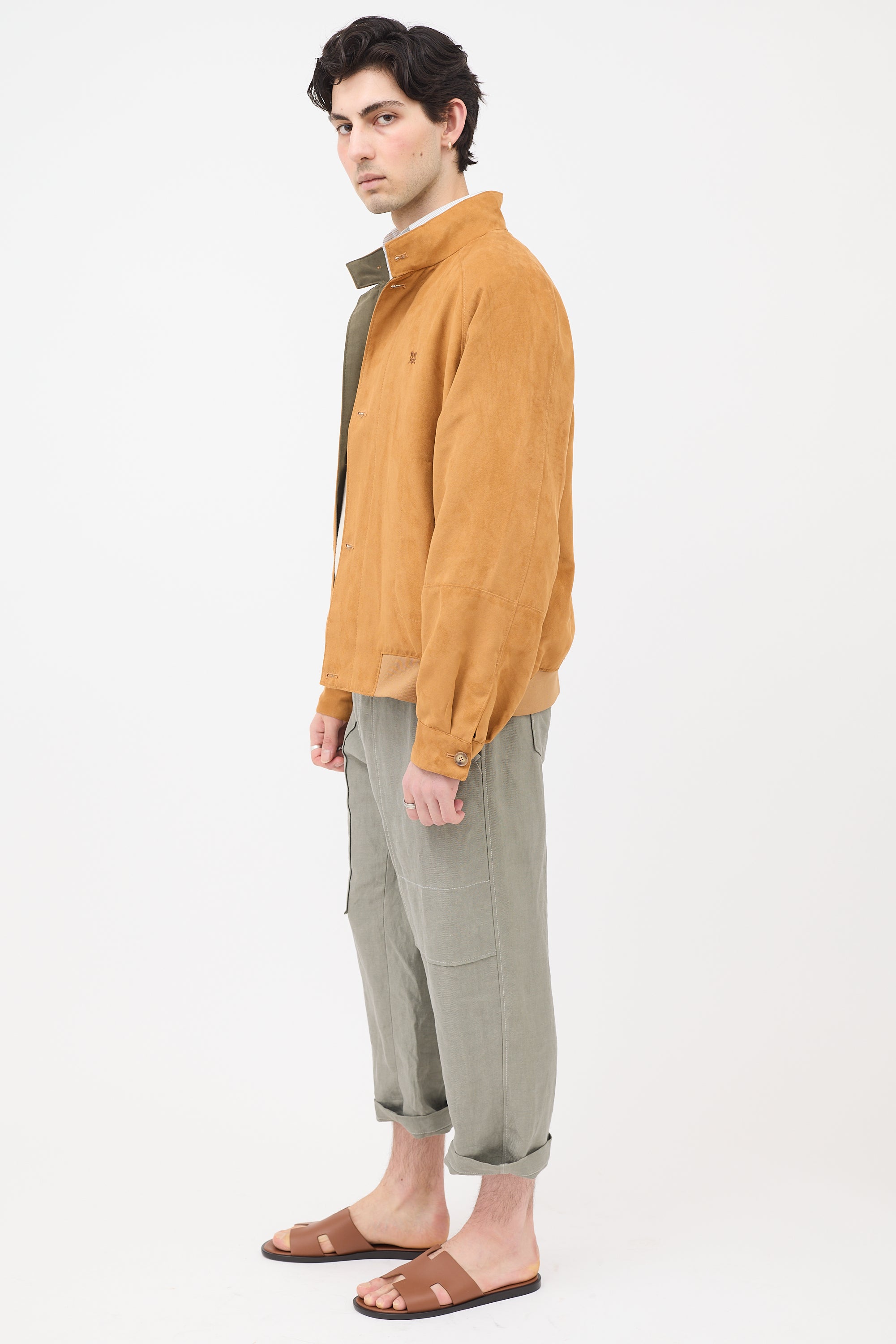 Pre-owned Aimé Leon Dore SS 2023 brown jacket featuring stand collar, zip and button front, two hip pockets, tonal embroidered logo at chest, and buttoned cuffs. Stripe lining.