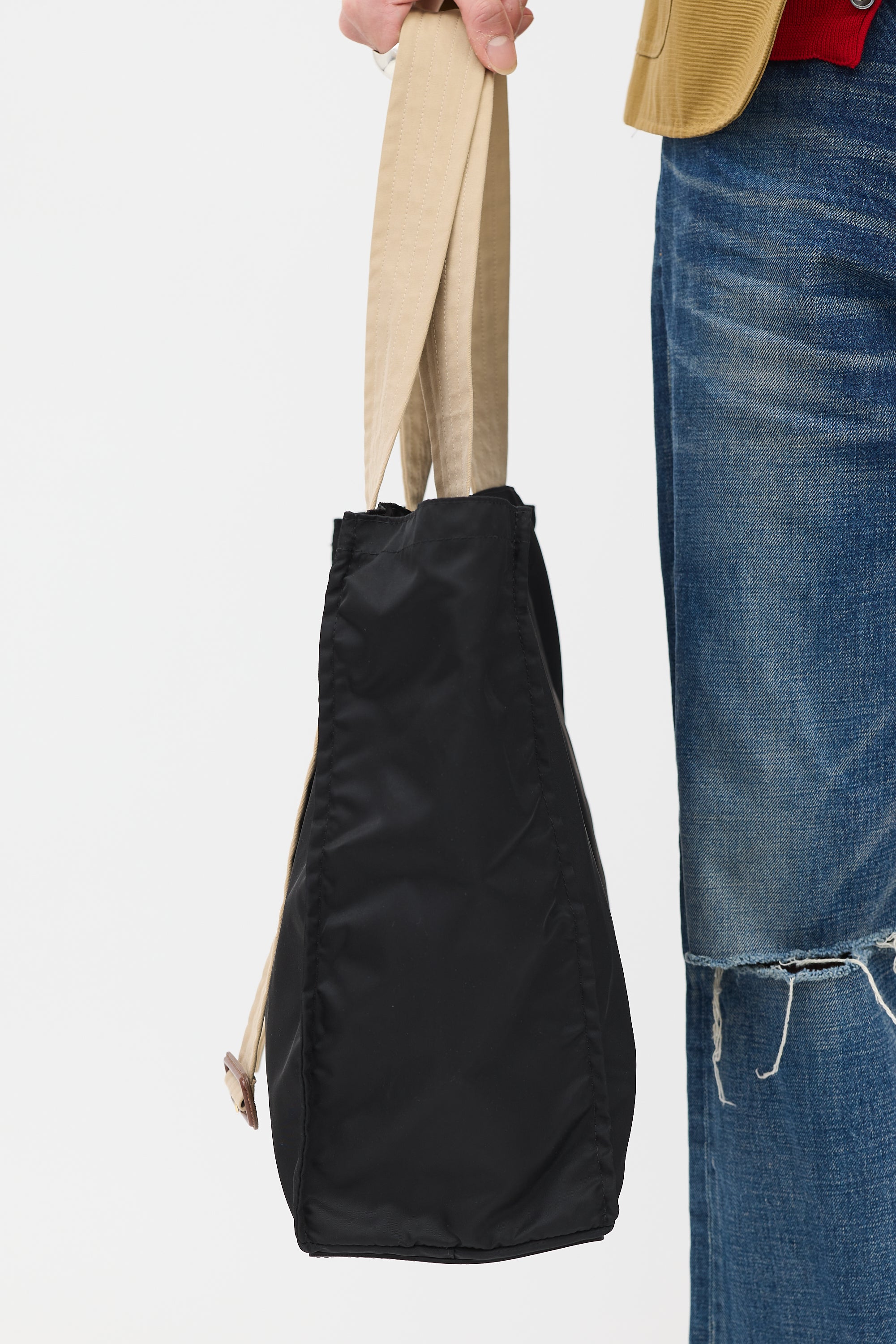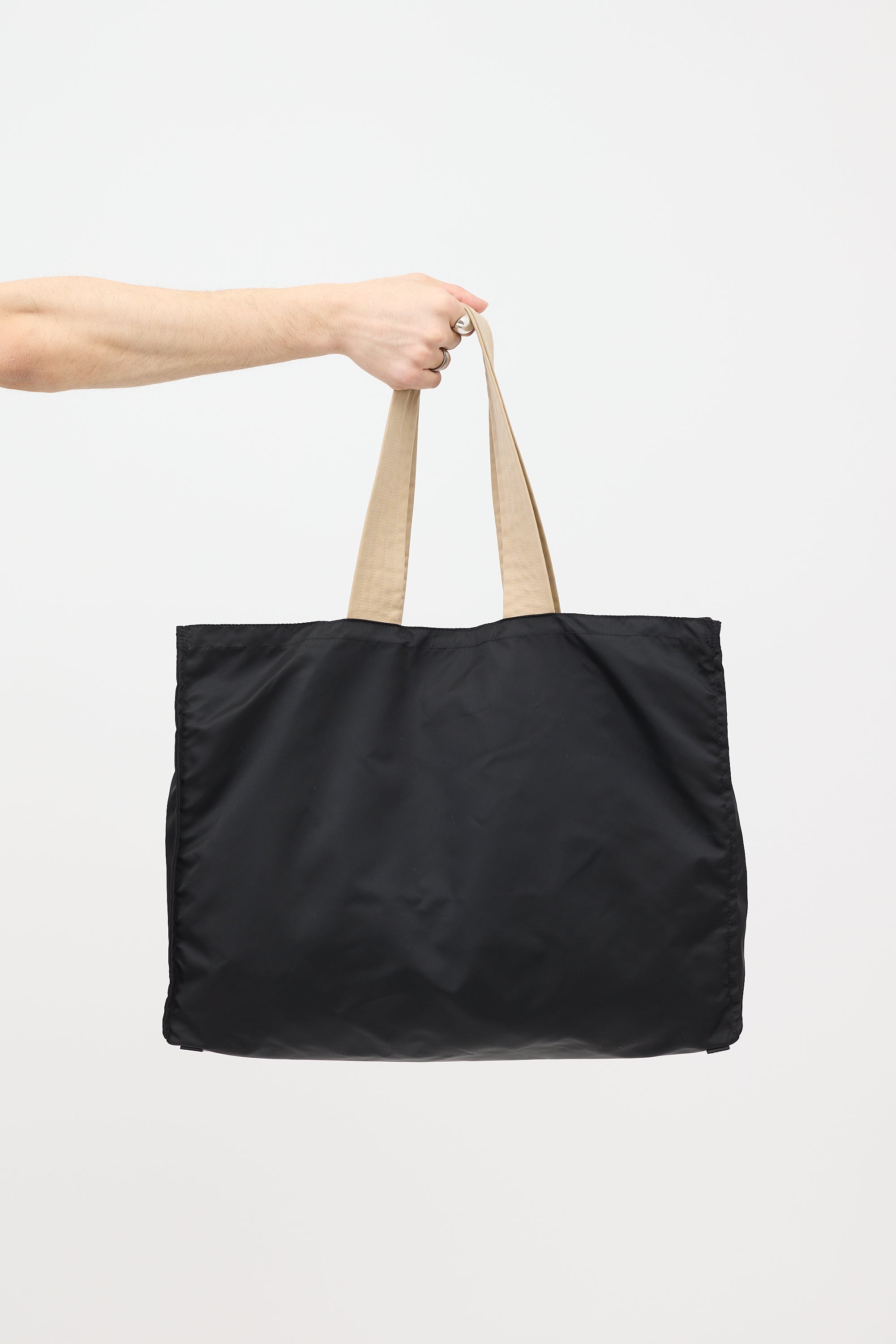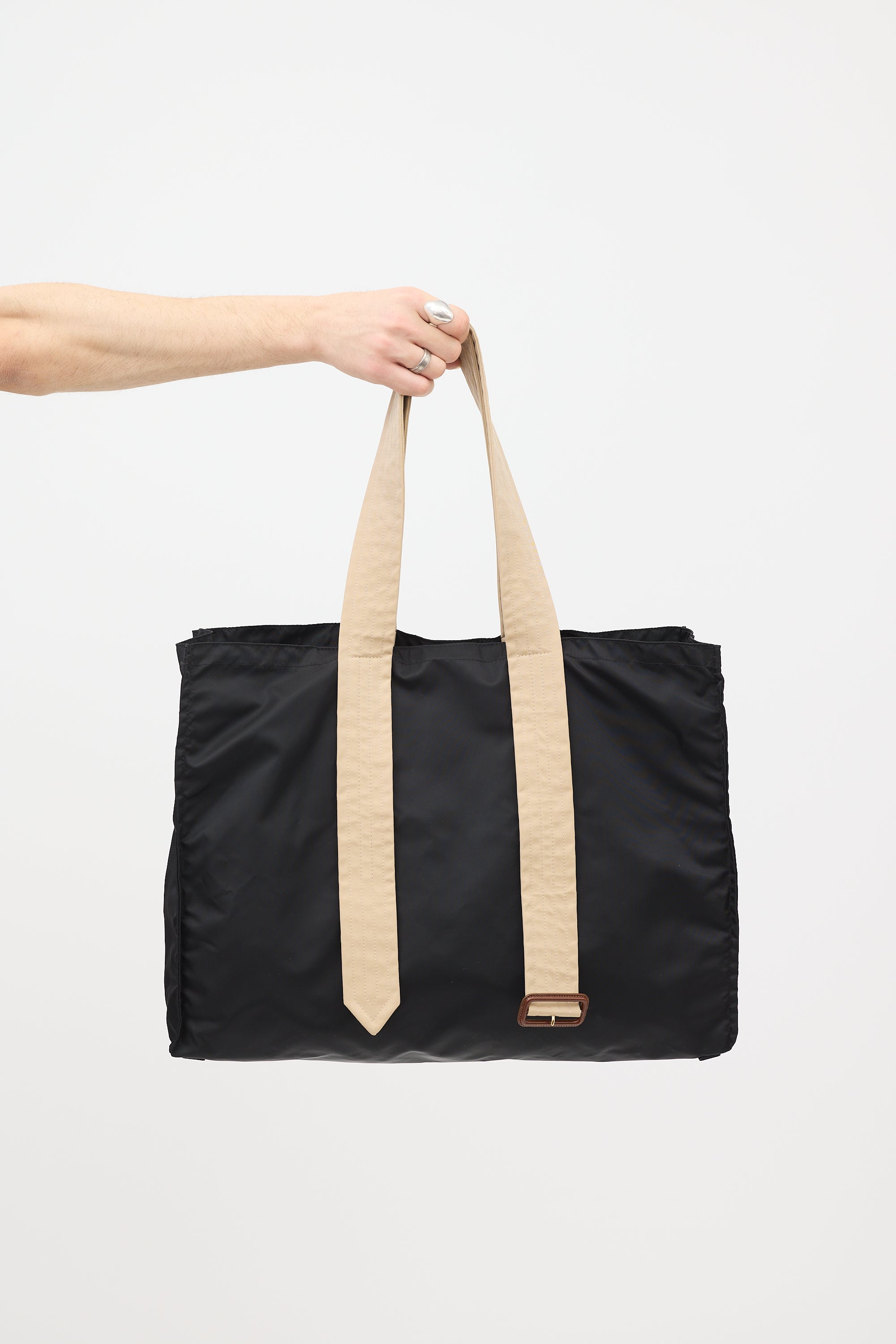 Pre-owned Burberry black nylon Large Trench tote bag featuring flat top handles, decorative trench belt strap at front, snap button closure, and interior pockets include one main compartment, one slip pocket, and one zip pocket.