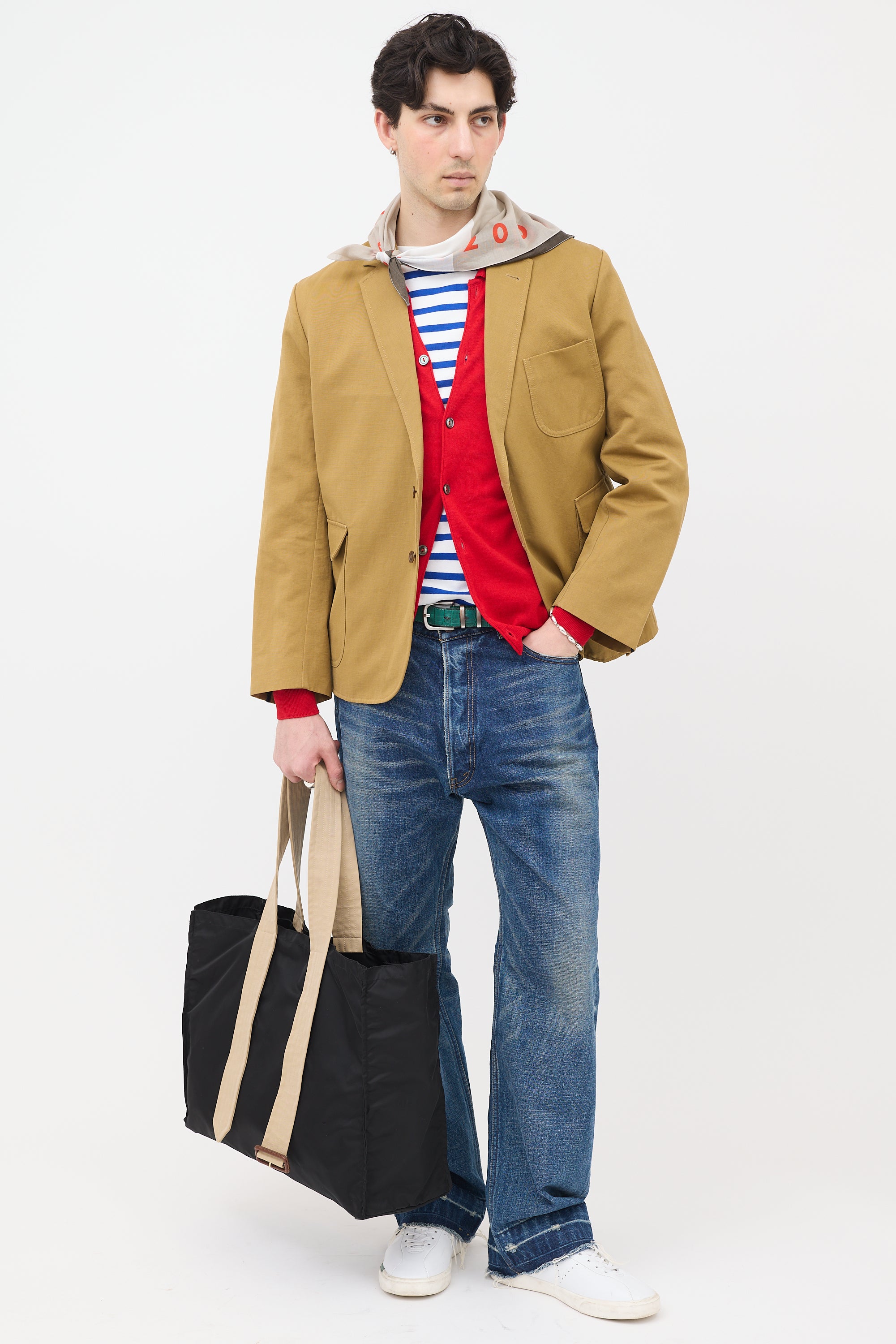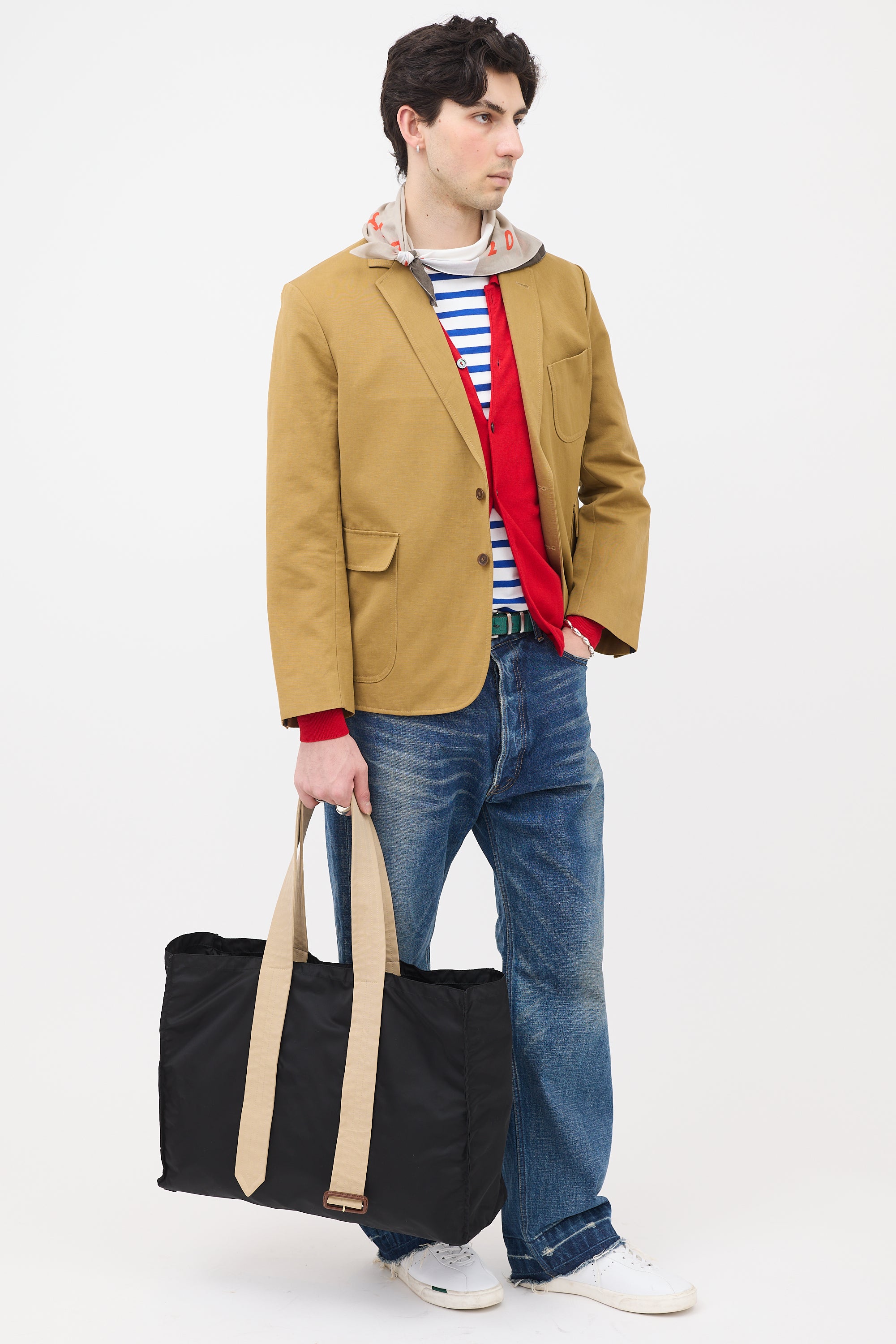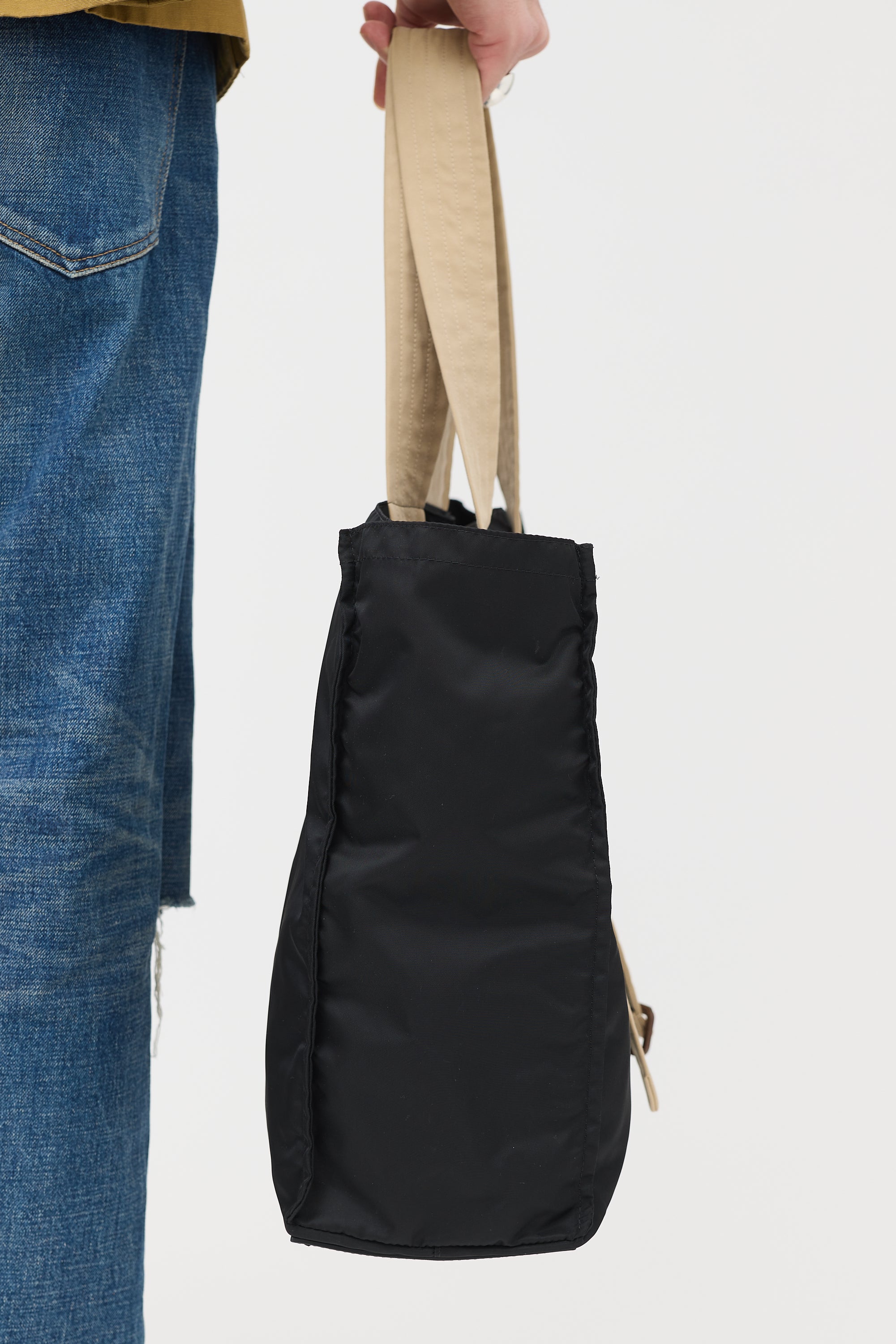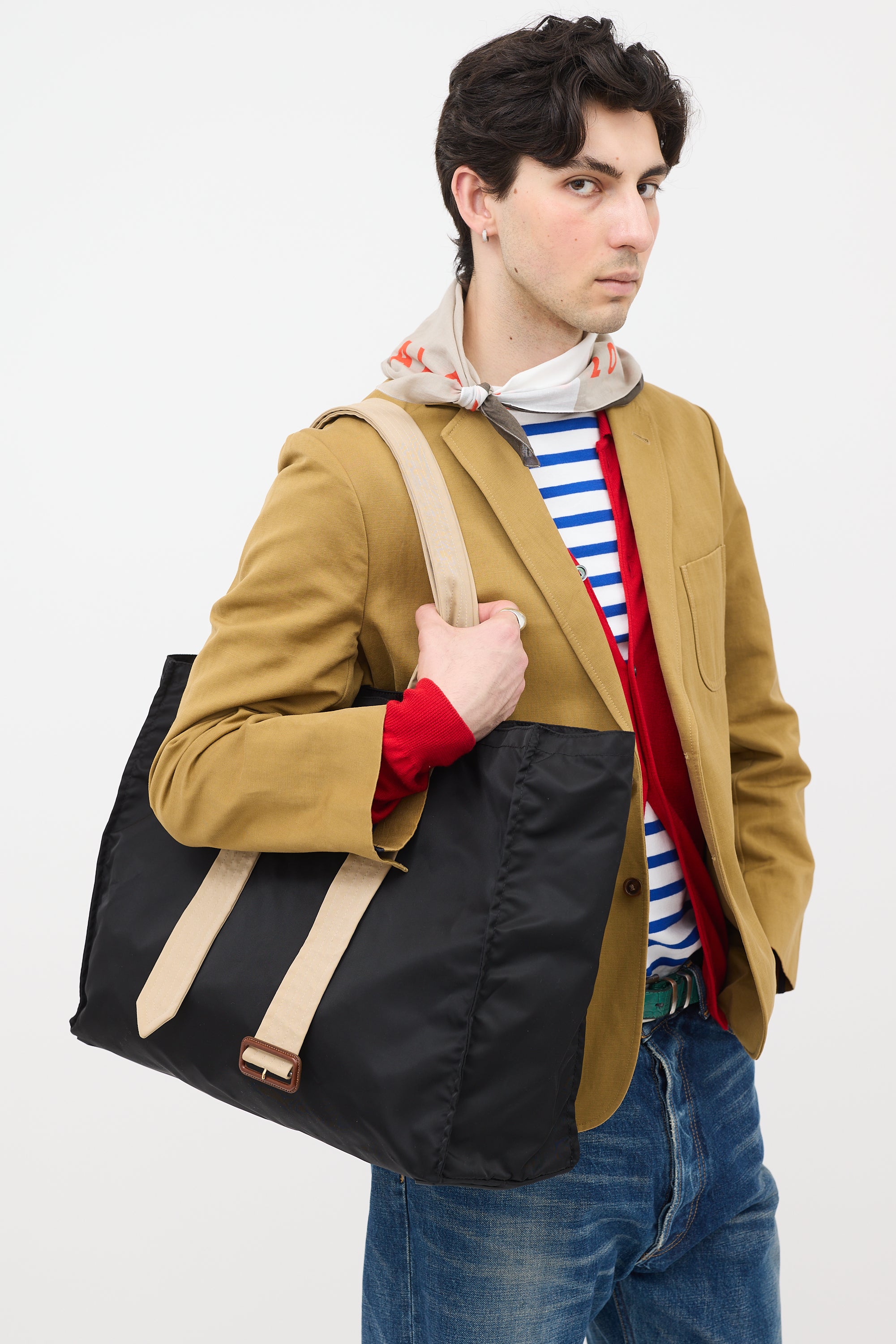 Pre-owned Burberry black nylon Large Trench tote bag featuring flat top handles, decorative trench belt strap at front, snap button closure, and interior pockets include one main compartment, one slip pocket, and one zip pocket.