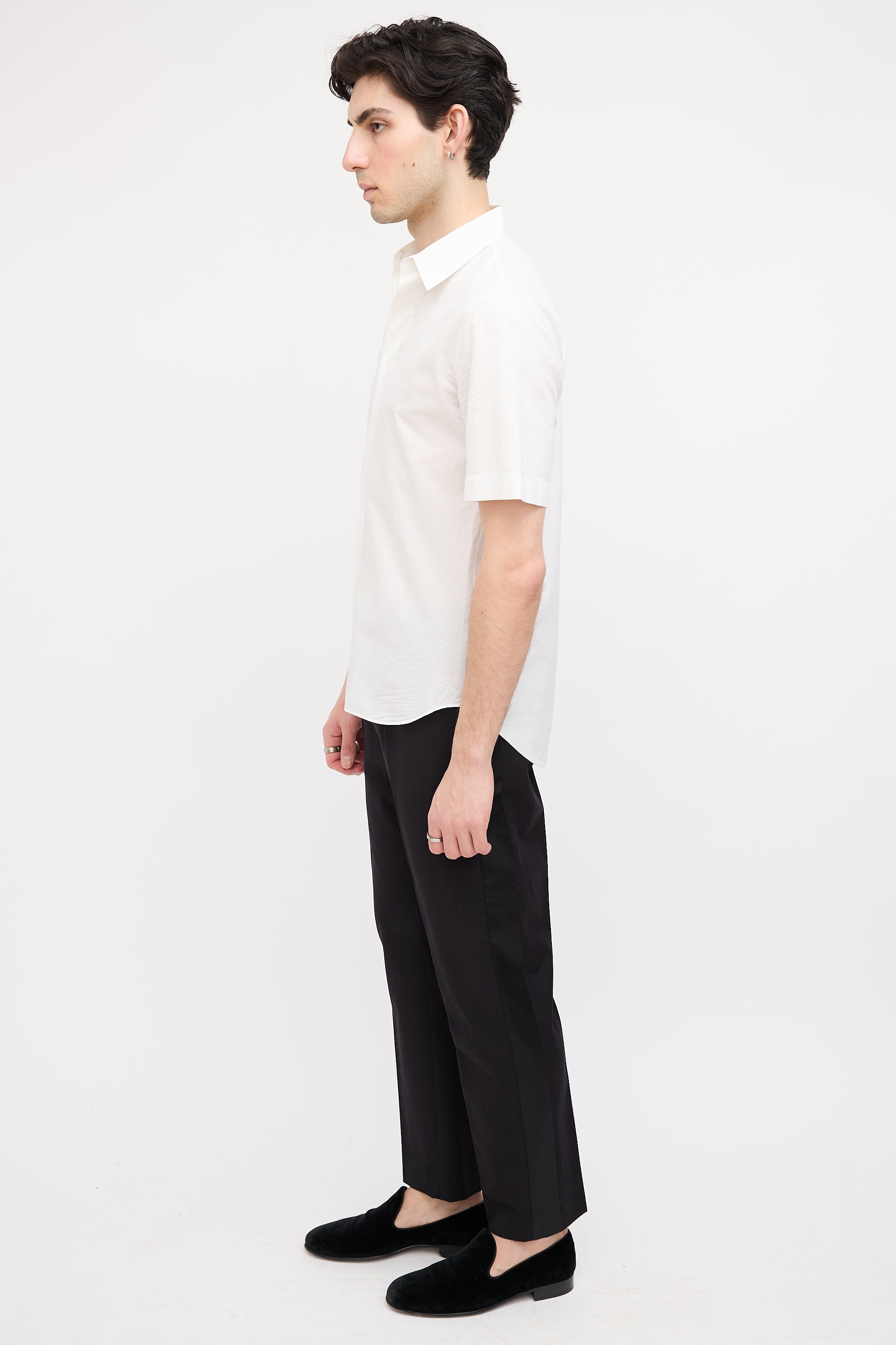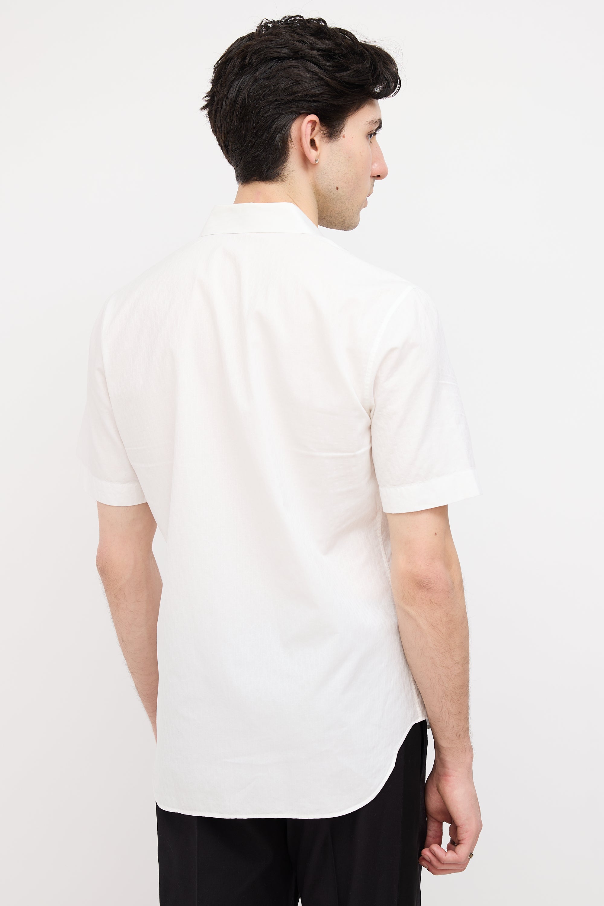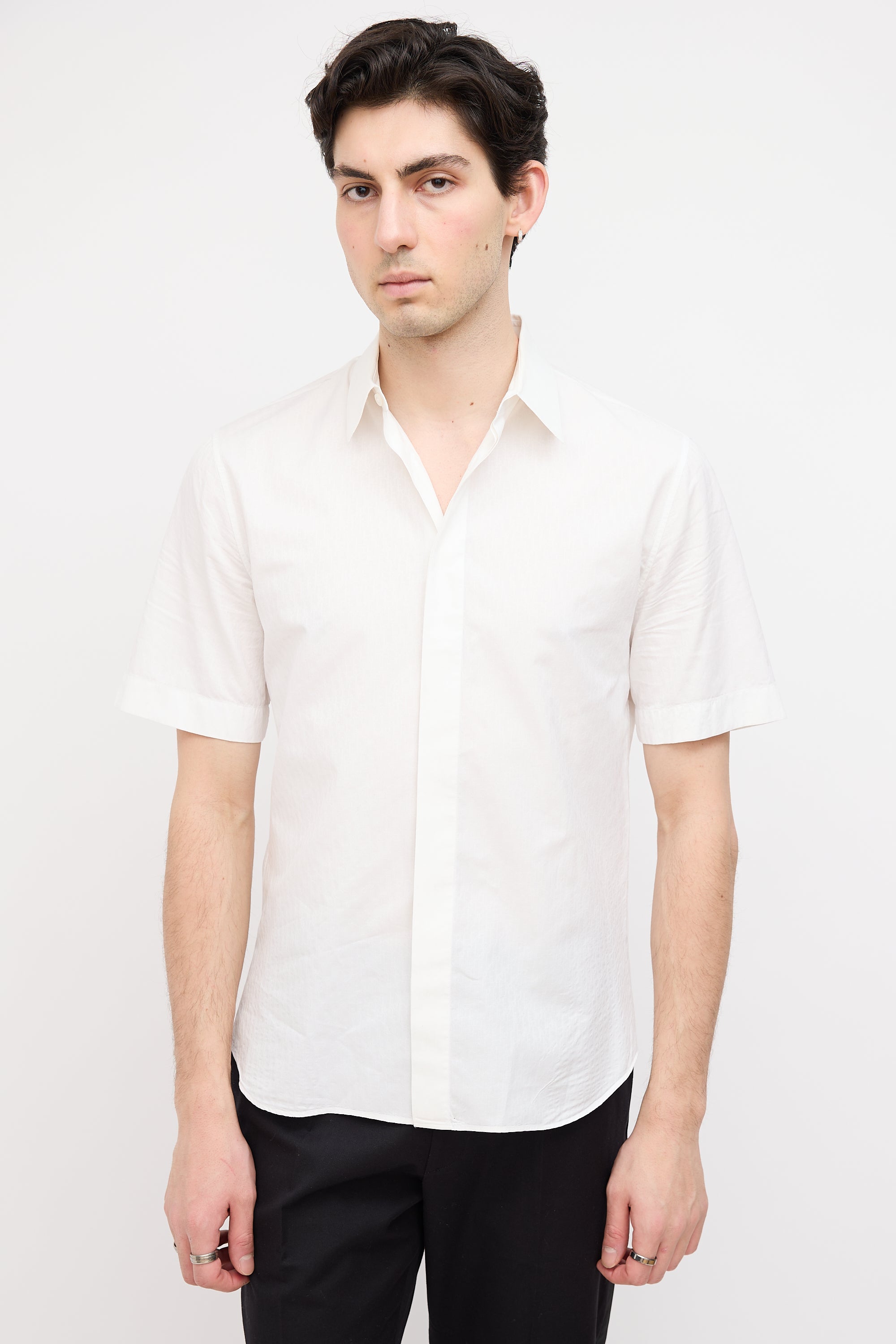 Pre-owned Dior white short sleeve shirt featuring tonal Oblique monogram throughout, pointed collar, concealed button up front, and scoop hem.