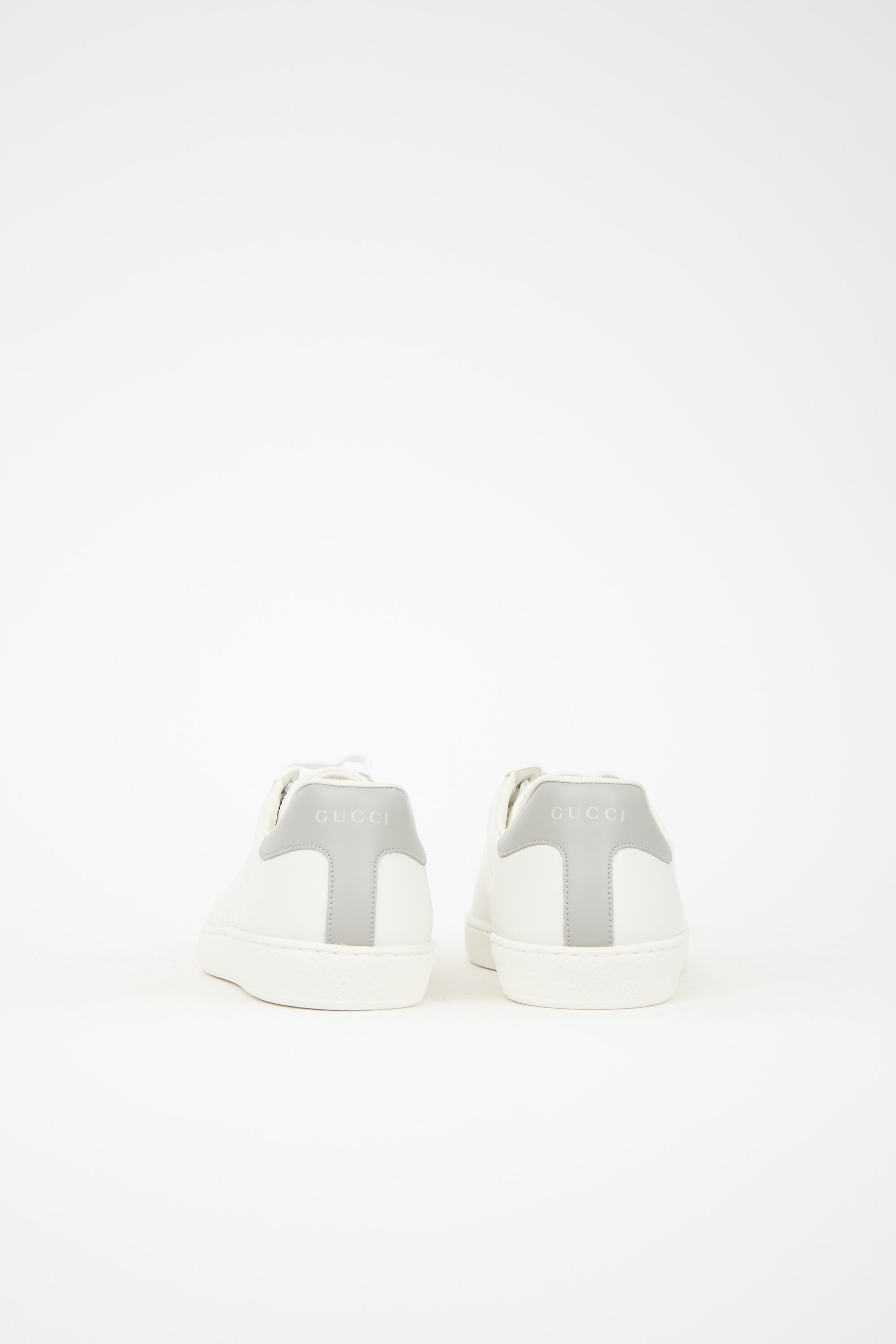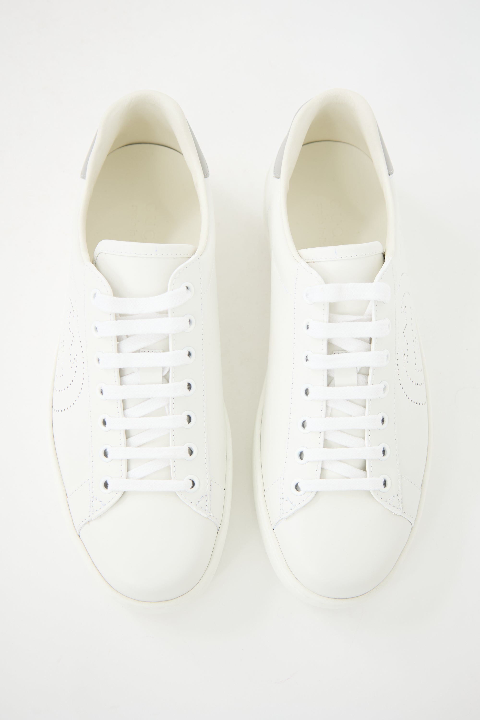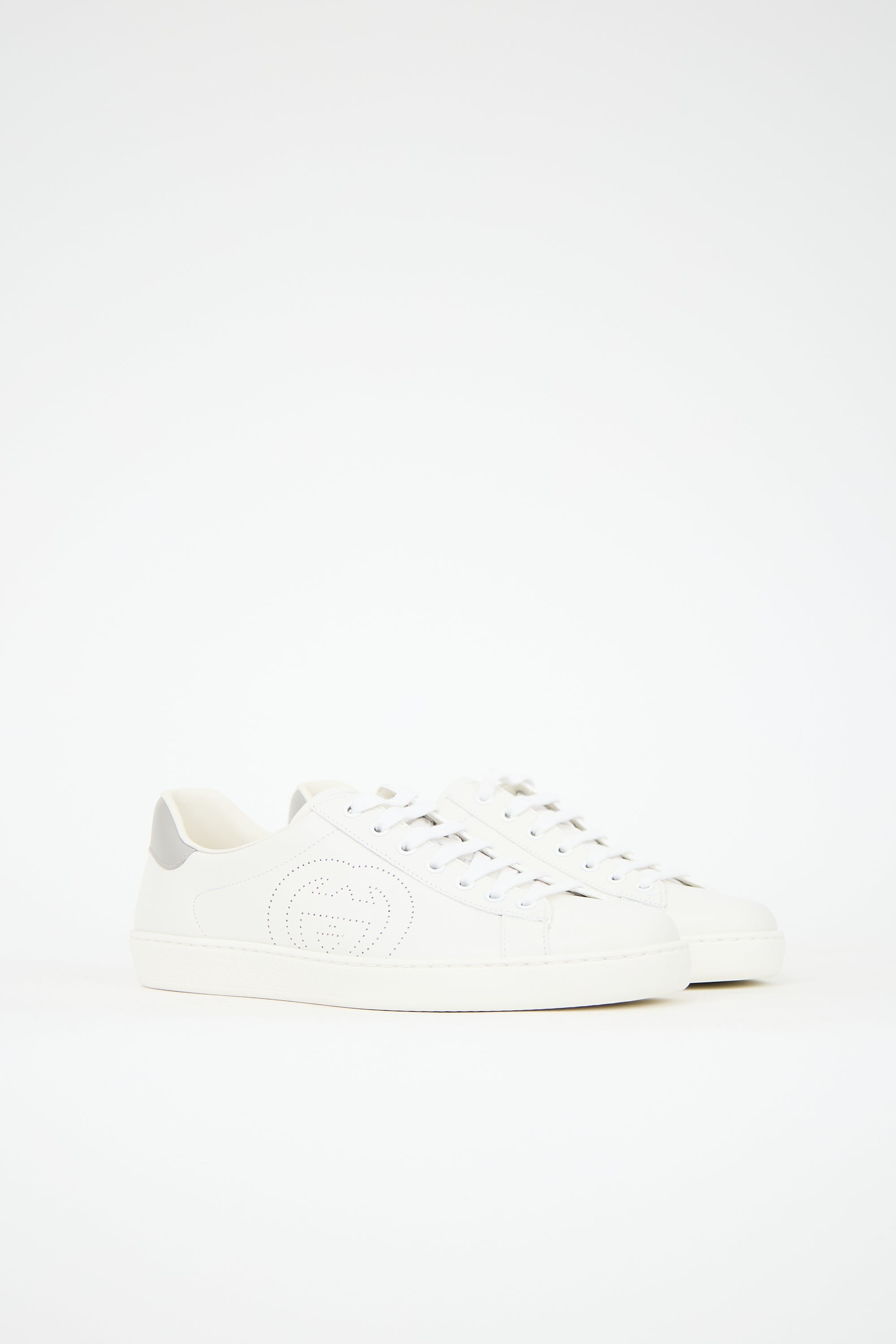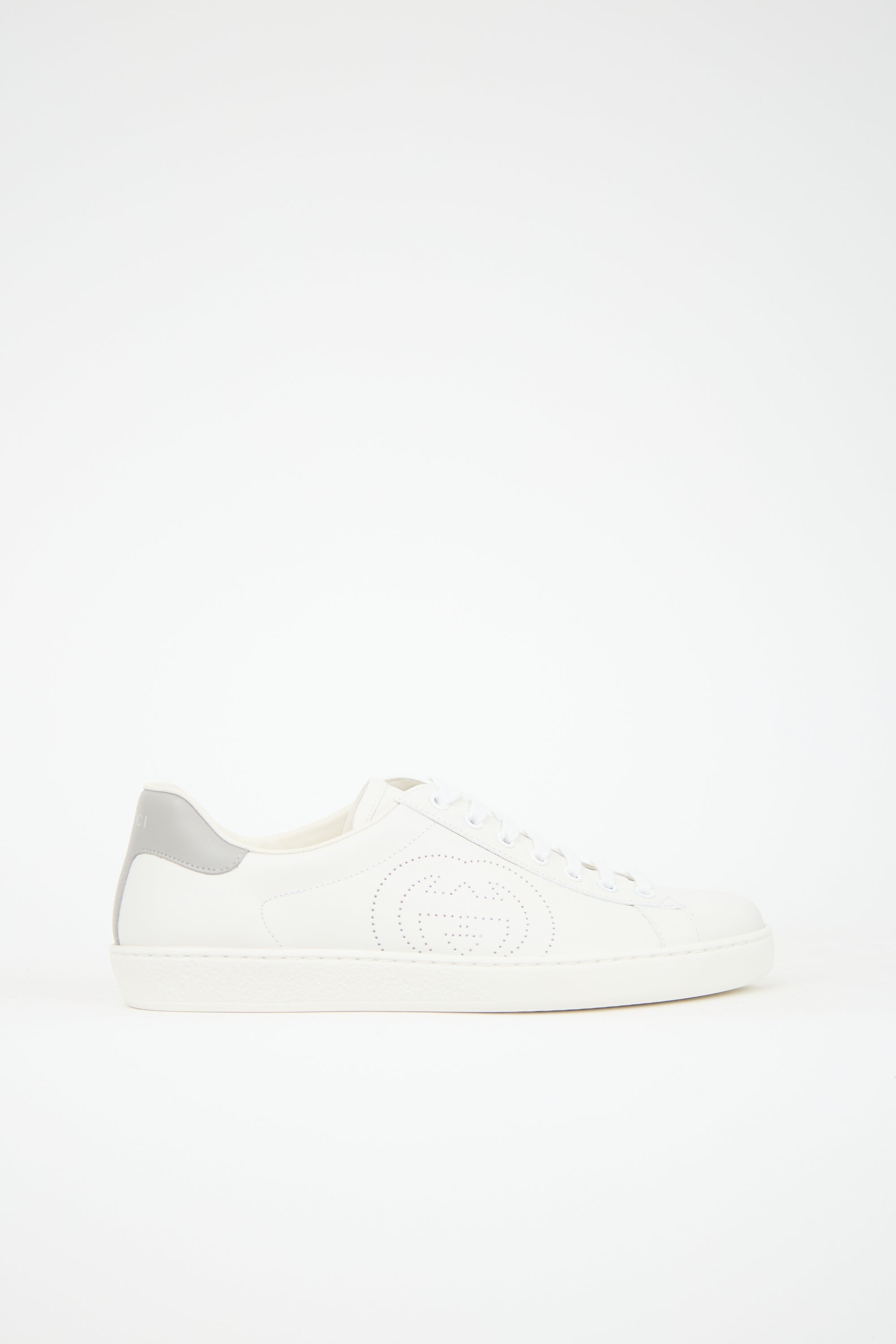 Pre-owned Gucci white leather Ace sneakers featuring a rounded toe, perforated interlocking GG logo at outer side, lace up front, grey panel with printed logo at counter, and slip on entry. Includes original dust bag and box.