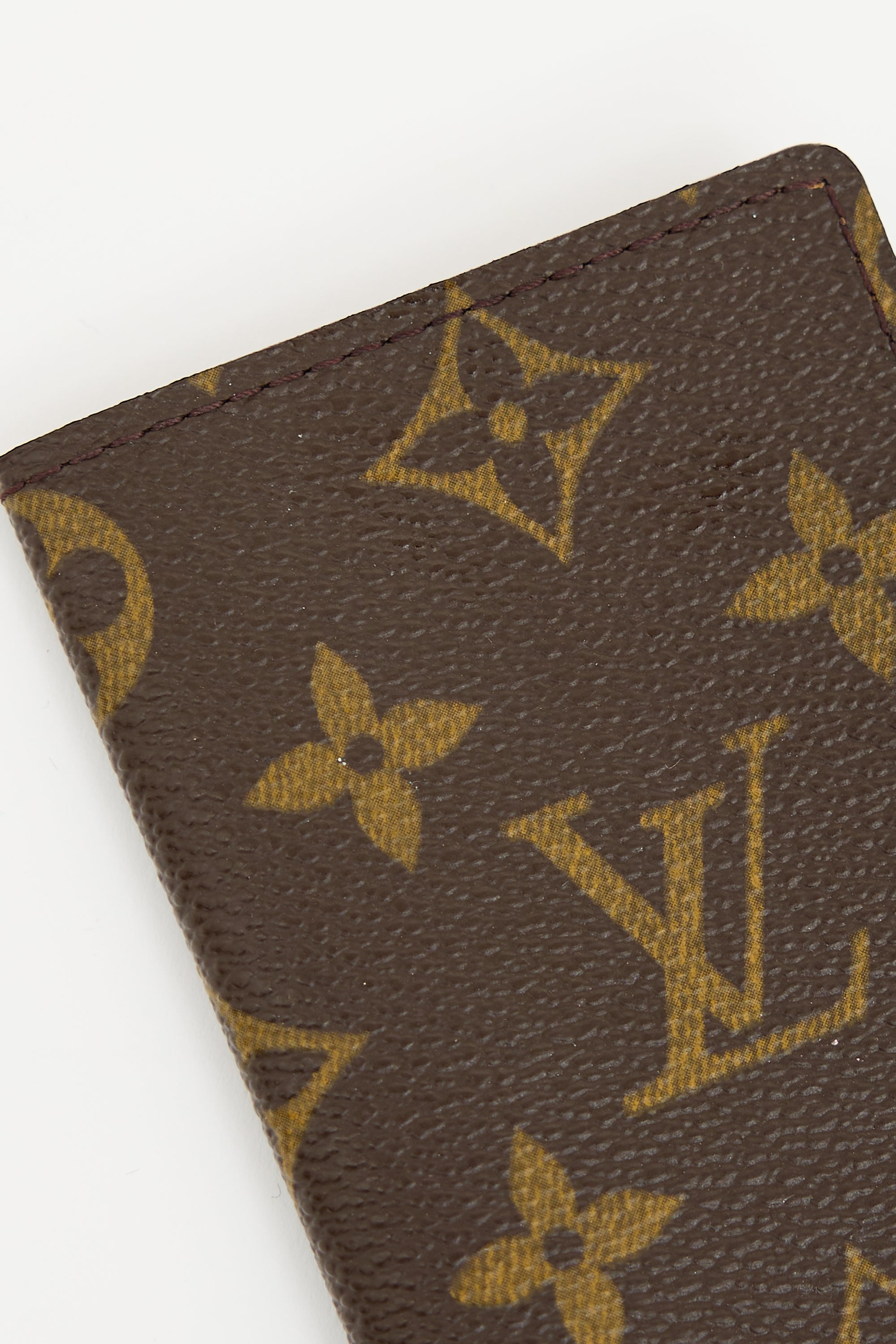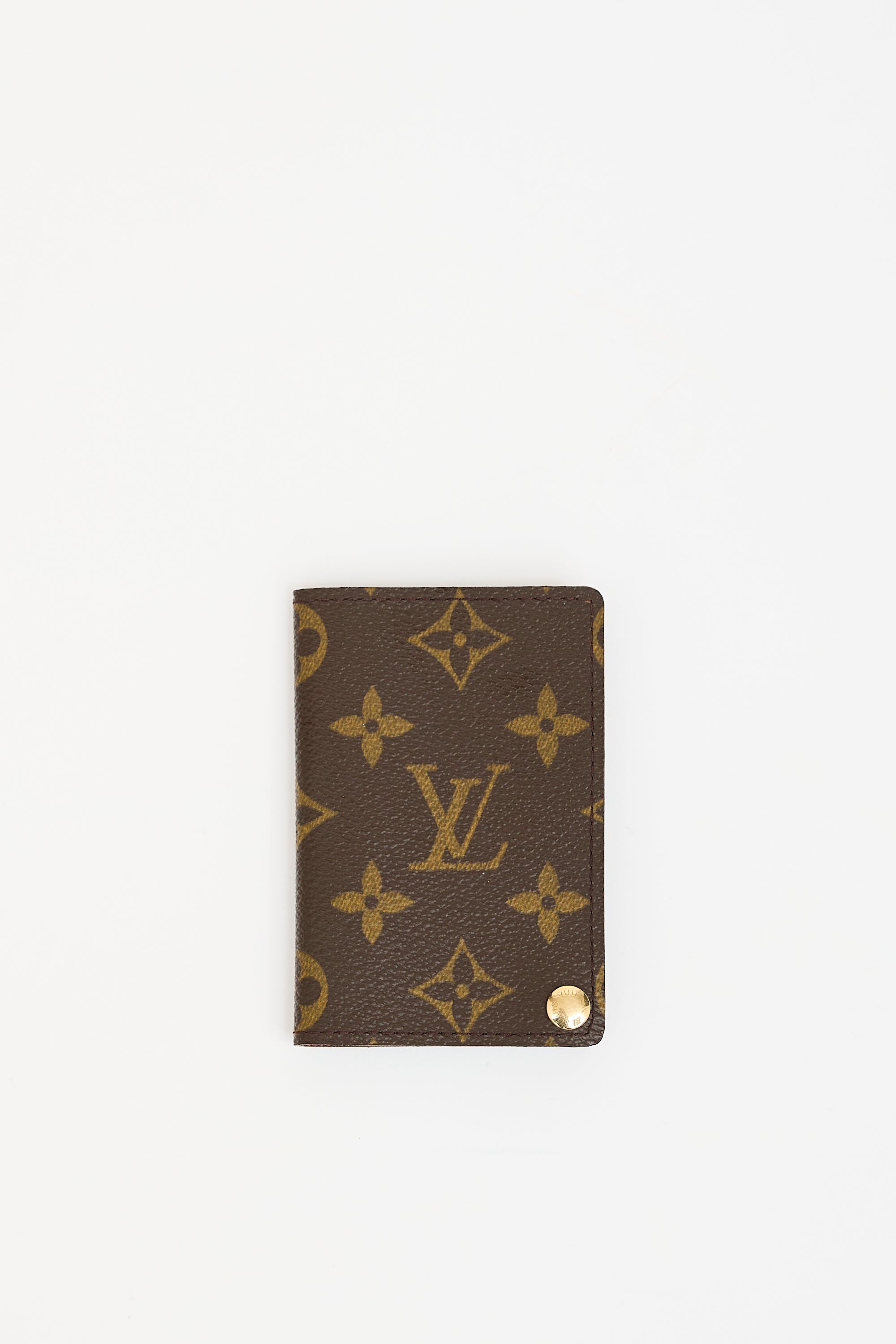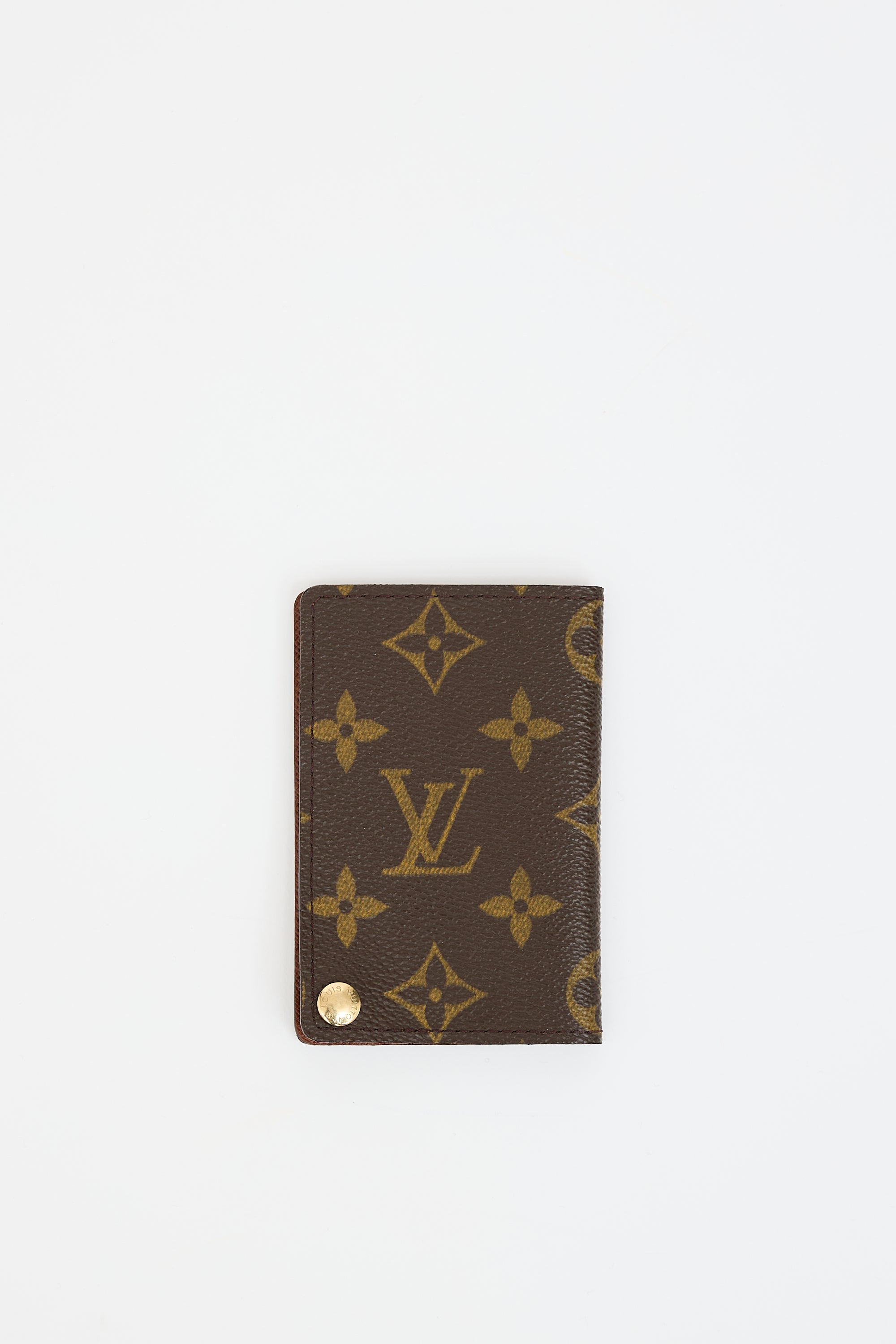 Pre-owned Louis Vuitton brown card holder featuring monogram coated canvas, gold tone hardware, snap button closure, bifold opening, and one plastic card slot.