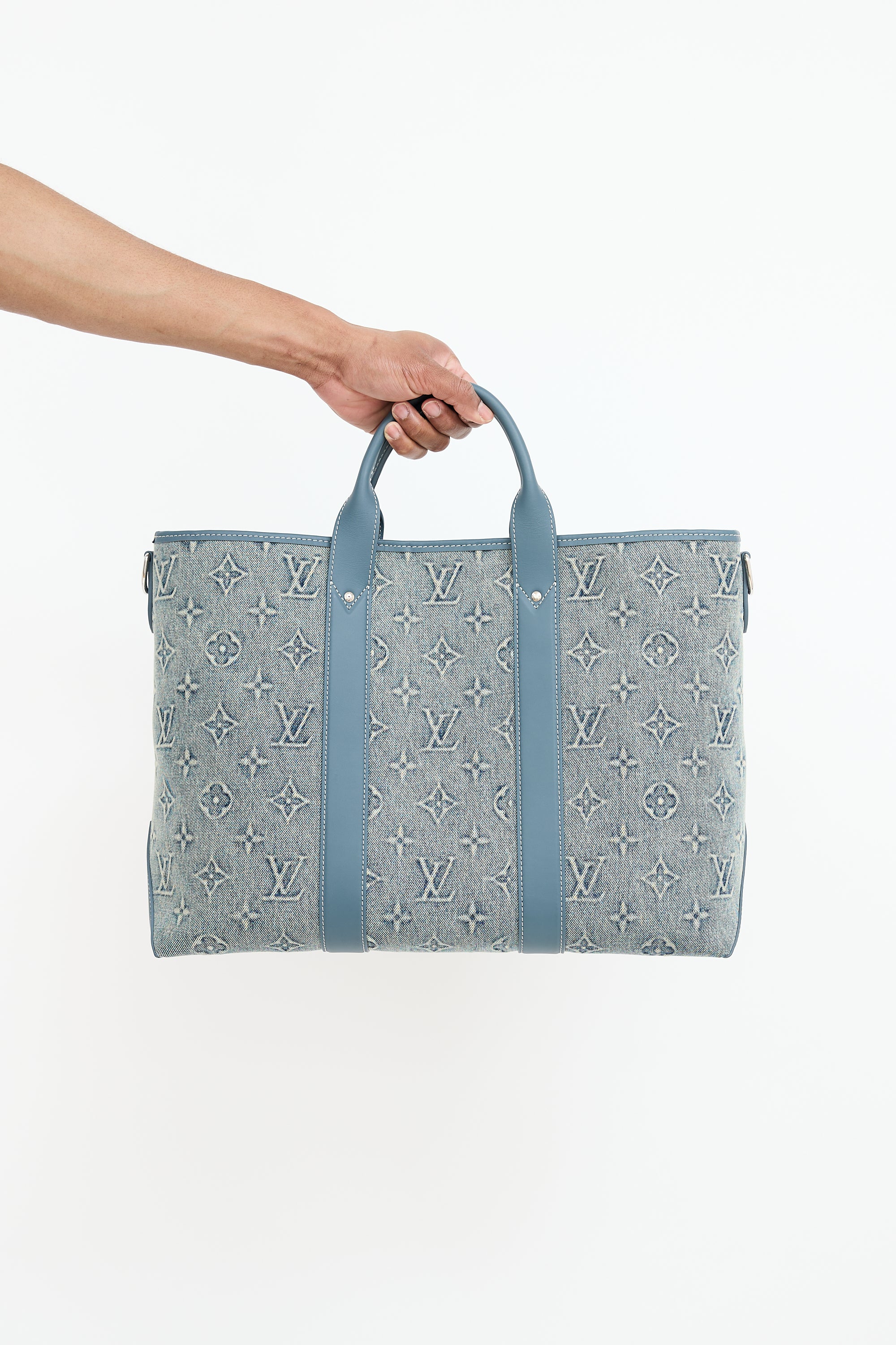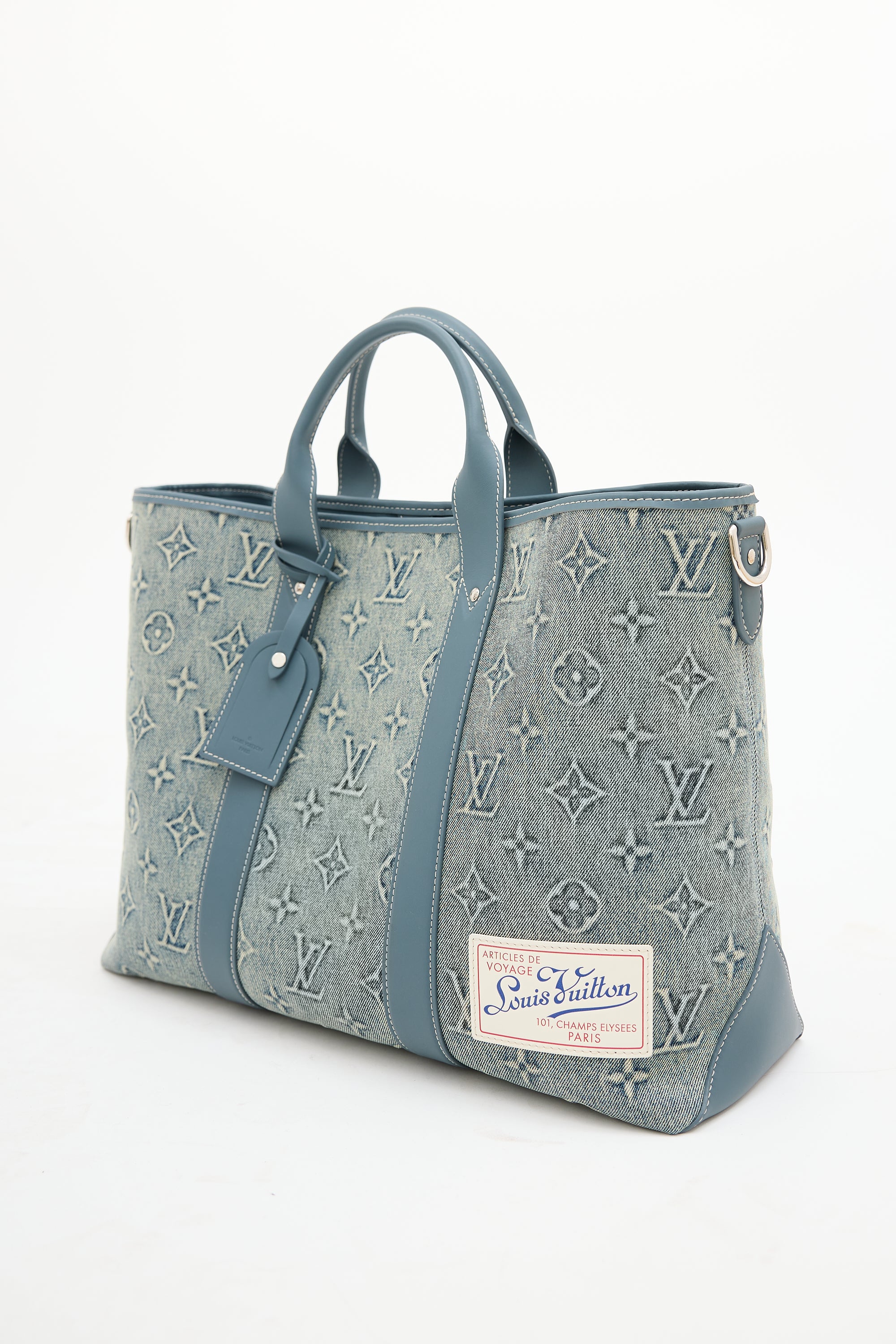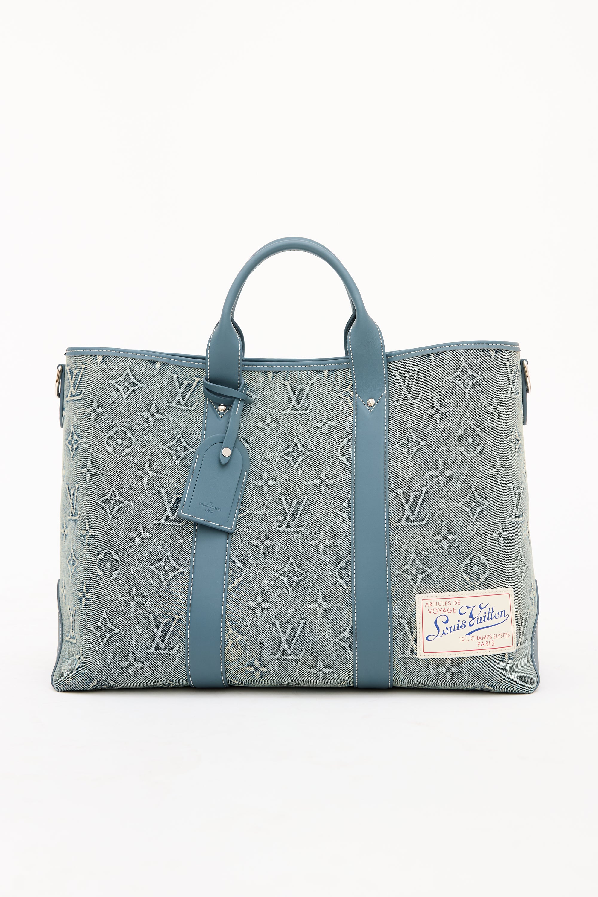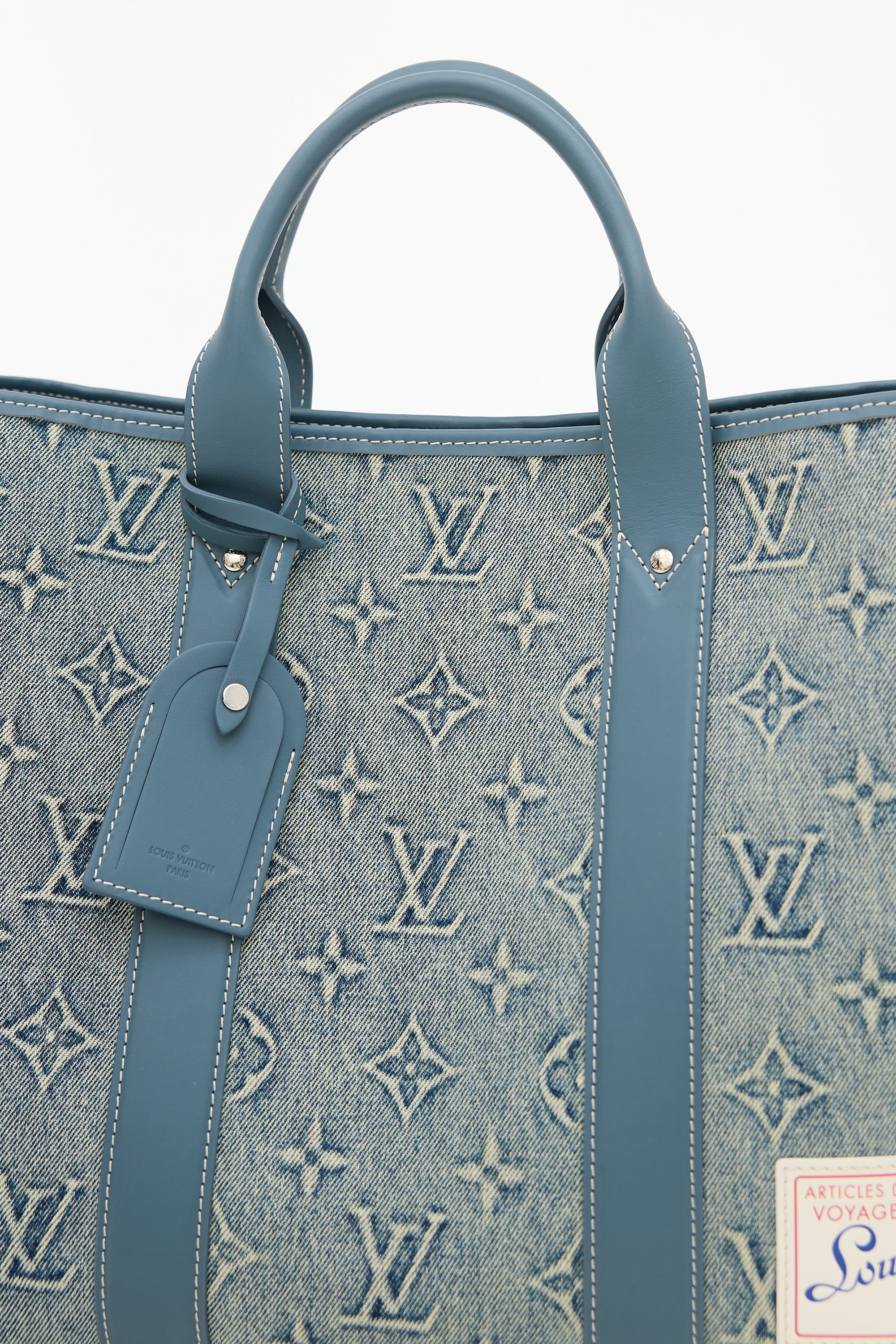 Pre-owned Louis Vuitton blue Weekend Tote NM bag featuring washed denim monogram body, blue Vachetta leather trim, white top leather logo patch at front right corner, dual rolled top handles, removable luggage tag charm, removable and adjustable beige shoulder strap with jacquard logo, clasp top closure, and one lined main compartment with one zip pocket and two slip pockets. Comes with original dust bag.