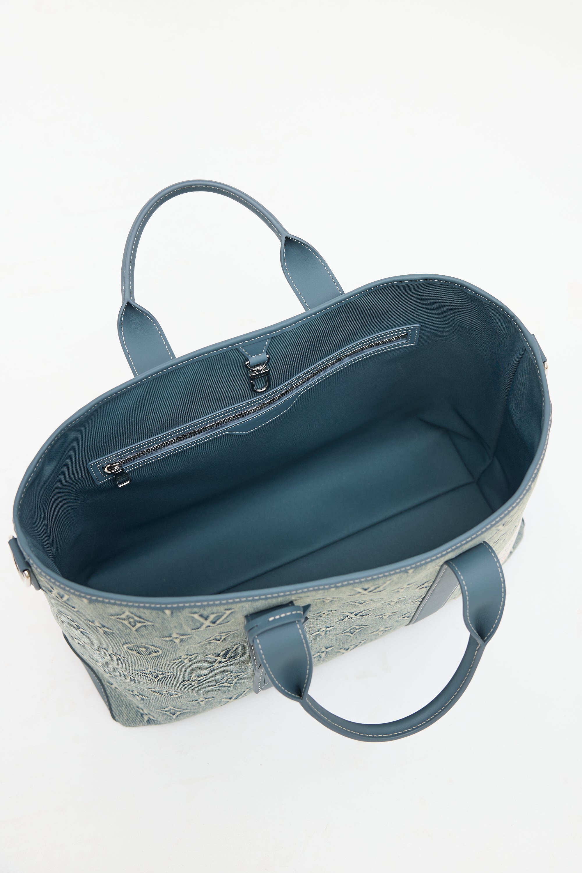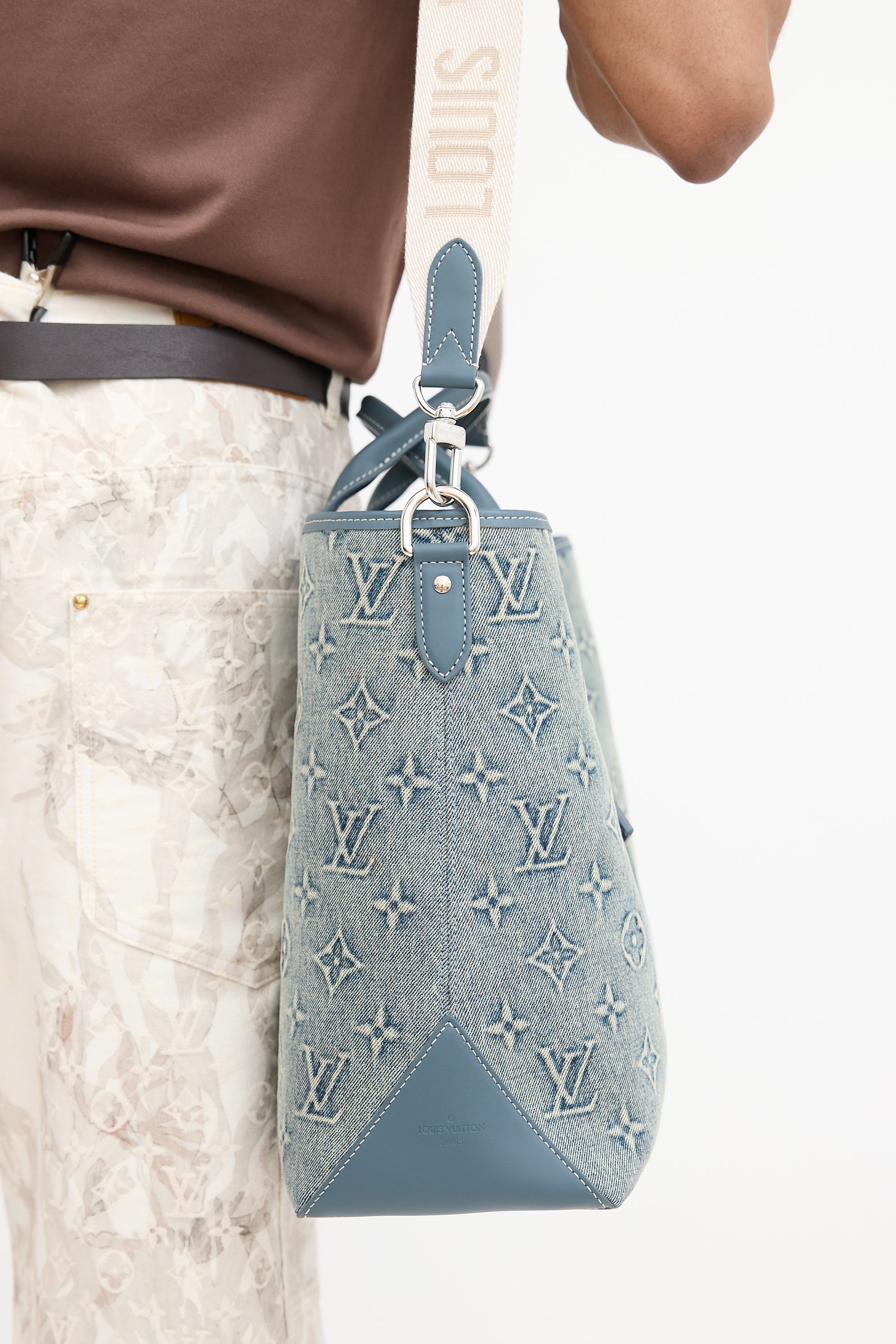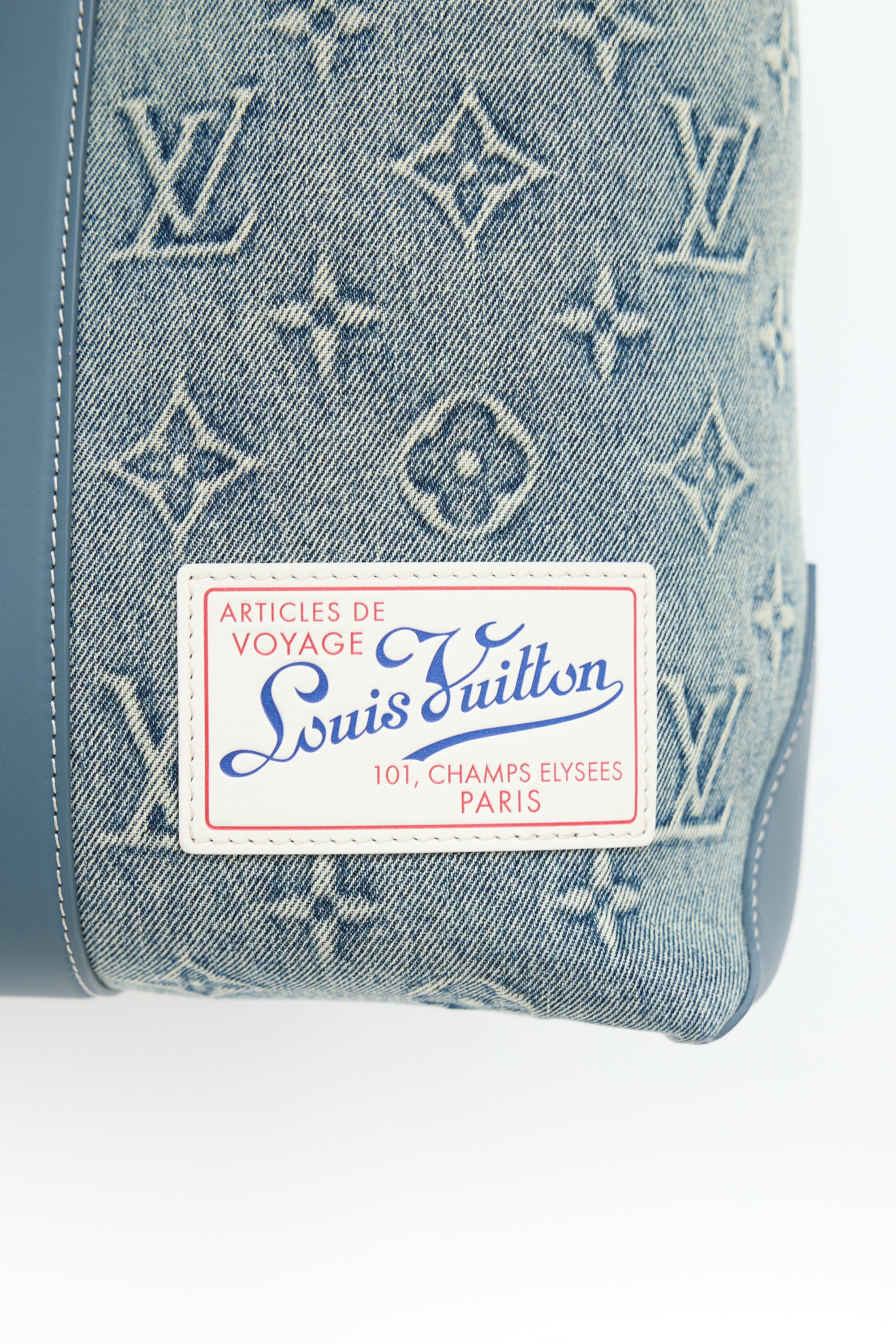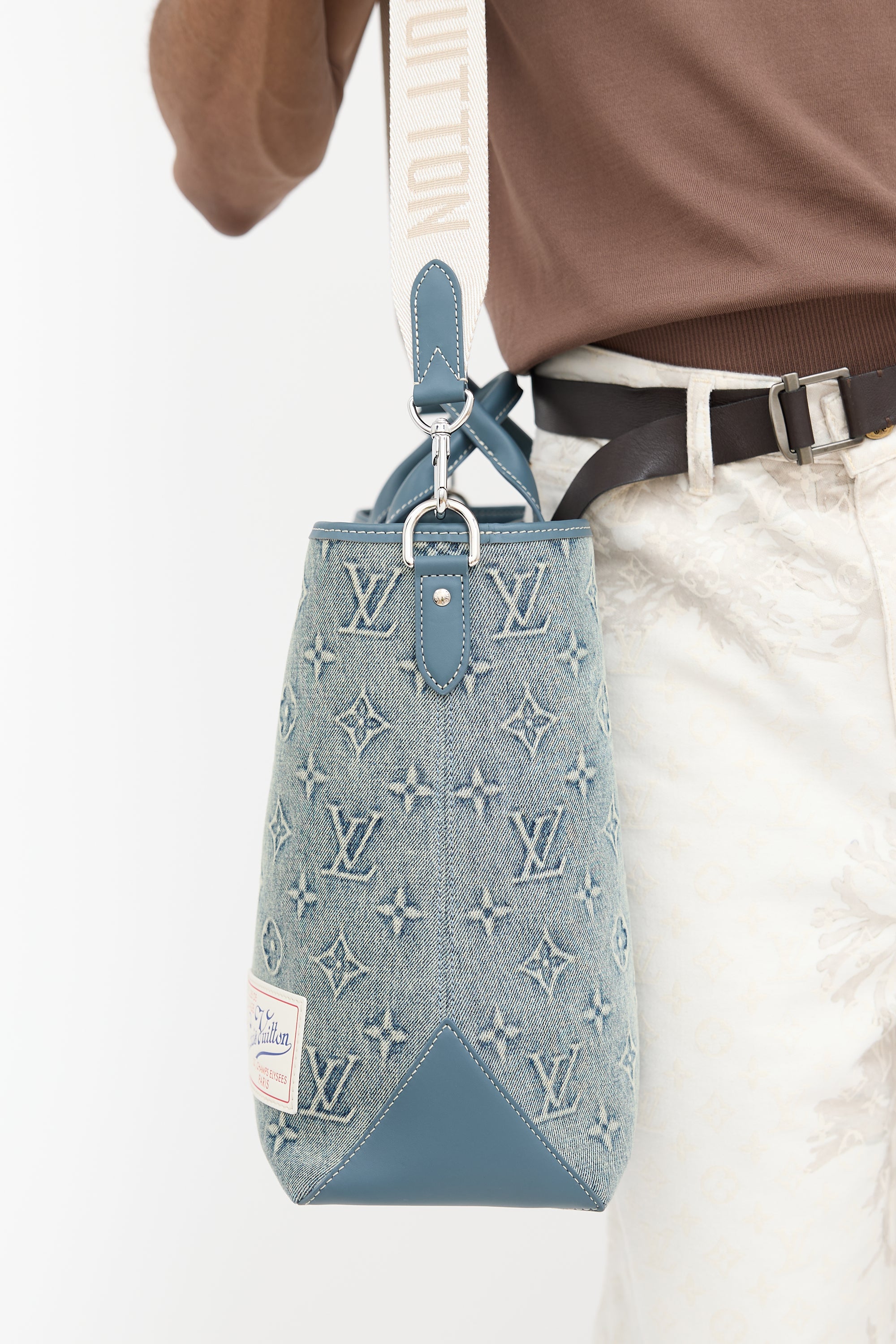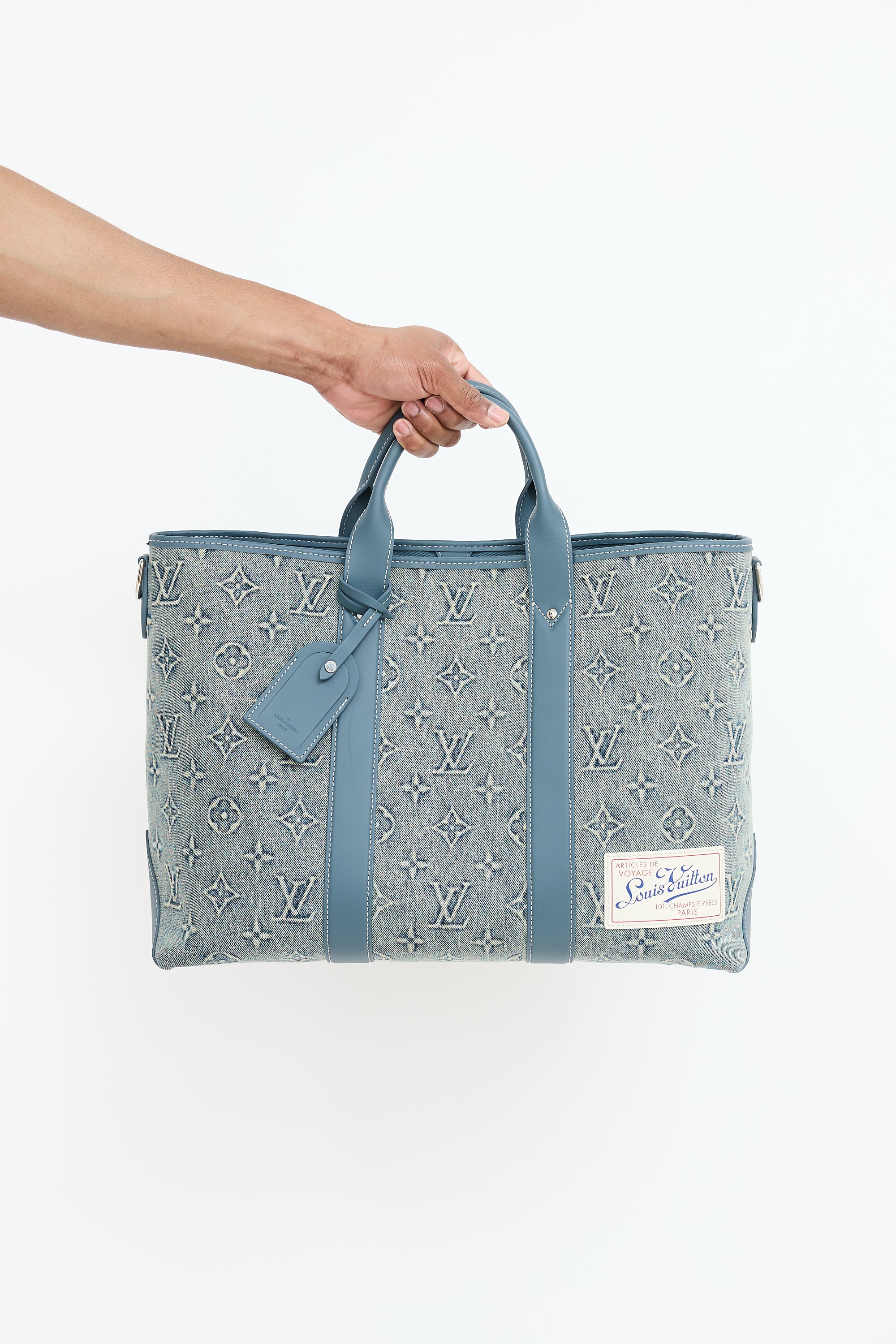 Pre-owned Louis Vuitton blue Weekend Tote NM bag featuring washed denim monogram body, blue Vachetta leather trim, white top leather logo patch at front right corner, dual rolled top handles, removable luggage tag charm, removable and adjustable beige shoulder strap with jacquard logo, clasp top closure, and one lined main compartment with one zip pocket and two slip pockets. Comes with original dust bag.