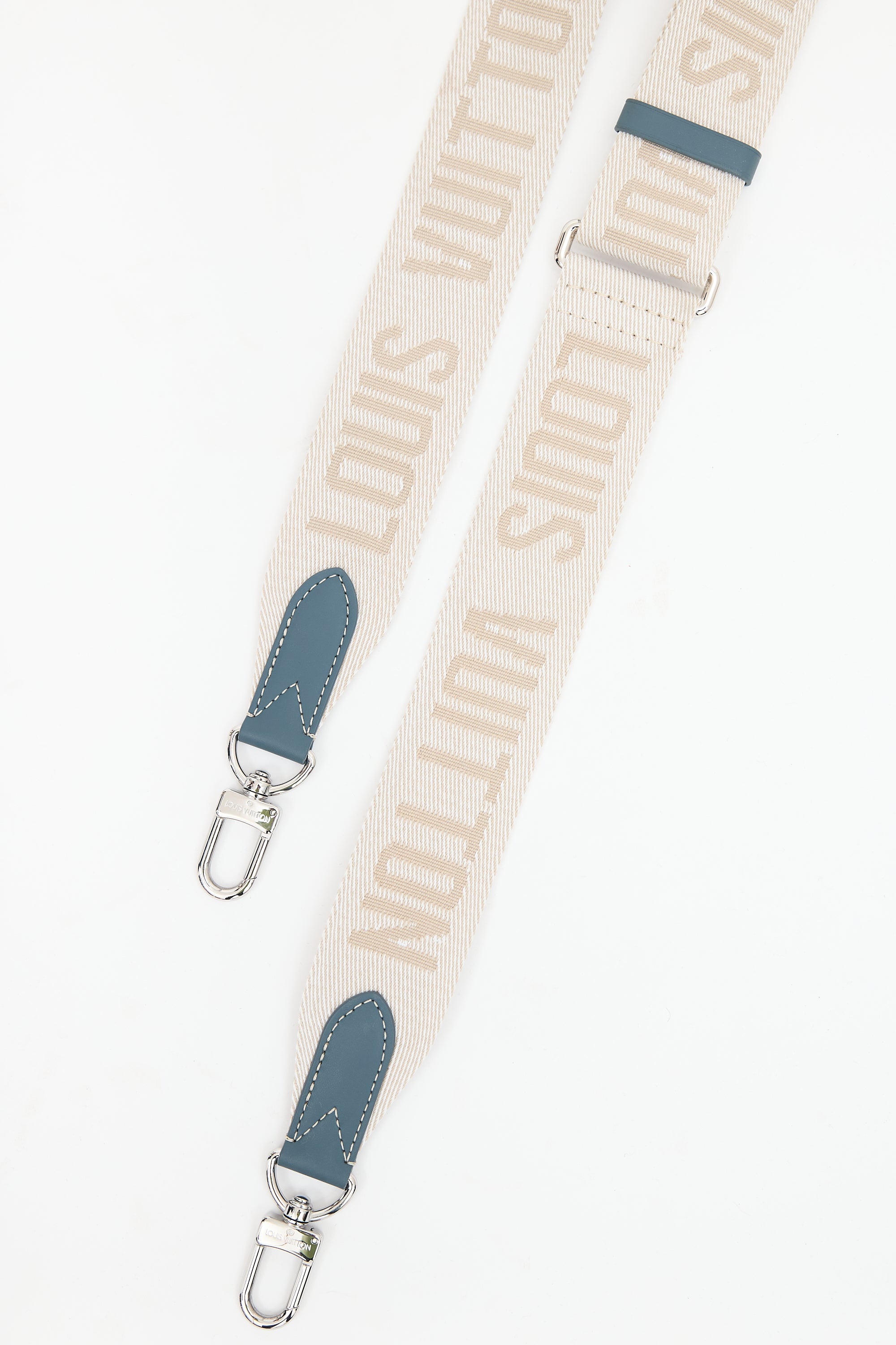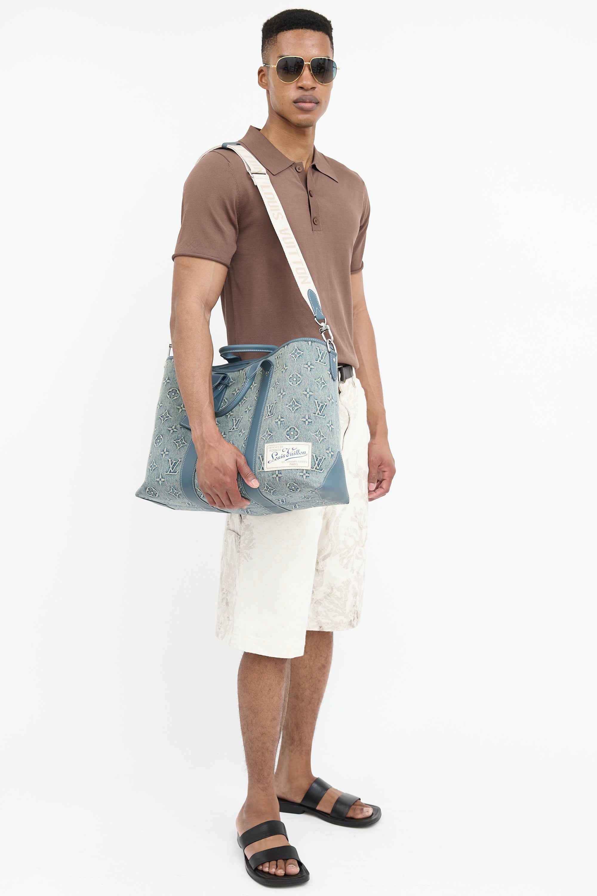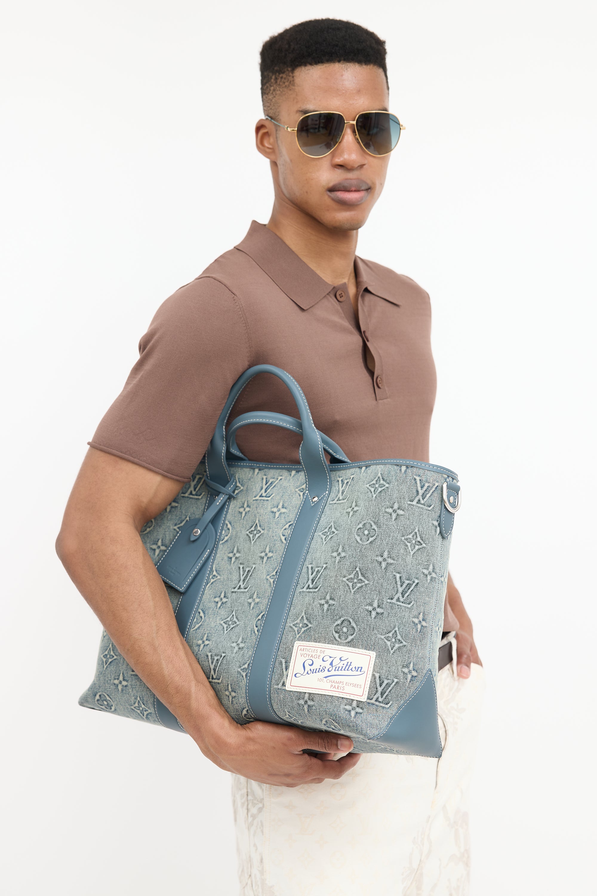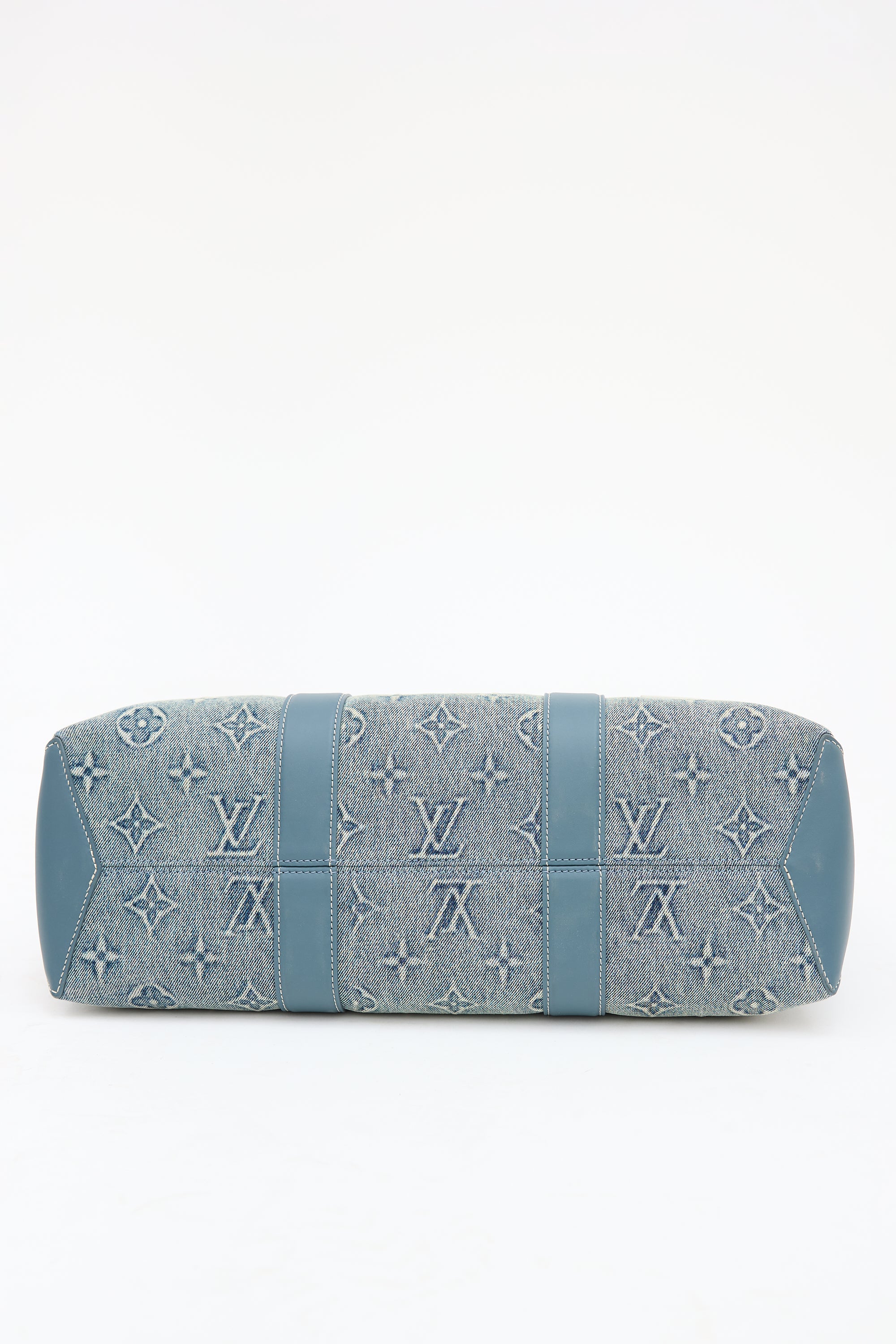 Pre-owned Louis Vuitton blue Weekend Tote NM bag featuring washed denim monogram body, blue Vachetta leather trim, white top leather logo patch at front right corner, dual rolled top handles, removable luggage tag charm, removable and adjustable beige shoulder strap with jacquard logo, clasp top closure, and one lined main compartment with one zip pocket and two slip pockets. Comes with original dust bag.