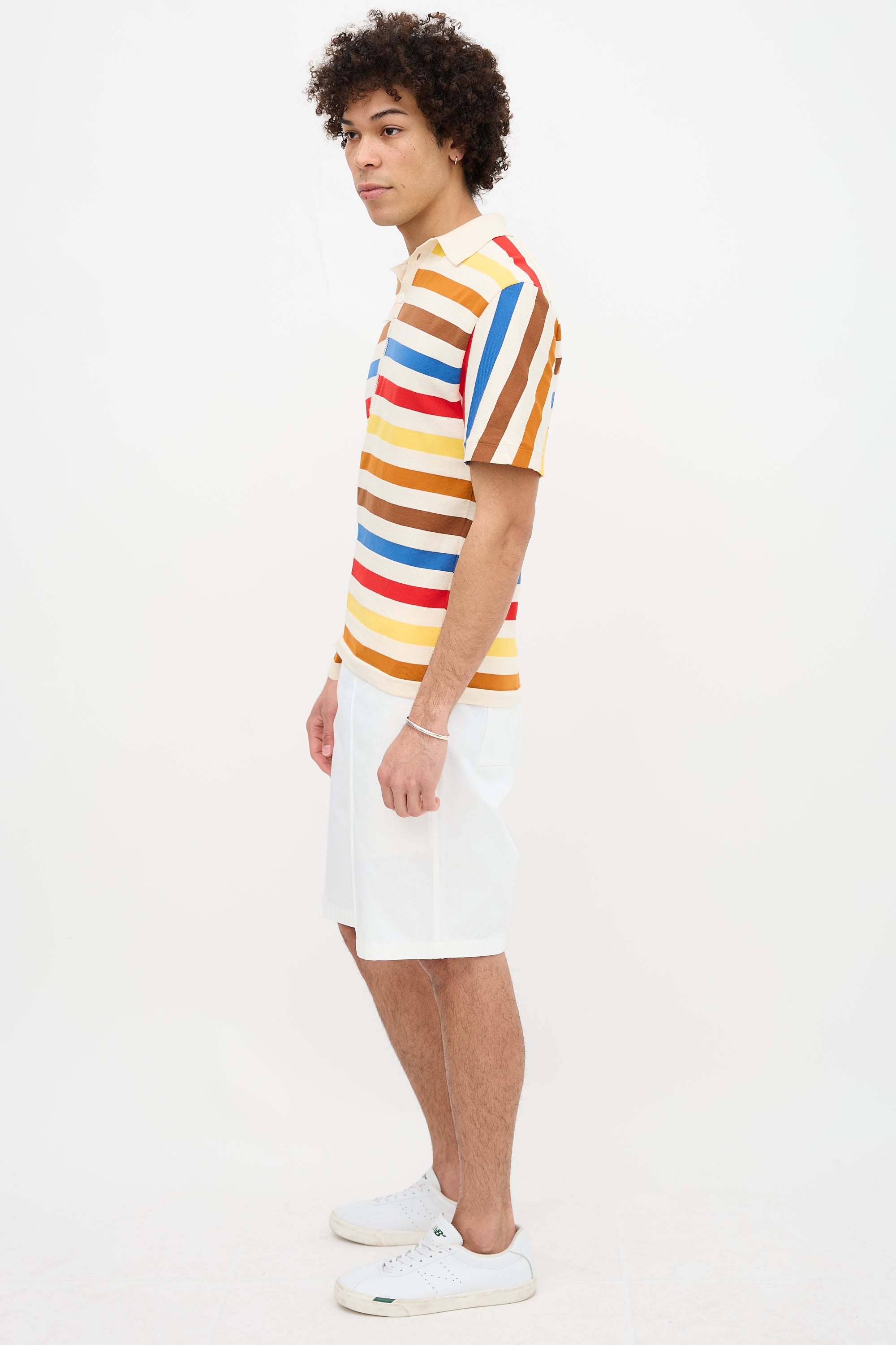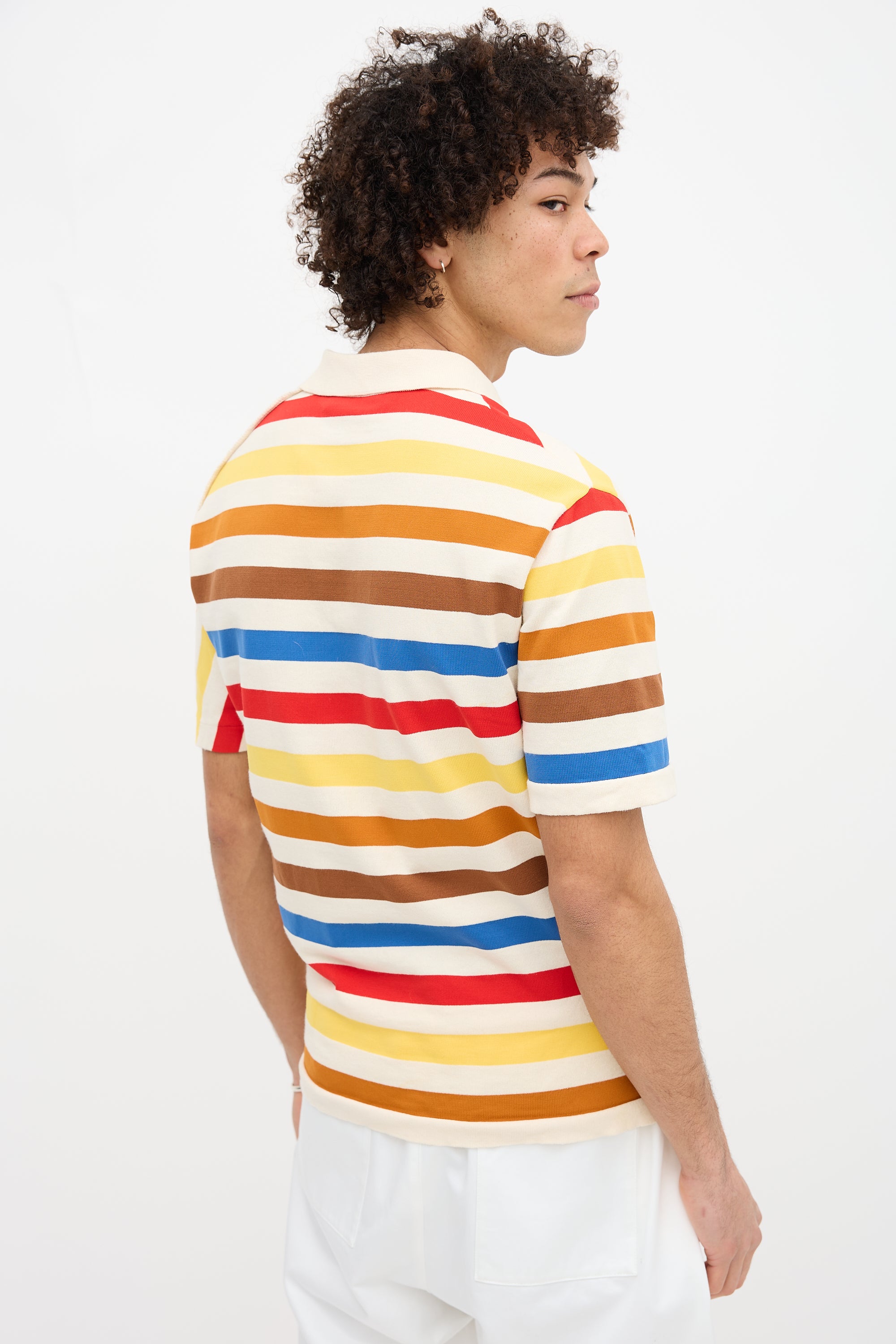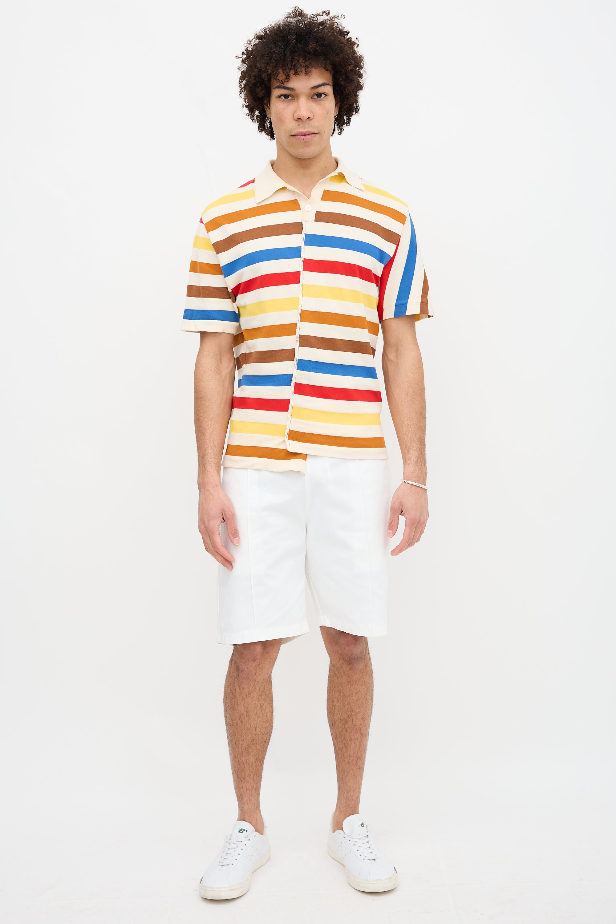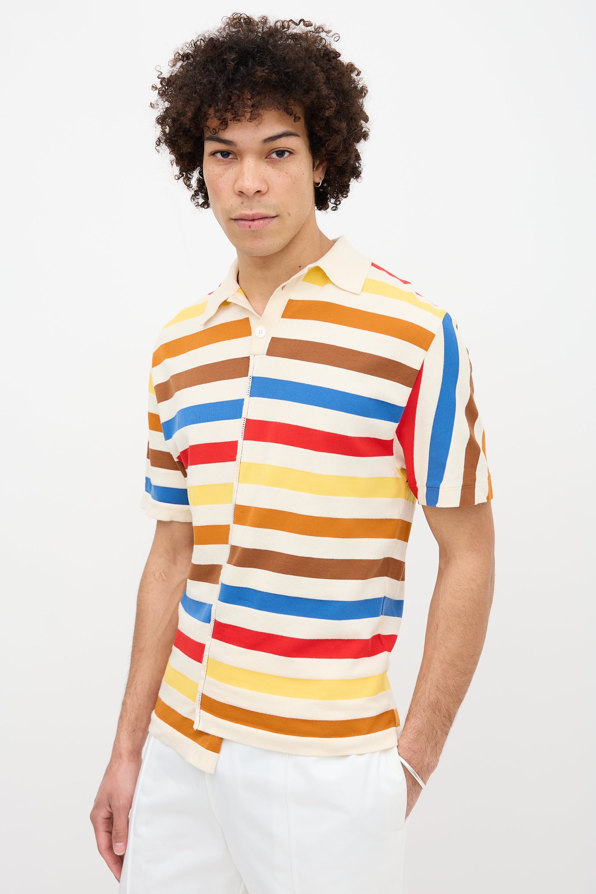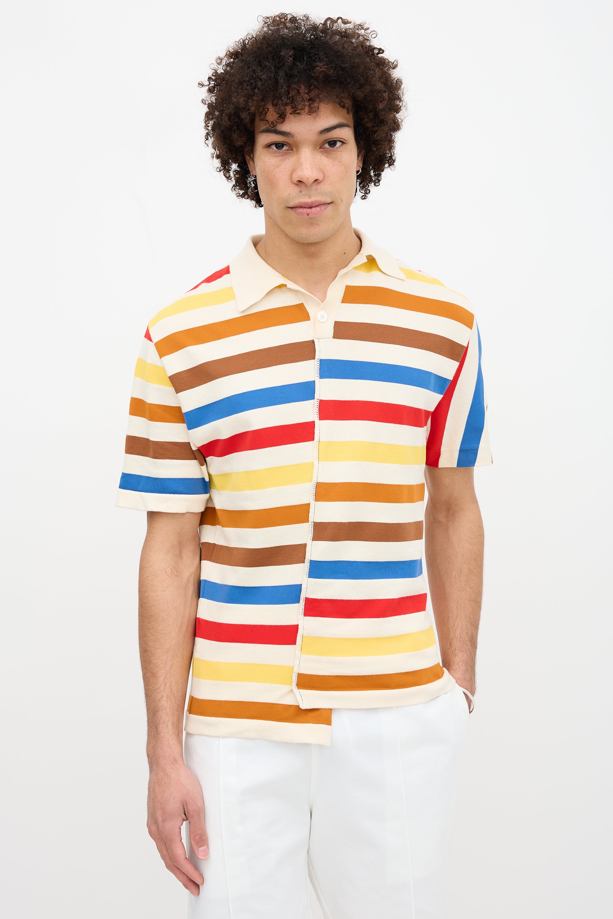 Pre-owned Marni multicolour polo featuring spread collar, quarter button front, asymmetric stripes, and decorative serged seam at front.