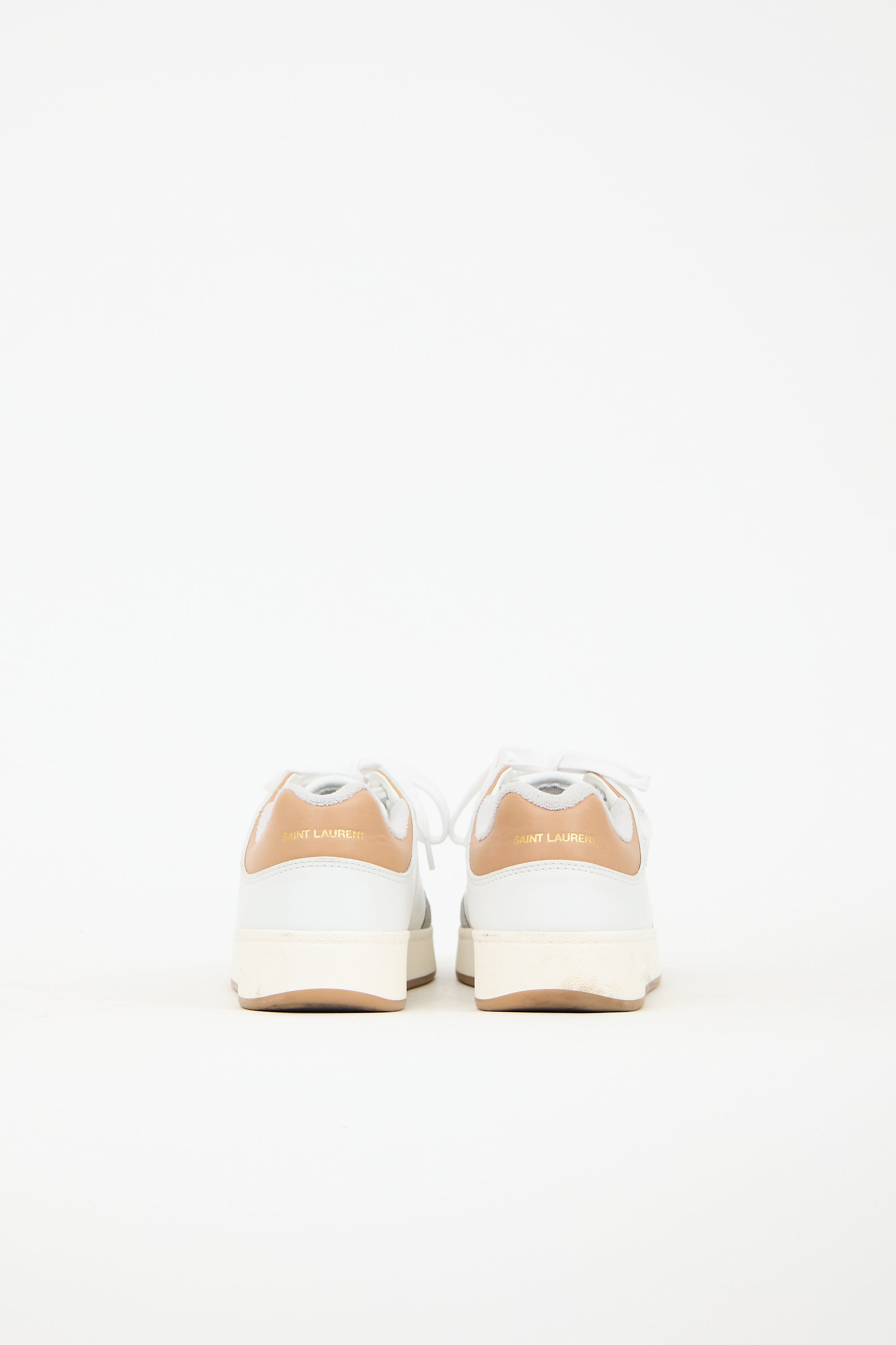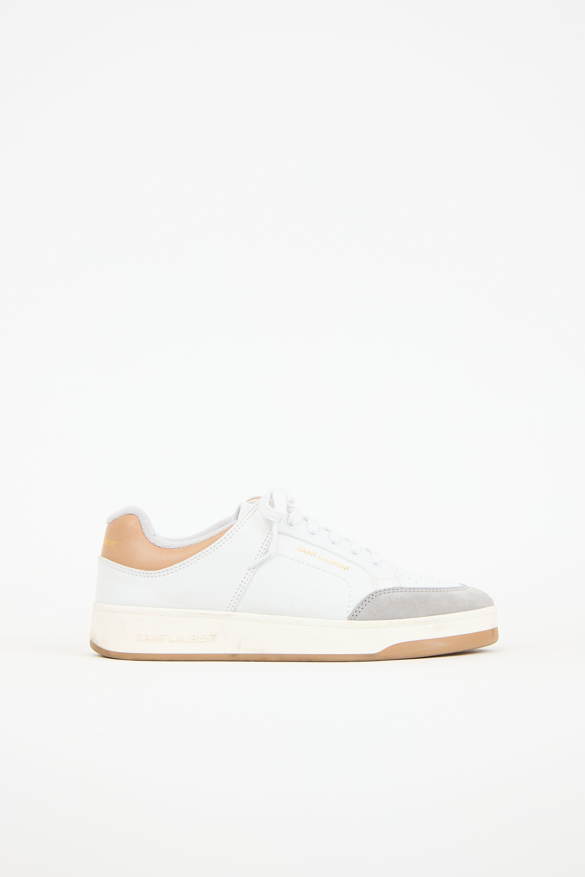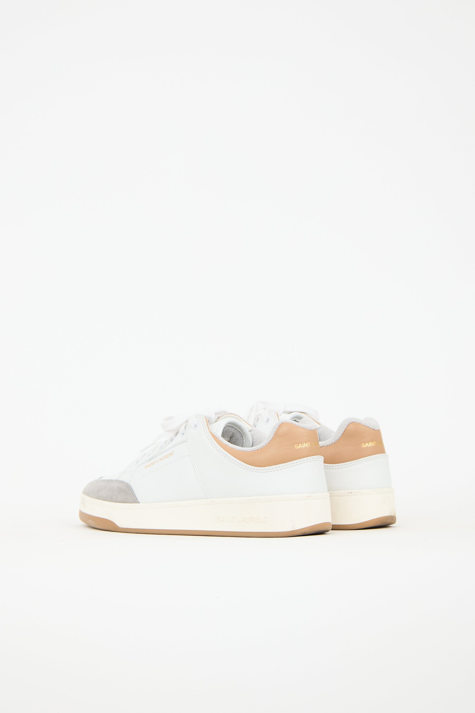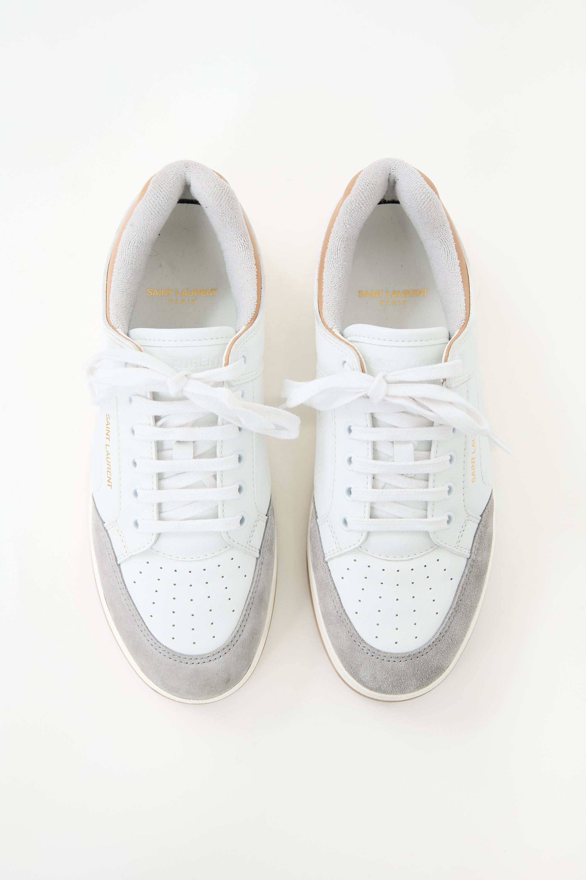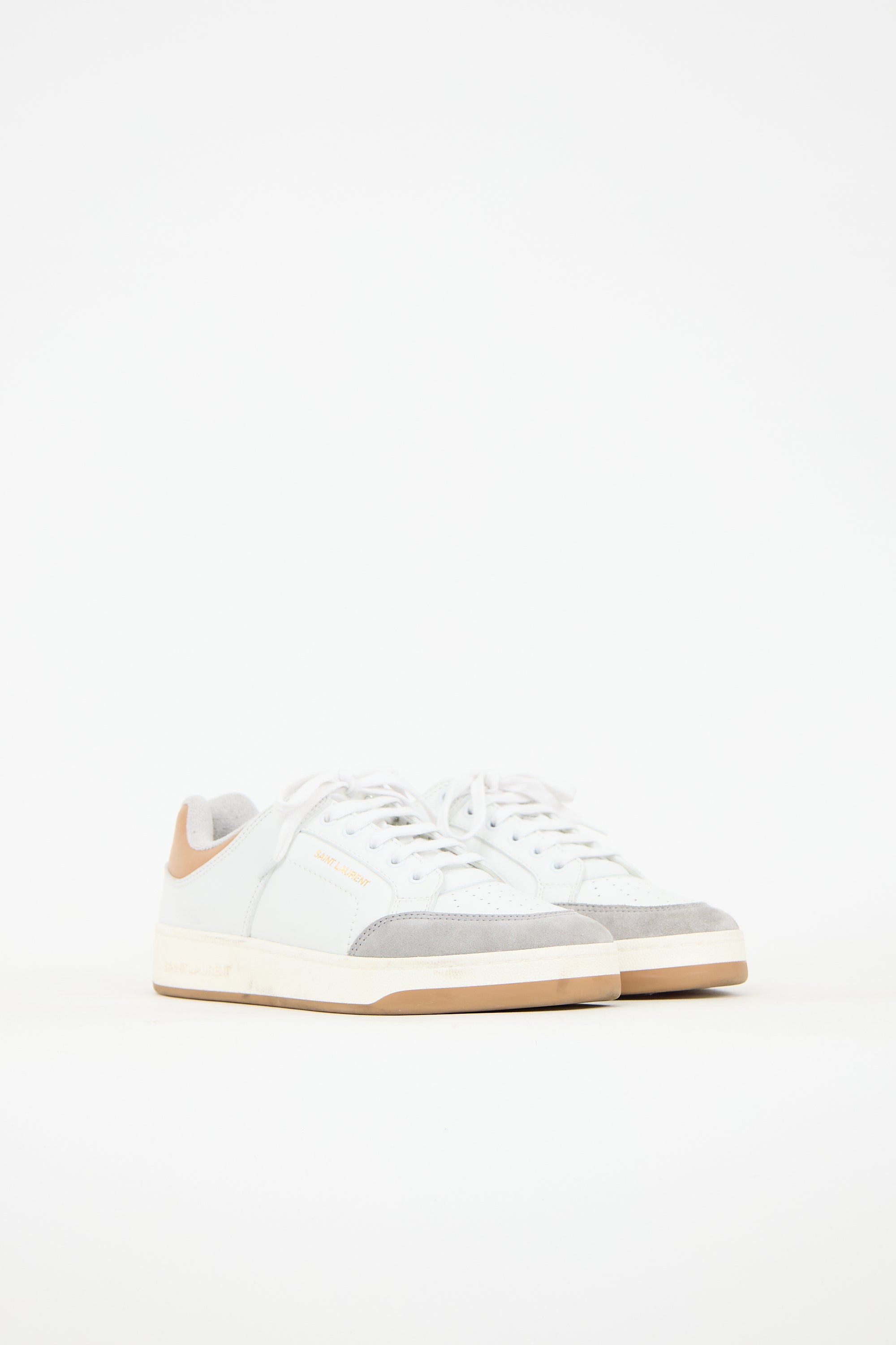 Pre-owned Saint Laurent white leather SL61 sneakers featuring grey suede rounded toe, lace up front, gold stamped logo at side and brown leather heel, and rubber outsole.