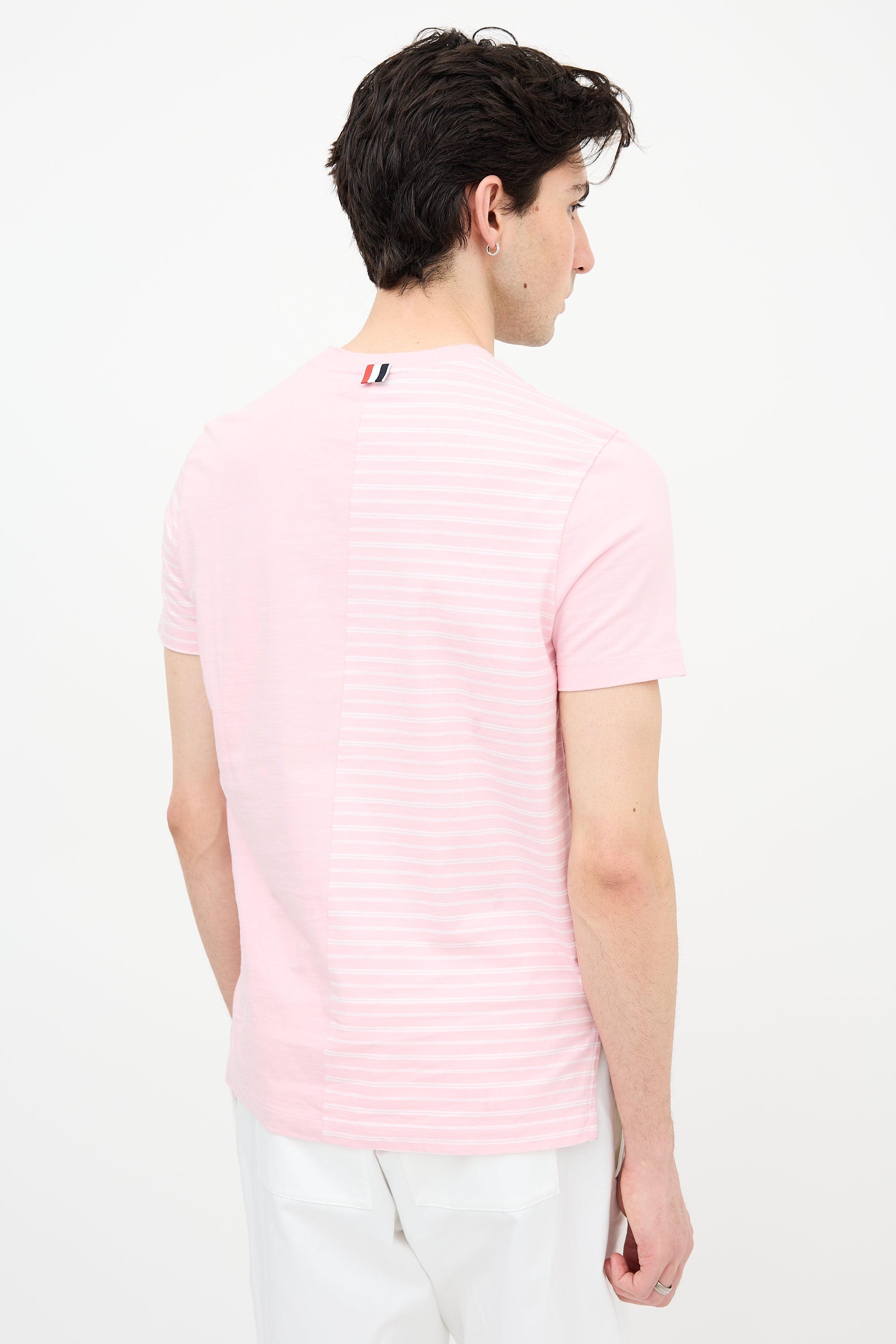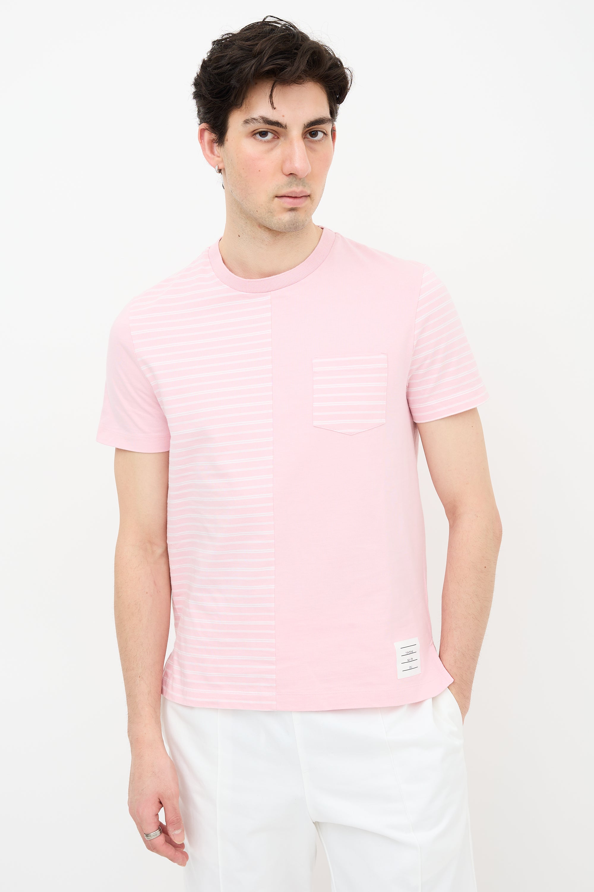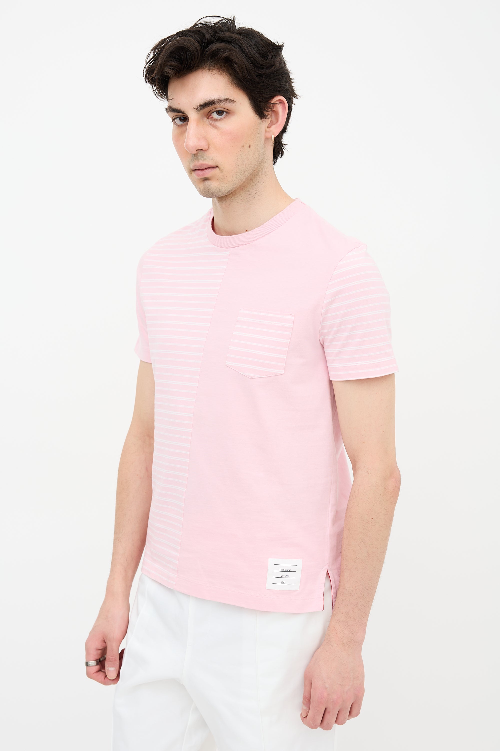Pre-owned Thom Brown pink T-shirt featuring a split design with white striped right side, signature striped logo tag at back collar, striped patch pocket at left chest, white logo patch, and a high low hem.
