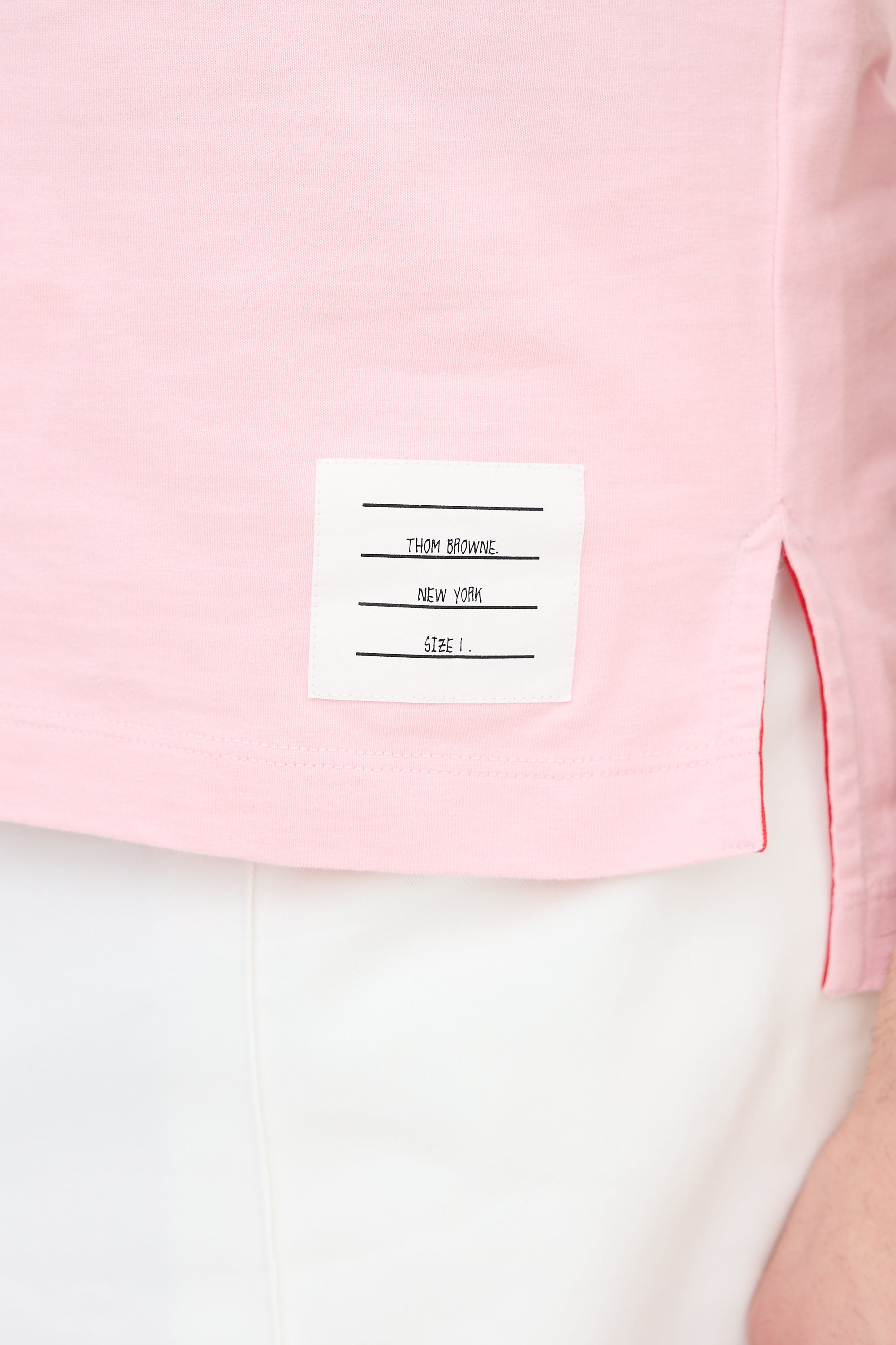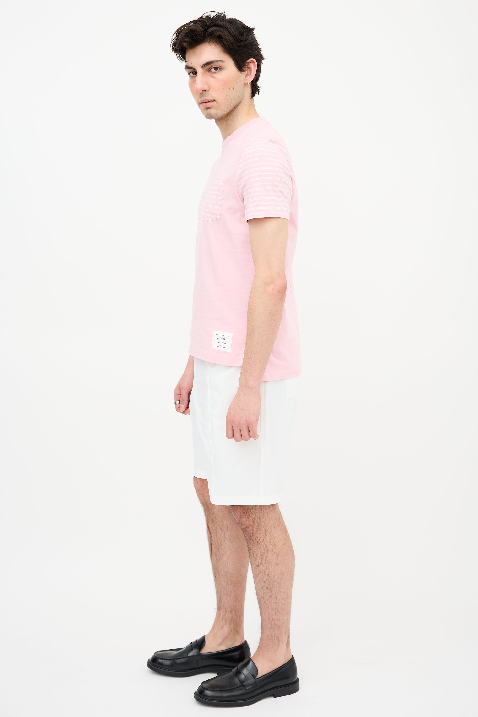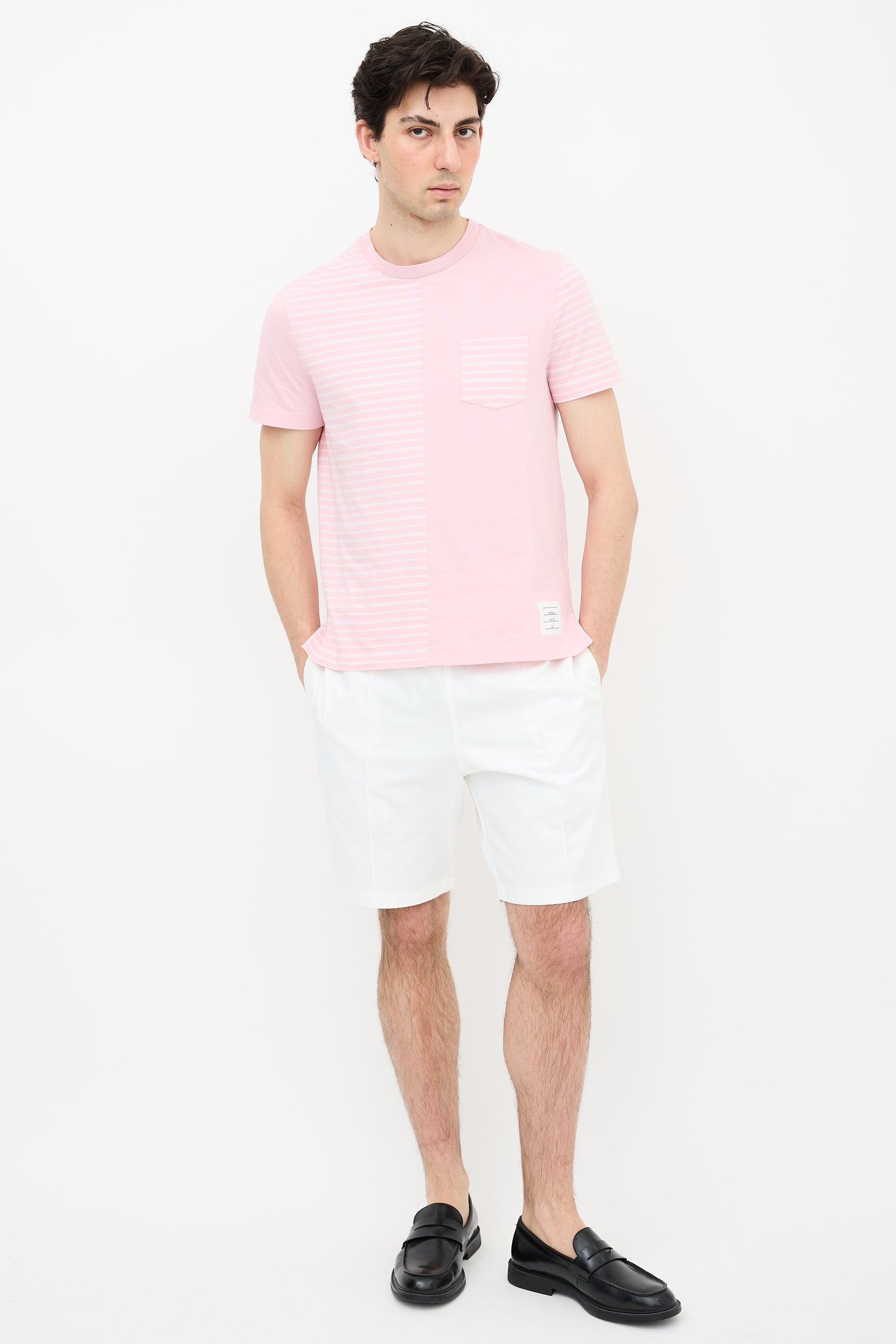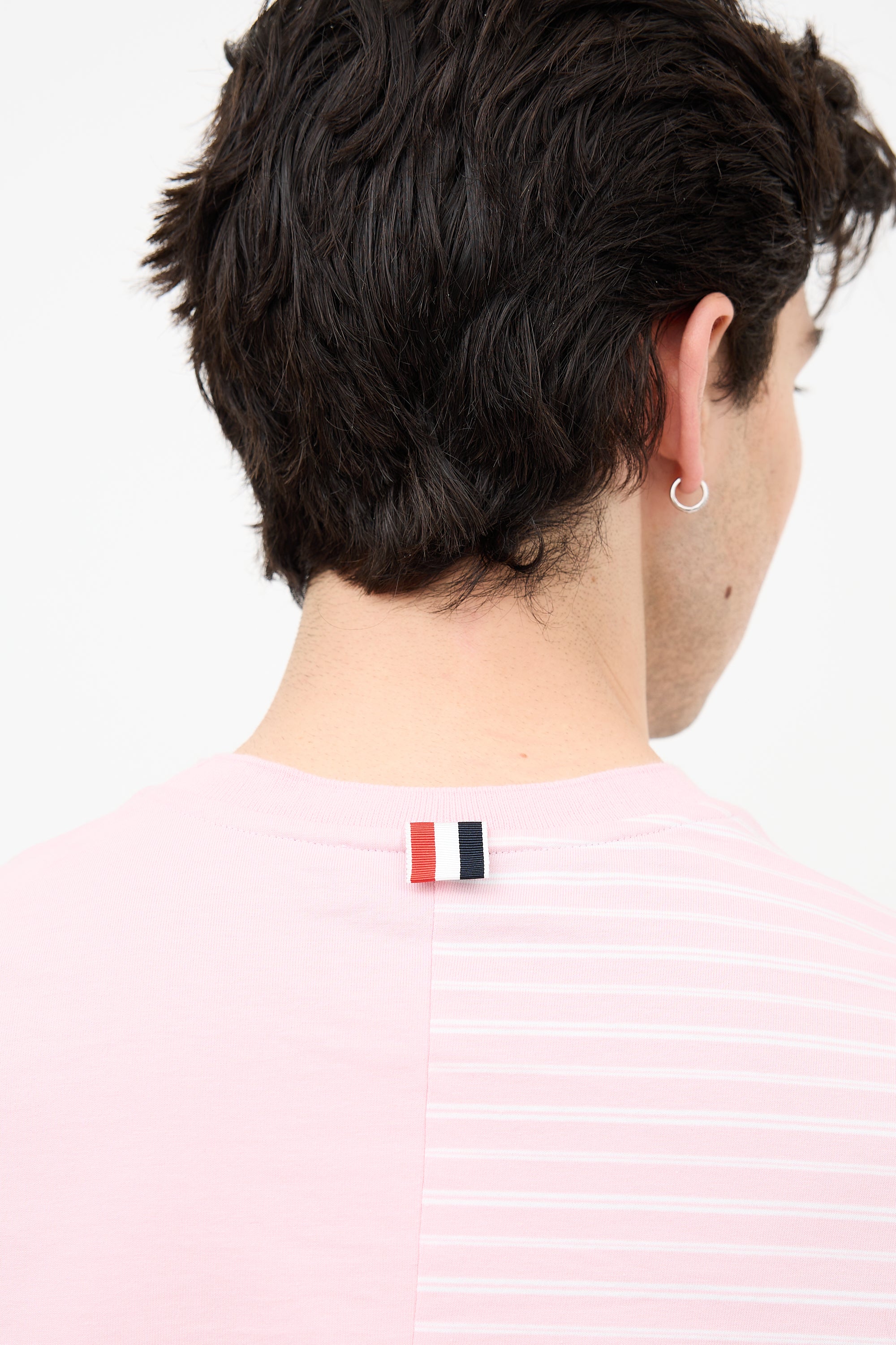 Pre-owned Thom Brown pink T-shirt featuring a split design with white striped right side, signature striped logo tag at back collar, striped patch pocket at left chest, white logo patch, and a high low hem.