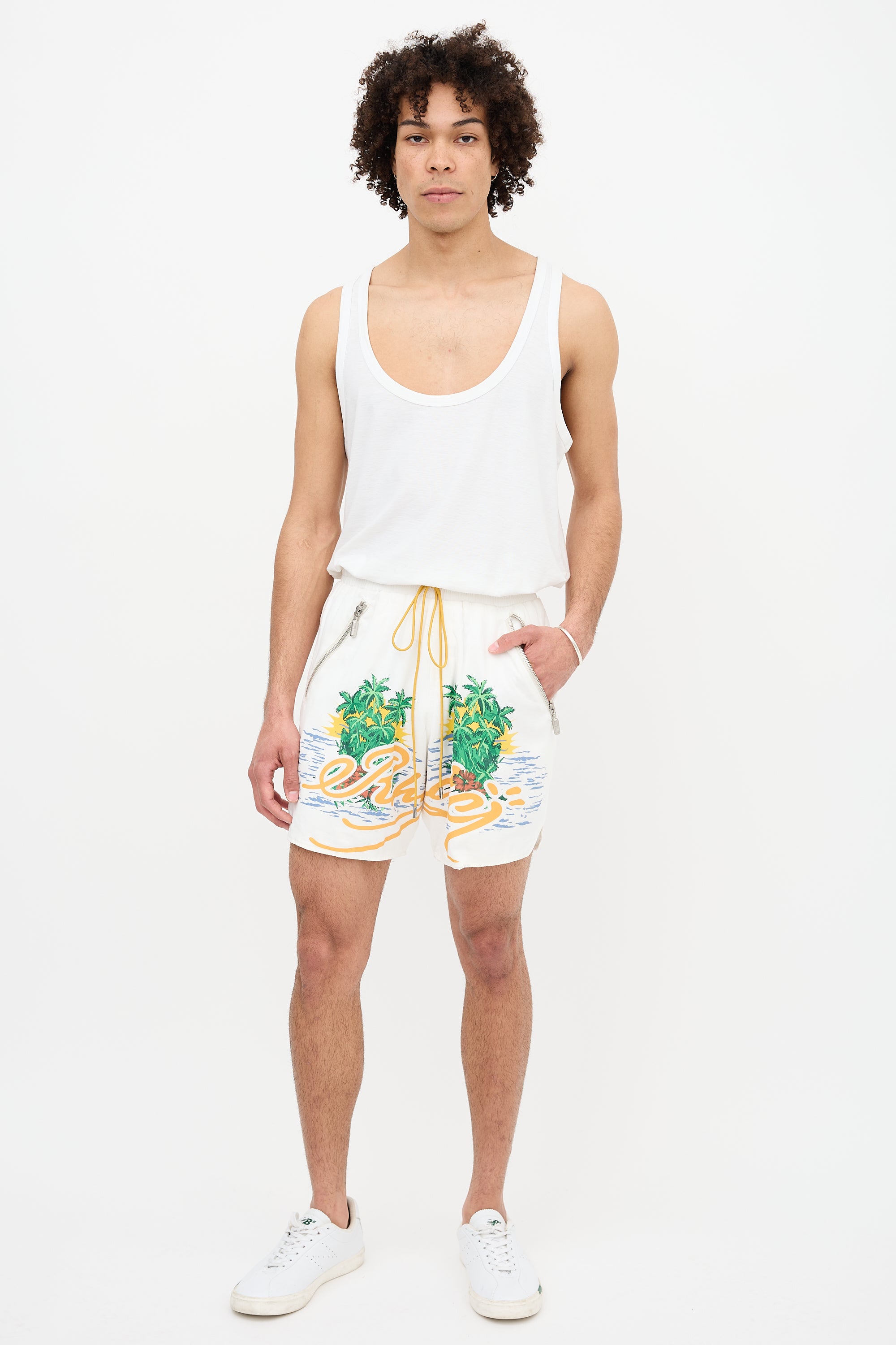 Pre-owned Rhude white canvas shorts featuring an elasticized drawstring waist, two zip pockets at waist, logo and palm tree print at front, and two flap pockets at back. Lined.