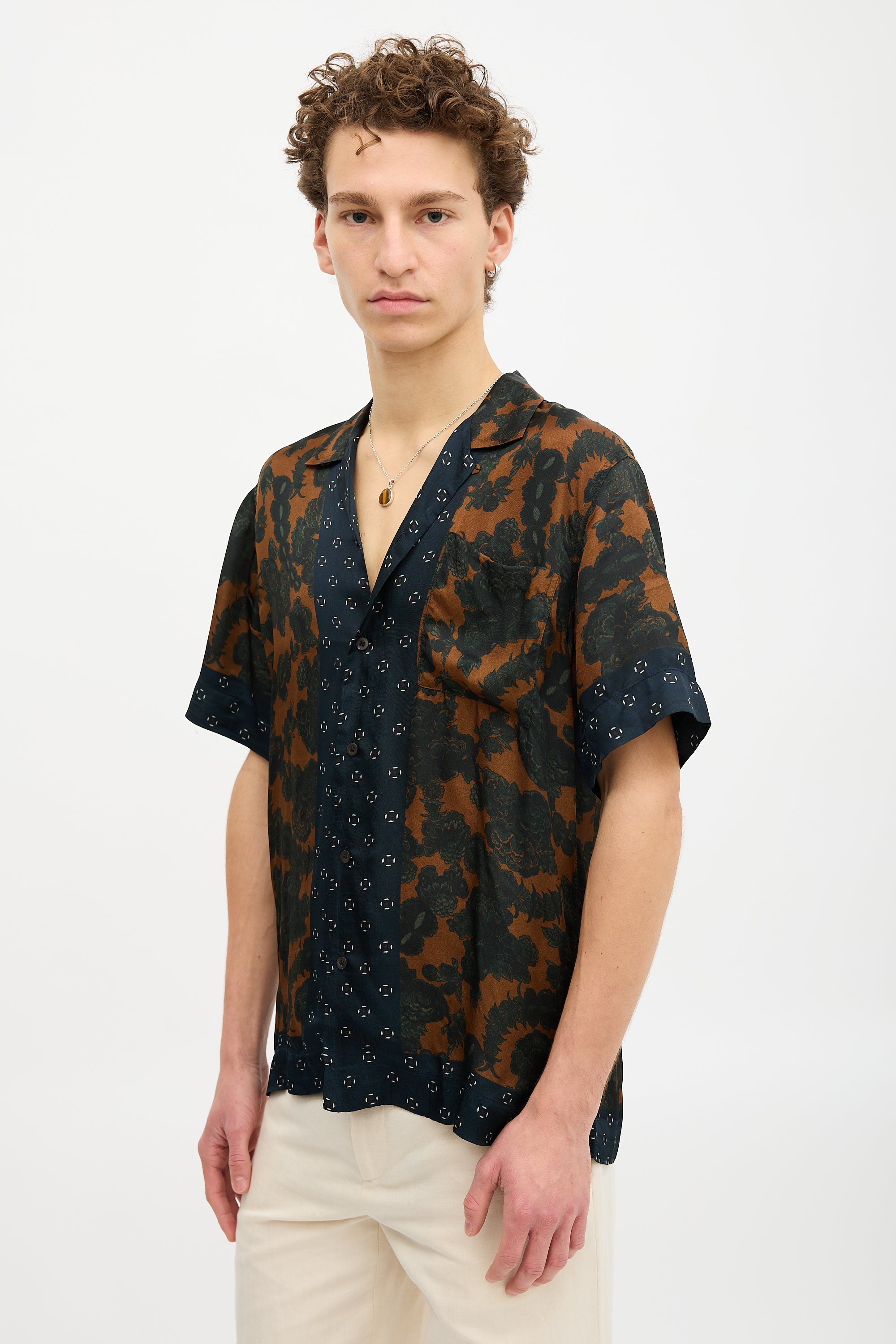 Pre-owned Dries Van Noten brown, green, and navy satin shirt featuring floral print, geometric patterned panels, convertible collar, button up front, patch pocket at left chest, and side vents.