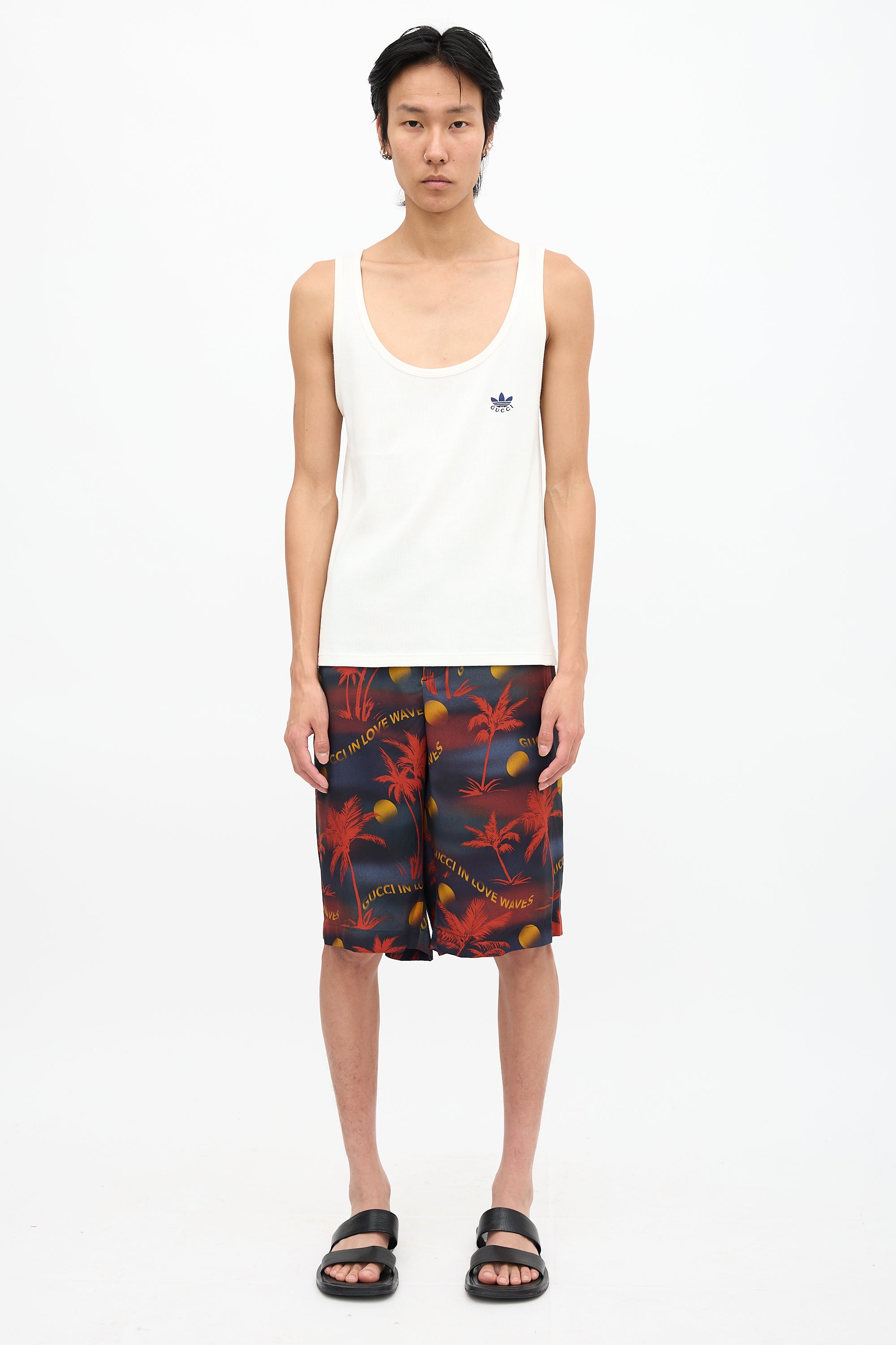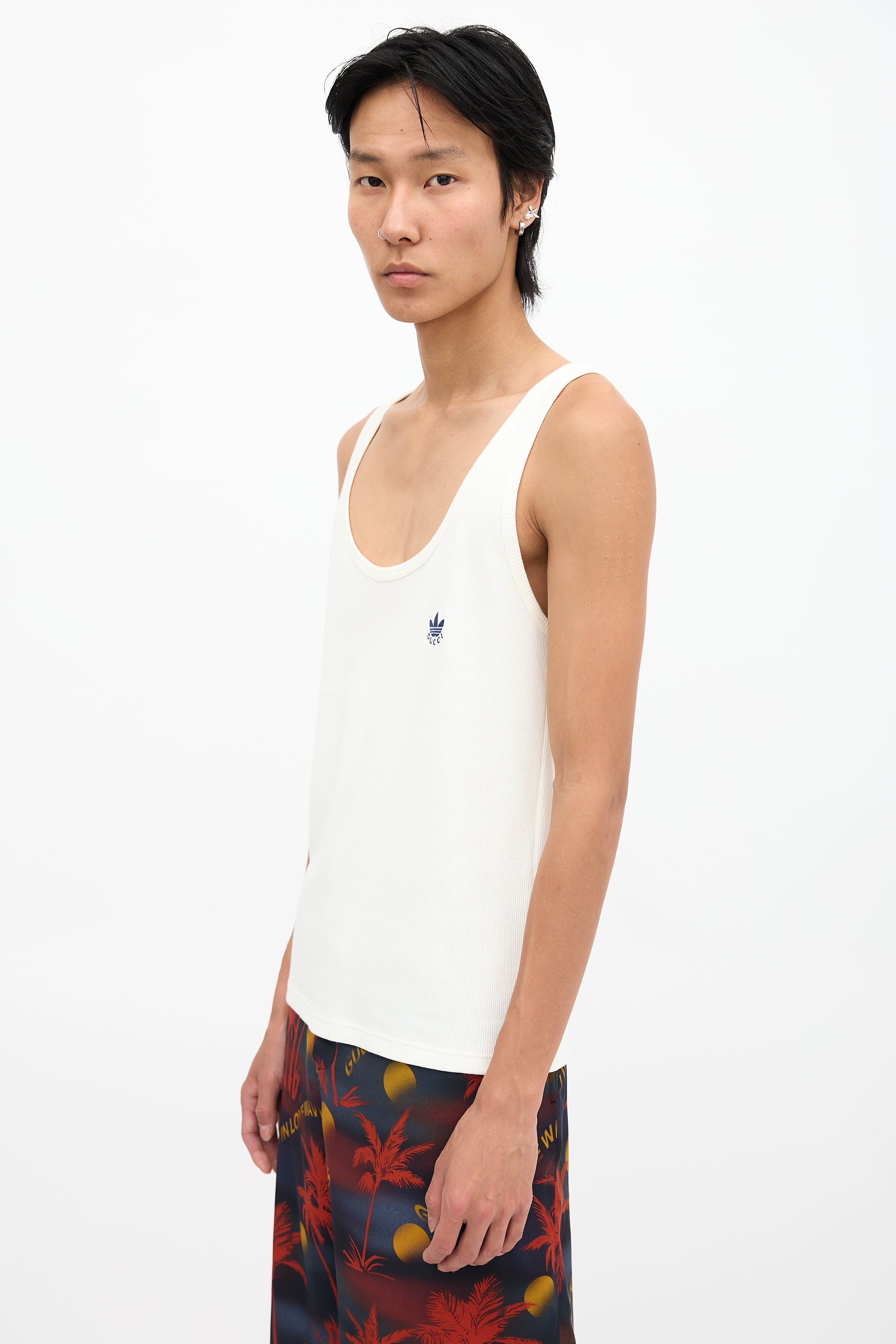 Pre-owned Gucci white ribbed tank top featuring scoop neckline and blue embroidered logo at left chest.