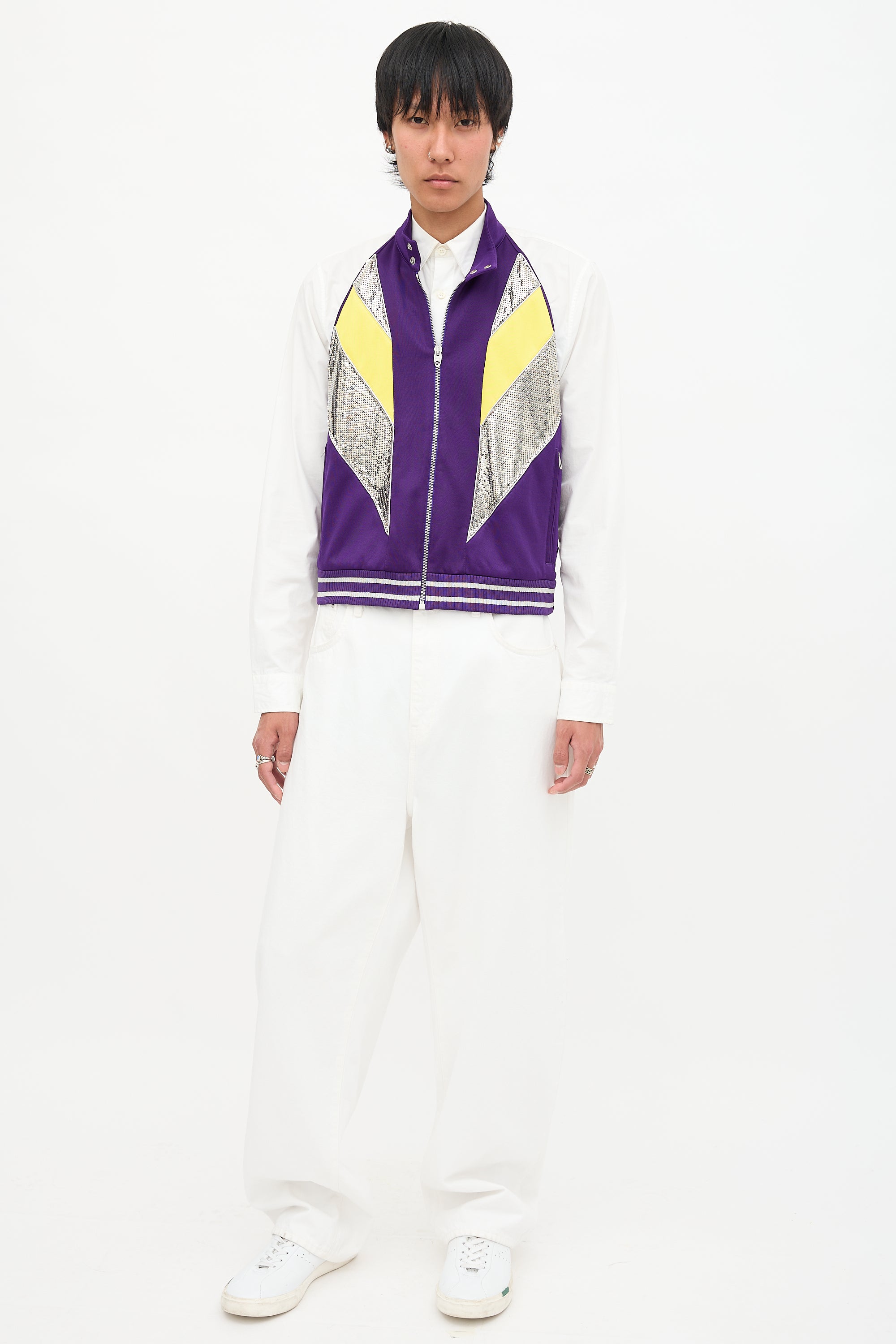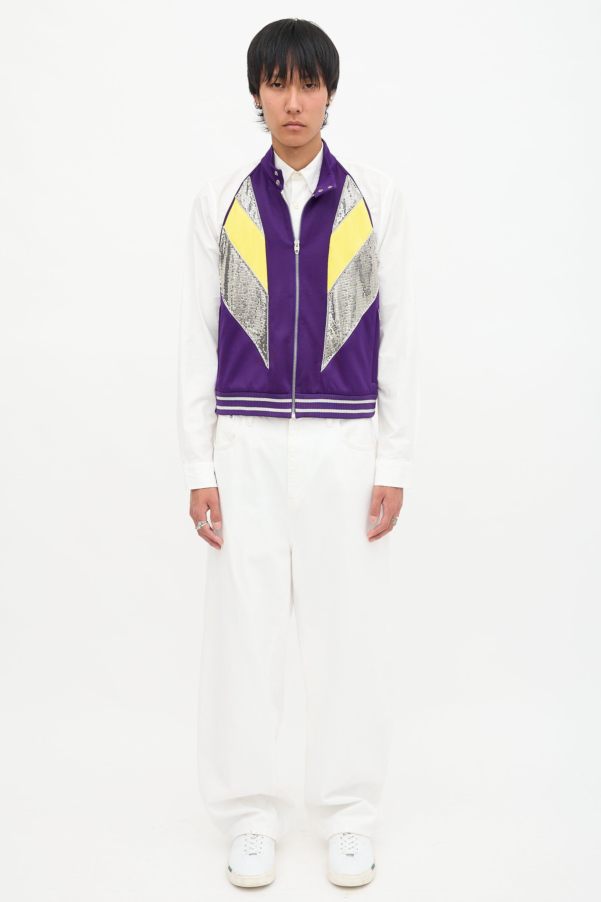 Gucci Spring 2023 purple and yellow technical jersey top featuring a halter neck with snap button fastenings at front, full zip front, silver tone metal mesh panelling, open back, two zip pockets at hip, tonal logo patch, and ribbed hem with silver striping. Lined. Alessandro Michele era design.
