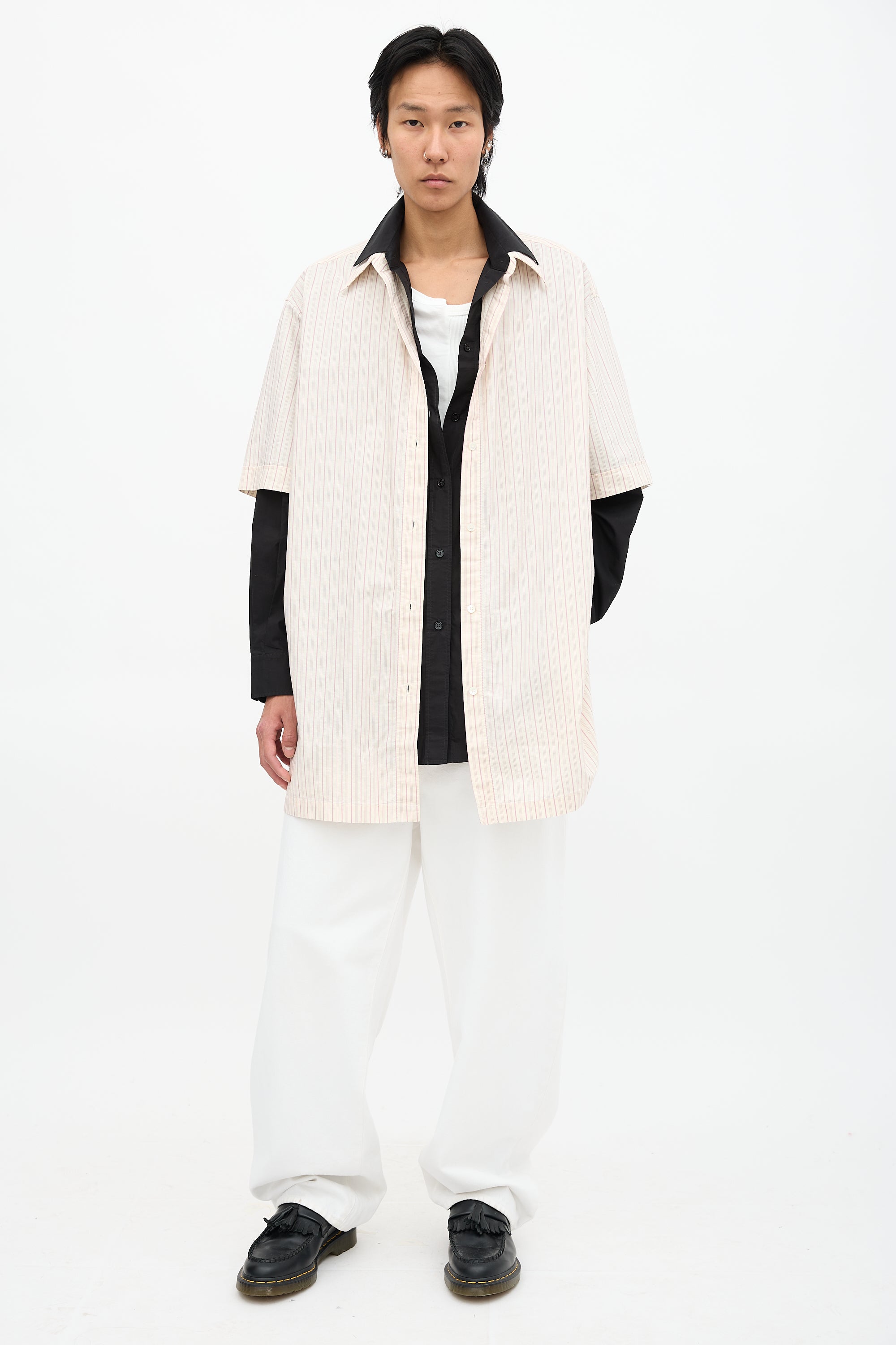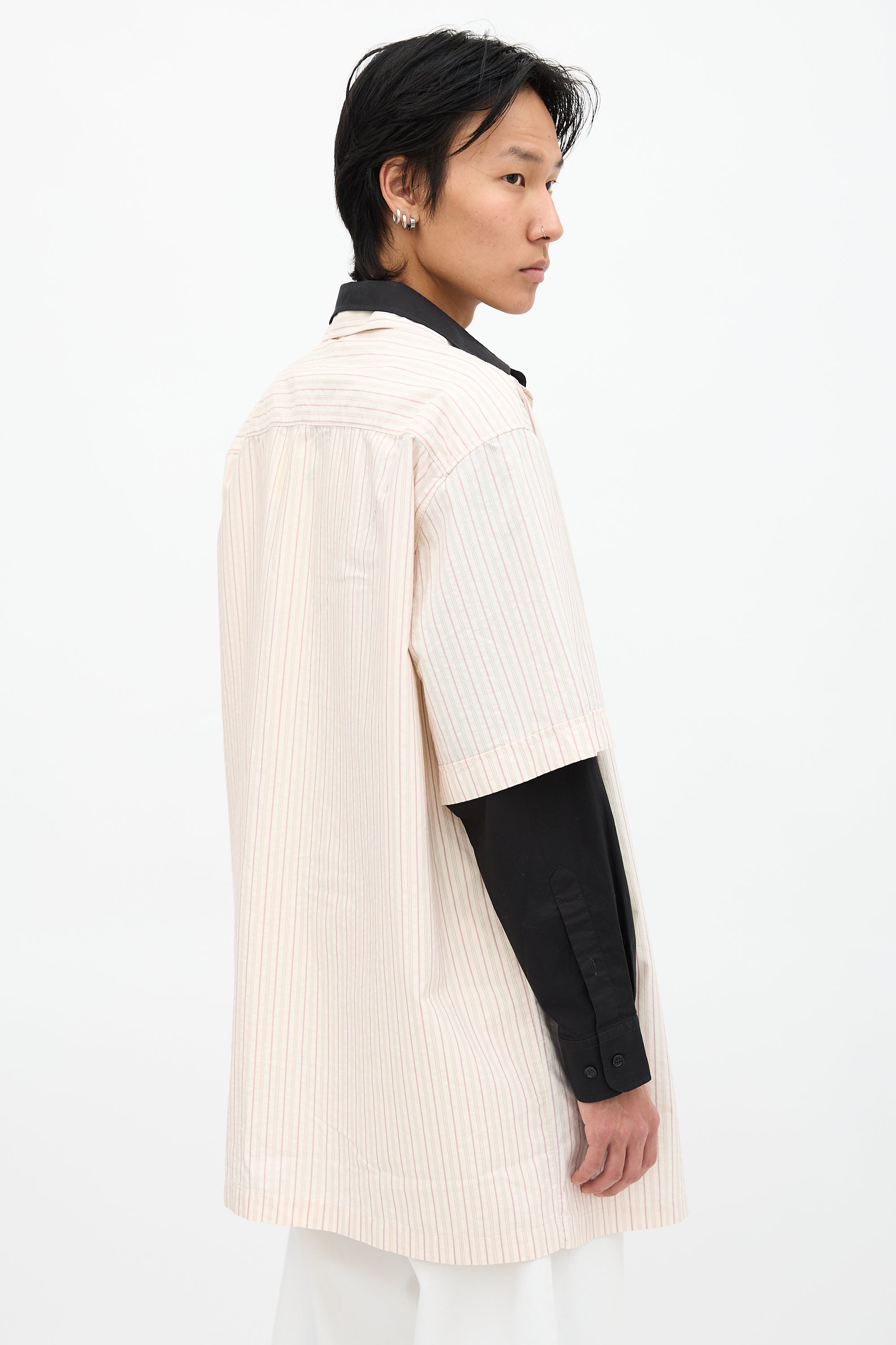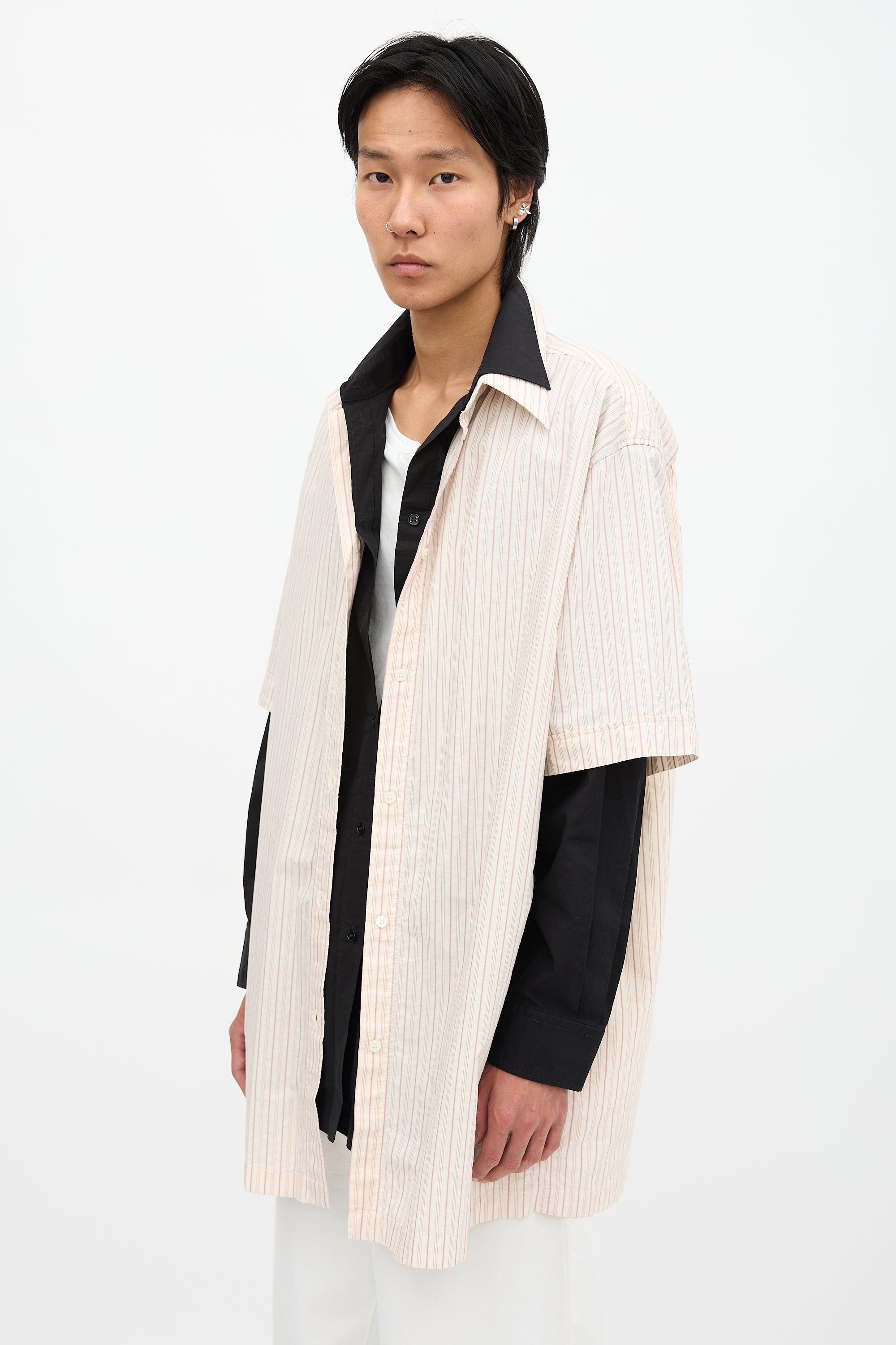 Pre-owned MM6 Maison Margiela cream, black and pink long sleeve shirt featuring point collar, button cuffs, layered styling, striping on main shirt and button up.