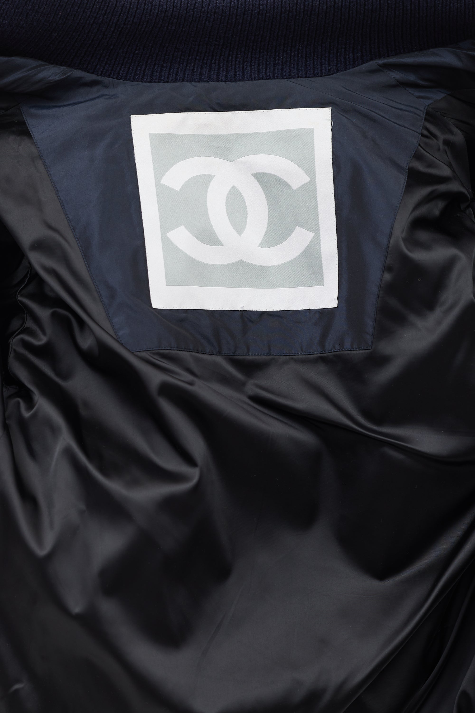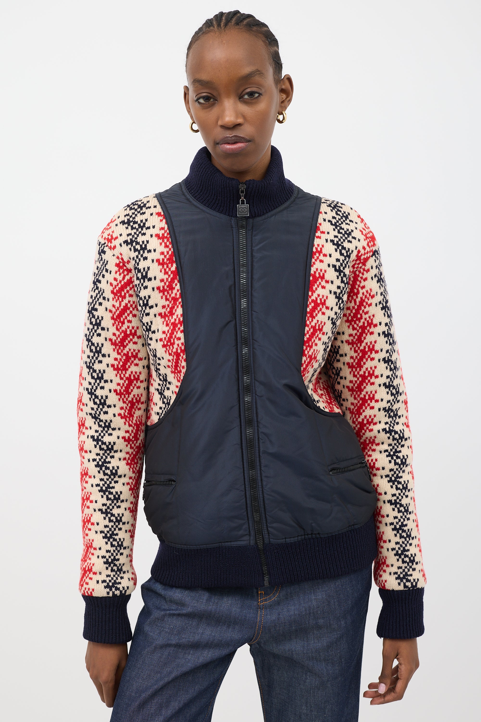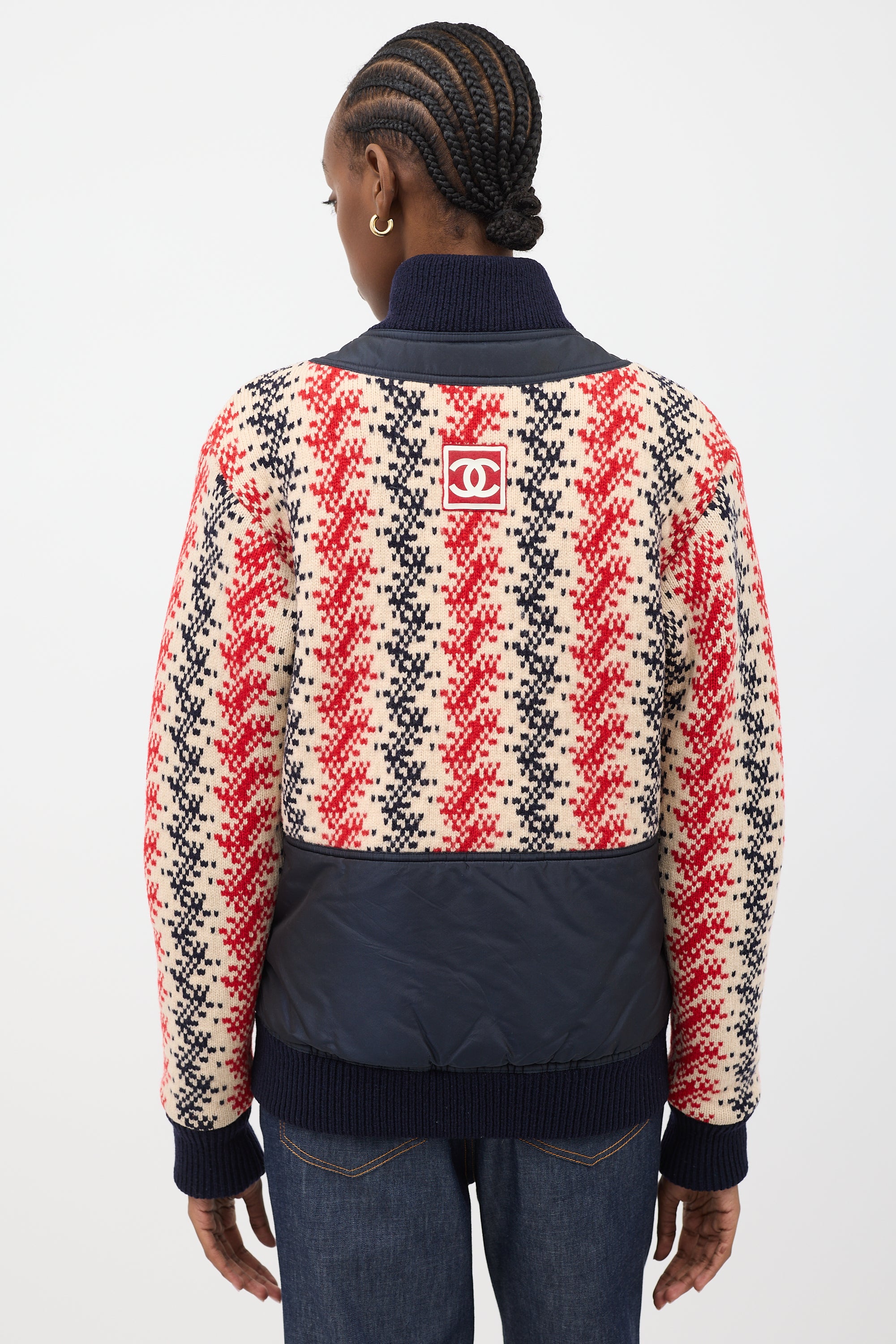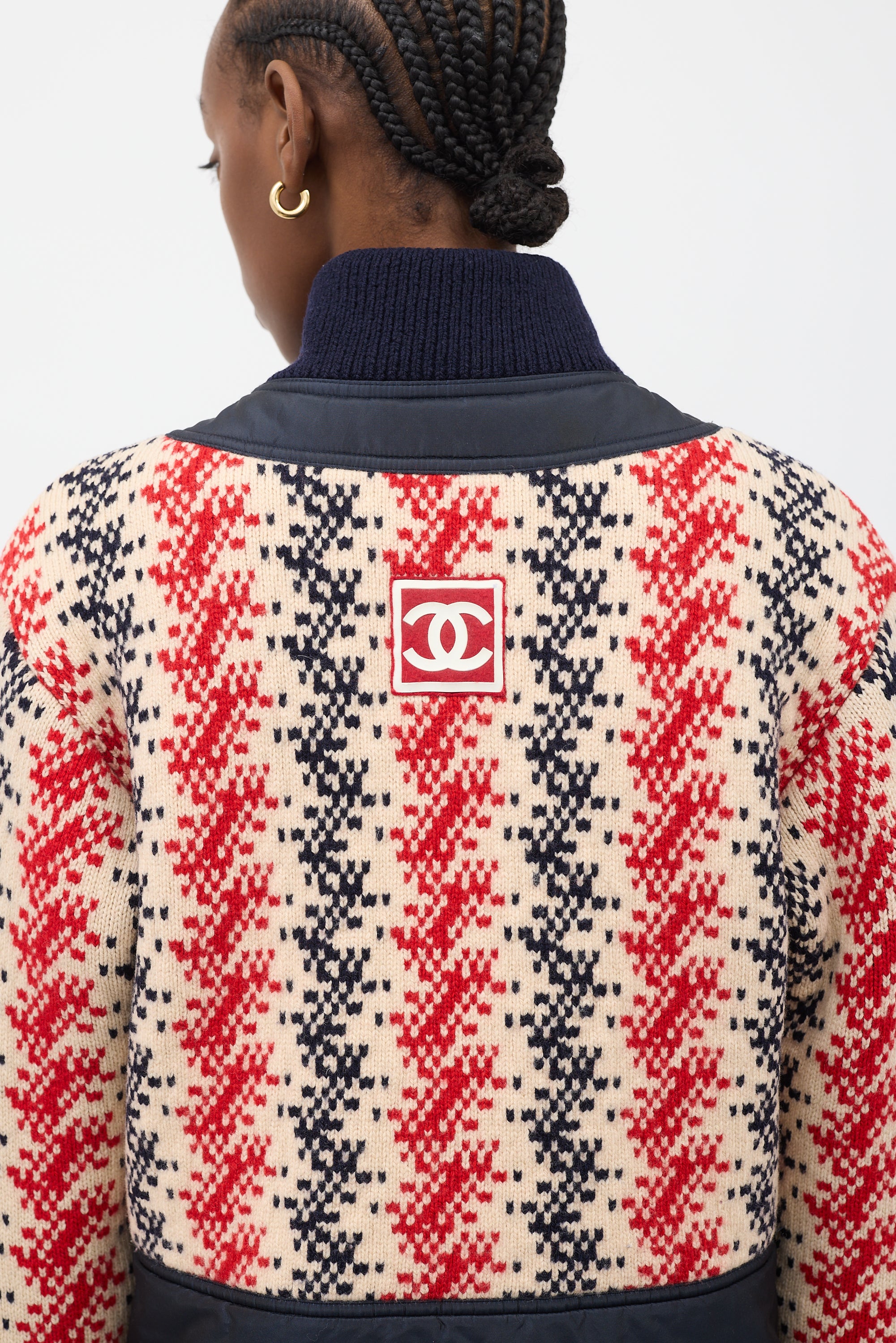 Pre-owned Chanel Identification vintage hybrid jacket featuring stand collar, front zip, two front pockets, abstract stripe intarsia at knit parts, logo tab at upper centre back, and ribbed knit collar, hem, and cuffs. Lined.